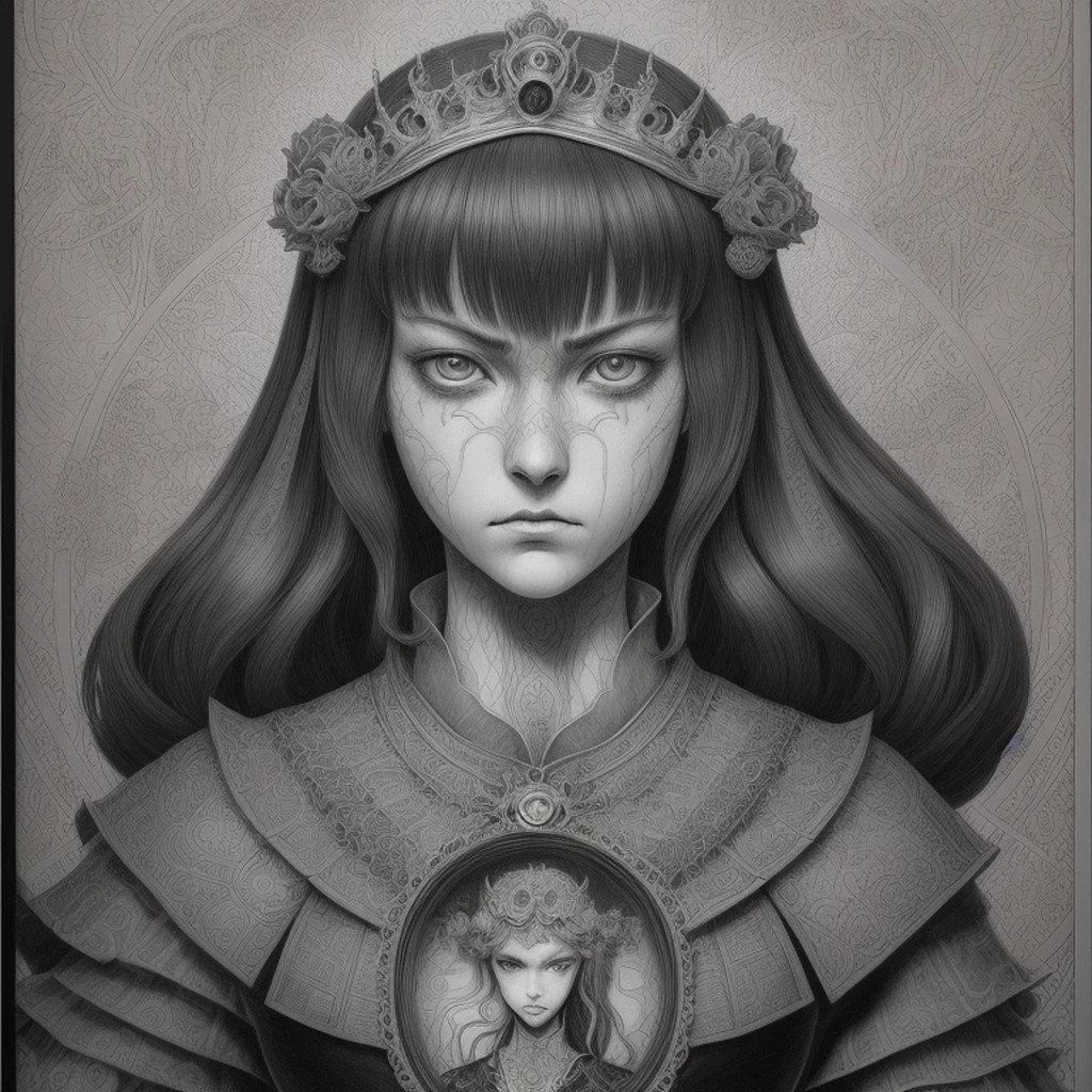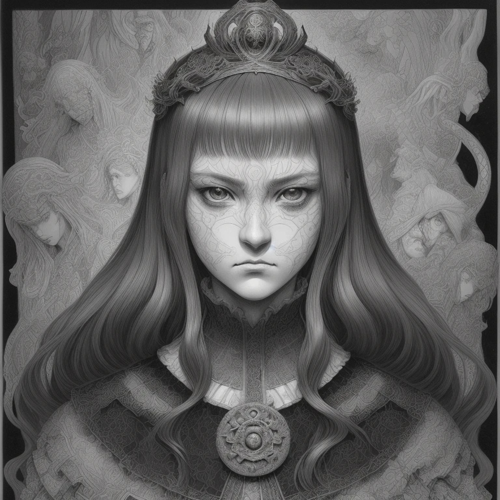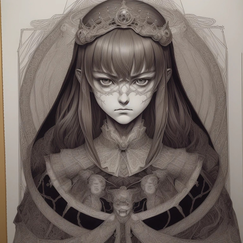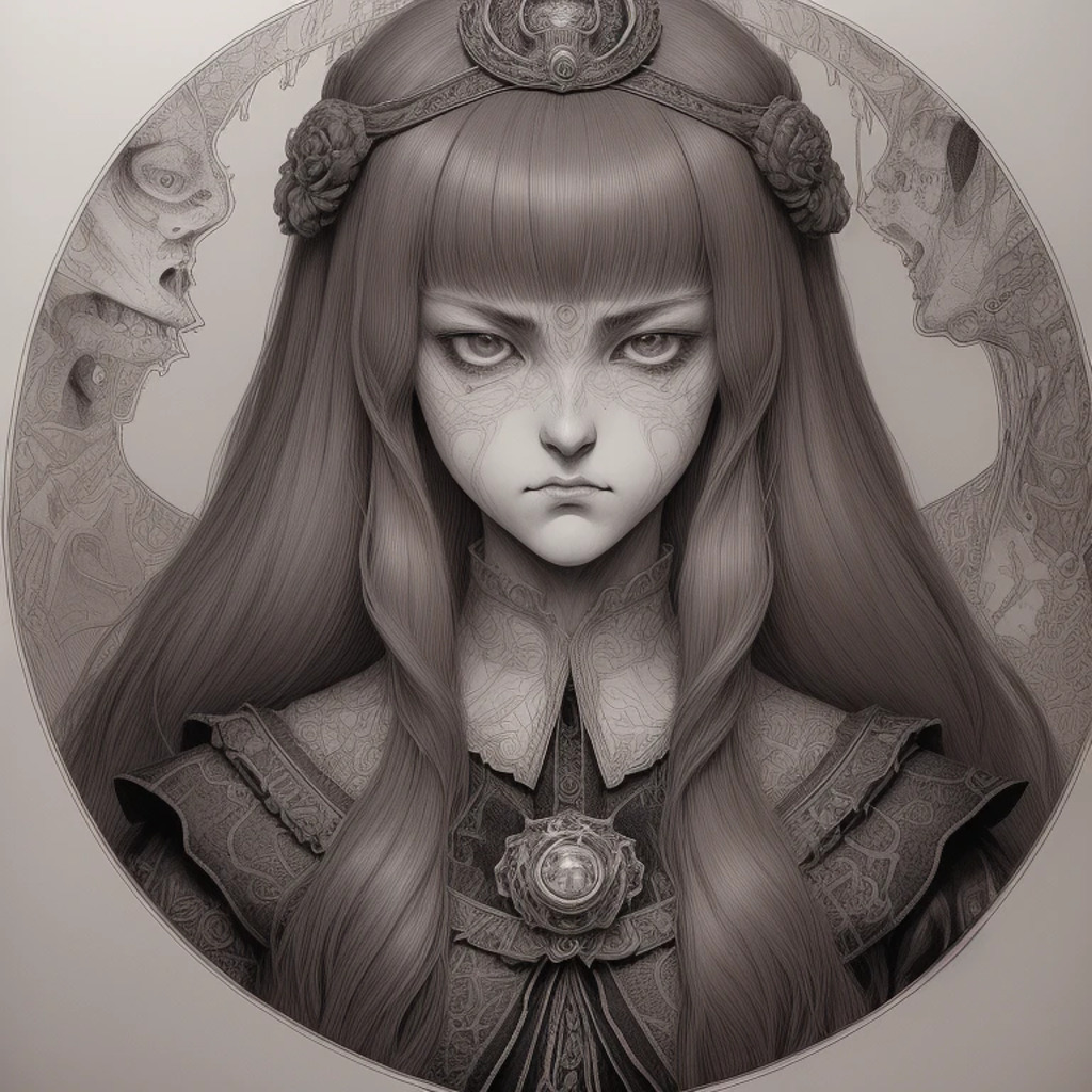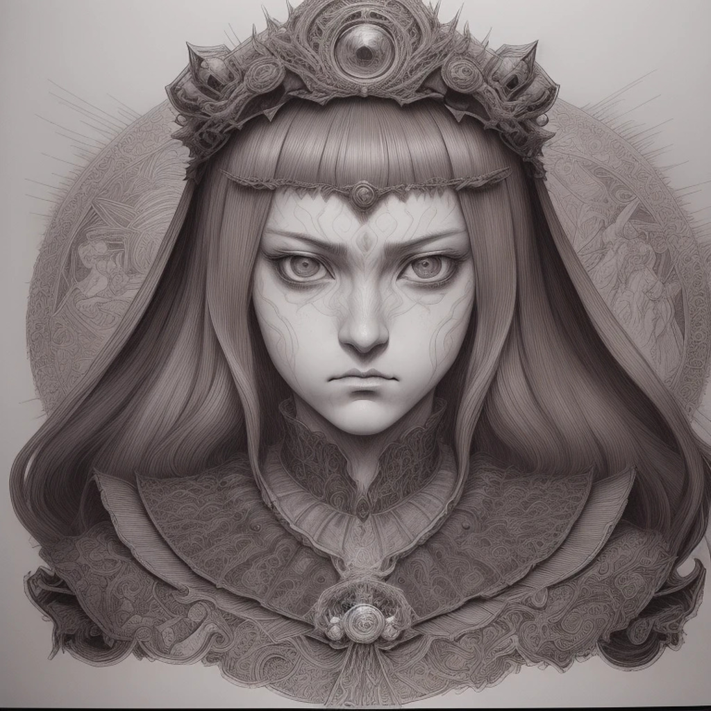 Prompt: A detailed infographic, marginalia titled ‘Face of sadness’ description ‘Order of the occult princess’ portrait, character design, worn, dark, manga style, extremely high detail, photo realistic, pen and ink, intricate line drawings, by MC Escher, Yoshitaka Amano, Ruan Jia, Kentaro Miura, Artgerm, style by eddie mendoza, raphael lacoste, alex ross