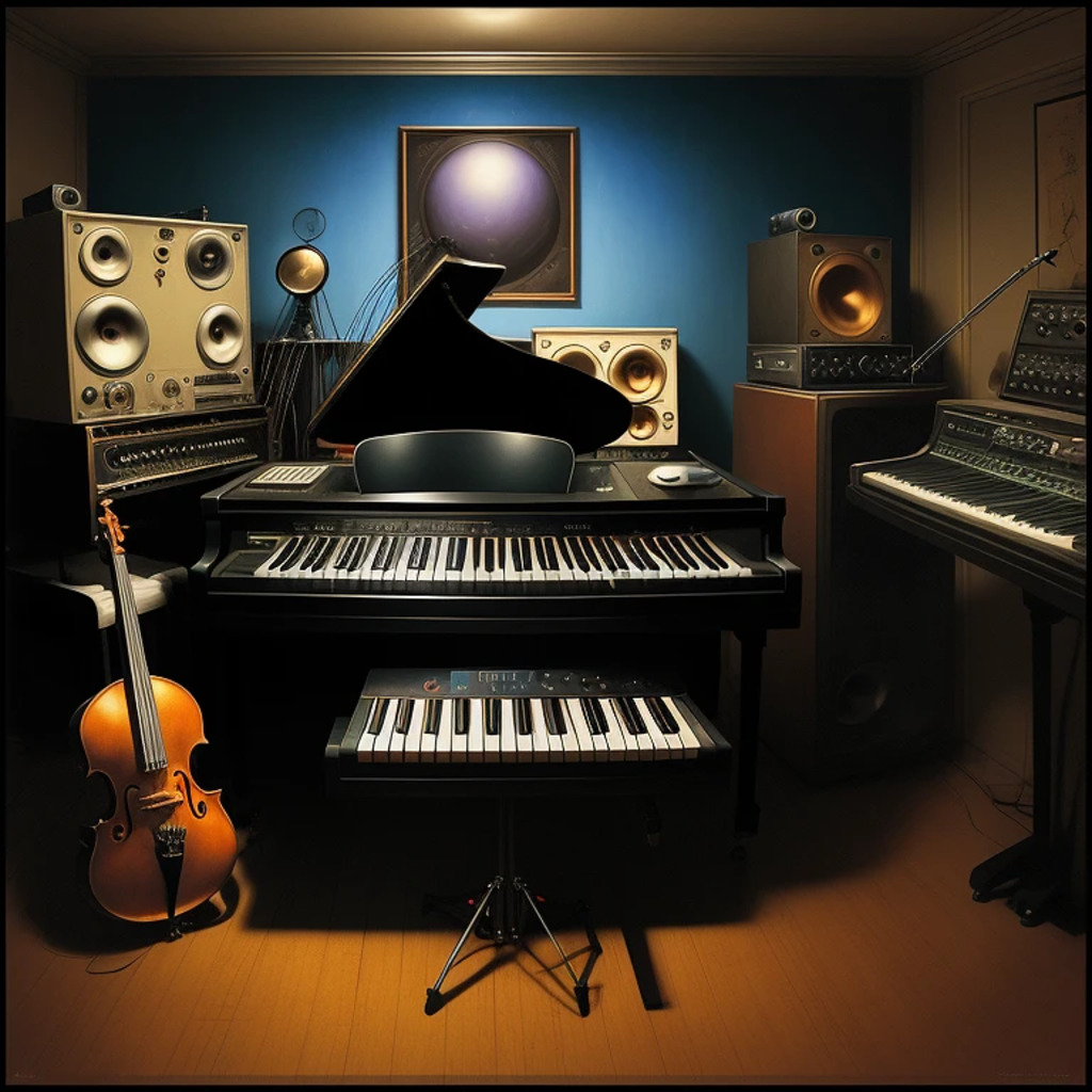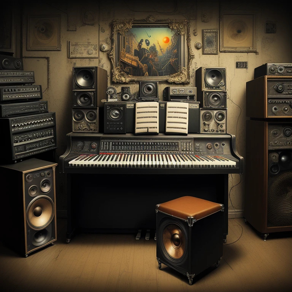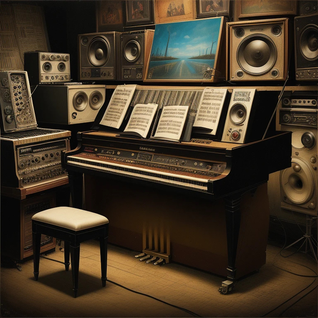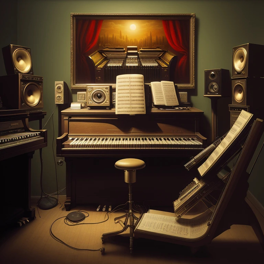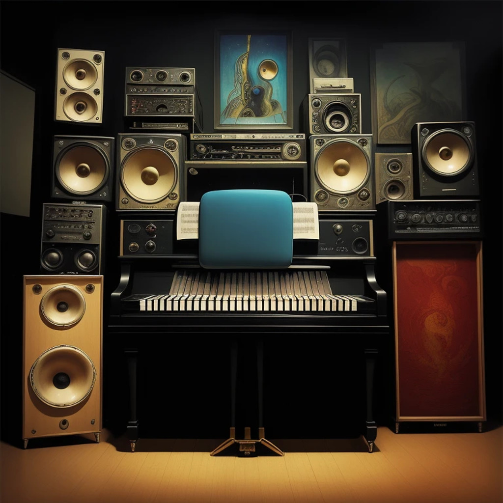 Prompt: music Album cover picture, jazz, blues, classical music , surreal art, oil picture, radio, speaker, piano, electronic equipment, radio studio