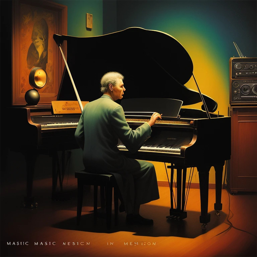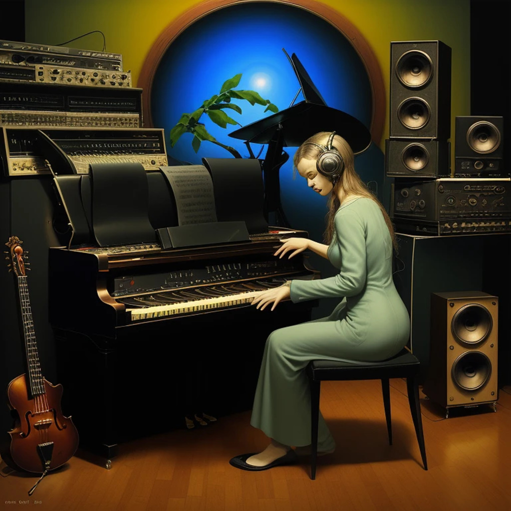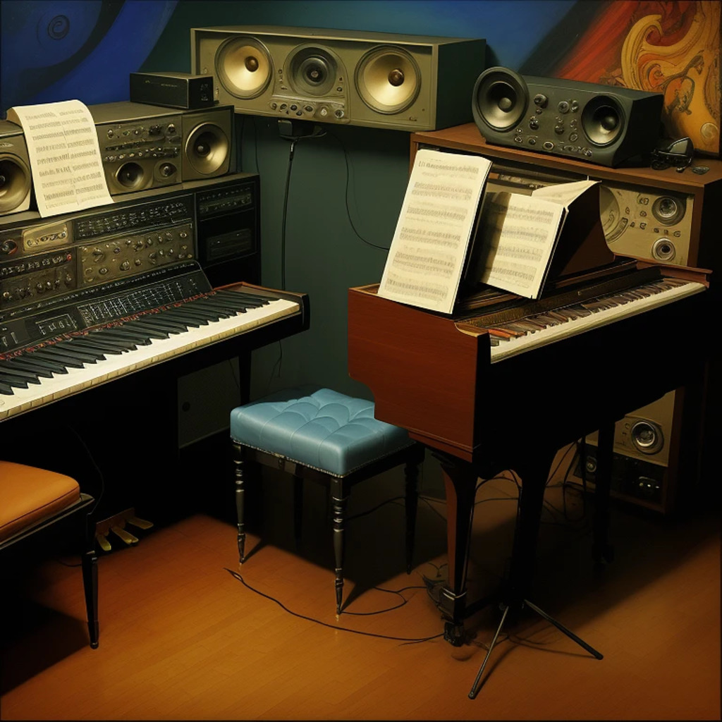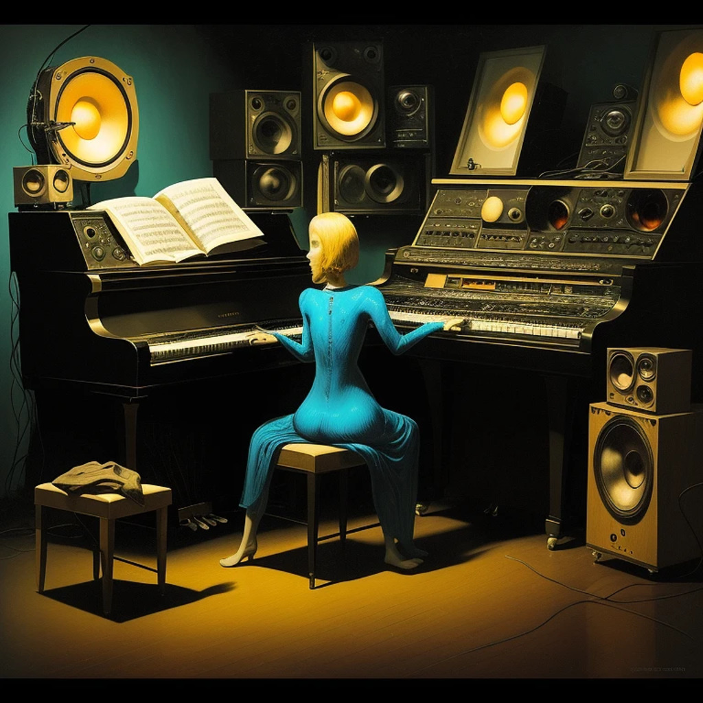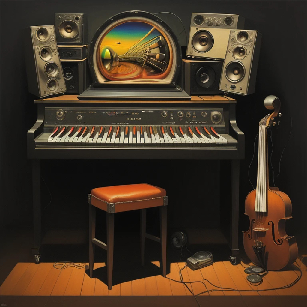 Prompt: music Album cover picture, jazz, blues, classical music , surreal art, oil picture, radio, speaker, piano, electronic equipment, radio studio