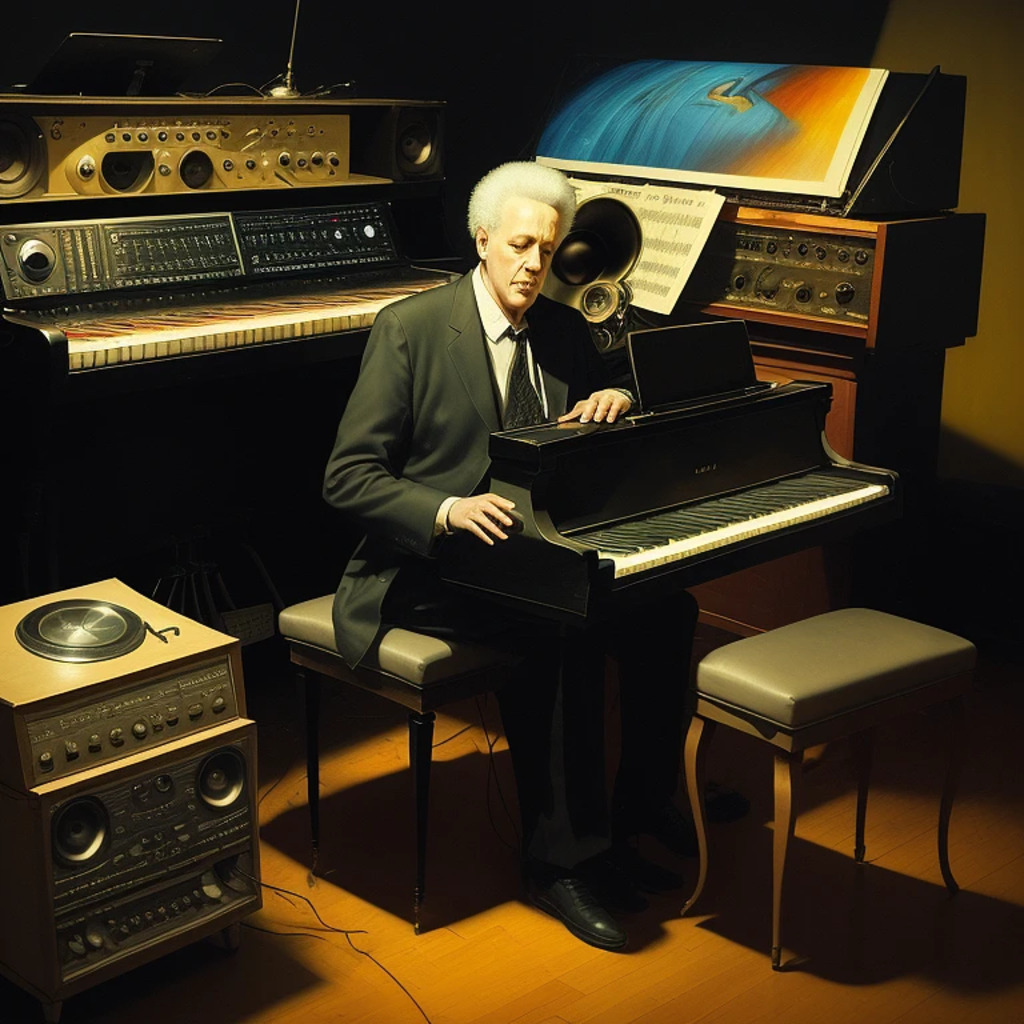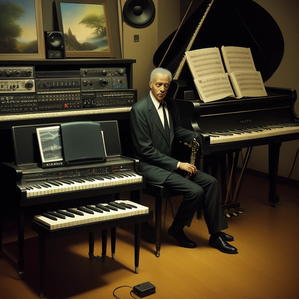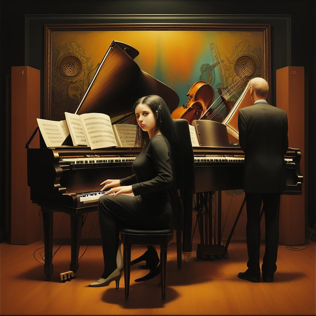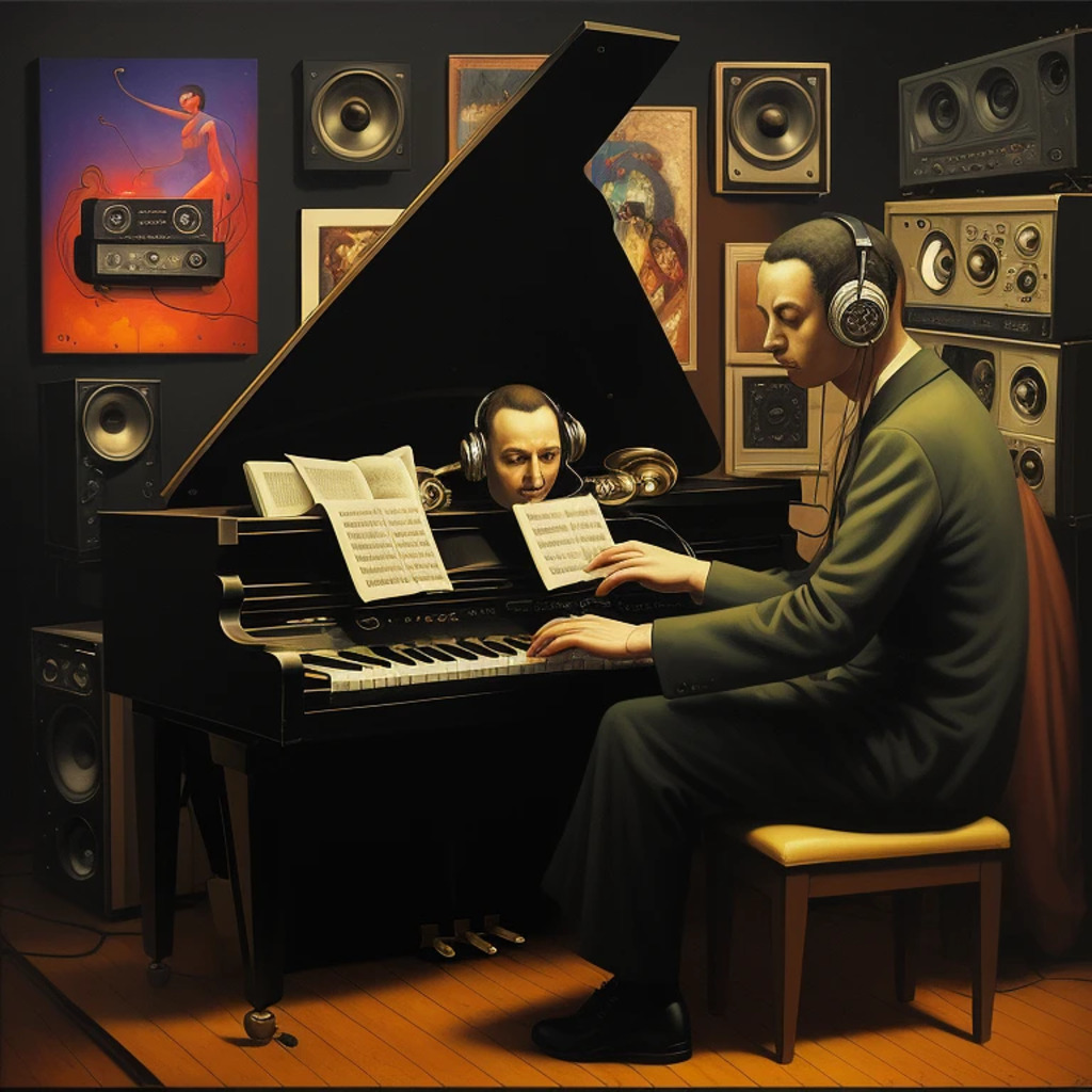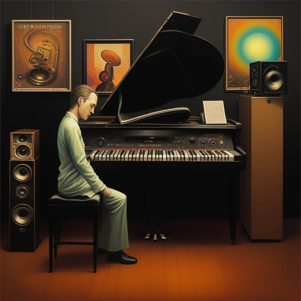 Prompt: music Album cover picture, jazz, blues, classical music , surreal art, oil picture, radio, speaker, piano, electronic equipment, radio studio