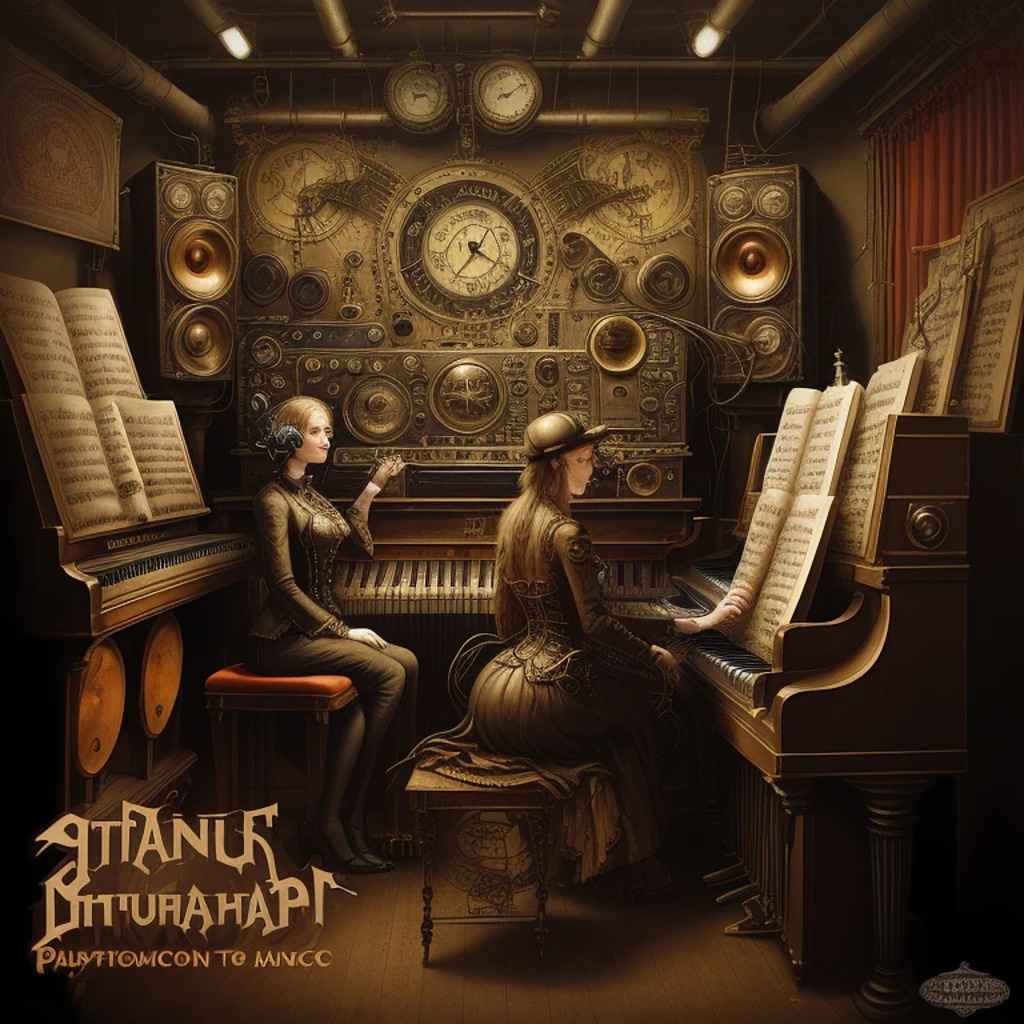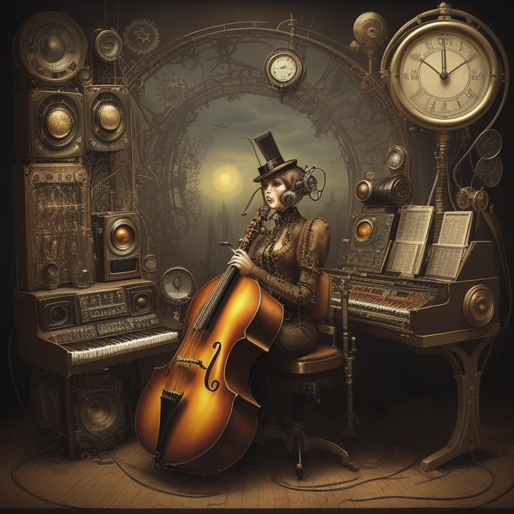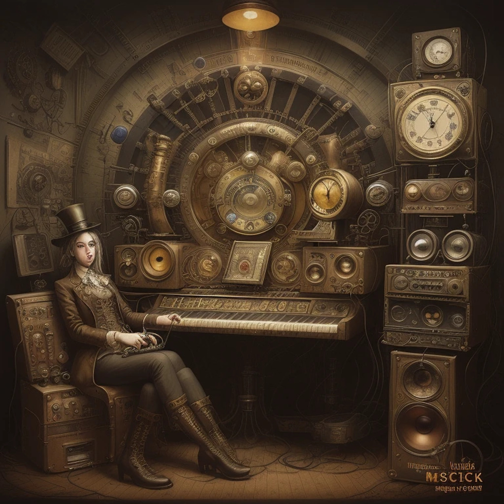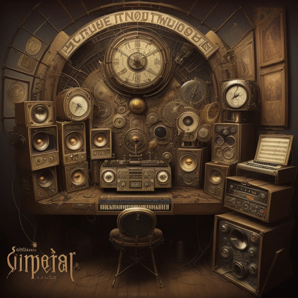 Prompt: music Album cover picture, steampunk, surreal art oil picture, radio broadcast, music instruments, artists