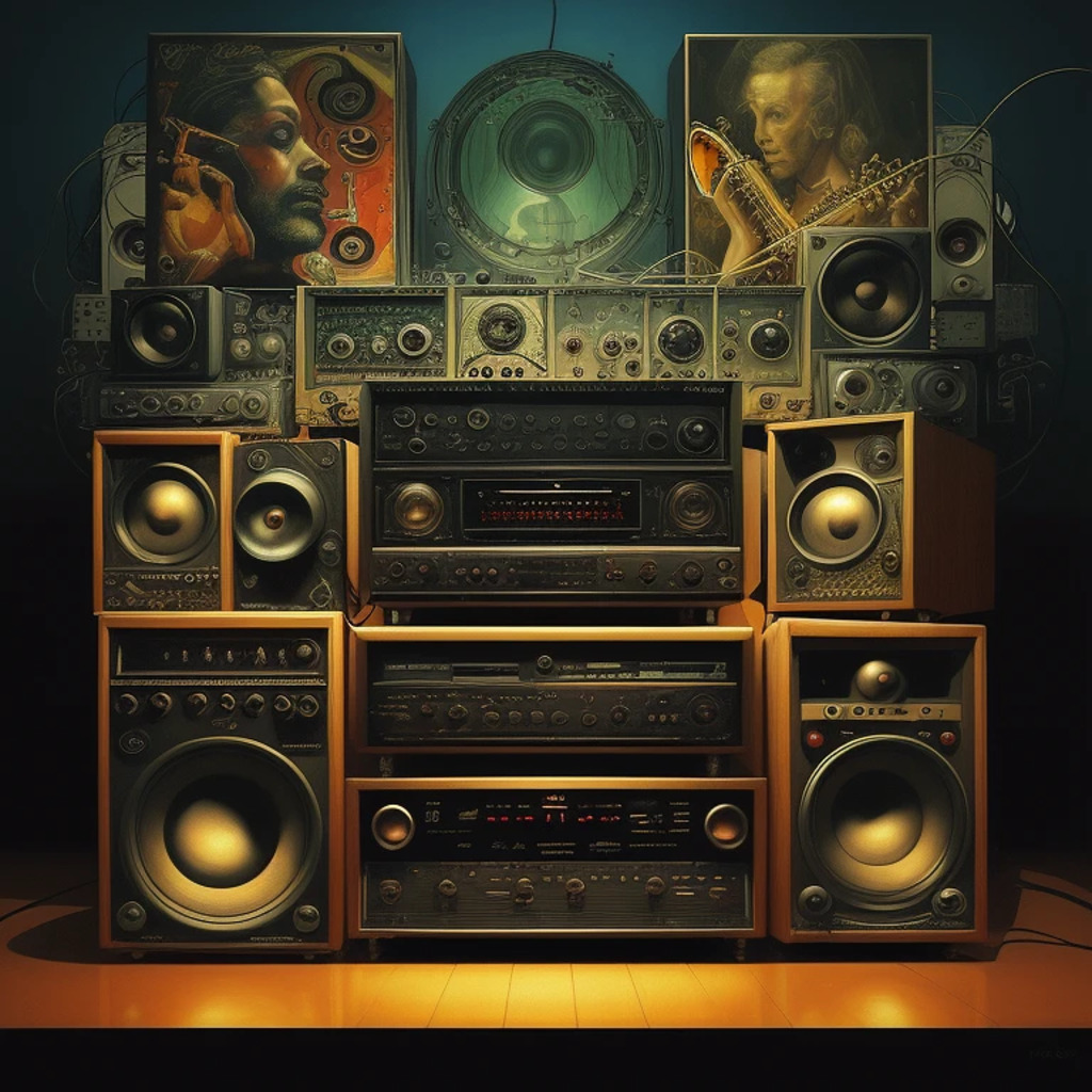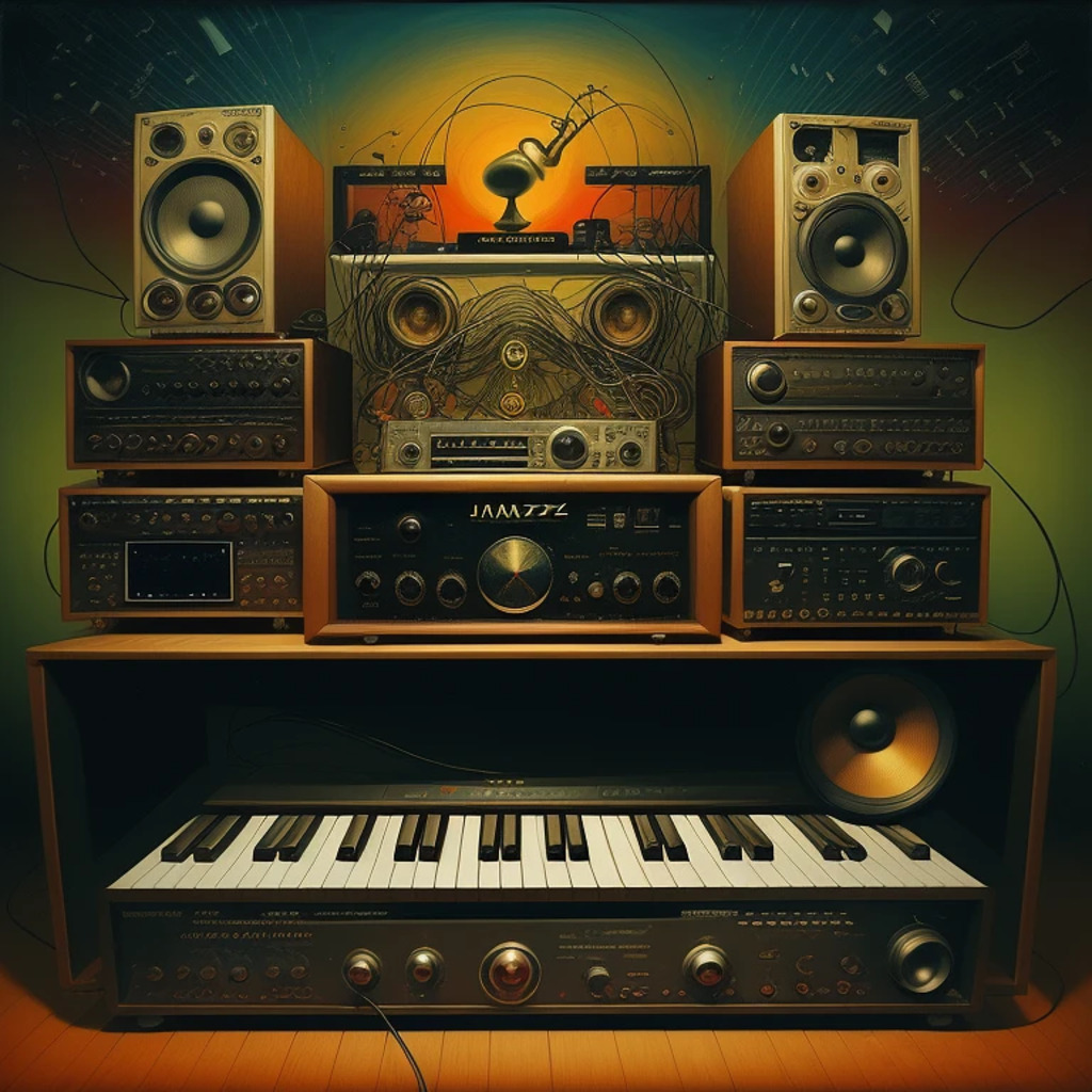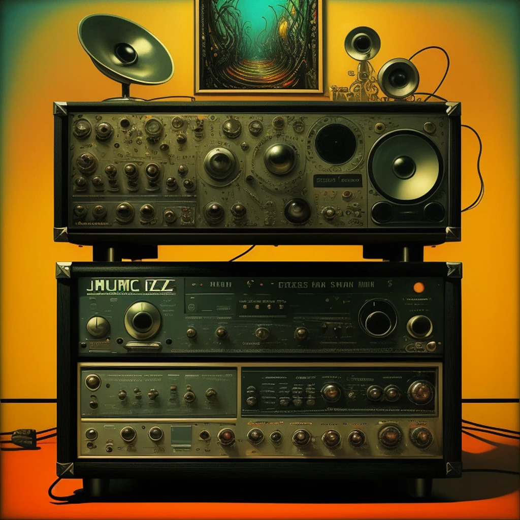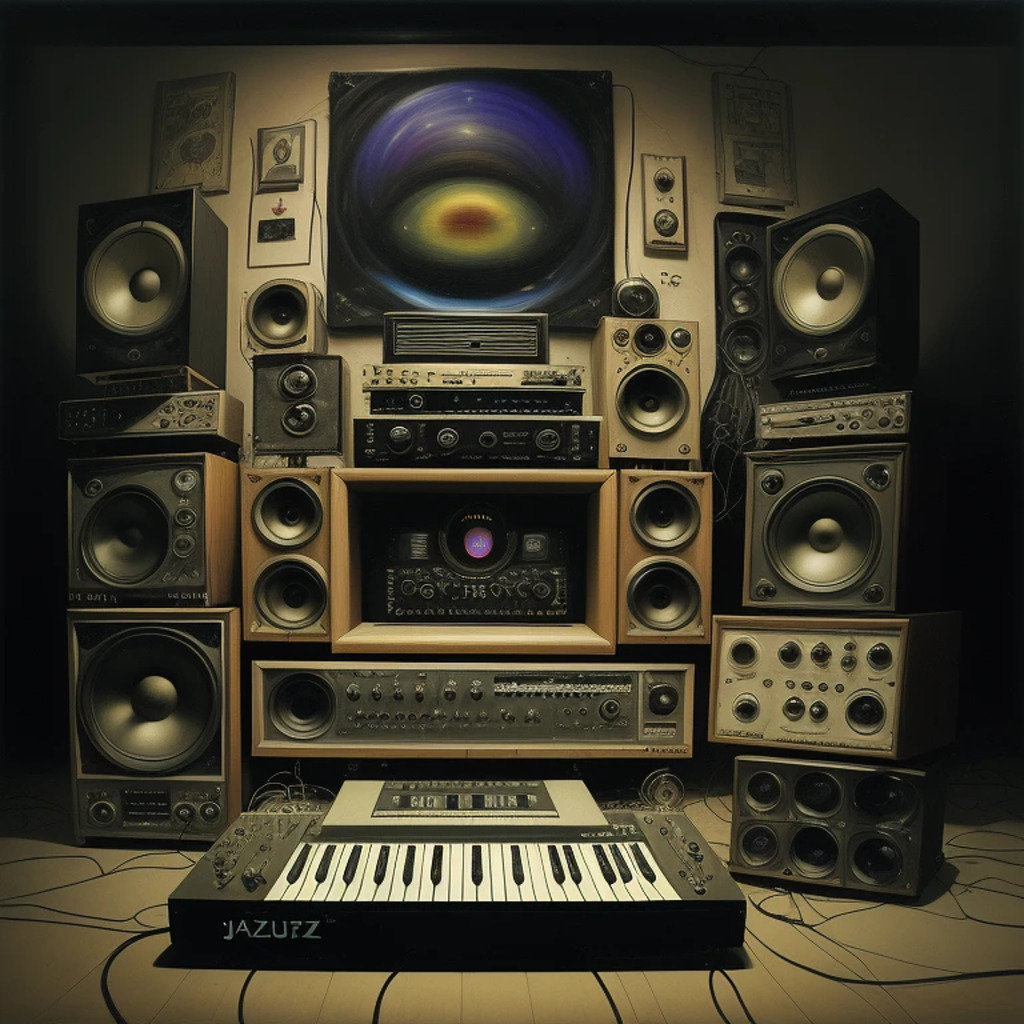 Prompt: music Album cover picture, jazz, surreal art, oil picture, radio, speaker, synthesizerm, amplifier, electronic devices