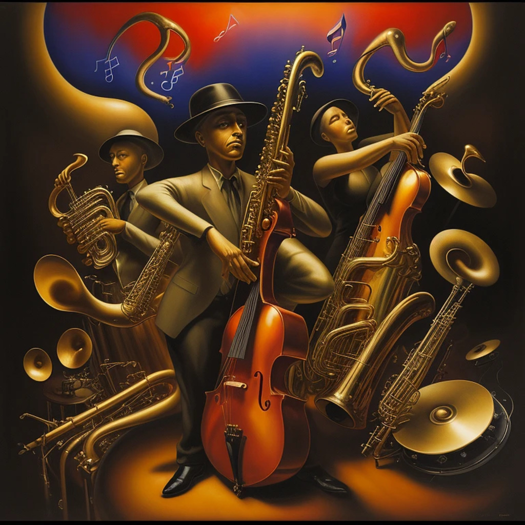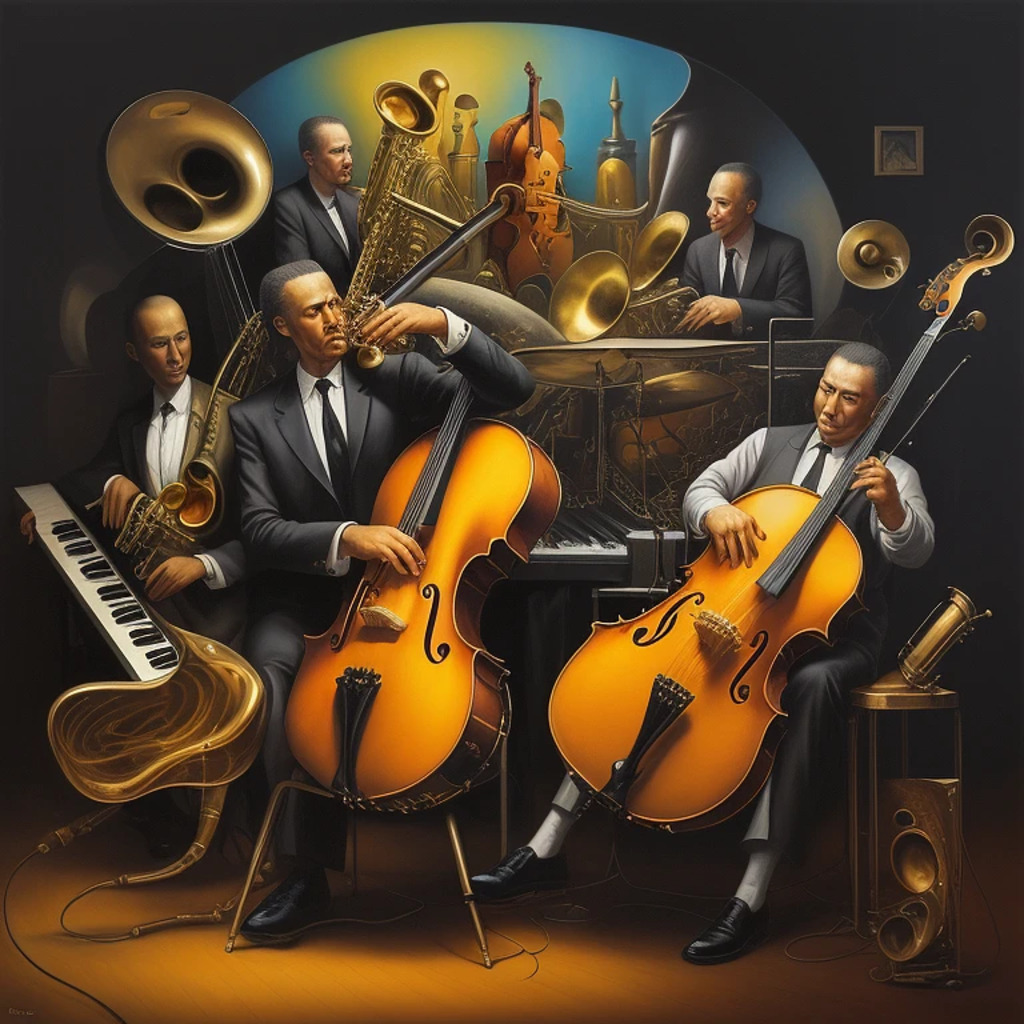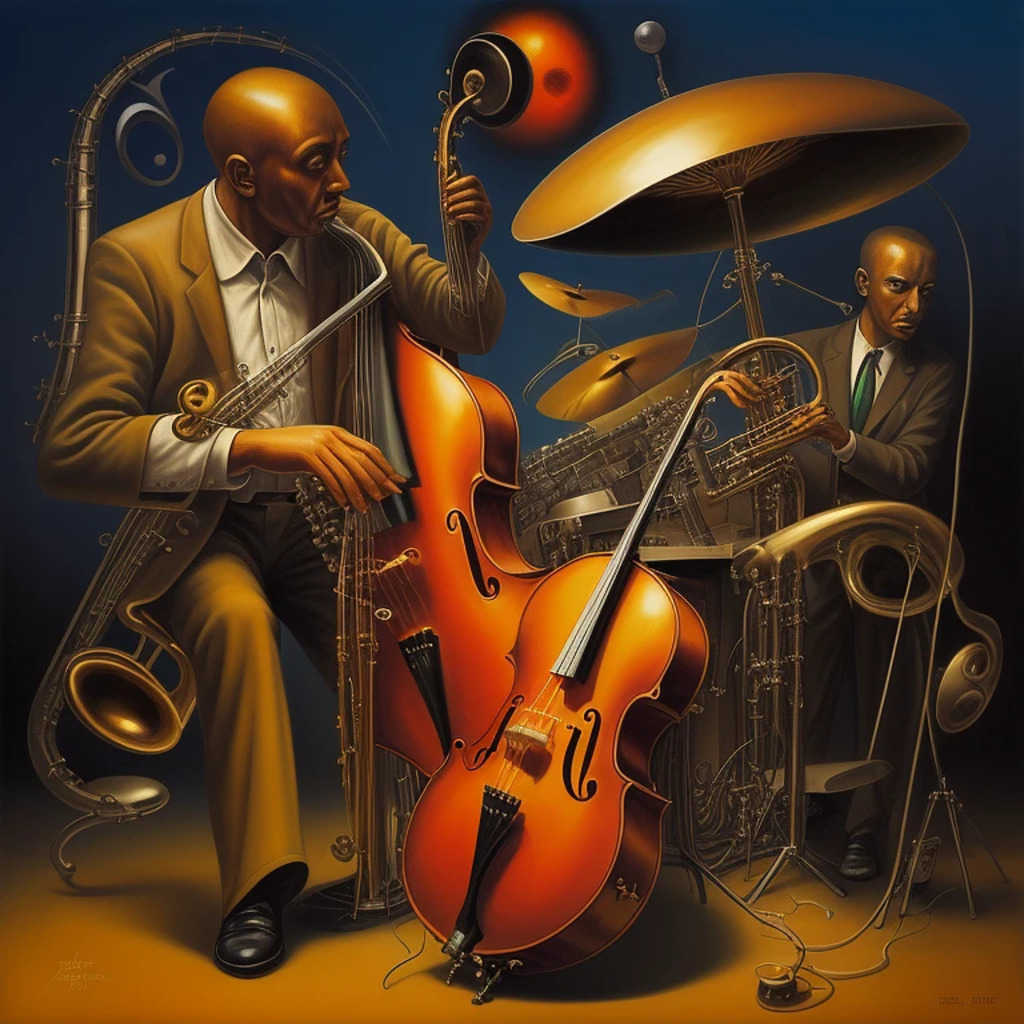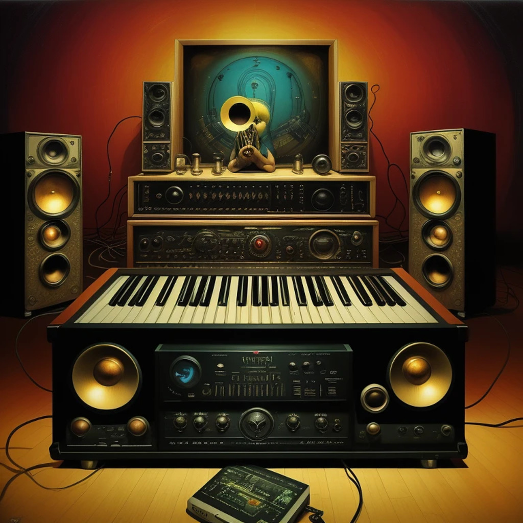 Prompt: music Album cover picture, jazz, surreal art, oil picture, radio, speaker, synthesizerm, amplifier, electronic devices