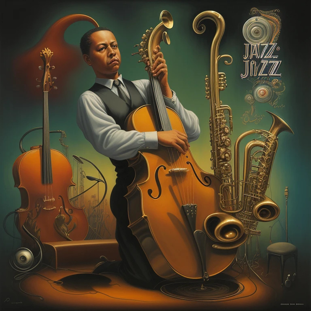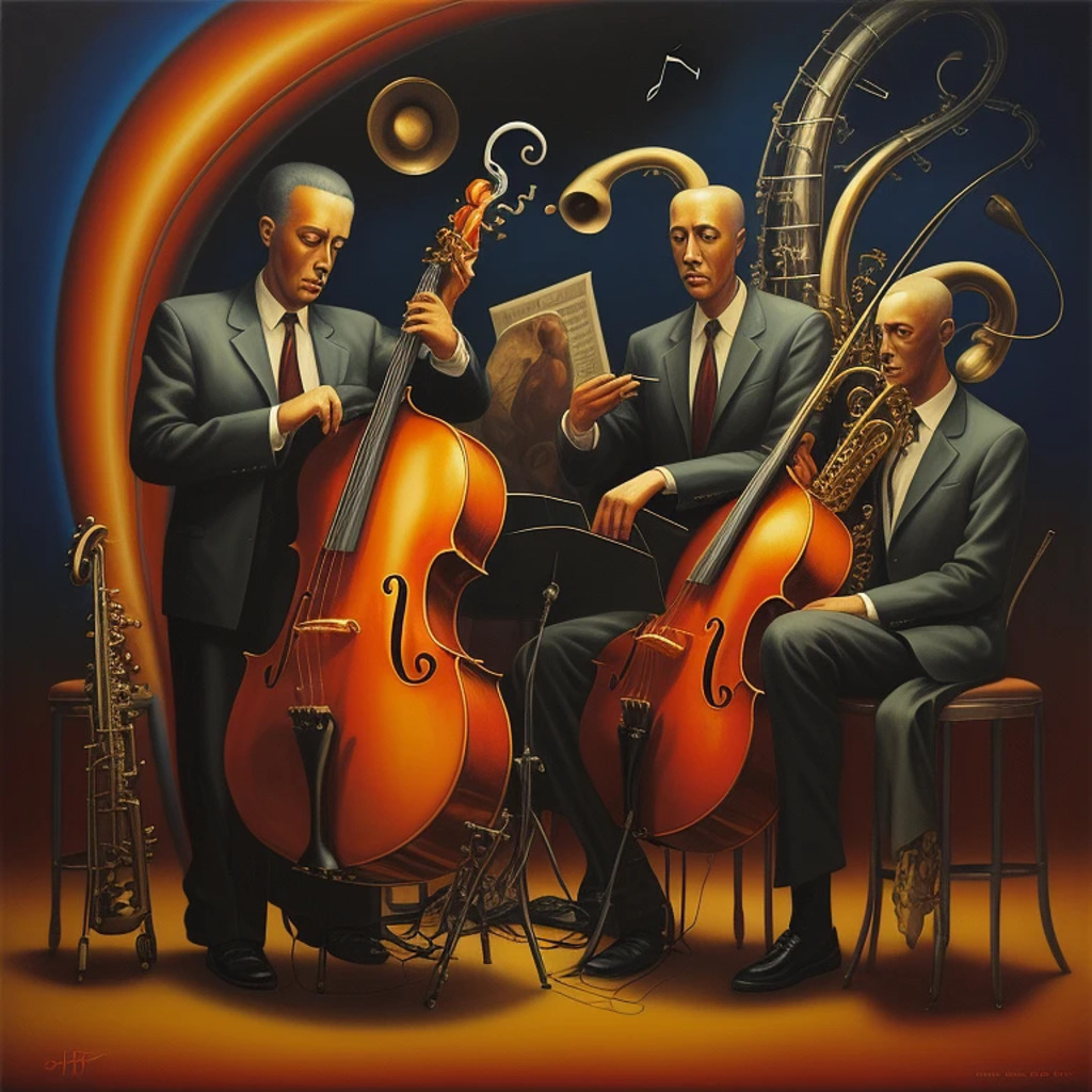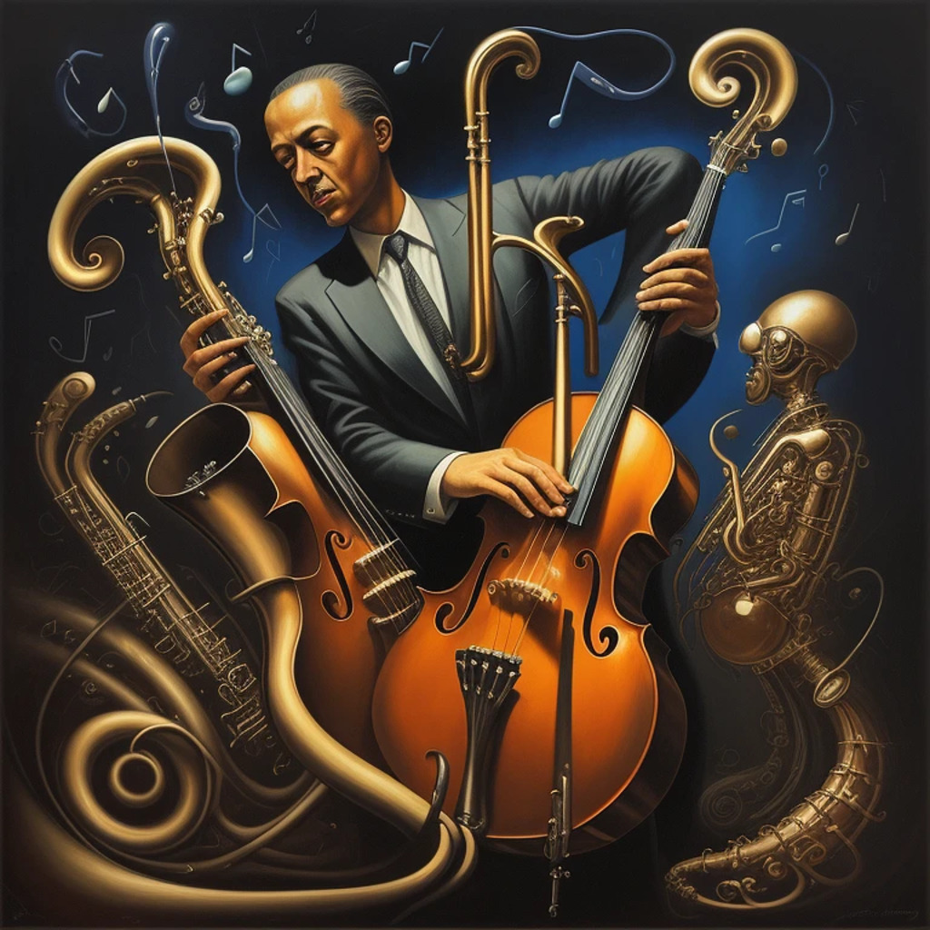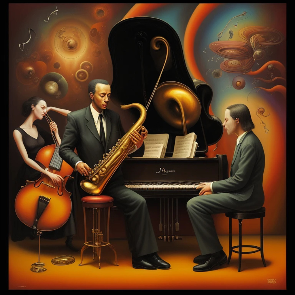 Prompt: music Album cover picture, jazz, surreal art, oil picture, radio, speaker, synthesizerm, amplifier, electronic devices