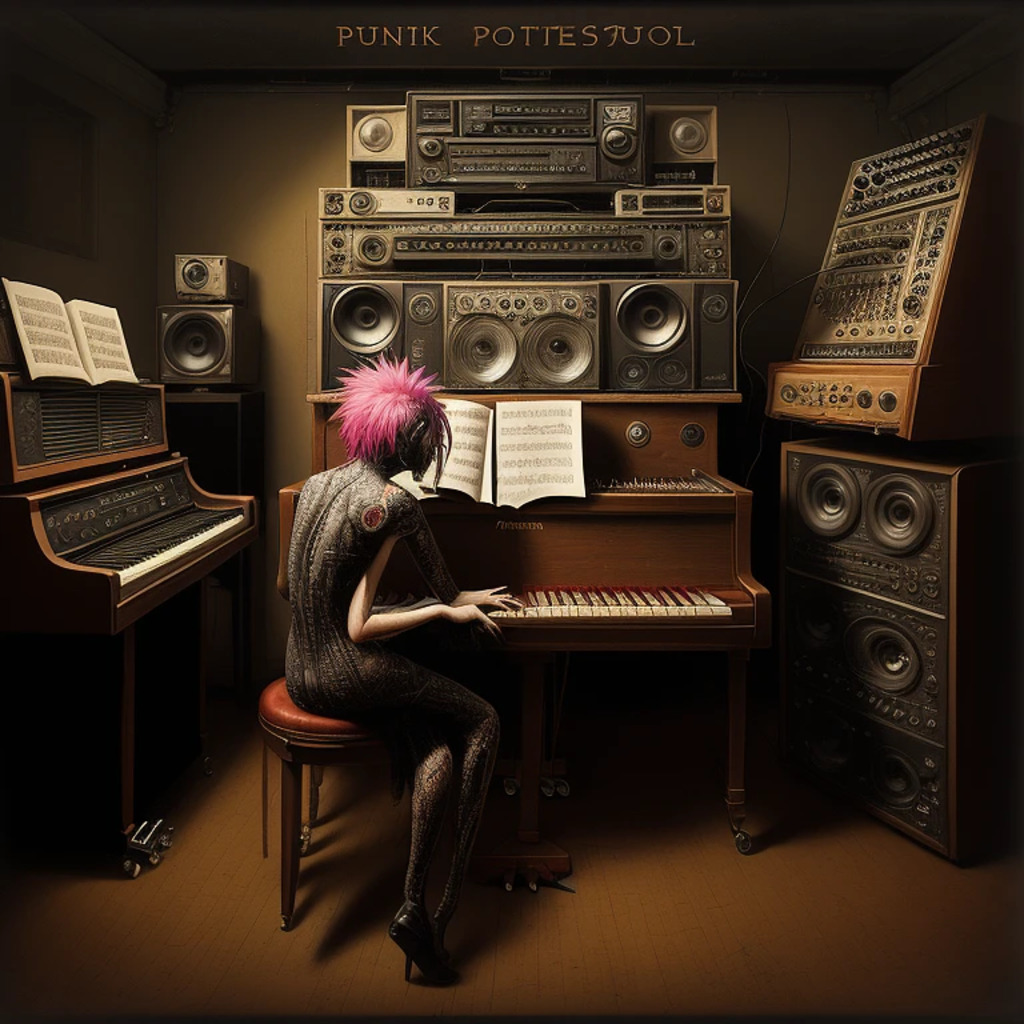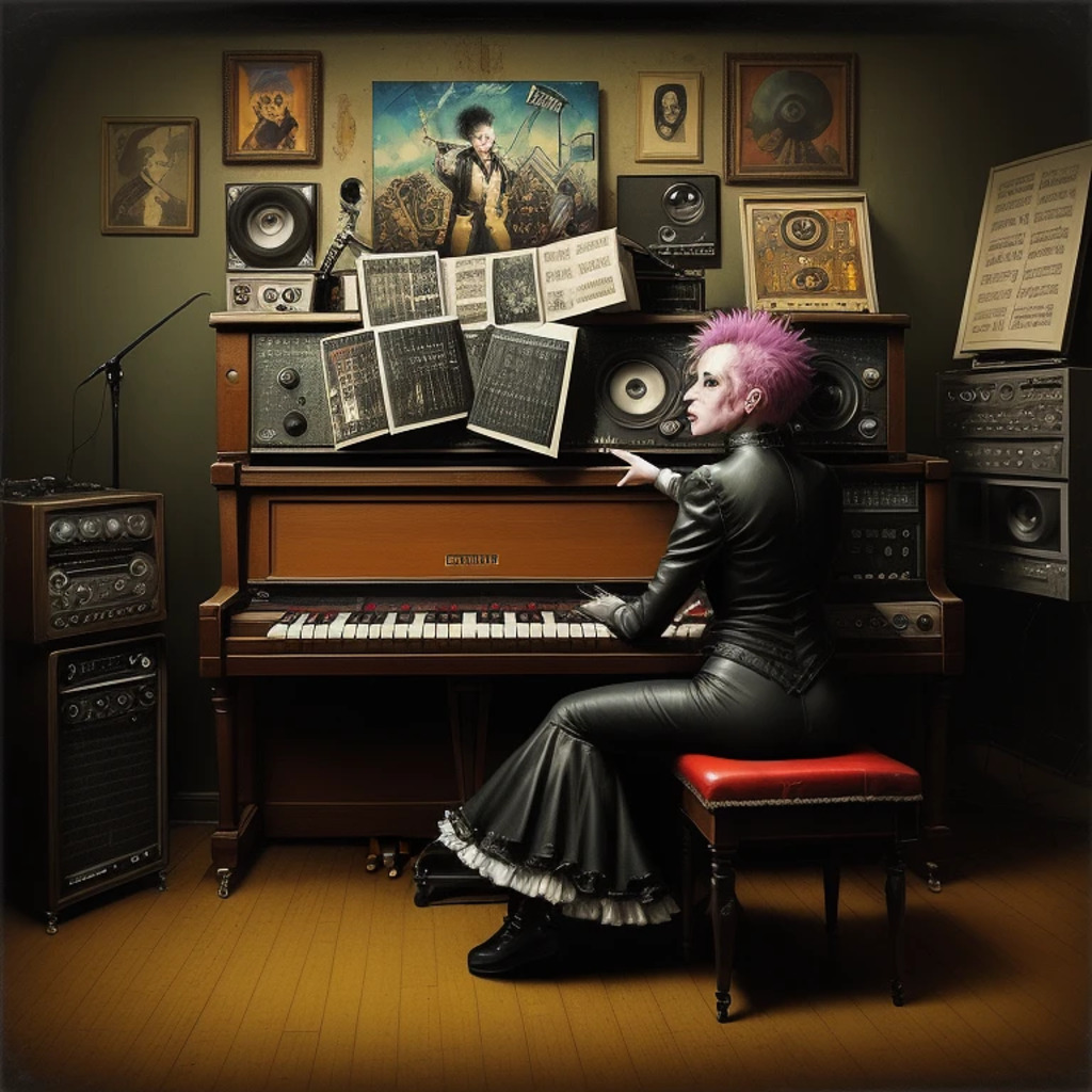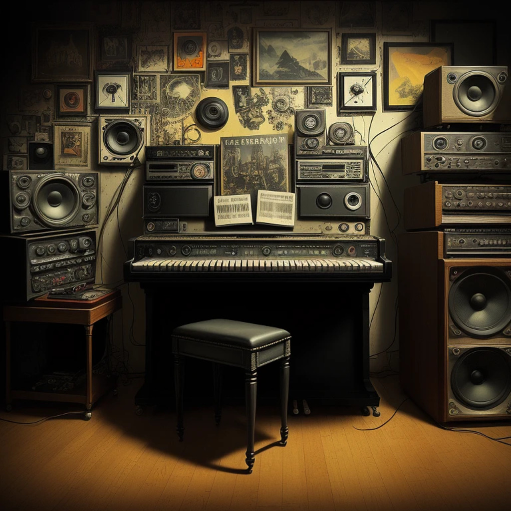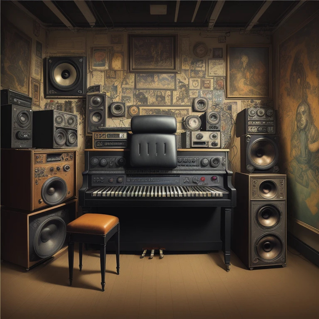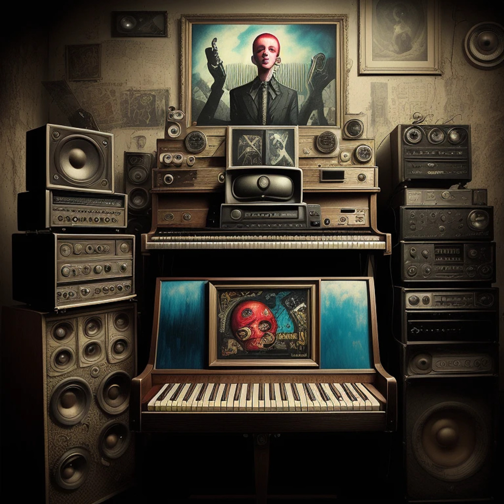 Prompt: music Album cover picture, punk, surreal art, oil picture, radio, speaker, computer, piano, organ, radio studio