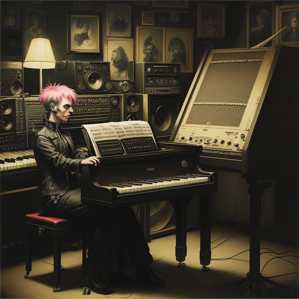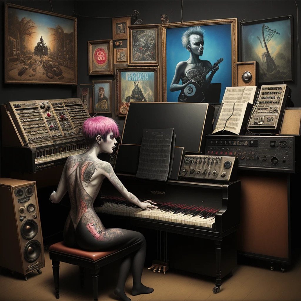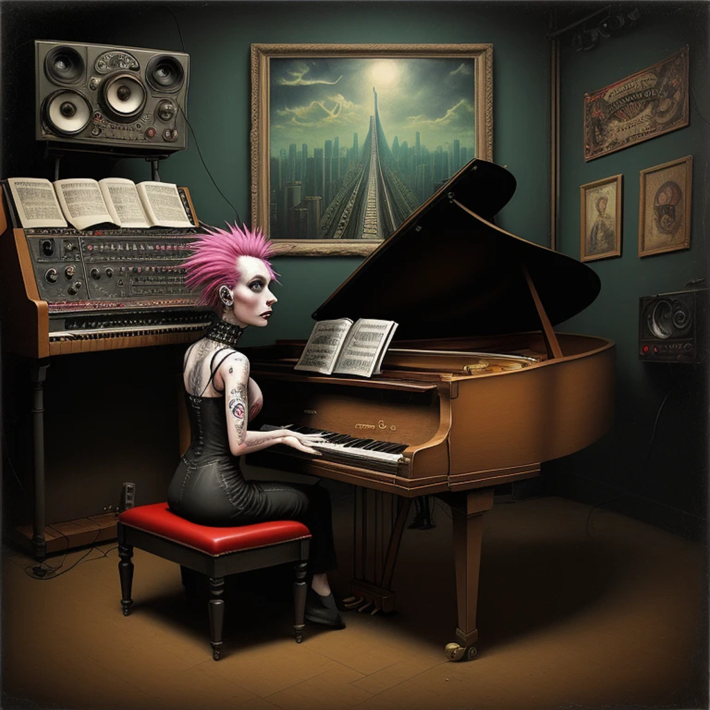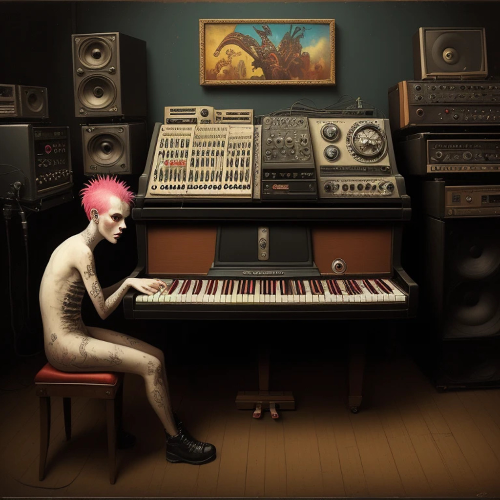 Prompt: music Album cover picture, punk, surreal art, oil picture, radio, speaker, computer, piano, organ, radio studio