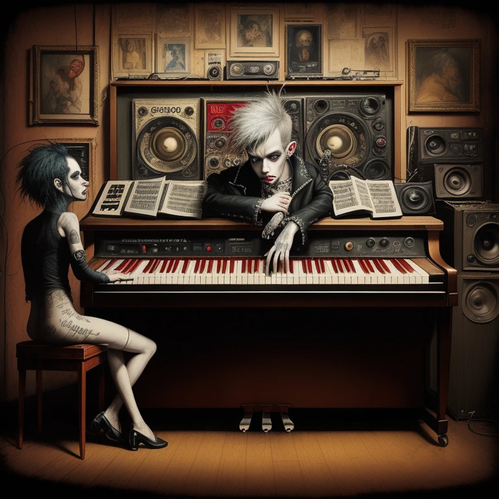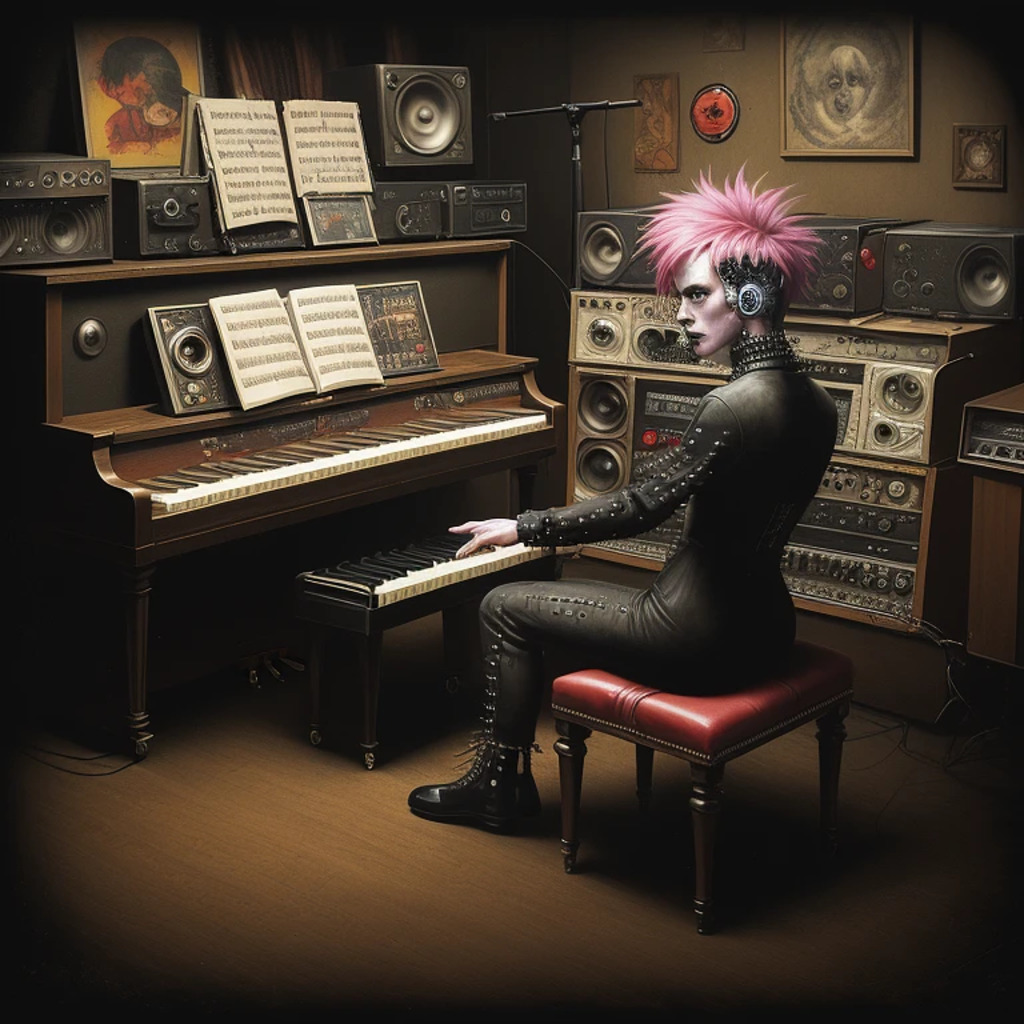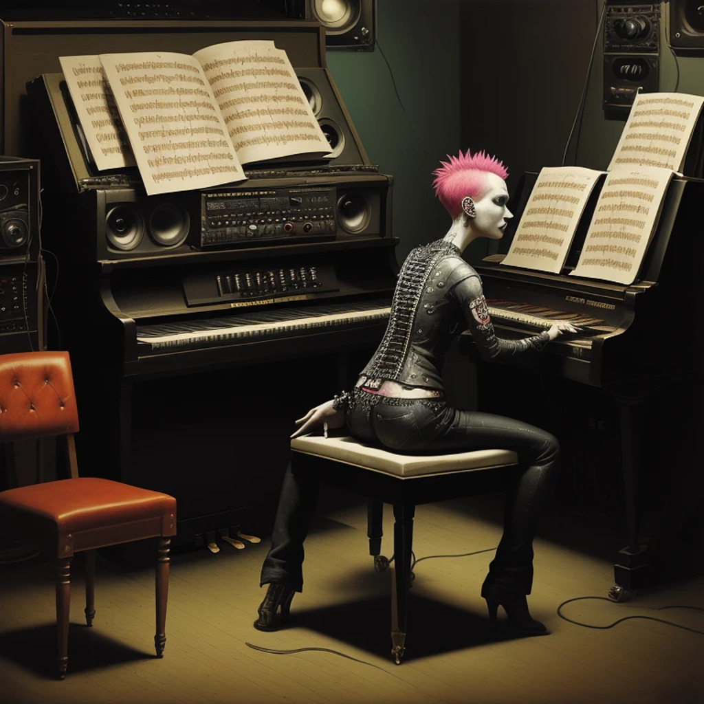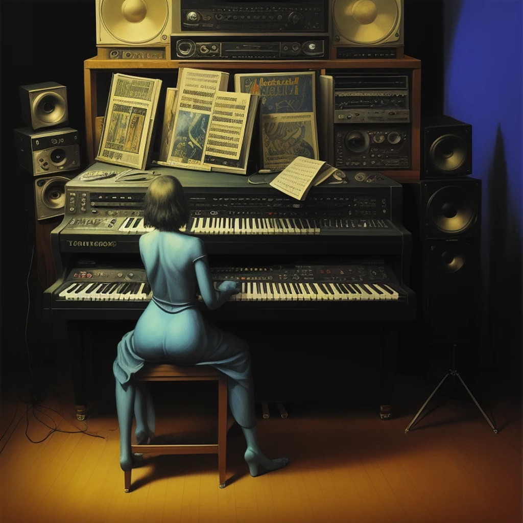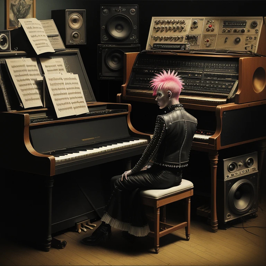 Prompt: music Album cover picture, punk, surreal art, oil picture, radio, speaker, computer, piano, organ, radio studio