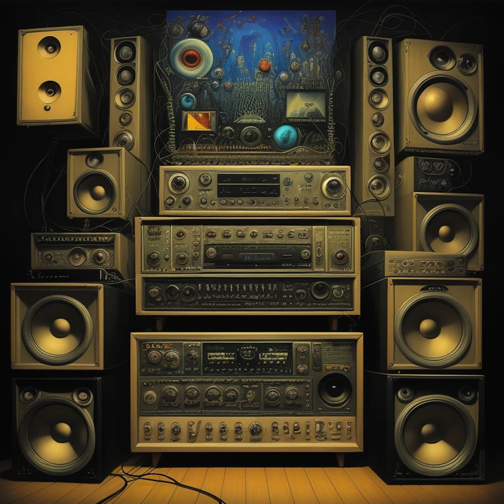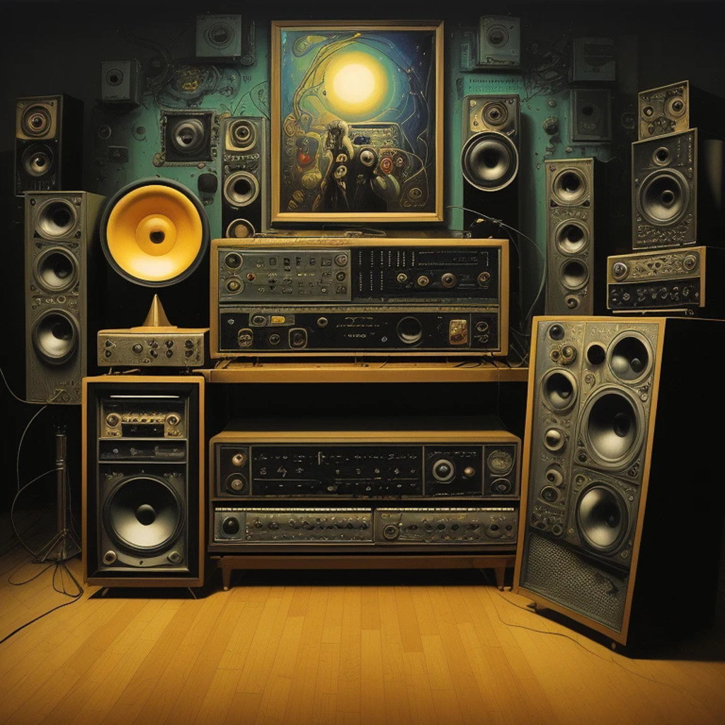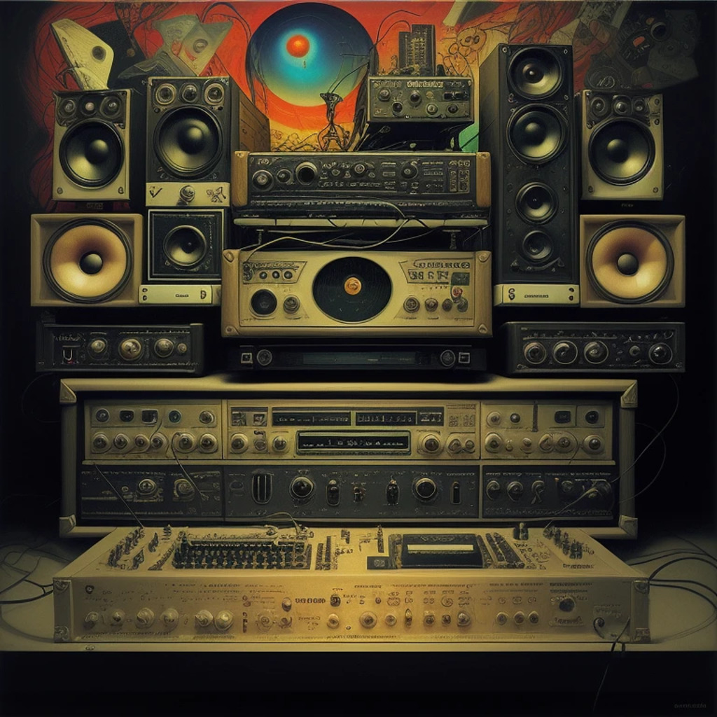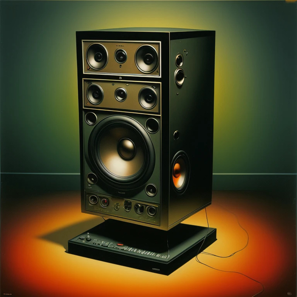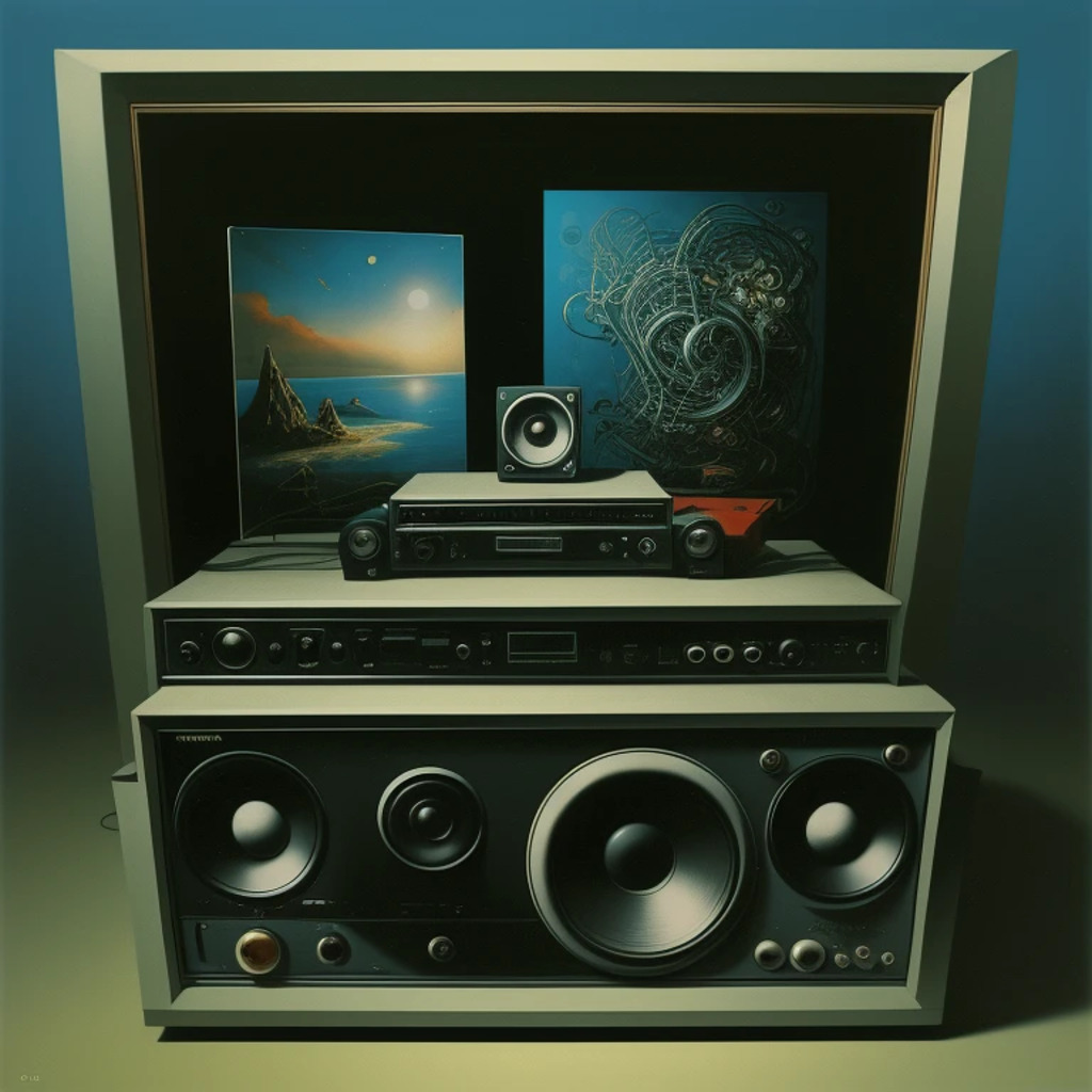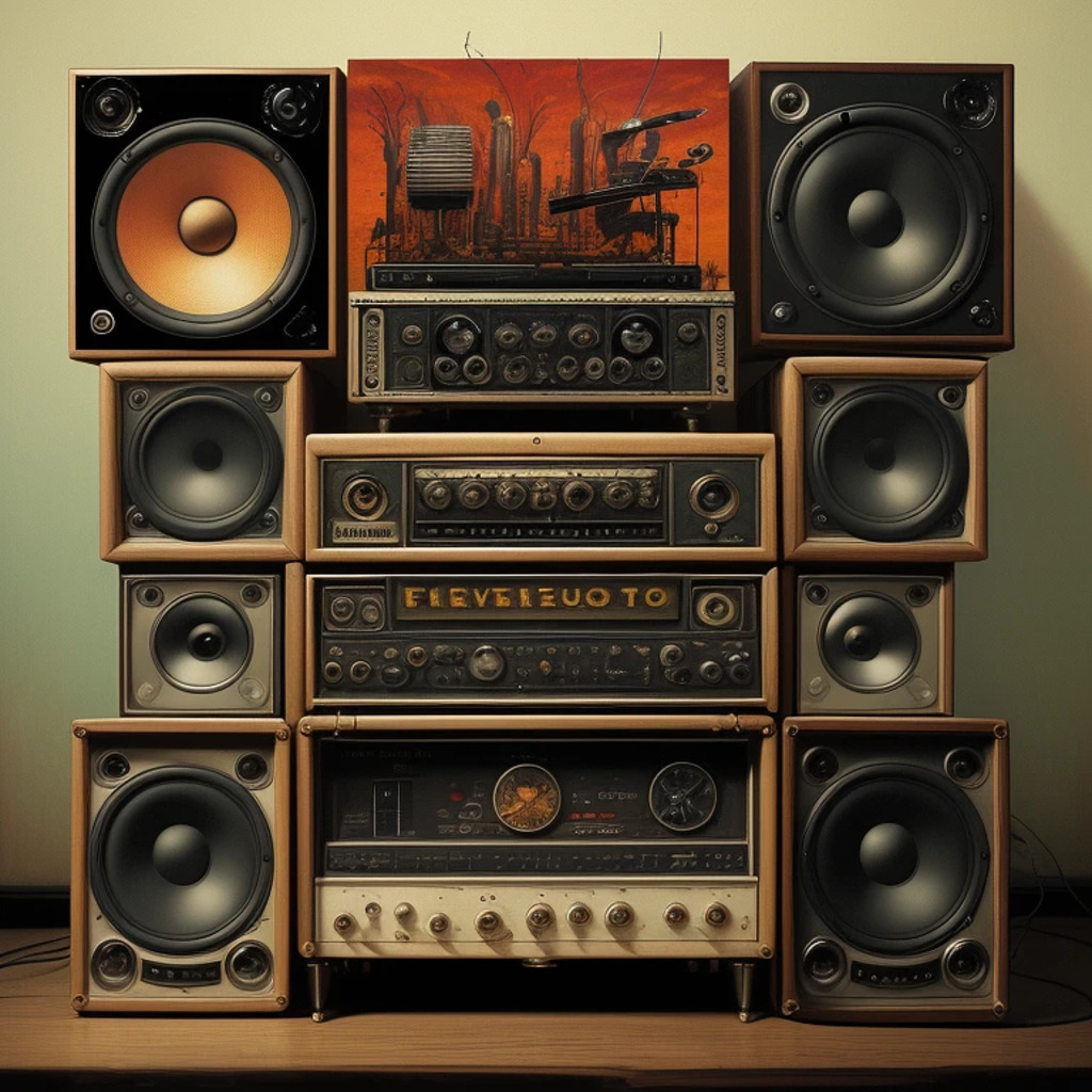 Prompt: music Album cover picture, surreal art, oil picture, speaker, electronic, 1980