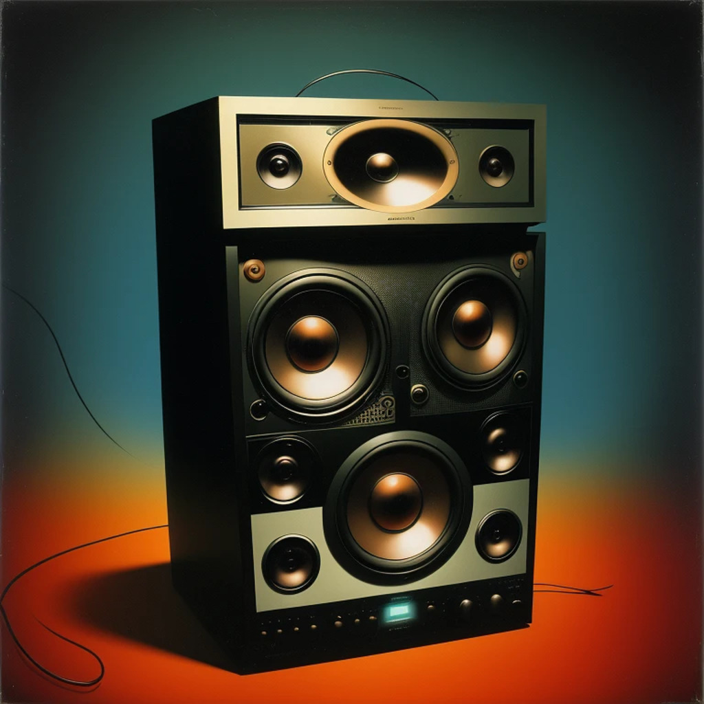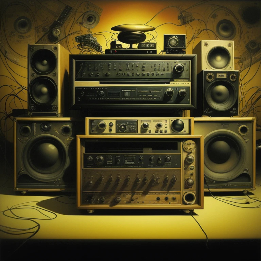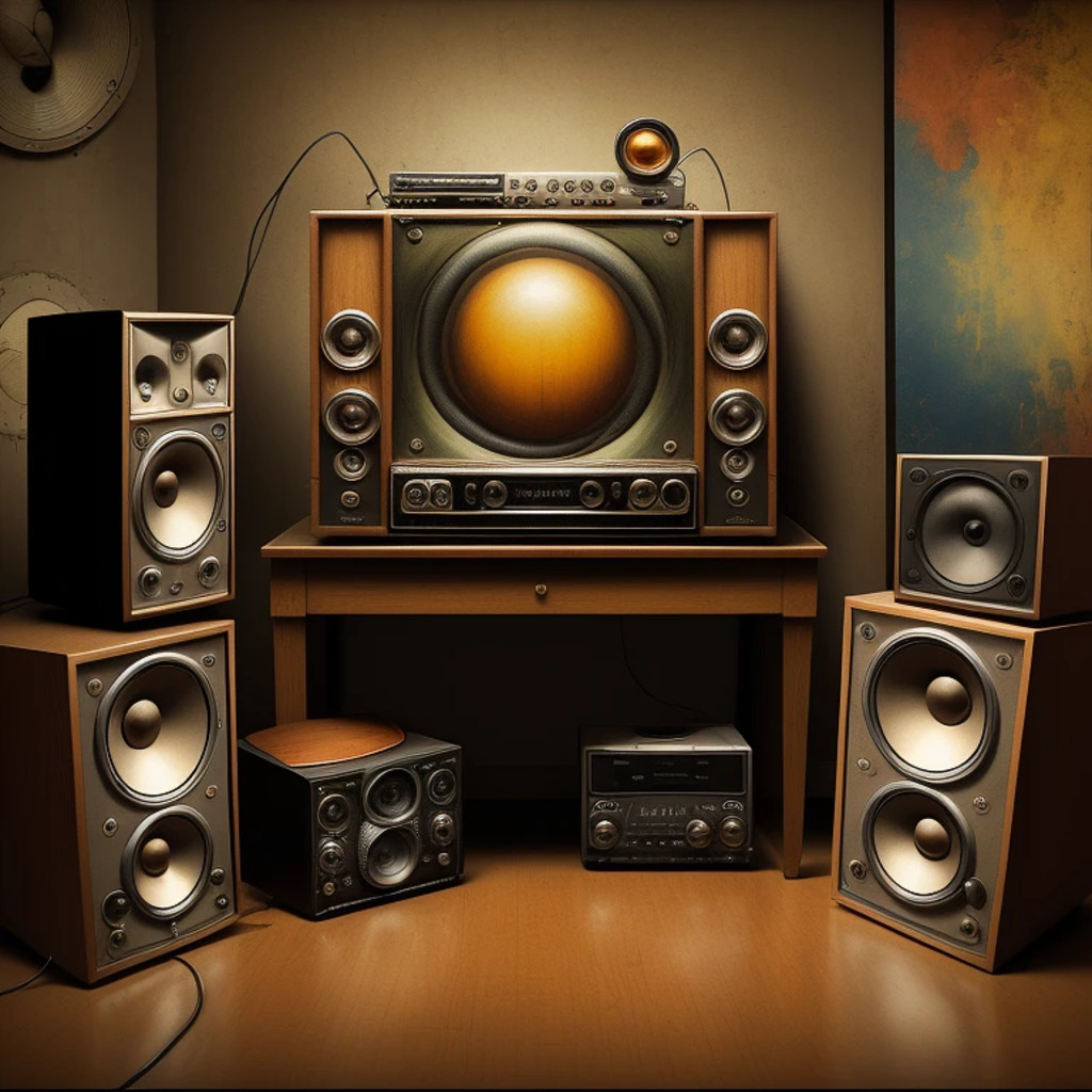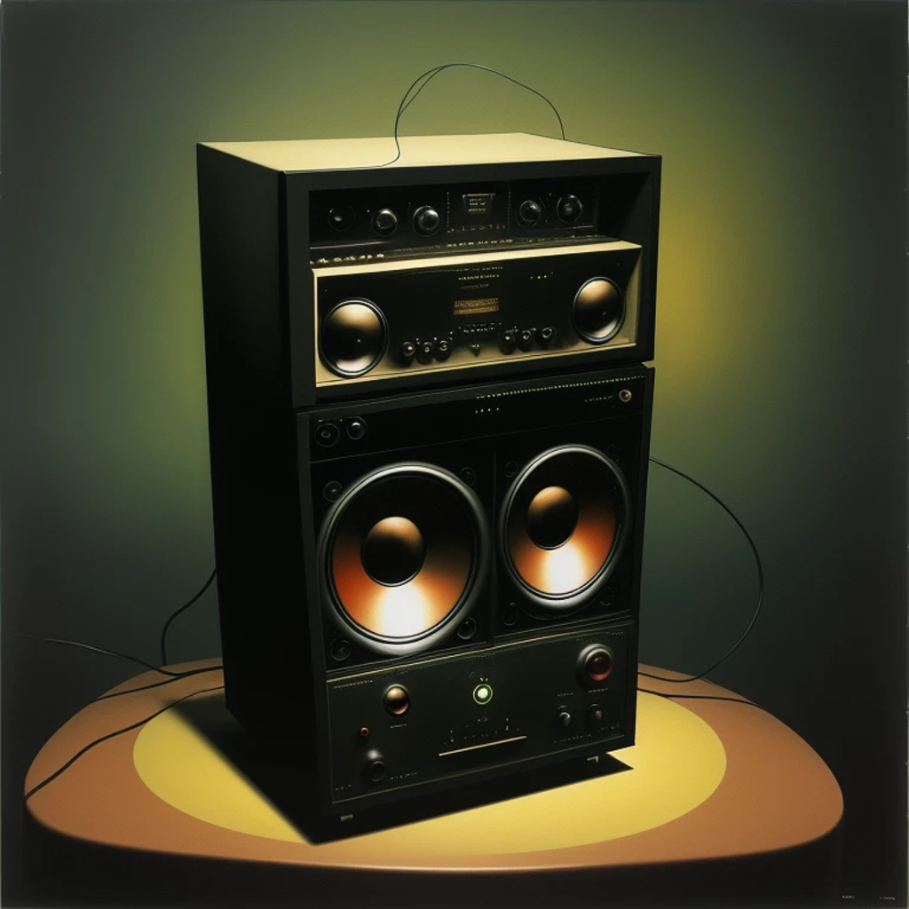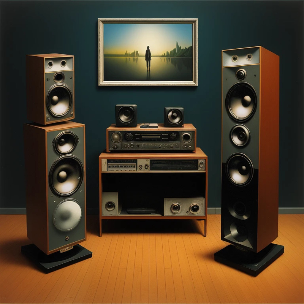 Prompt: music Album cover picture, surreal art, oil picture, speaker, electronic, 1980