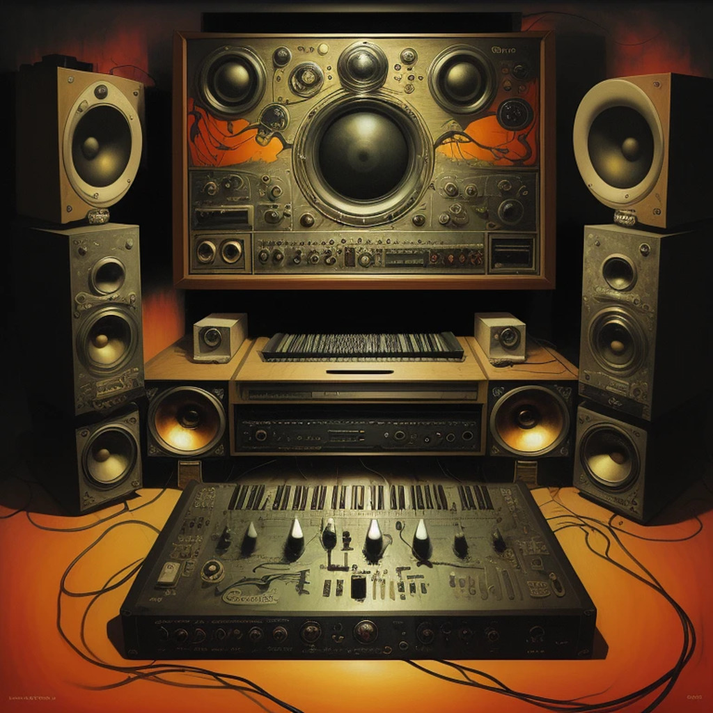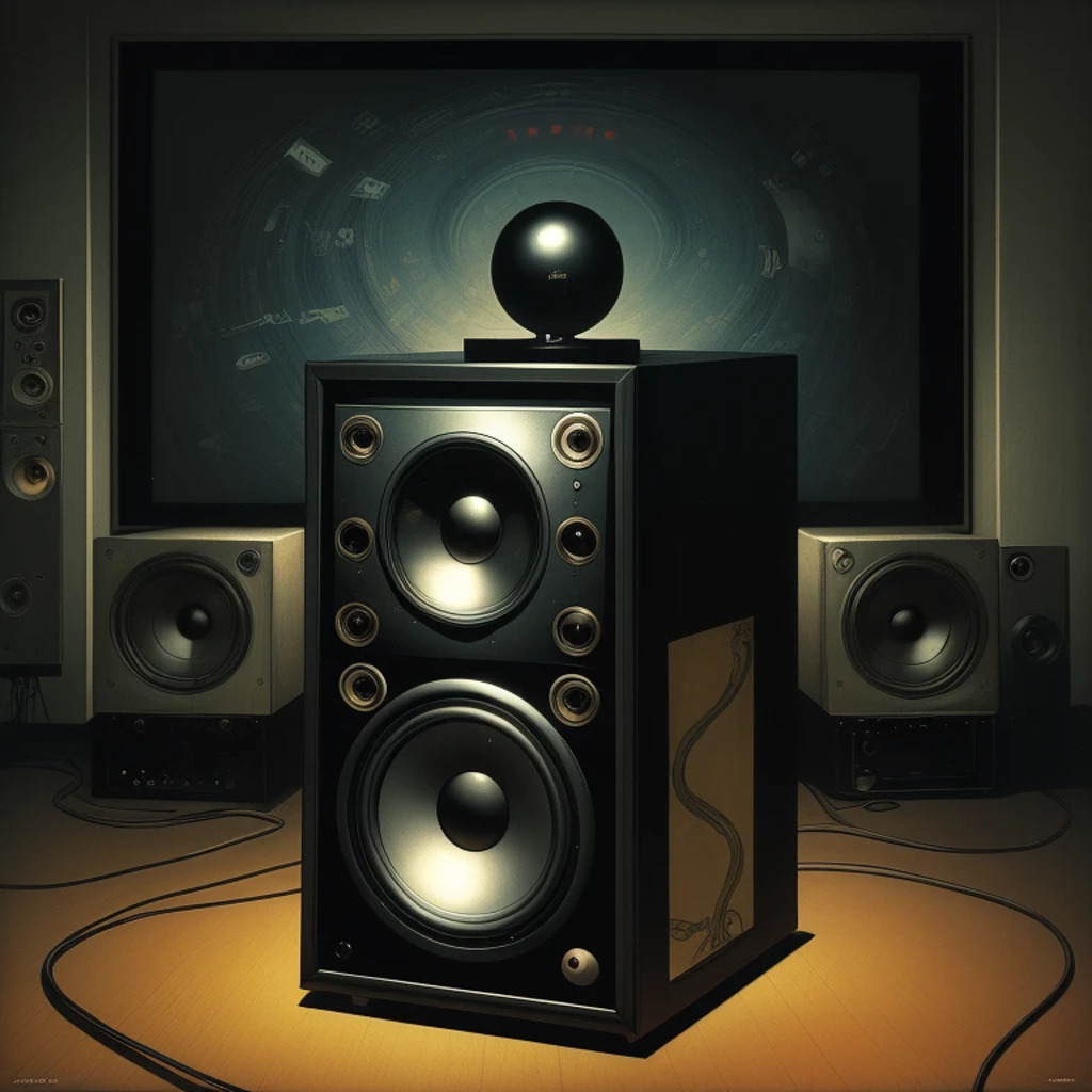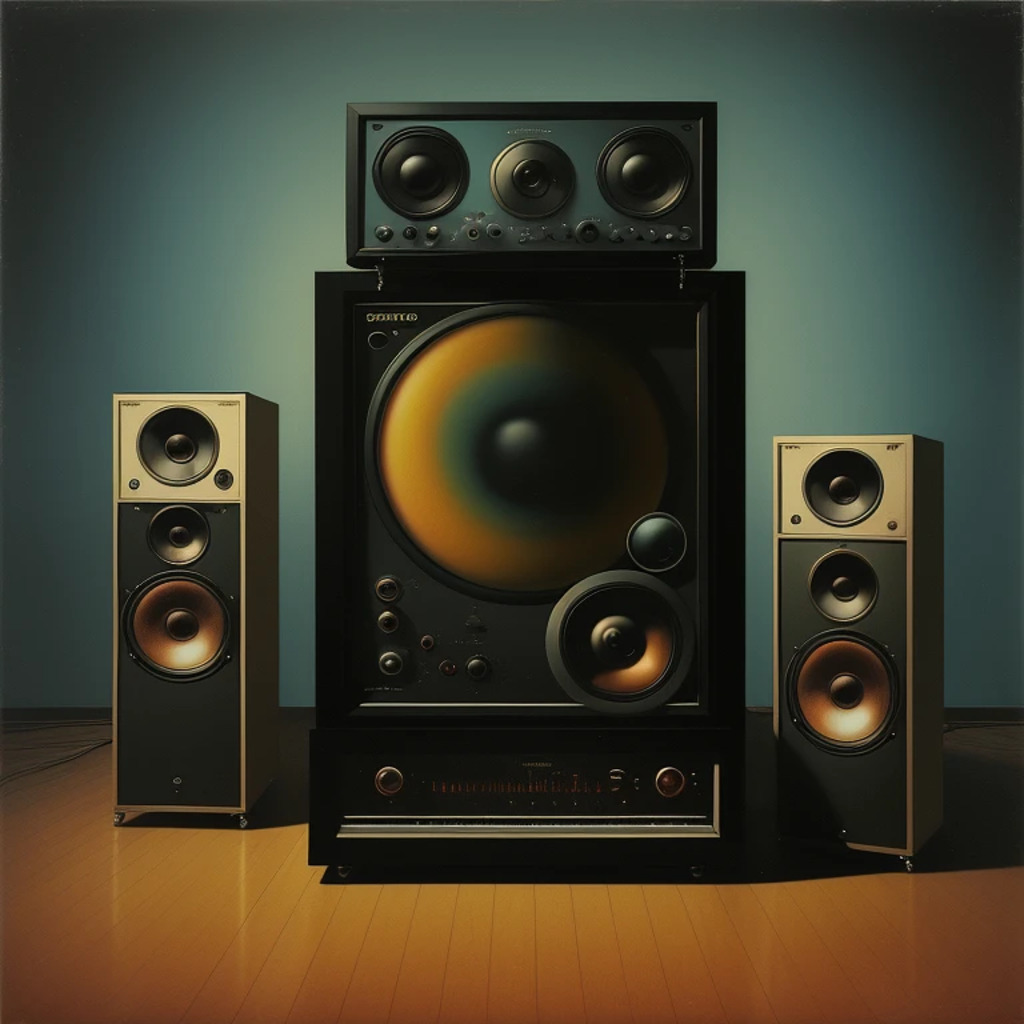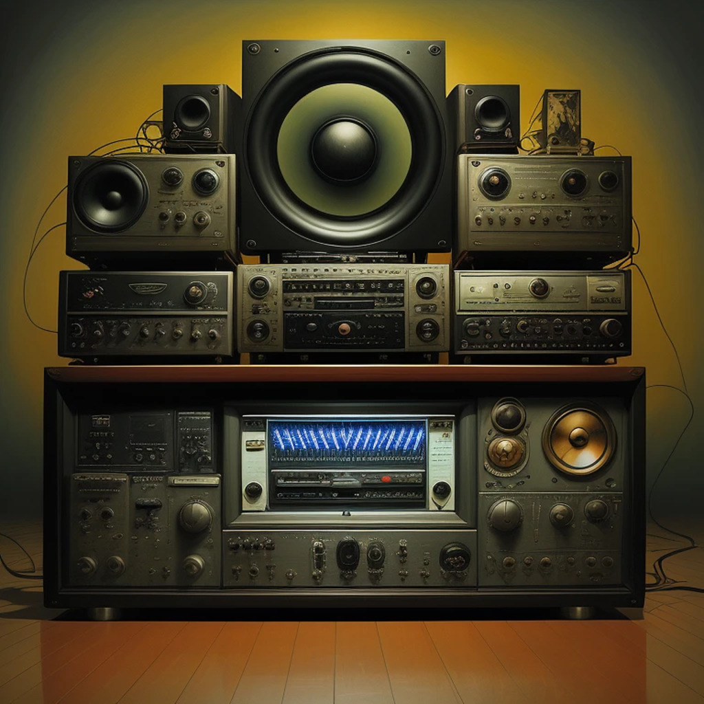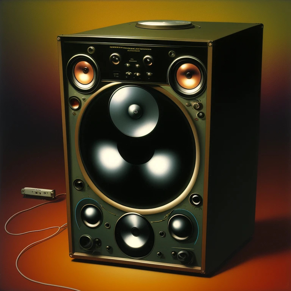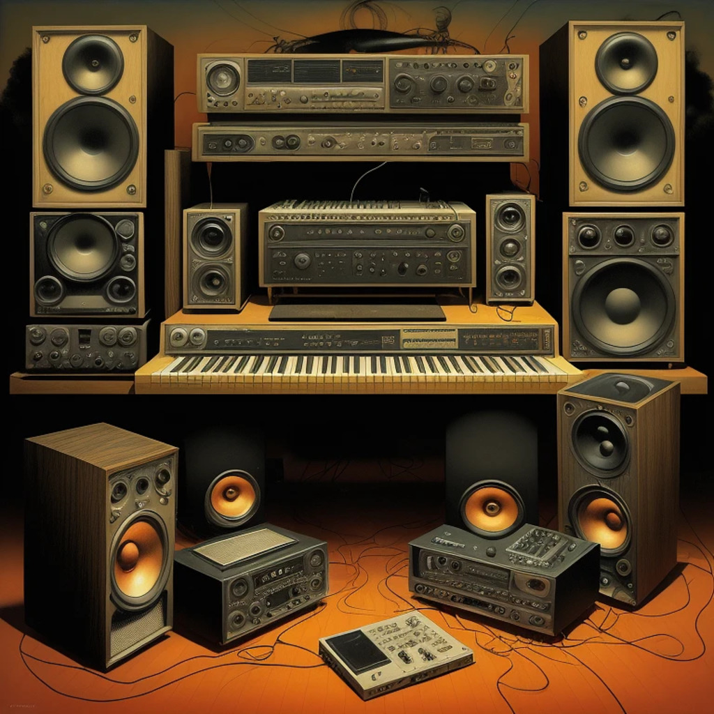 Prompt: music Album cover picture, surreal art, oil picture, speaker, electronic, 1980