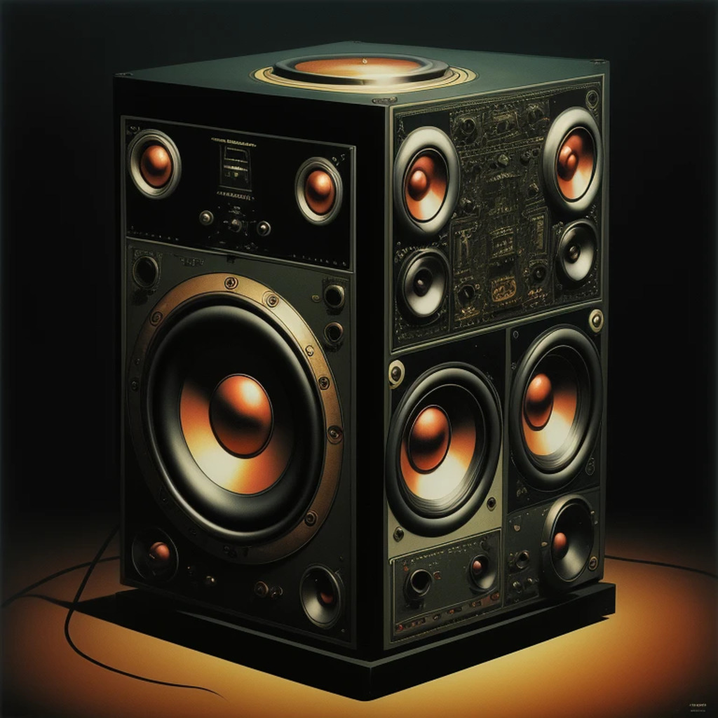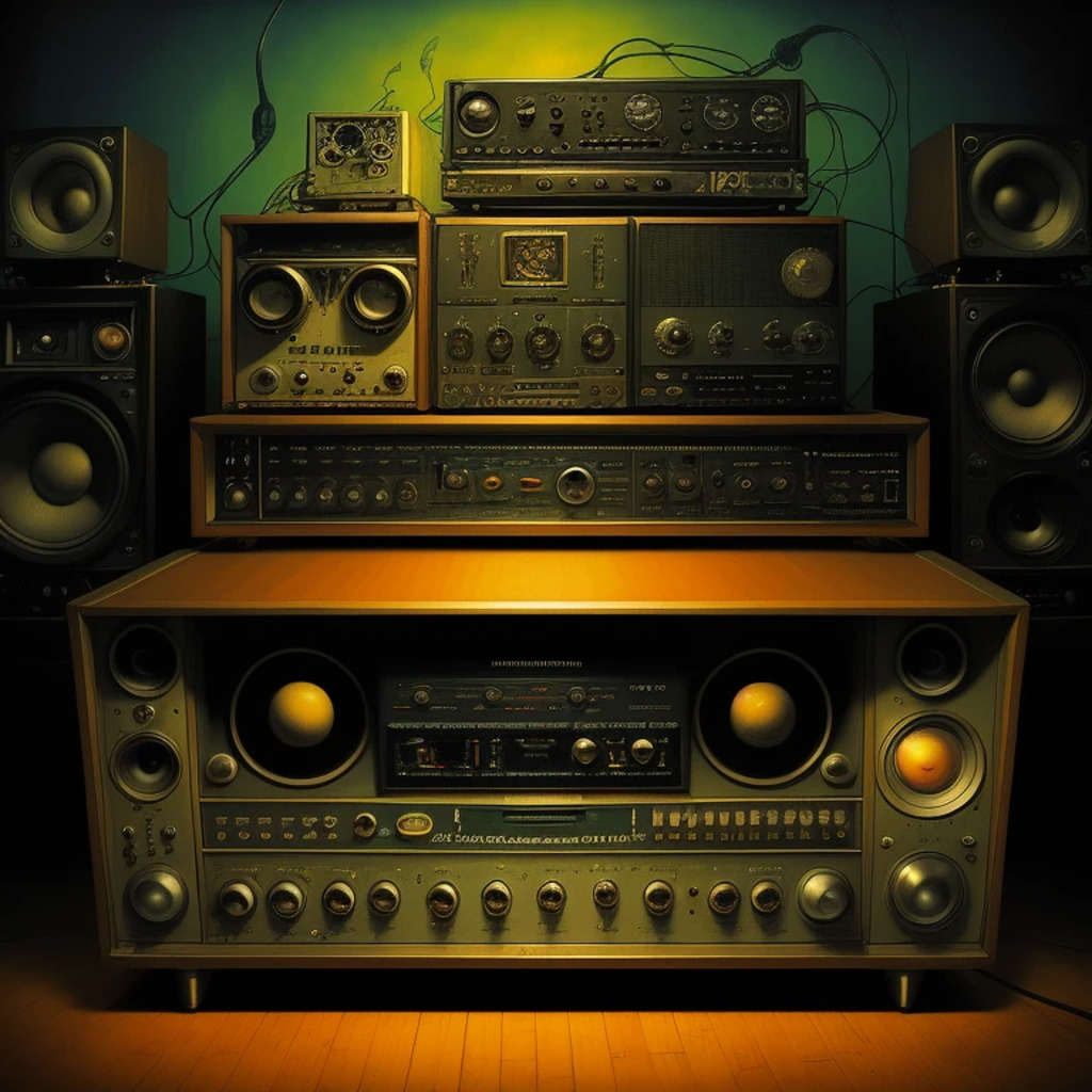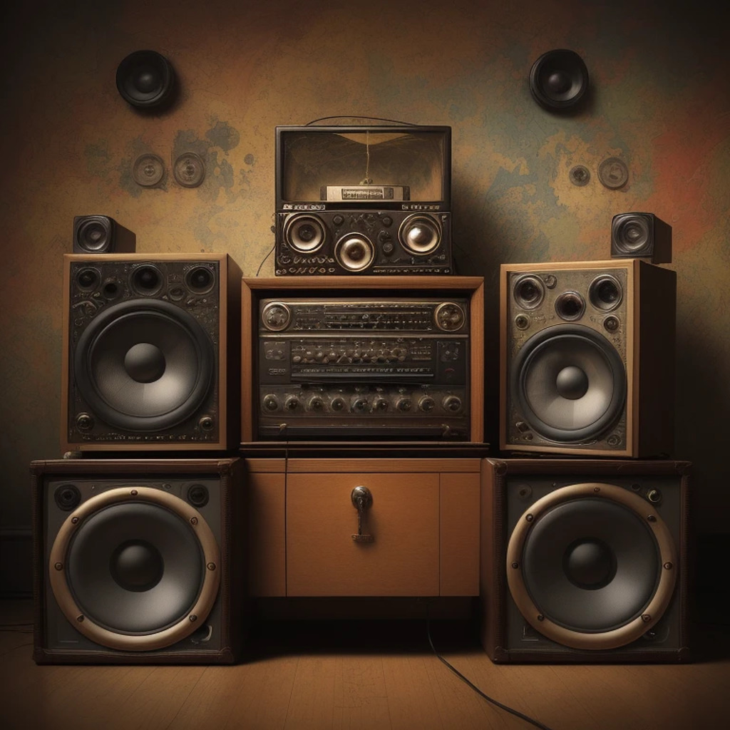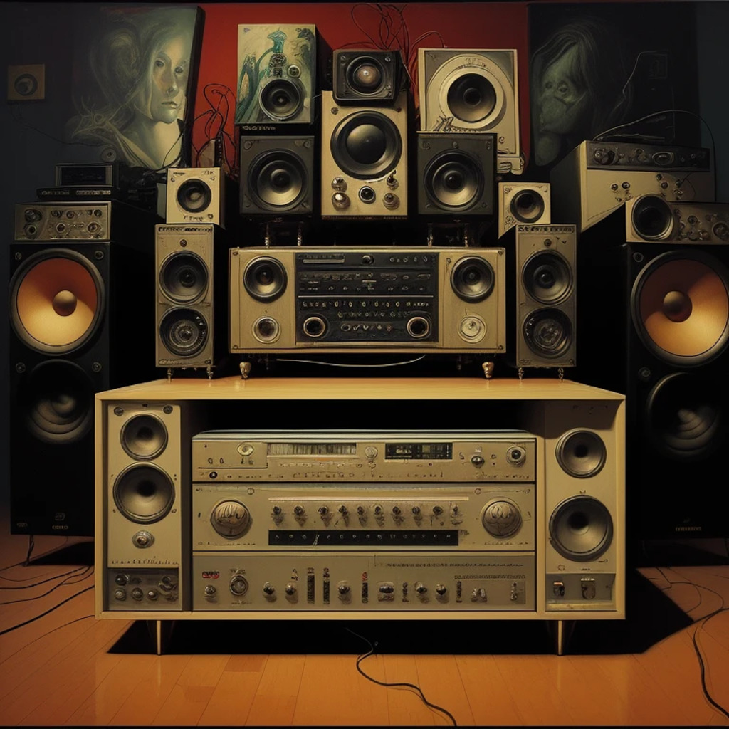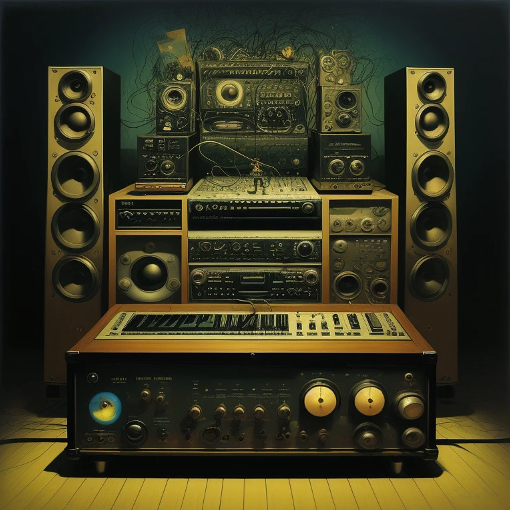 Prompt: music Album cover picture, surreal art, oil picture, speaker, electronic, 1980