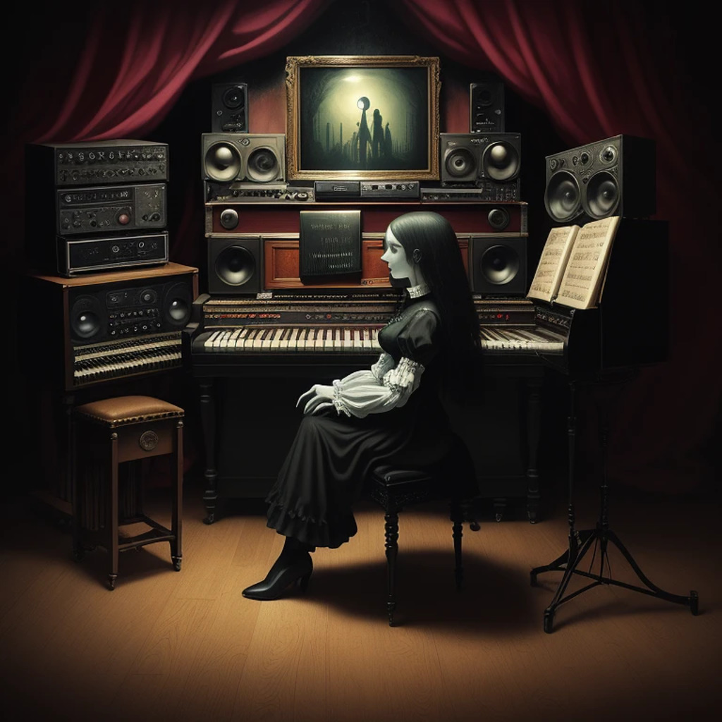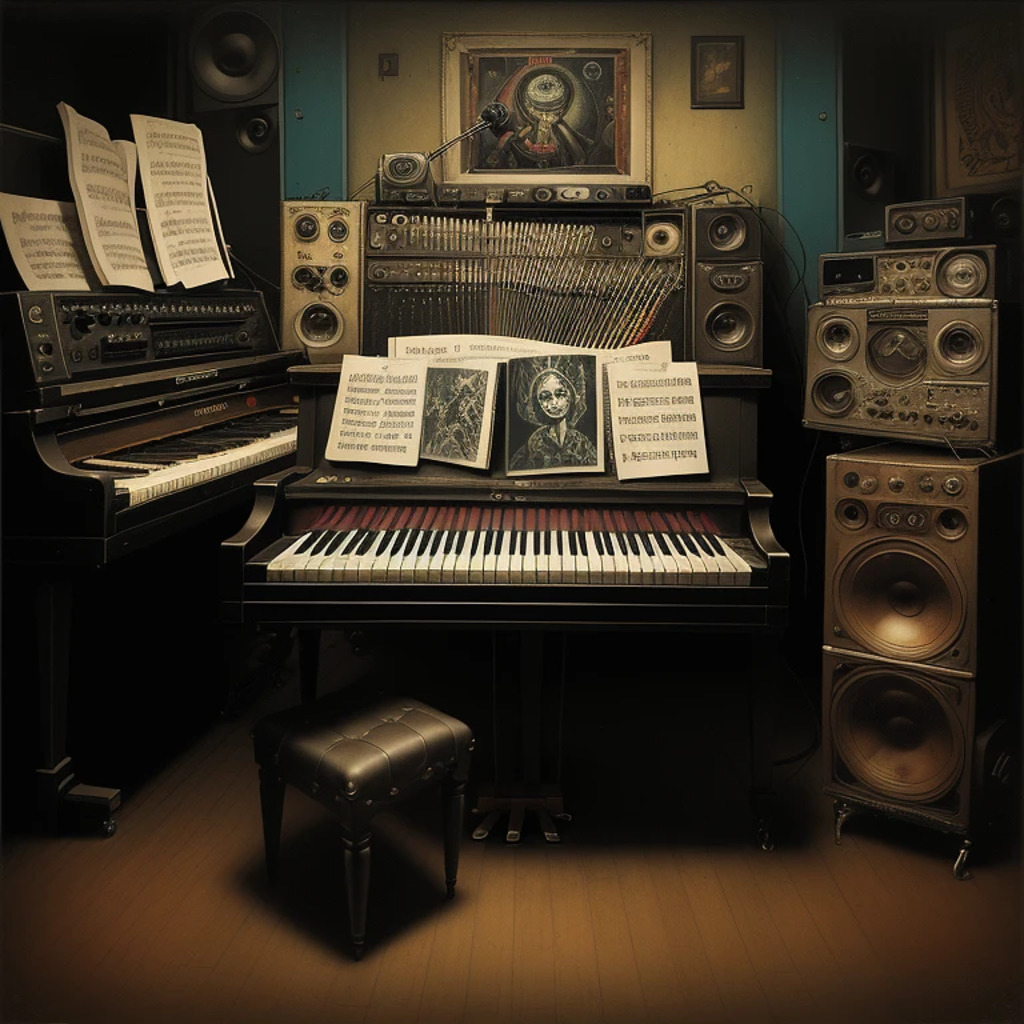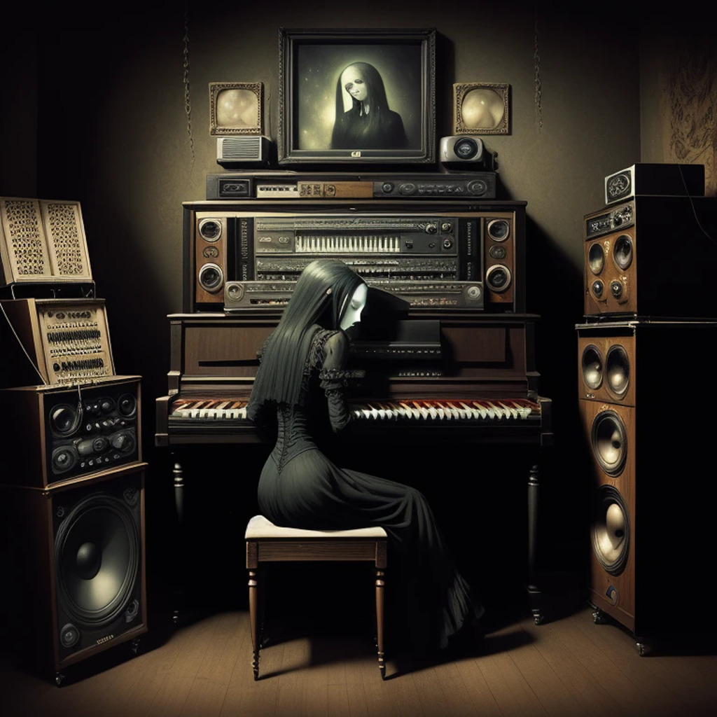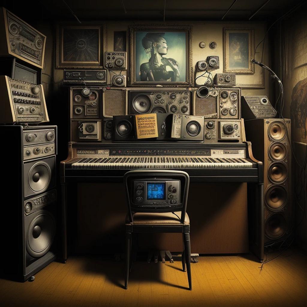 Prompt: music Album cover picture, gothic, surreal art, oil picture, radio, speaker, computer, piano, organ, radio studio