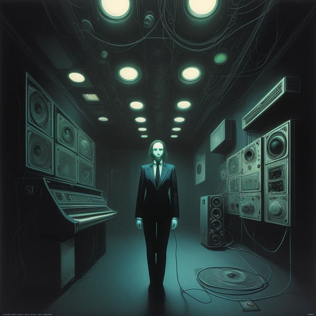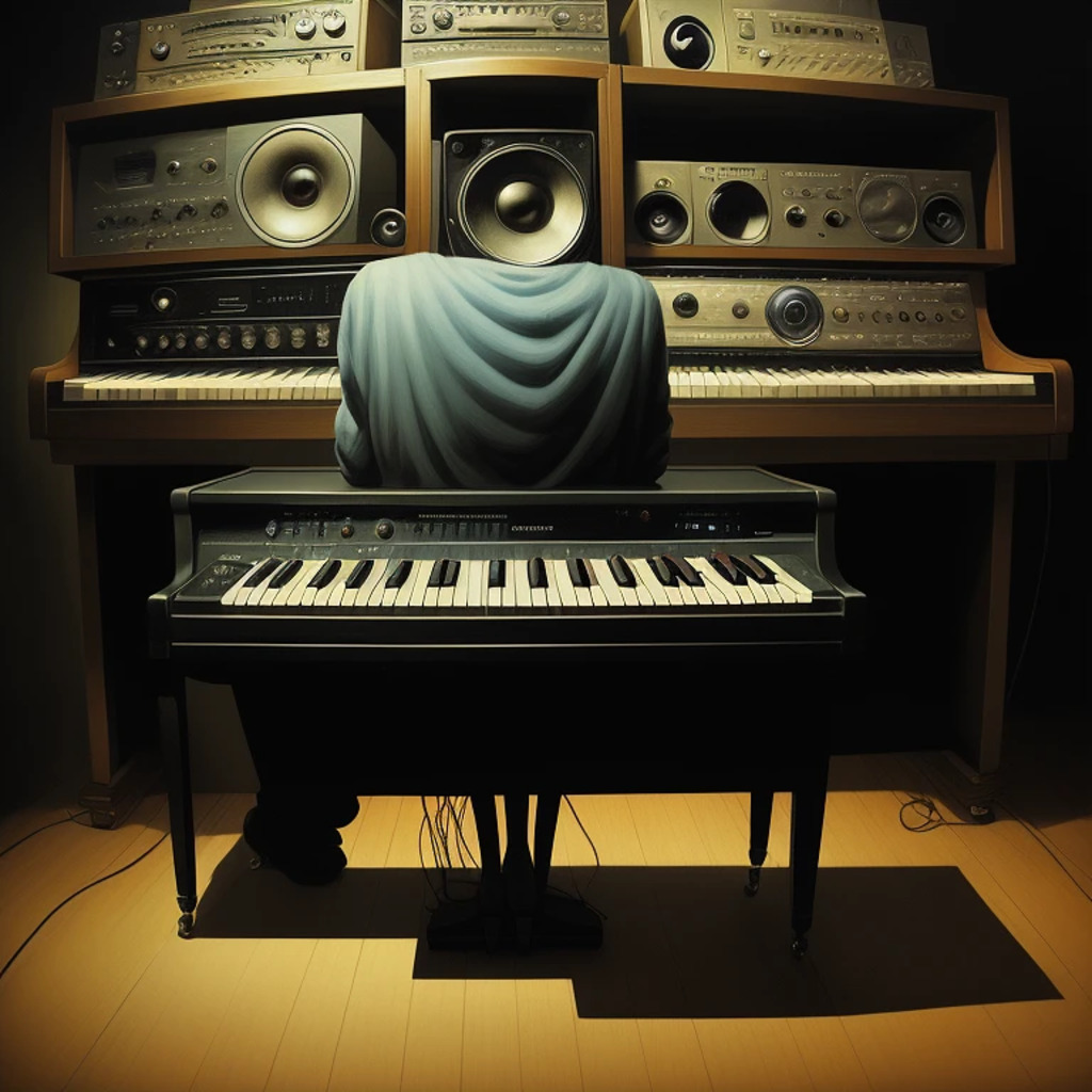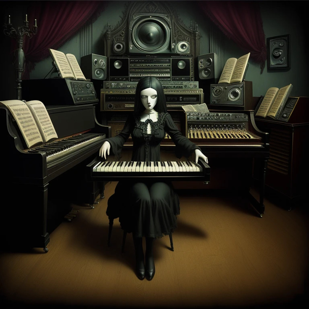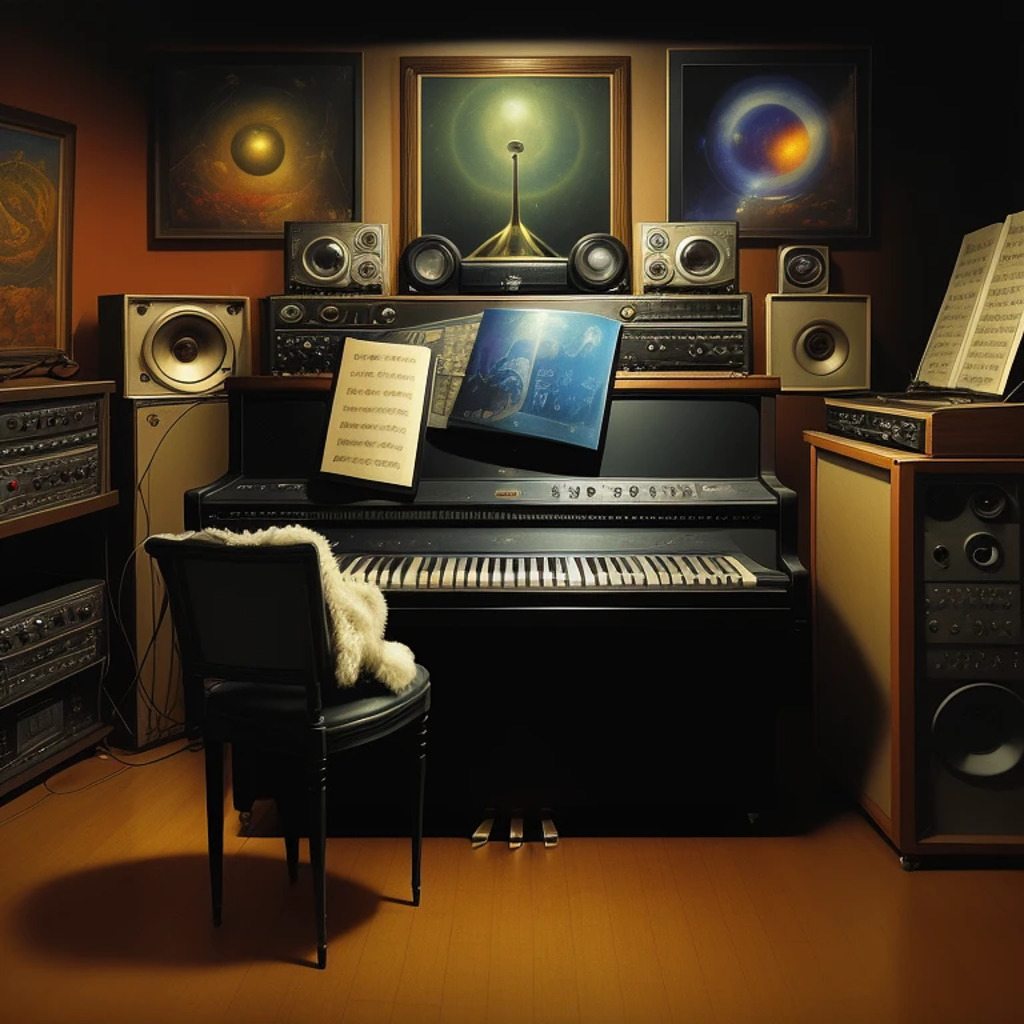 Prompt: music Album cover picture, gothic, surreal art, oil picture, radio, speaker, computer, piano, organ, radio studio