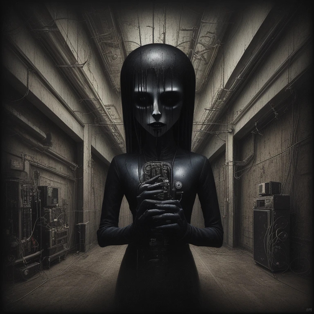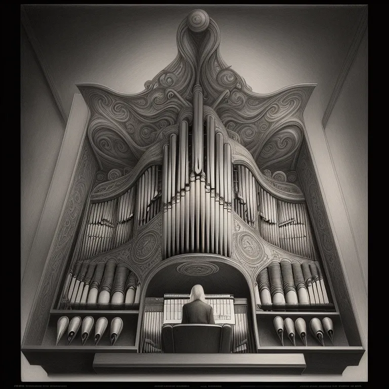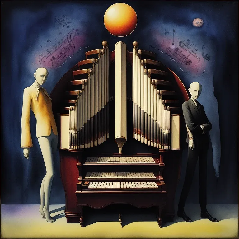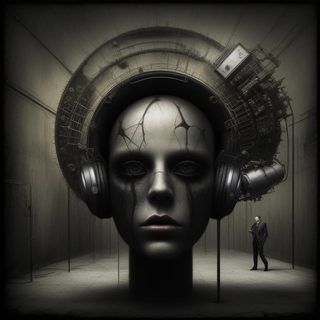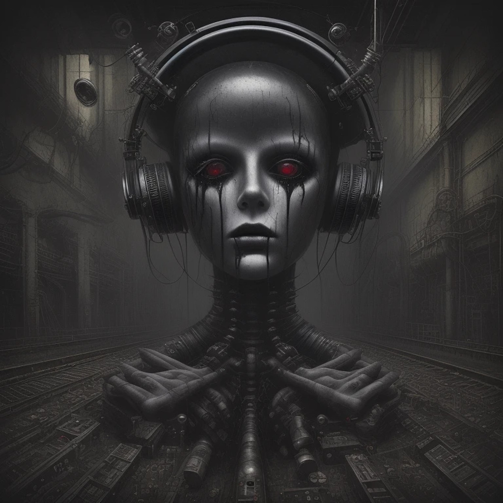 Prompt: music Album cover picture, gothic, surreal art, oil picture, radio, speaker, computer, piano, organ, radio studio