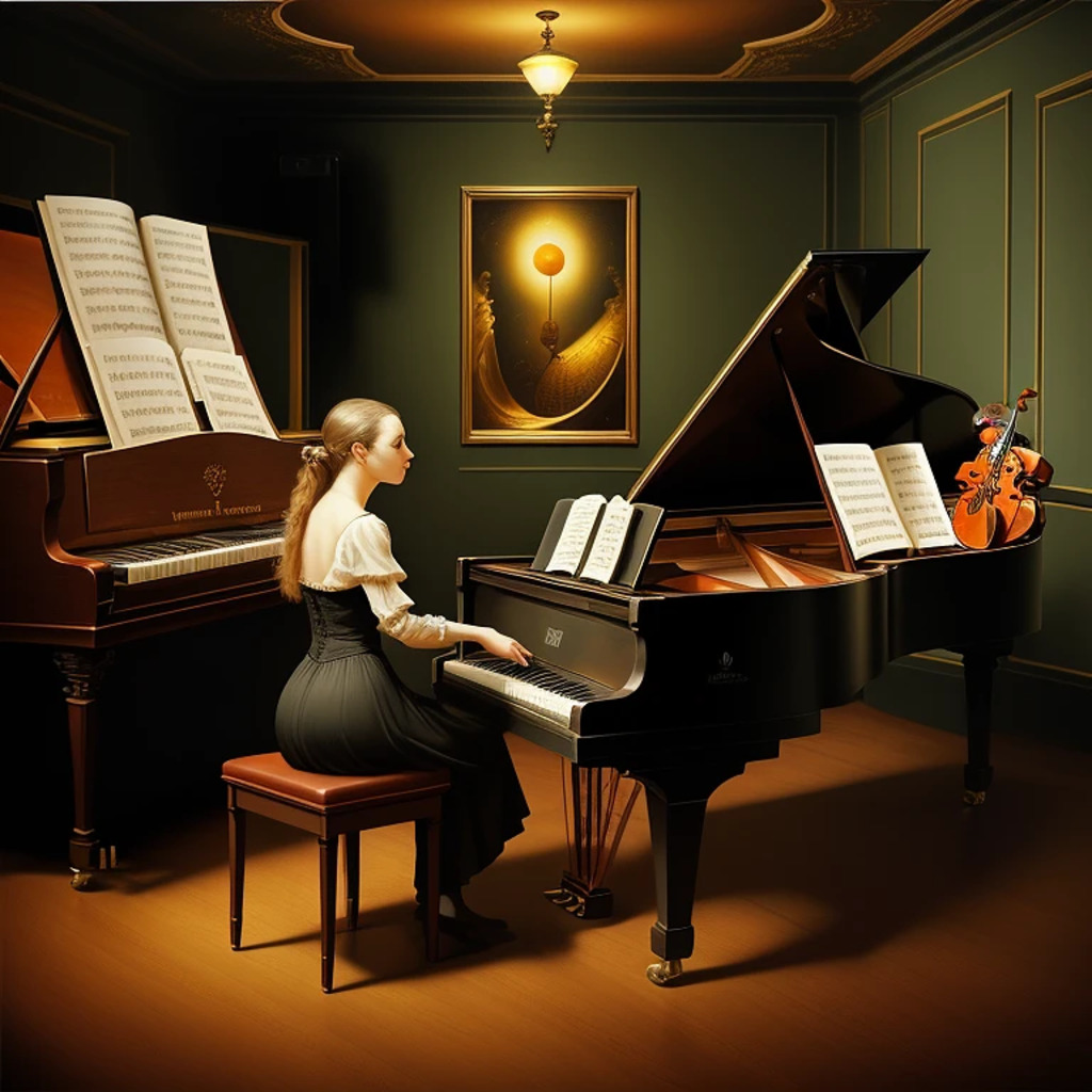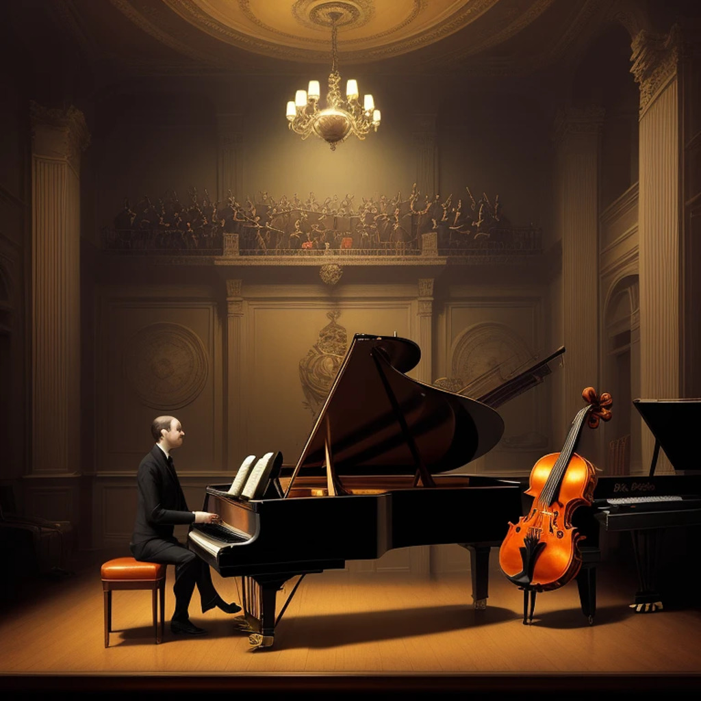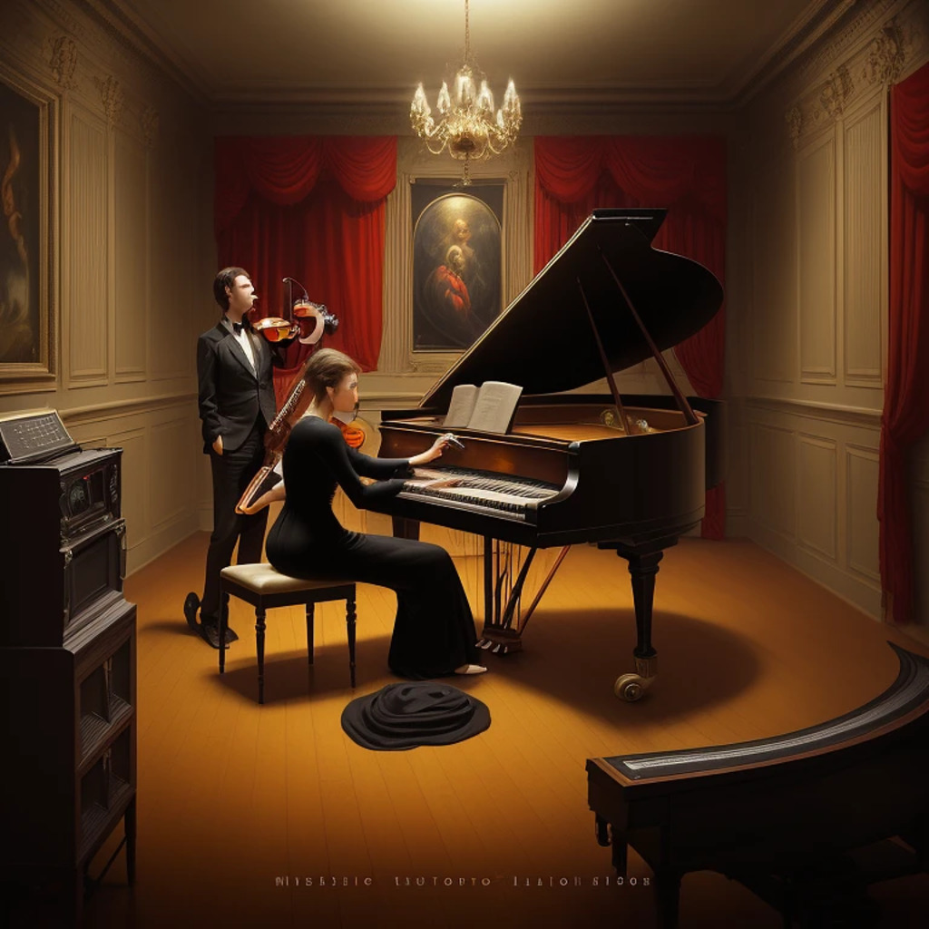 Prompt: music Album cover picture, classical music , surreal art, oil picture, radio, speaker, piano, violin, radio studio