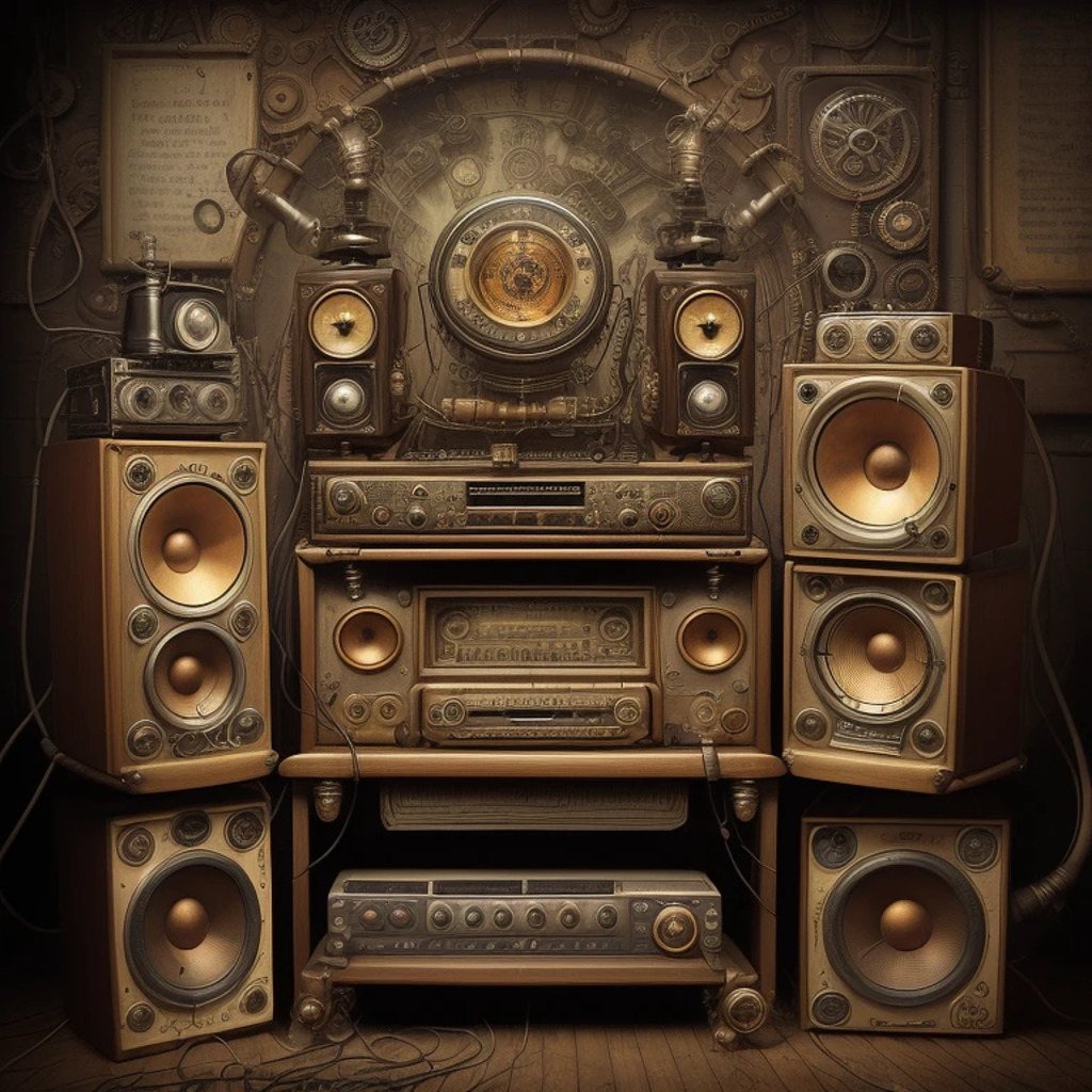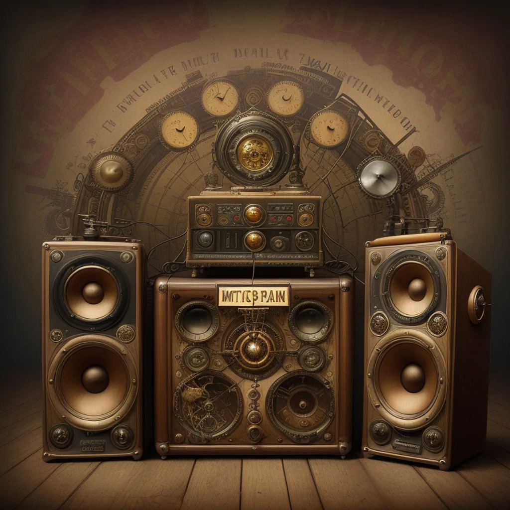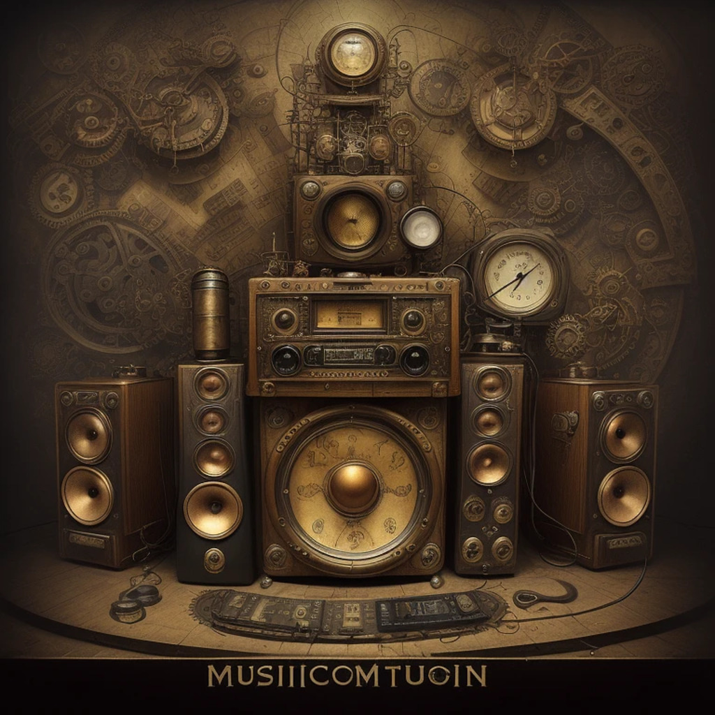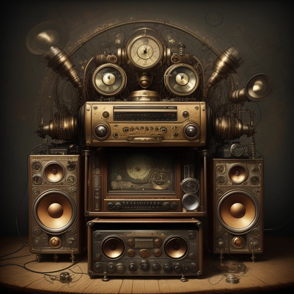 Prompt: music Album cover picture, steampunk, surreal art oil picture, radio broadcast, music instruments