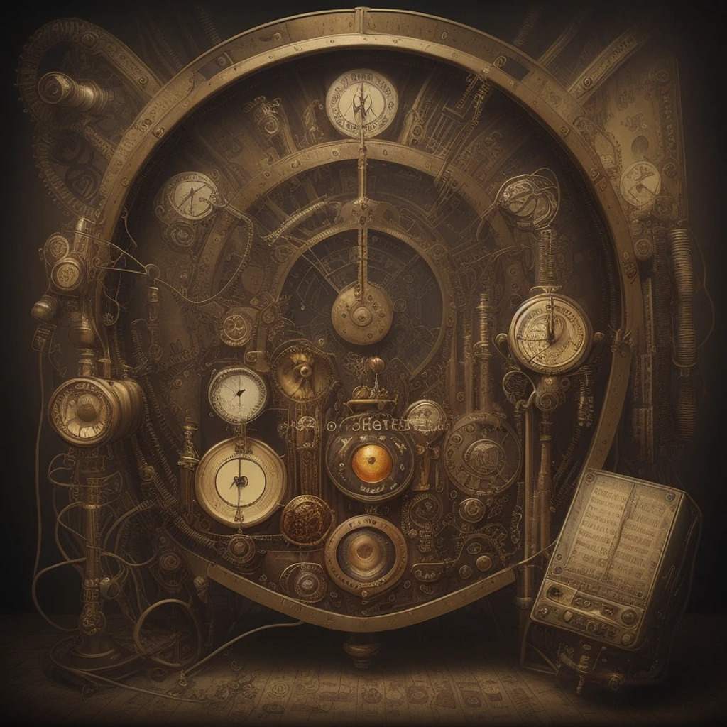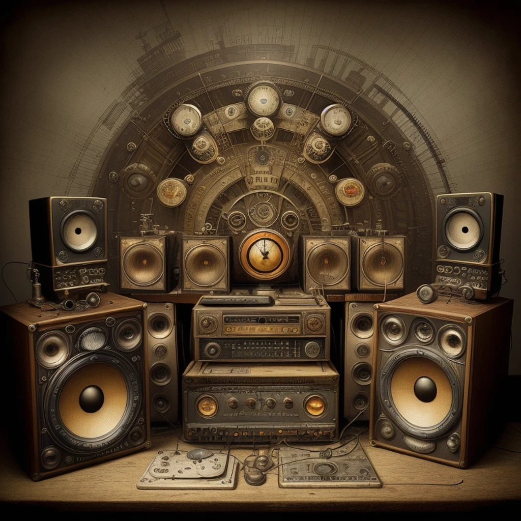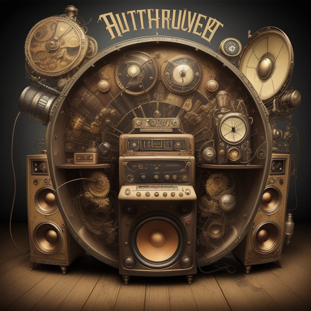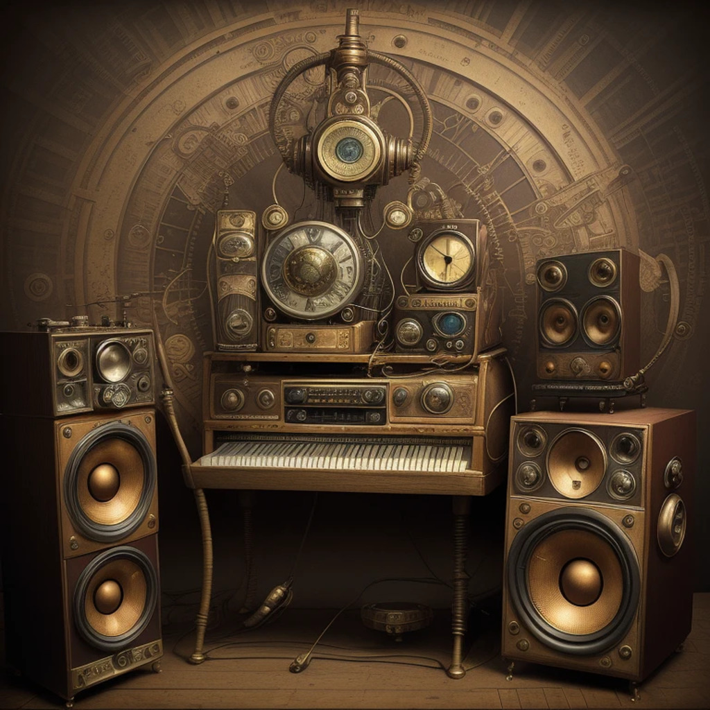 Prompt: music Album cover picture, steampunk, surreal art oil picture, radio broadcast, music instruments