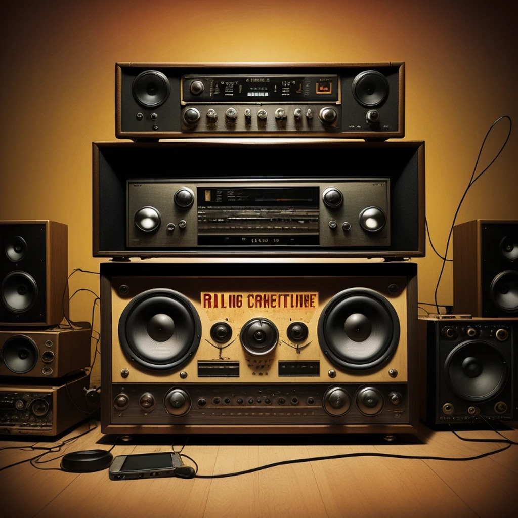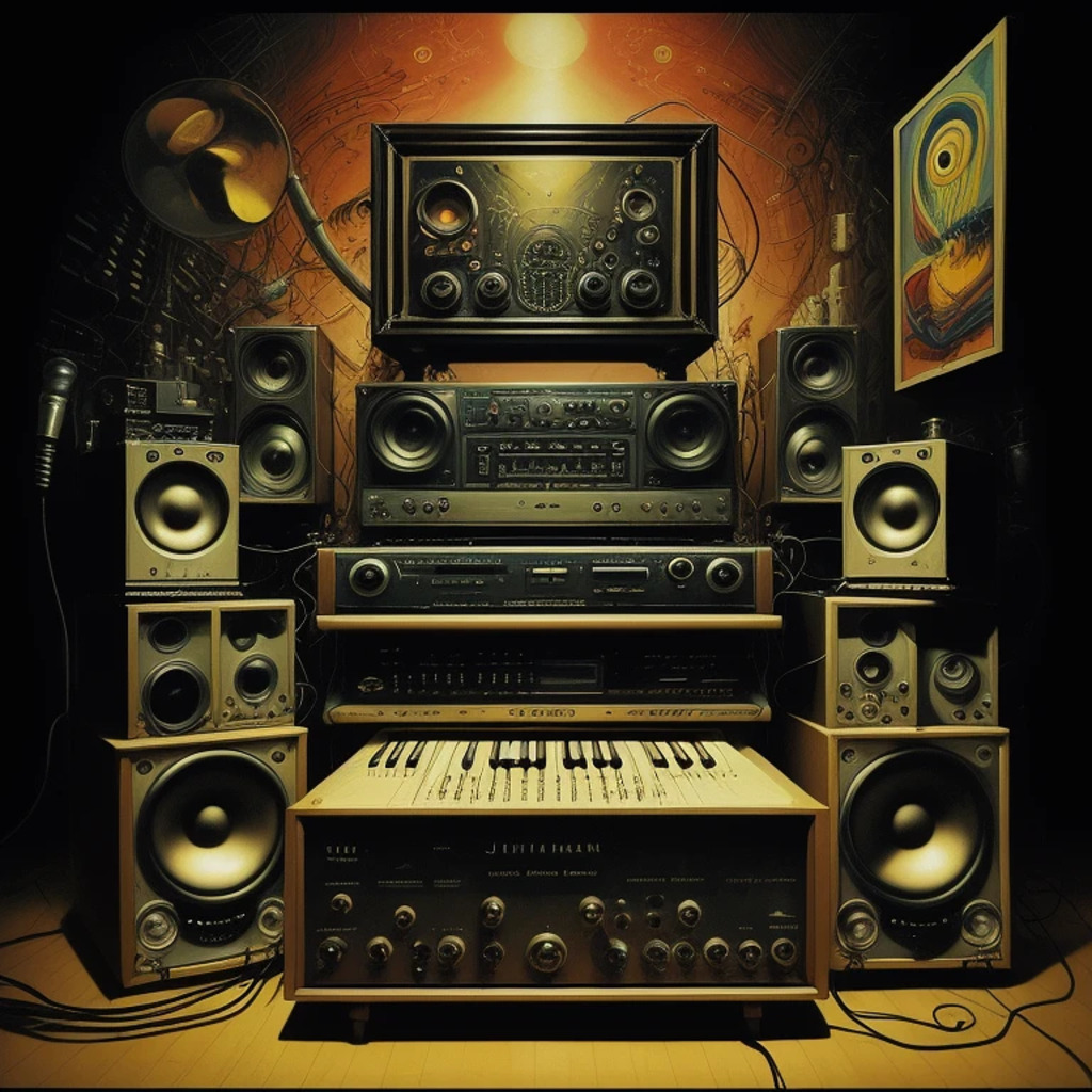 Prompt: music Album cover picture, surreal art oil picture, radio, speaker, music instruments