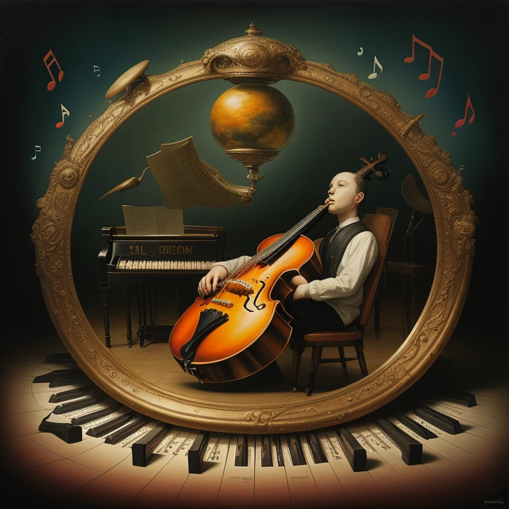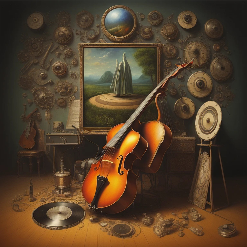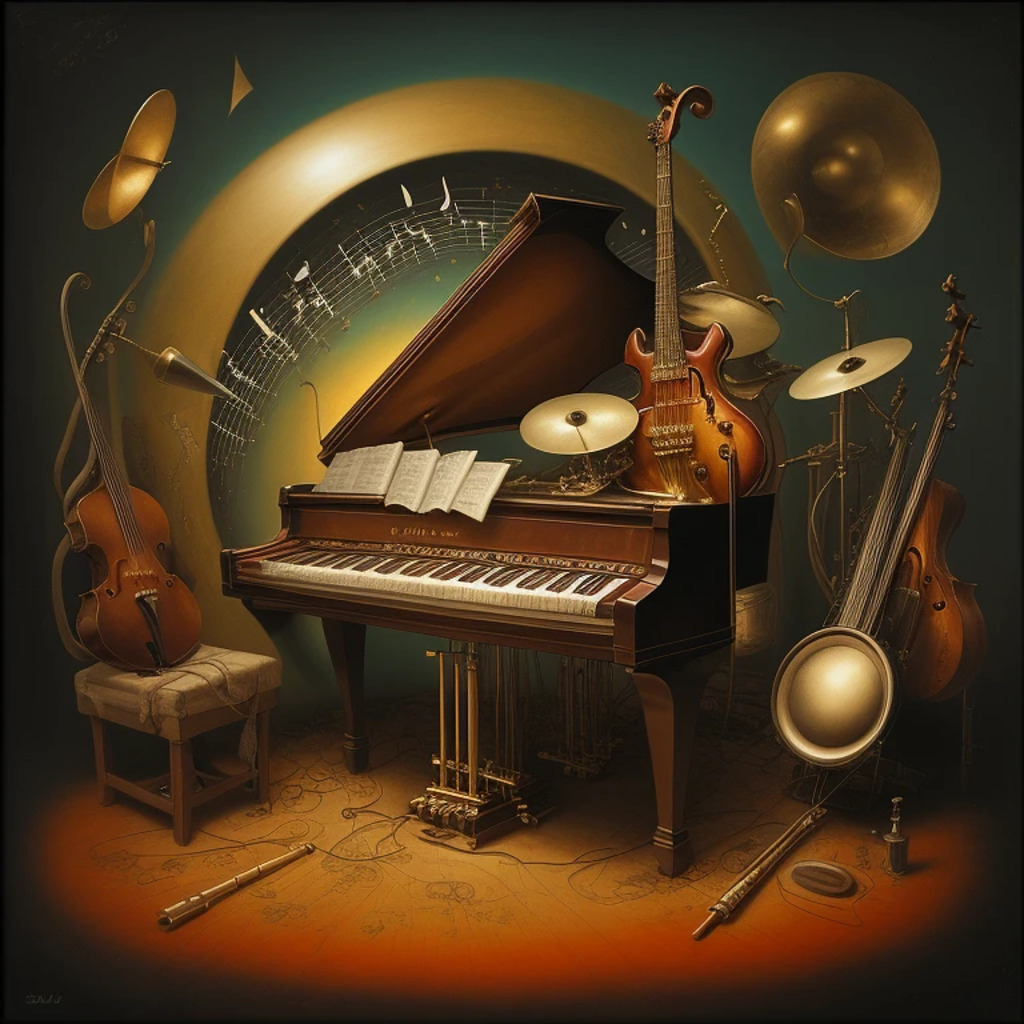 Prompt: music Album cover picture, surreal art, oil picture, music instruments