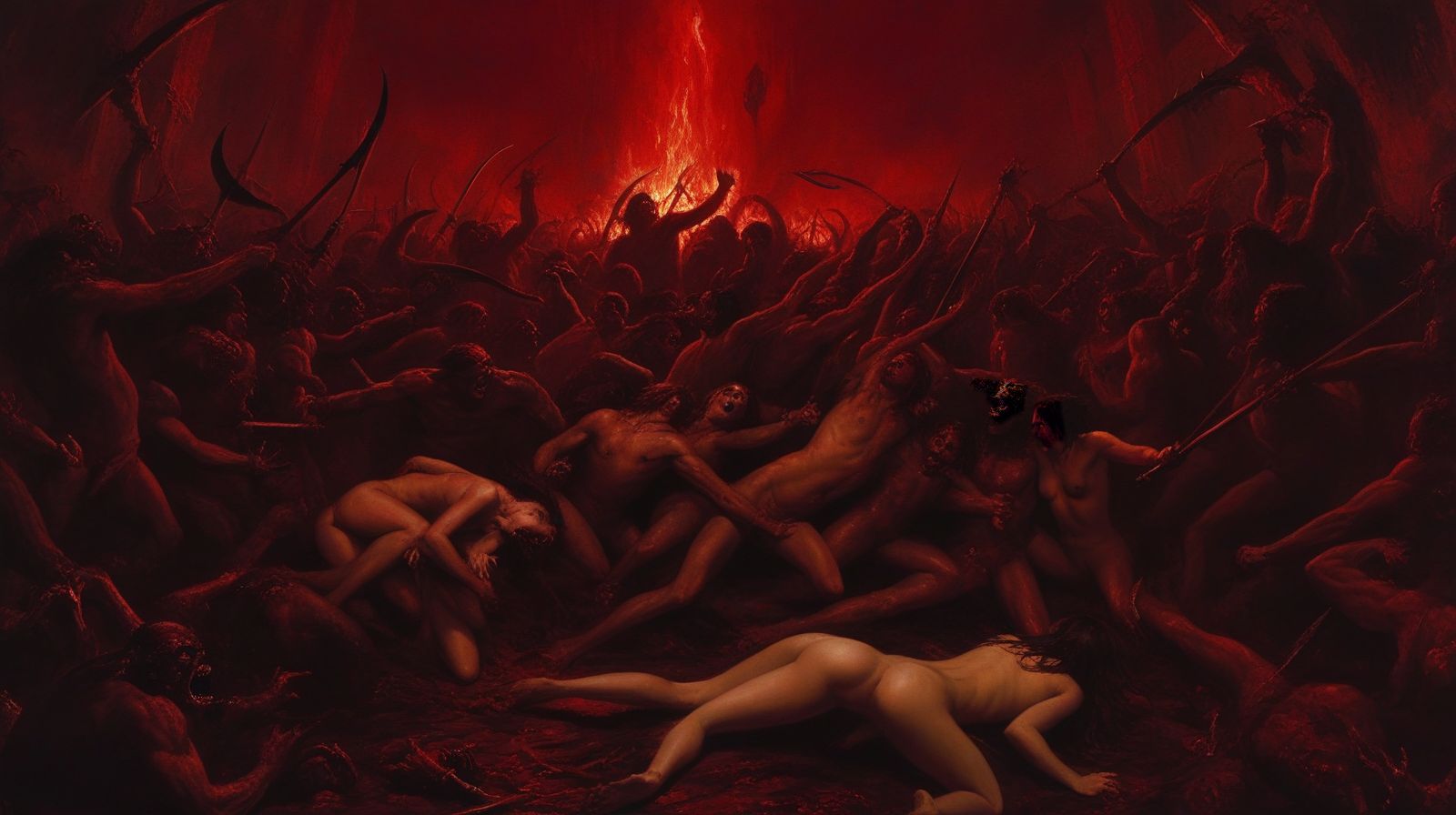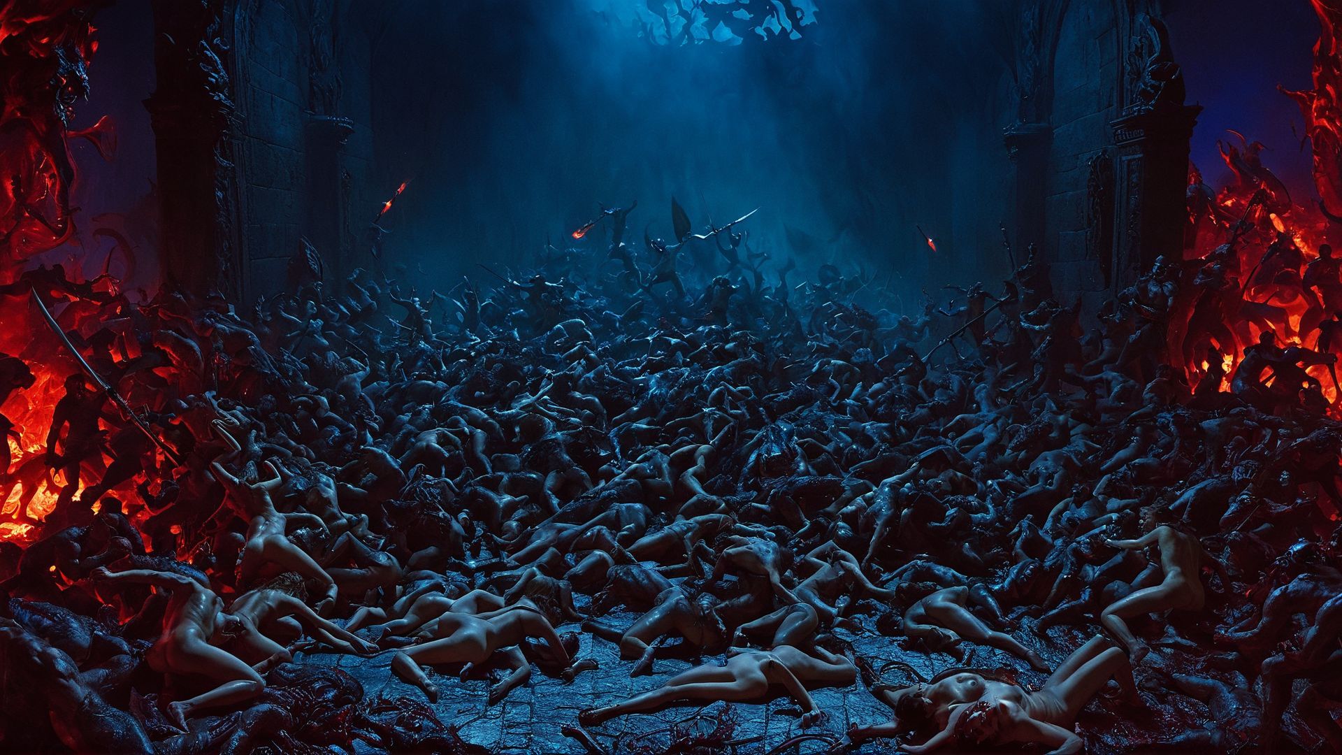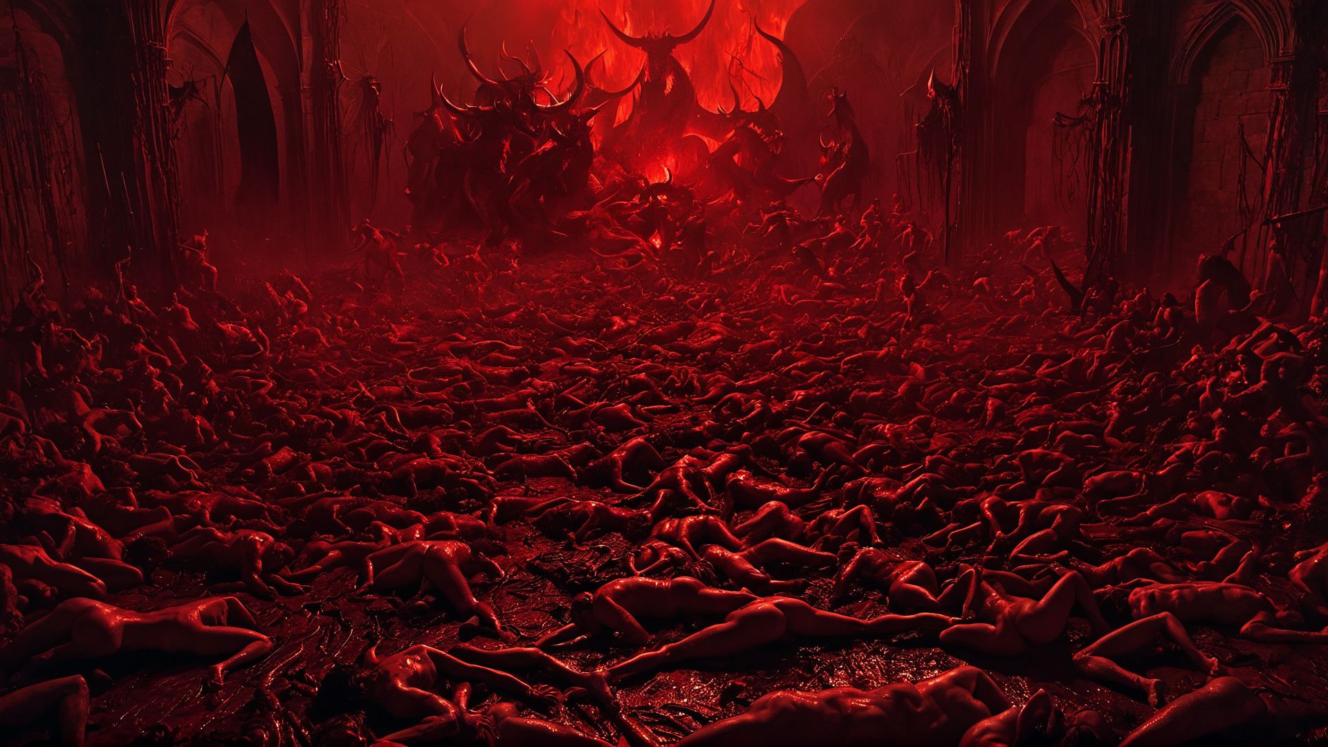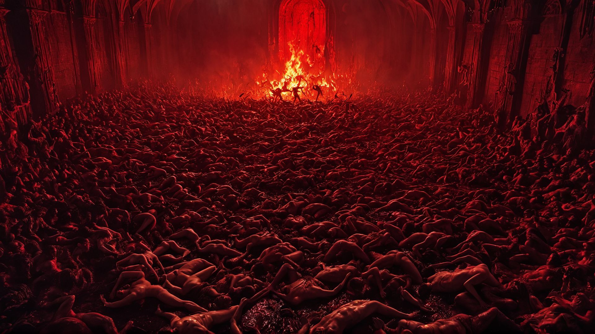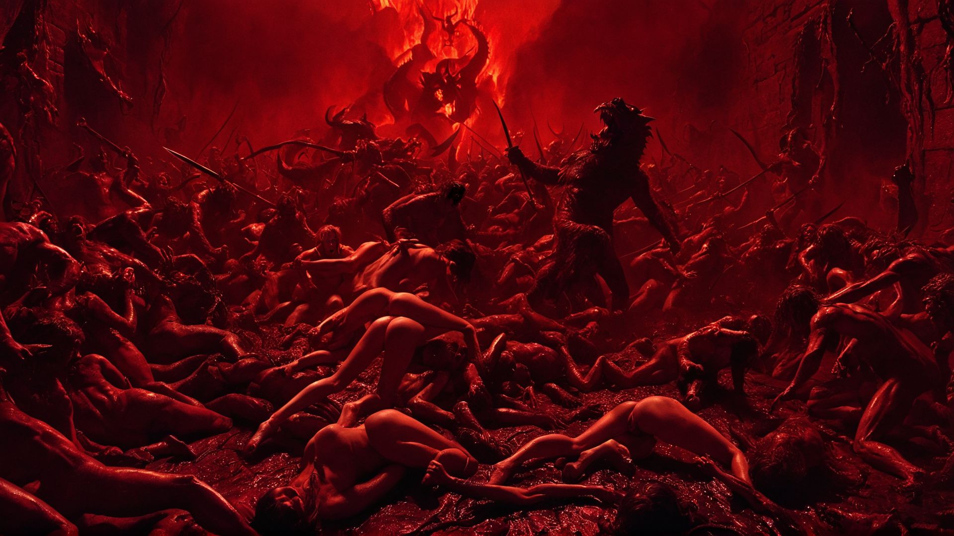 A professional picture of the hell, Many demons and monster were fighting in the hall of hell.