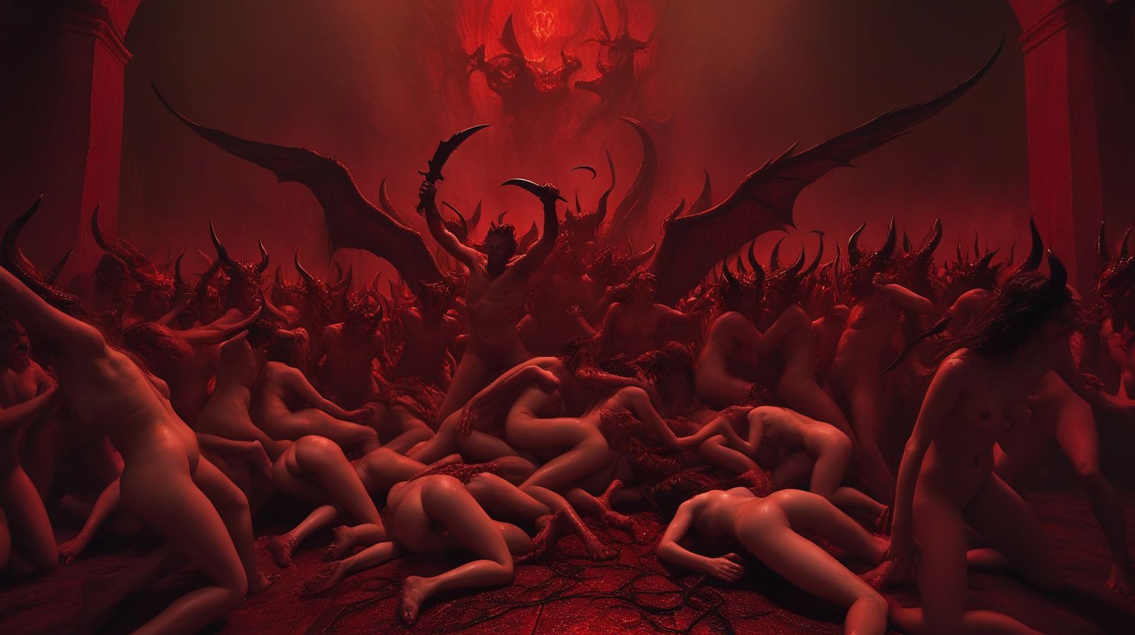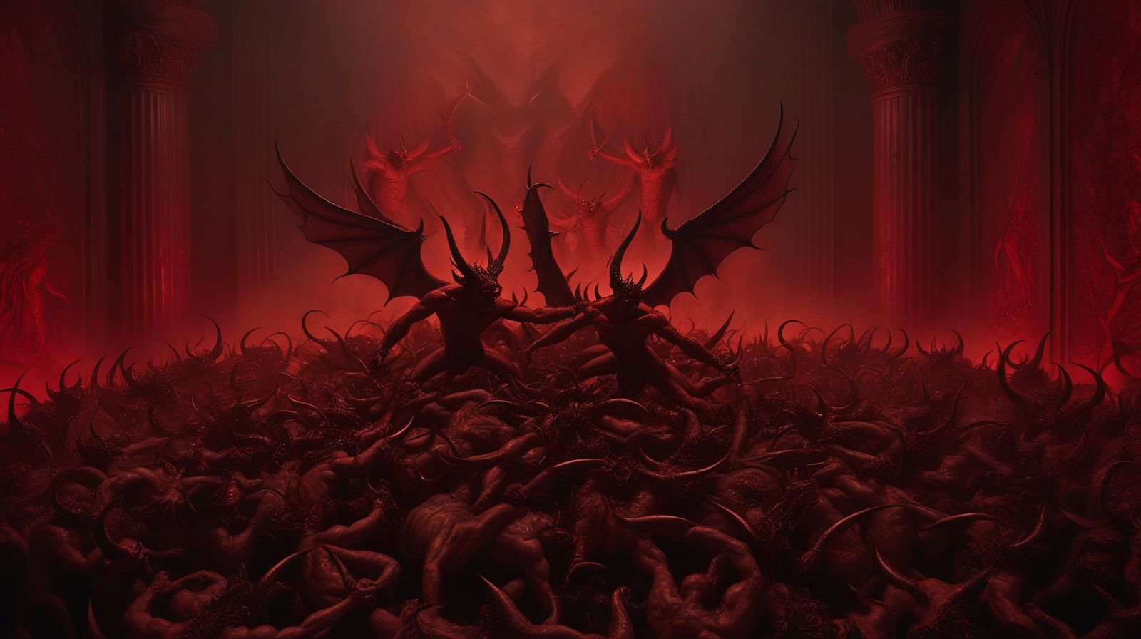 A professional picture of the hell, Many demons and monster were fighting in the gotic hall of hell.