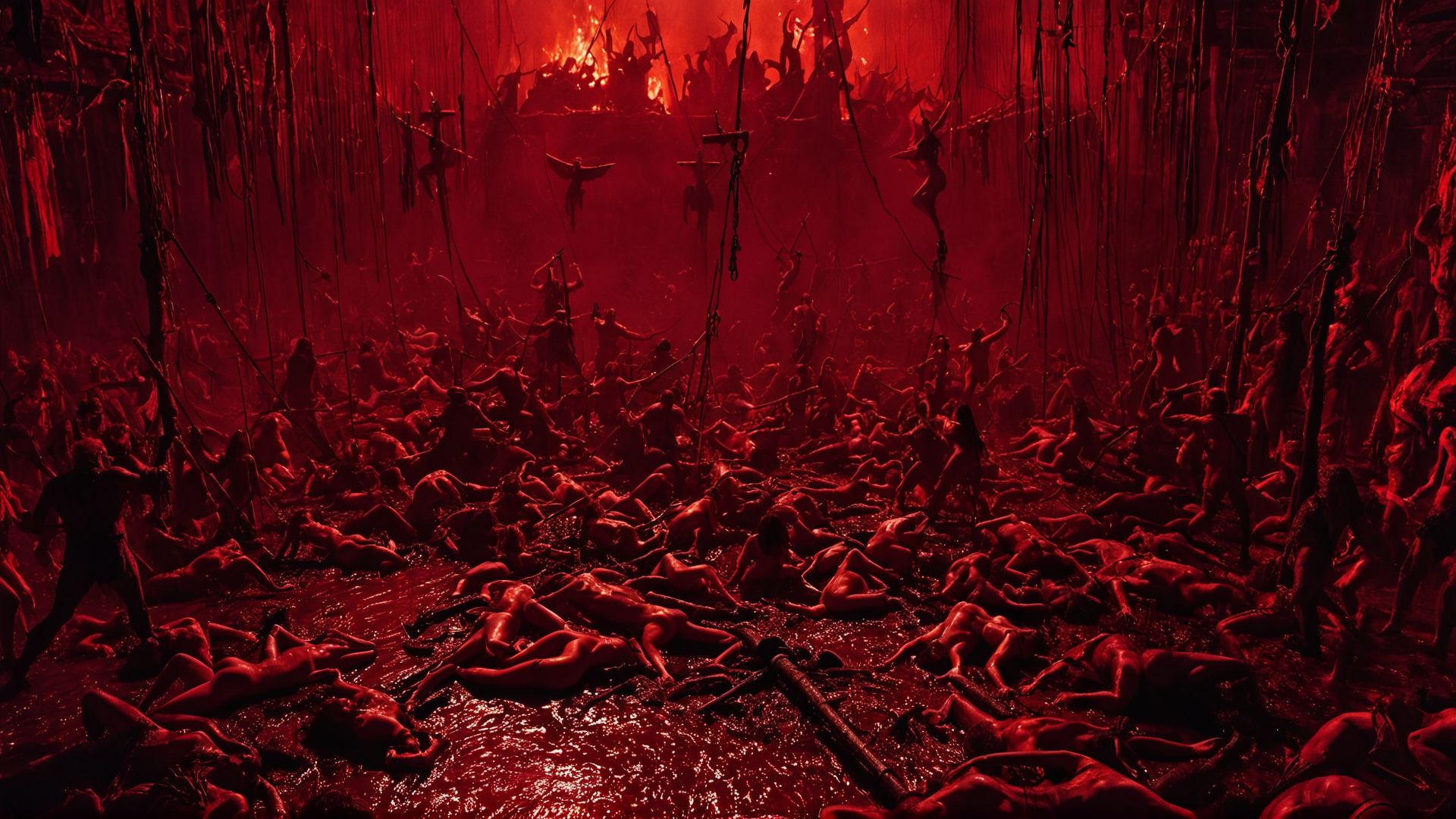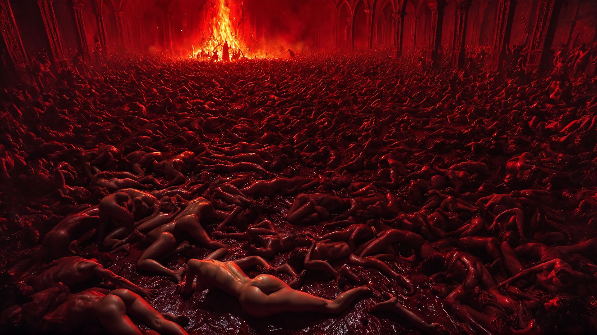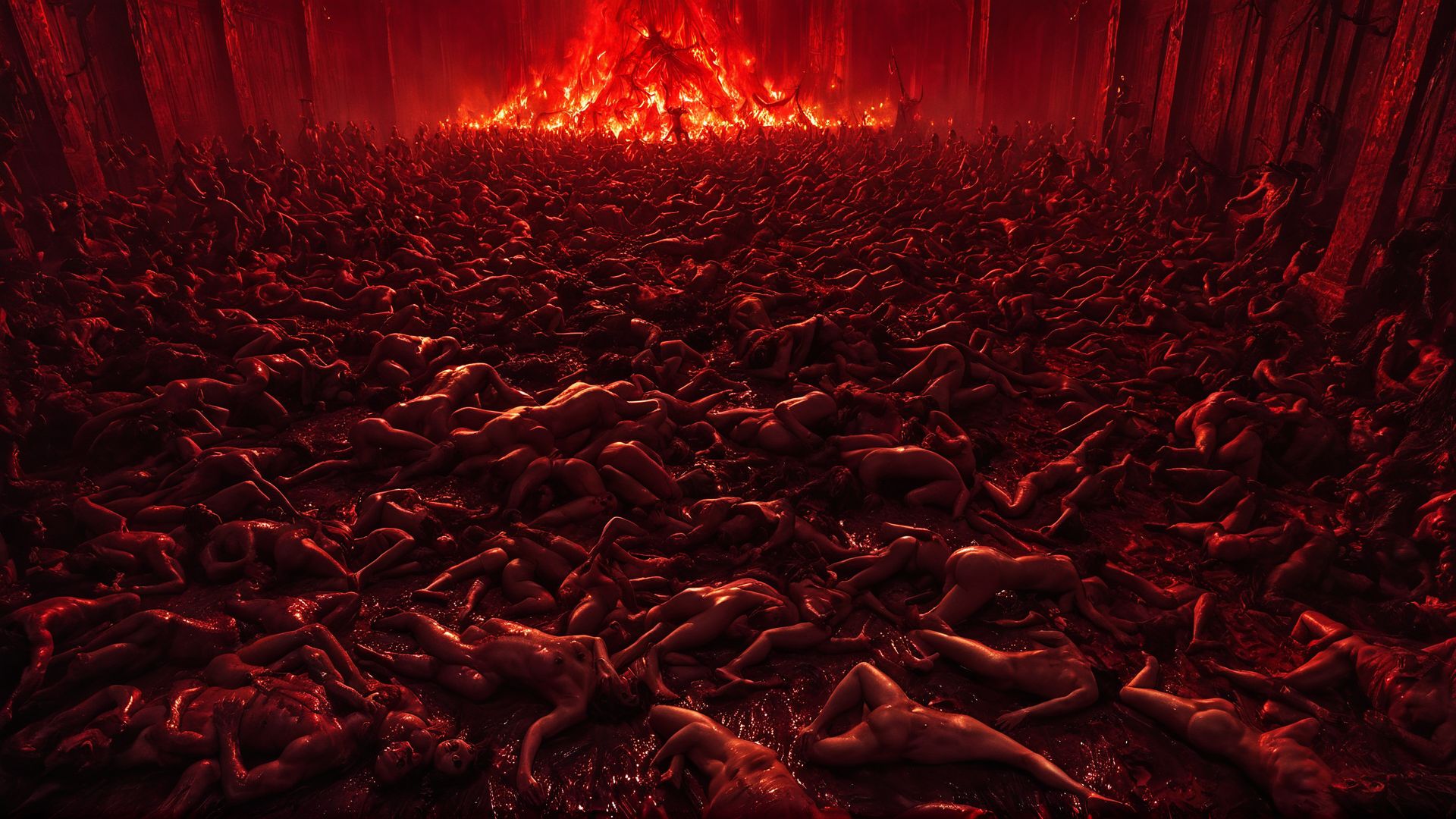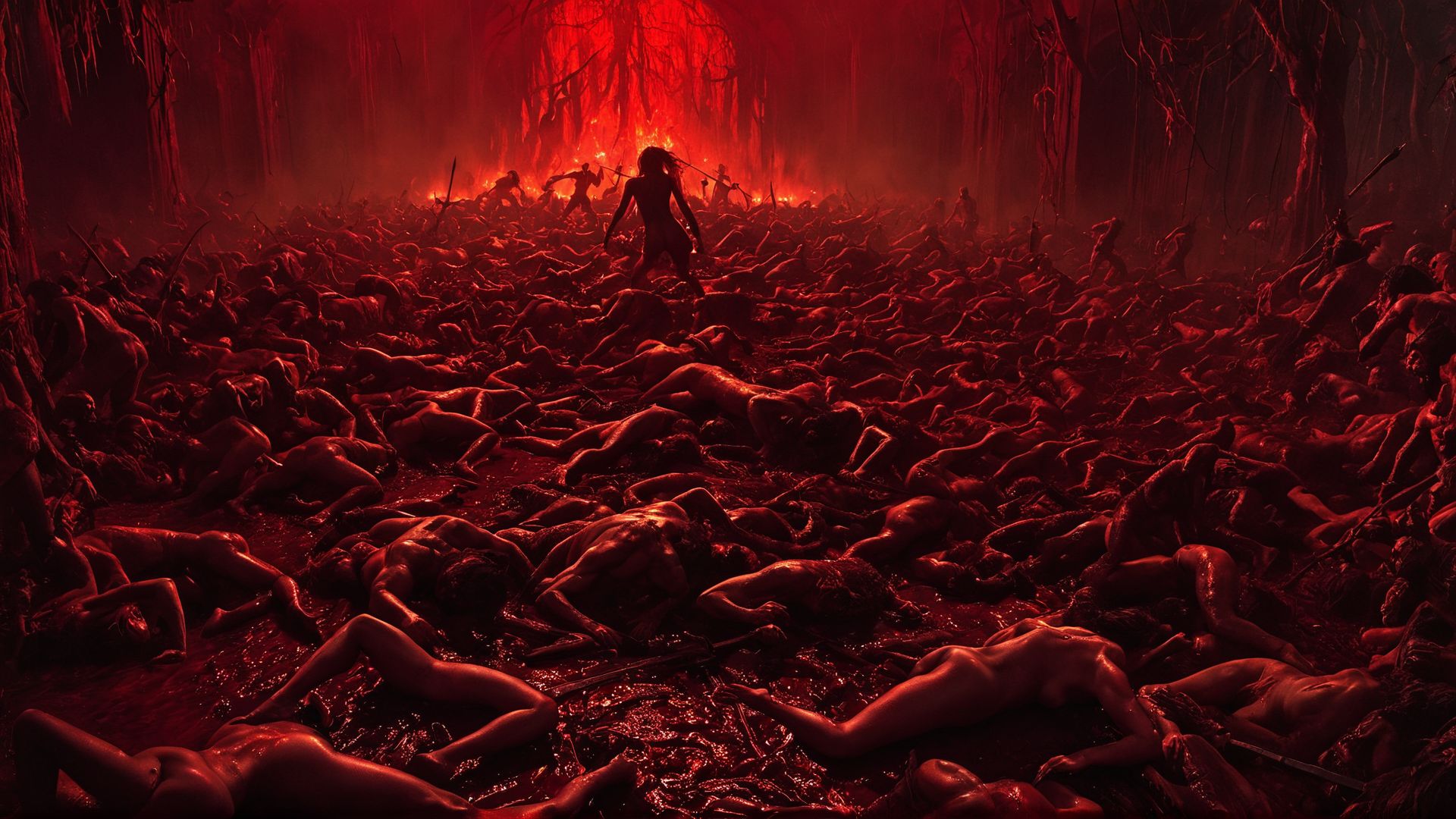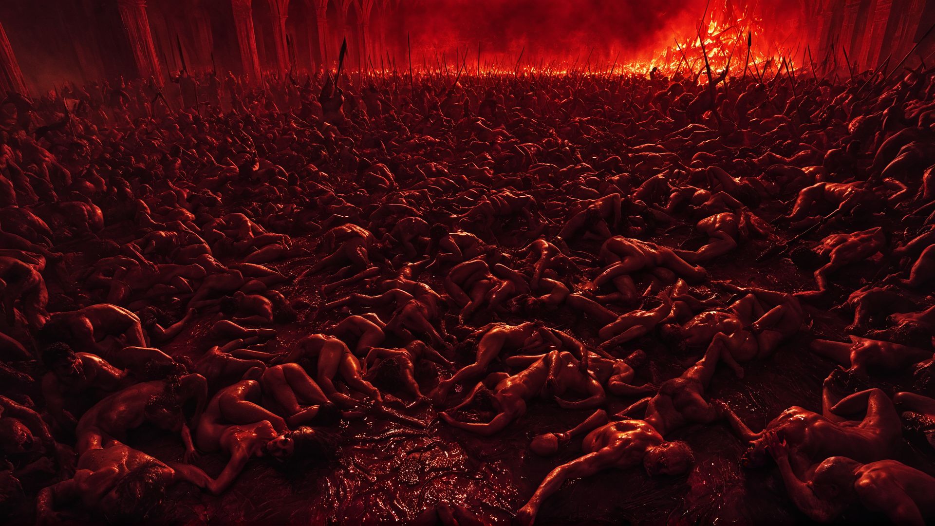 Blood bones and corpses everywhere. Some fire. A red light and dark atmosphere filled the scene.