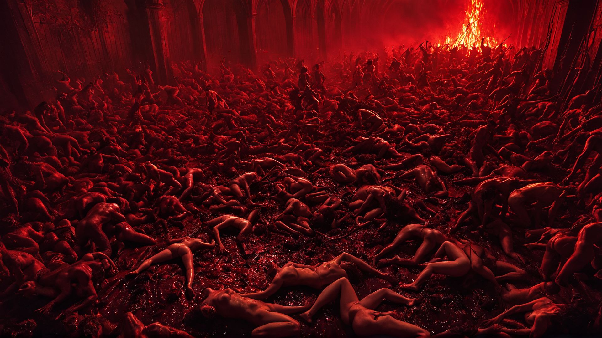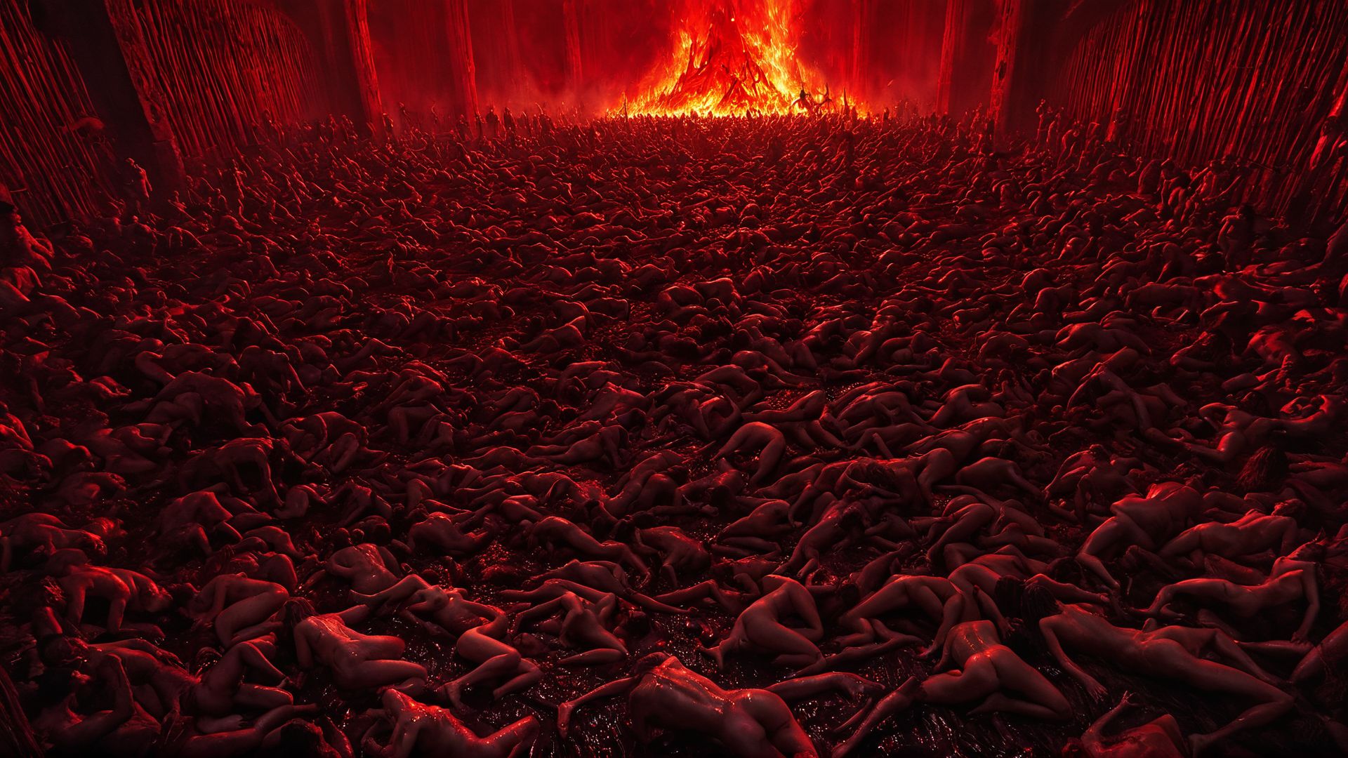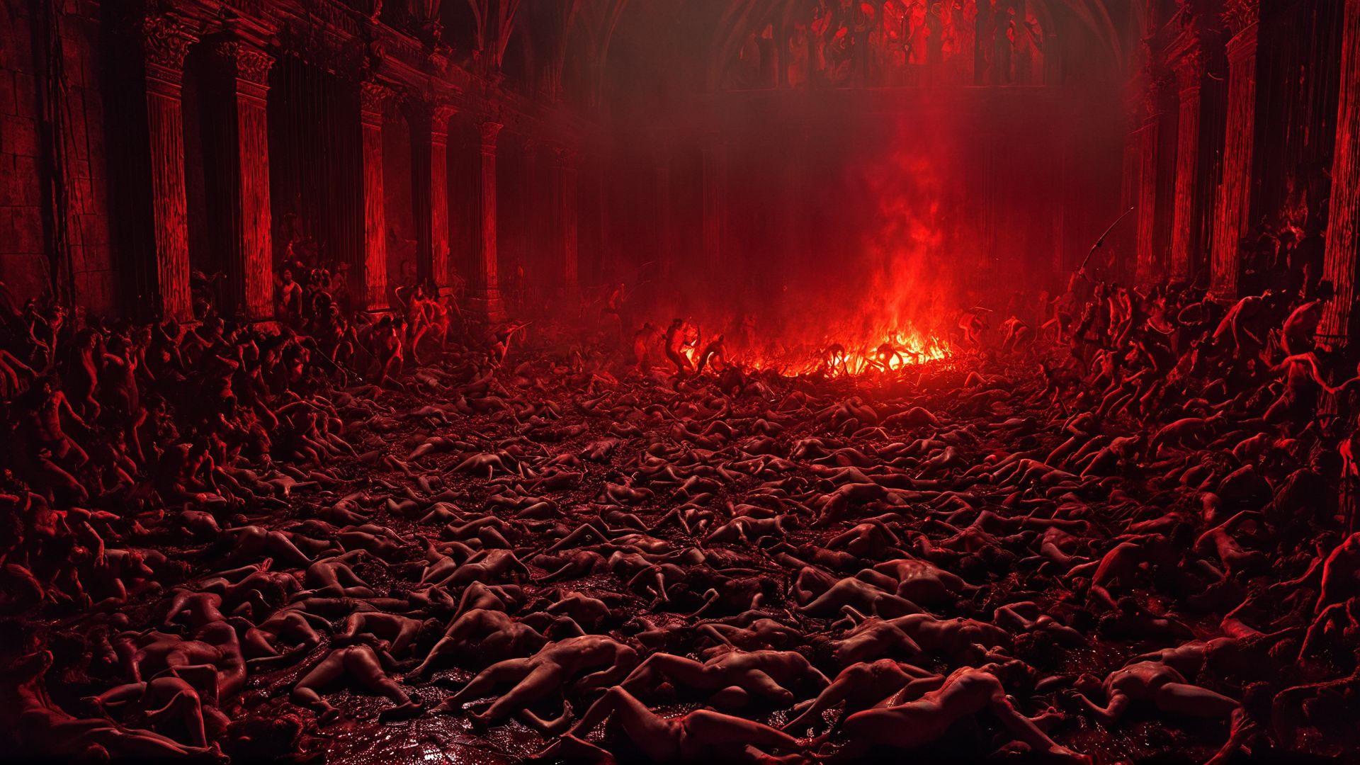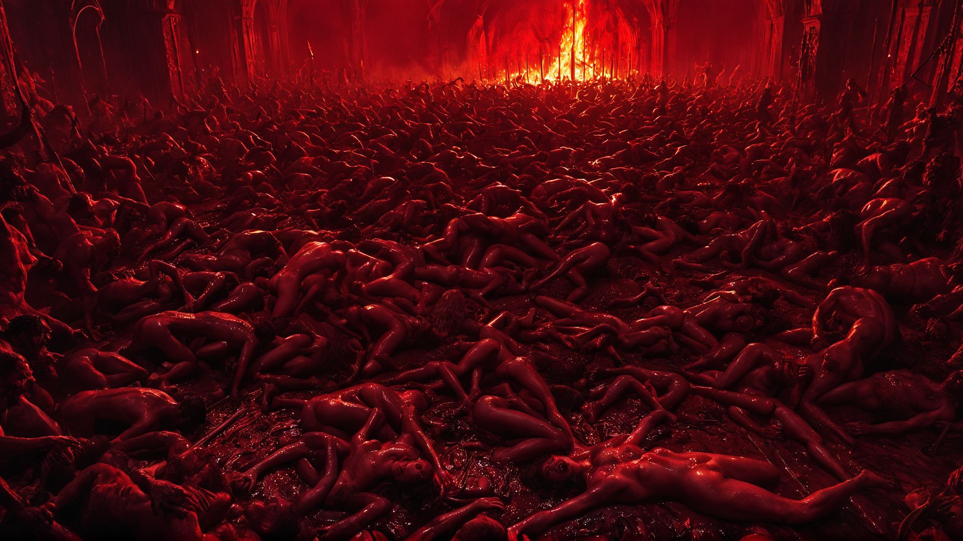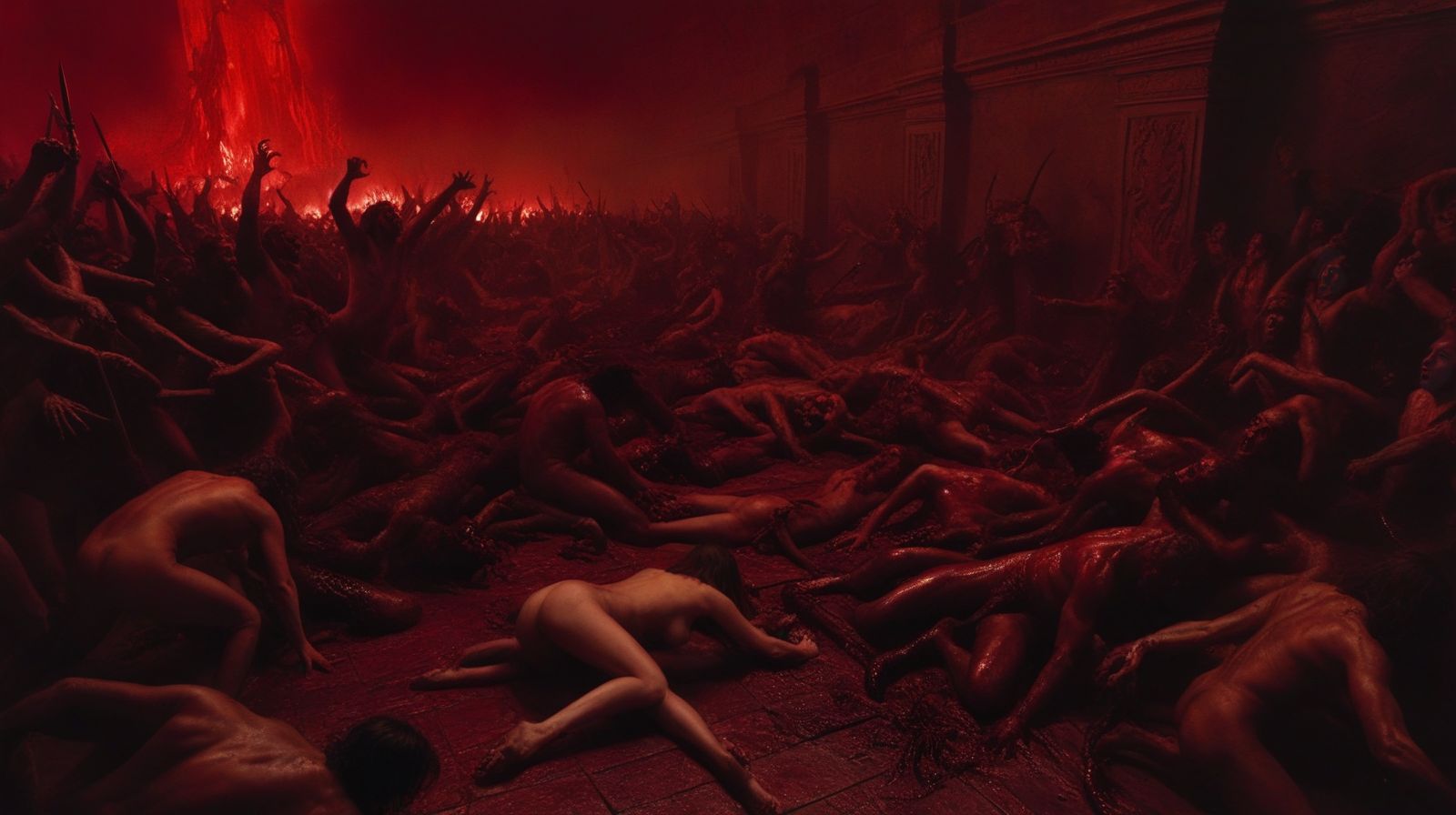 Blood bones and corpses everywhere. Some fire. A red light and dark atmosphere filled the scene.