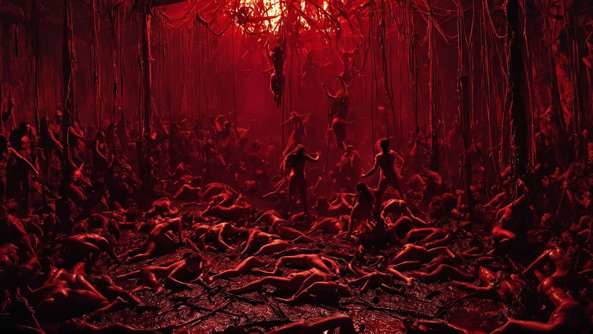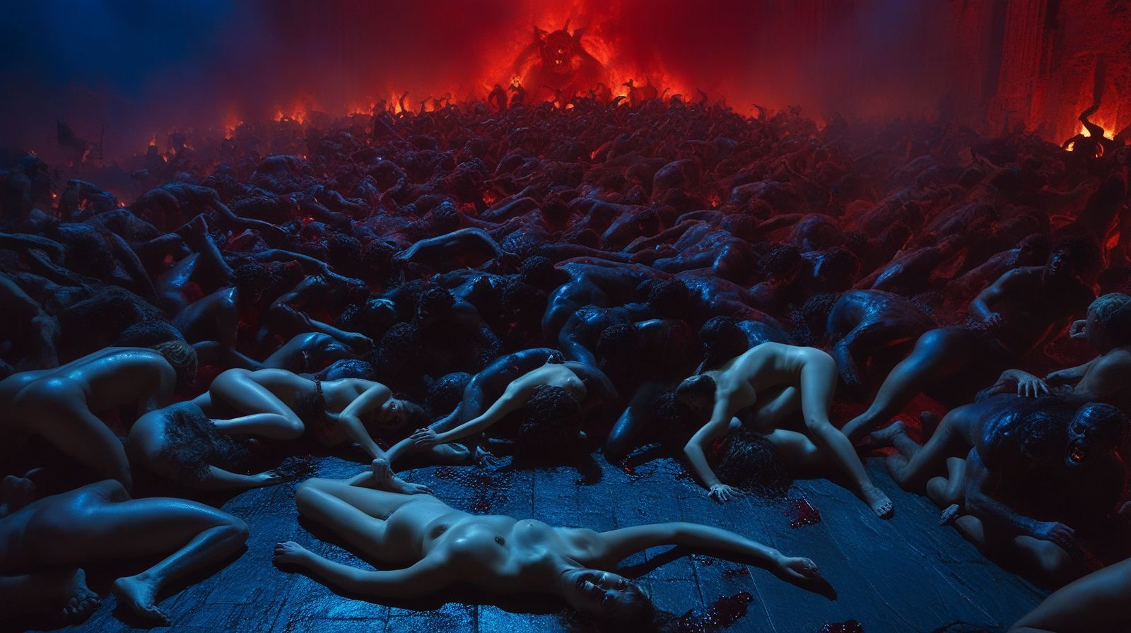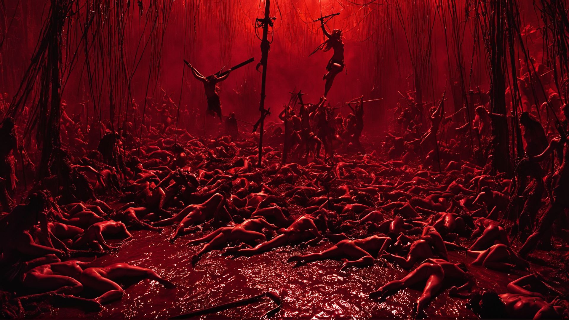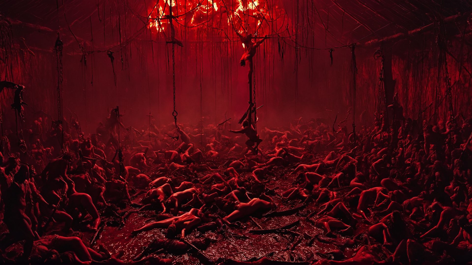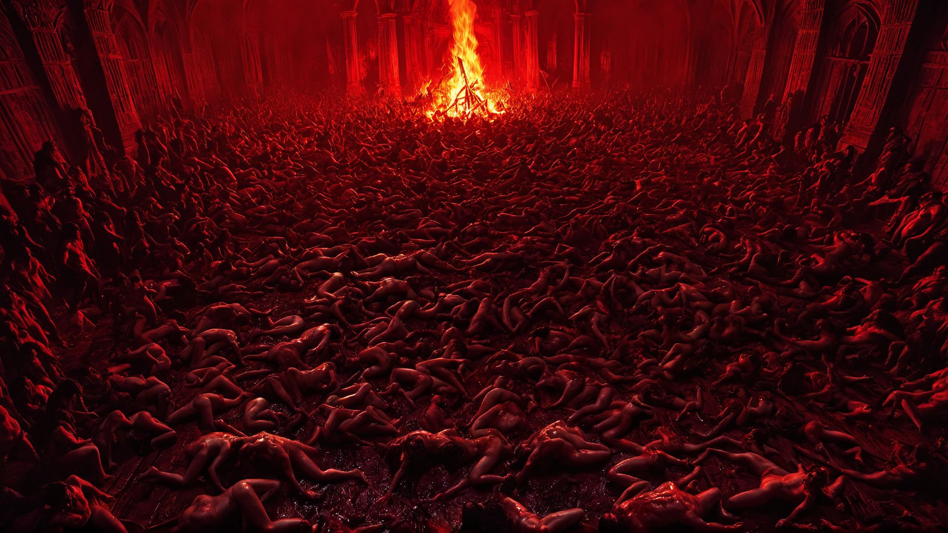 Blood bones and corpses everywhere. Some fire. A red light and dark atmosphere filled the scene.