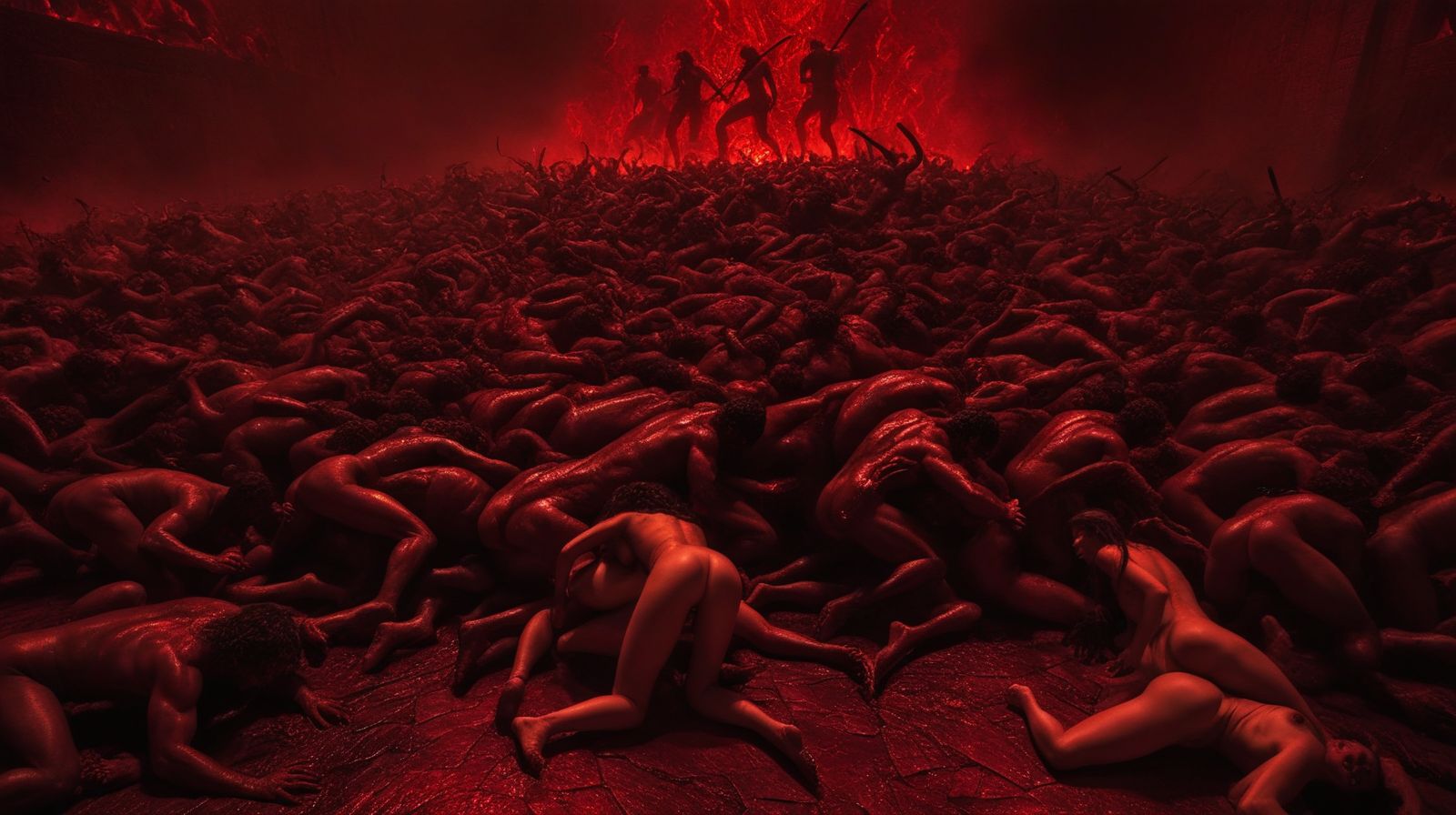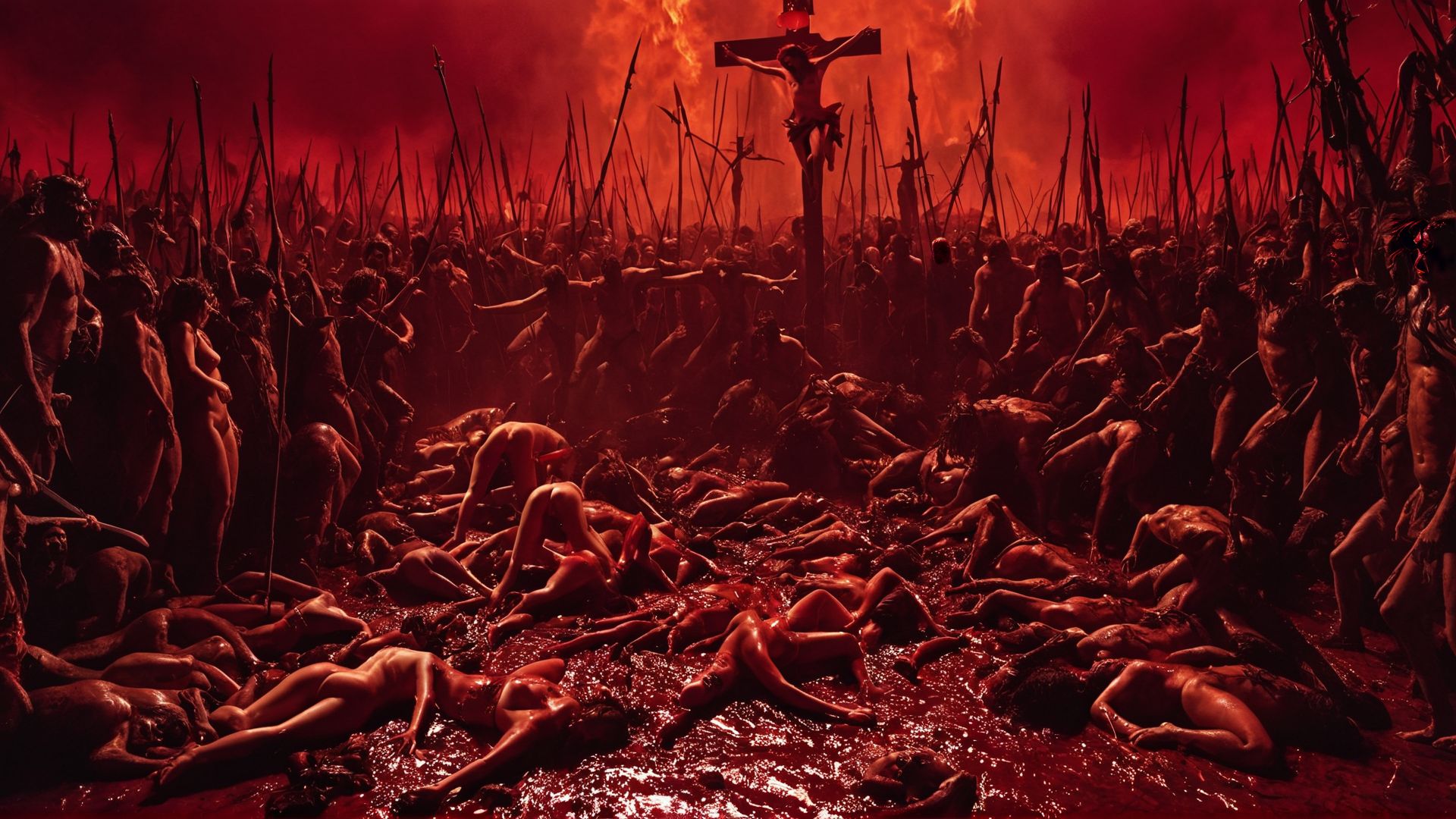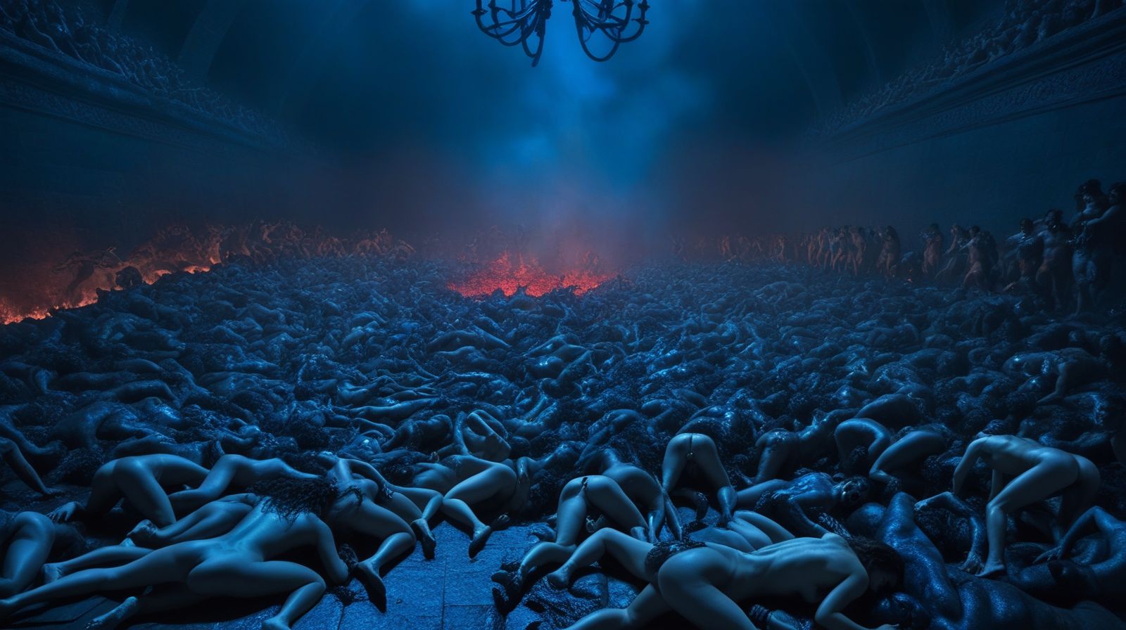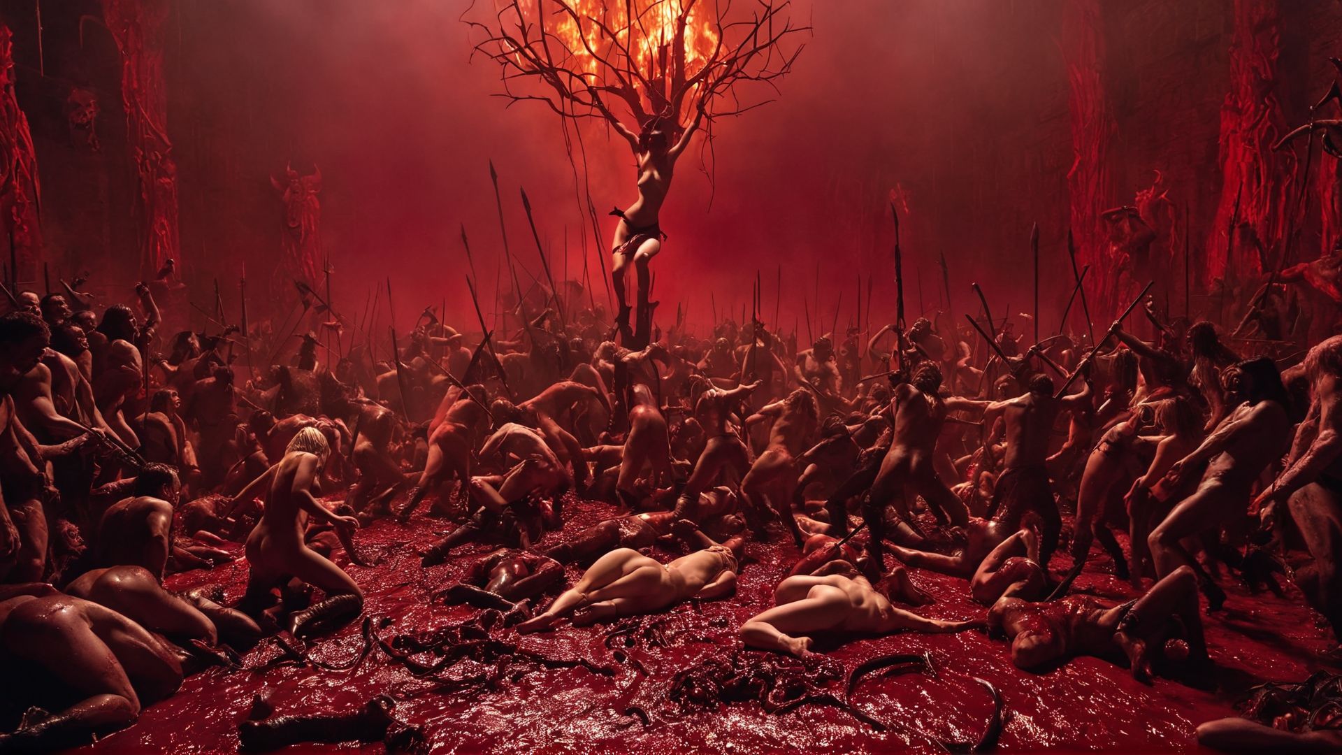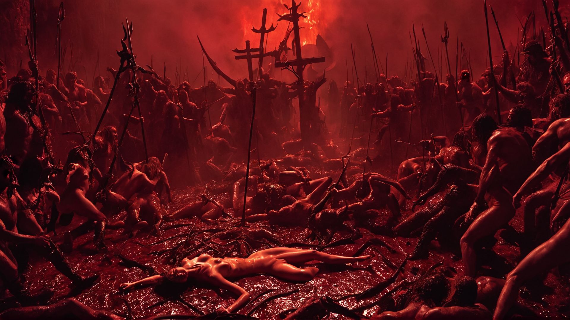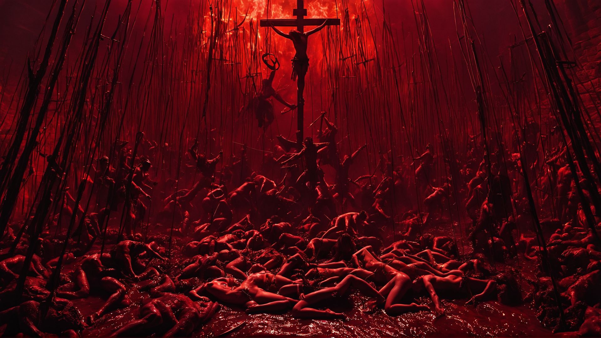 Blood bones and corpses everywhere. Some fire. A red light and dark atmosphere filled the scene.