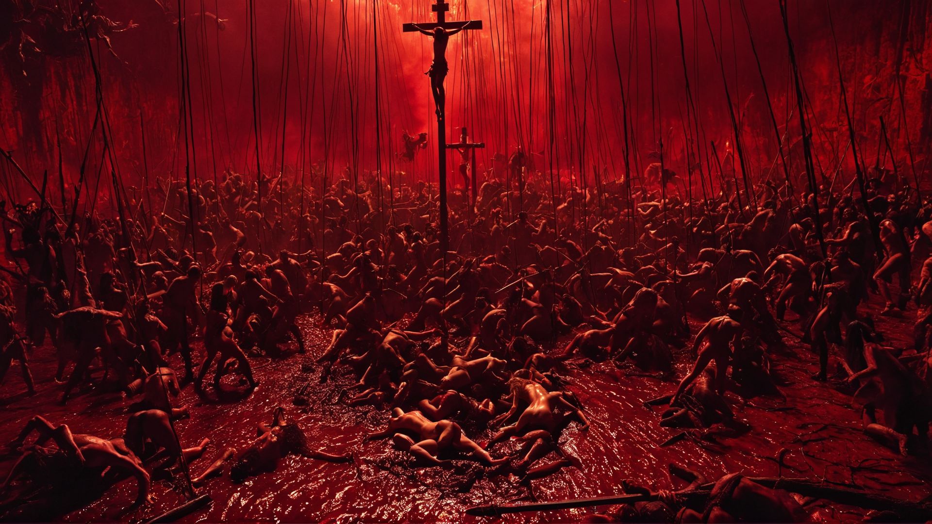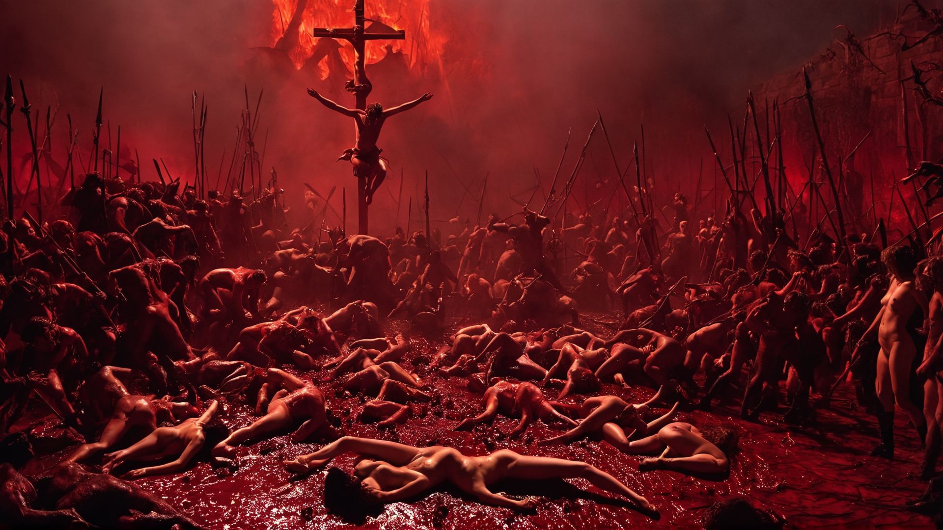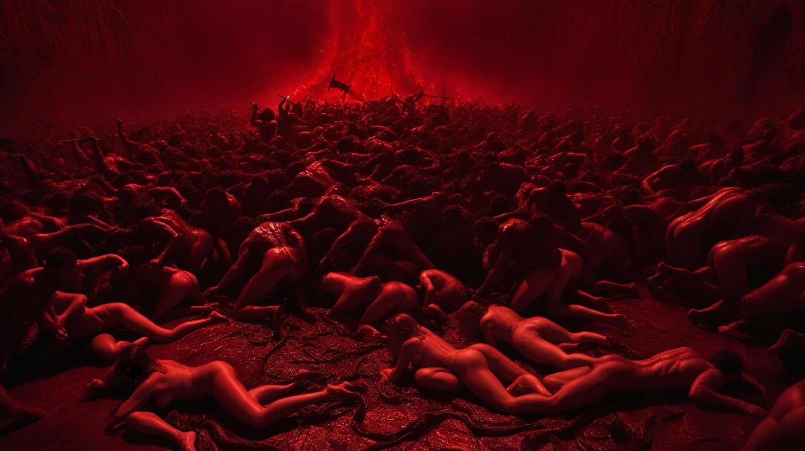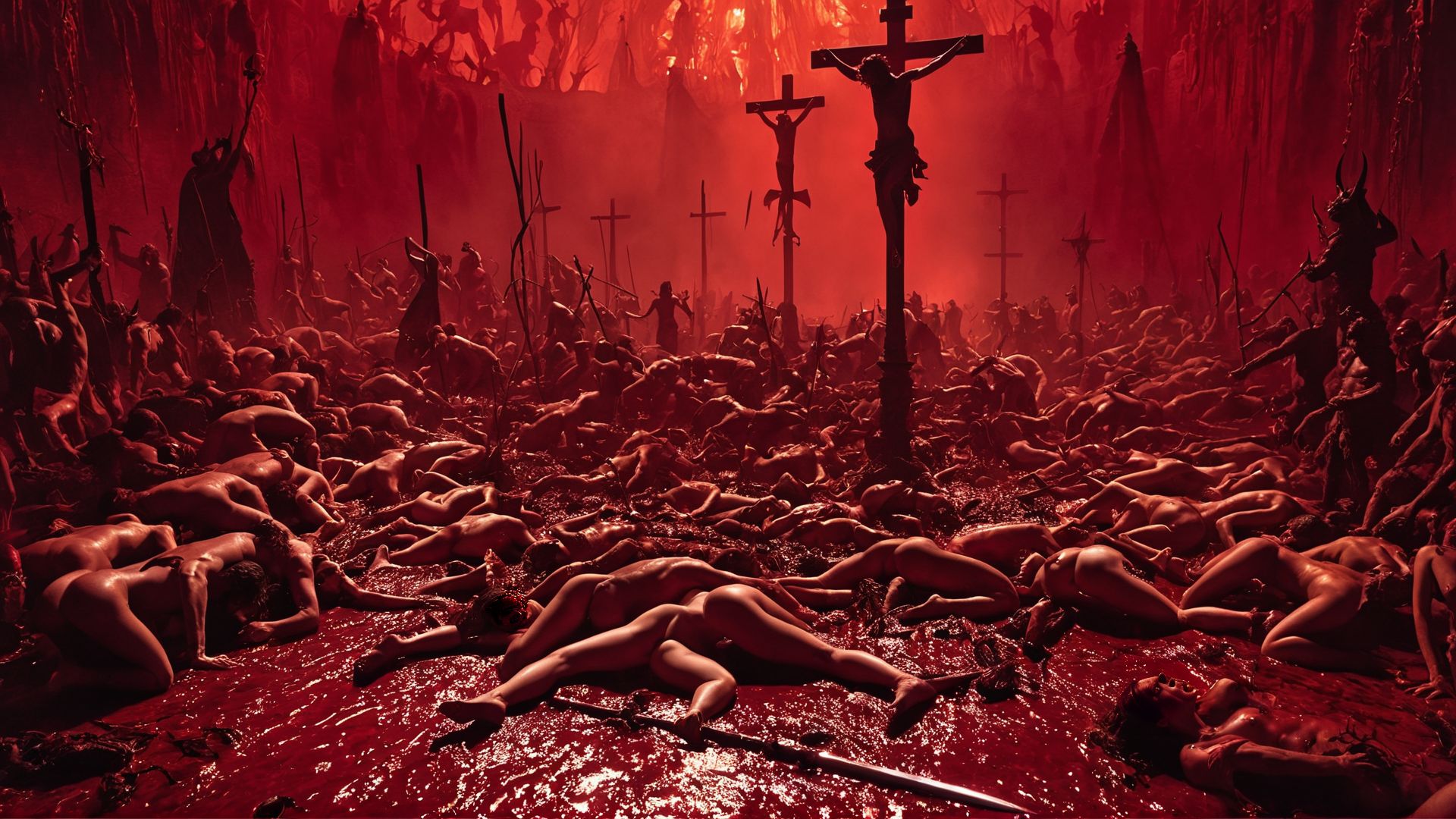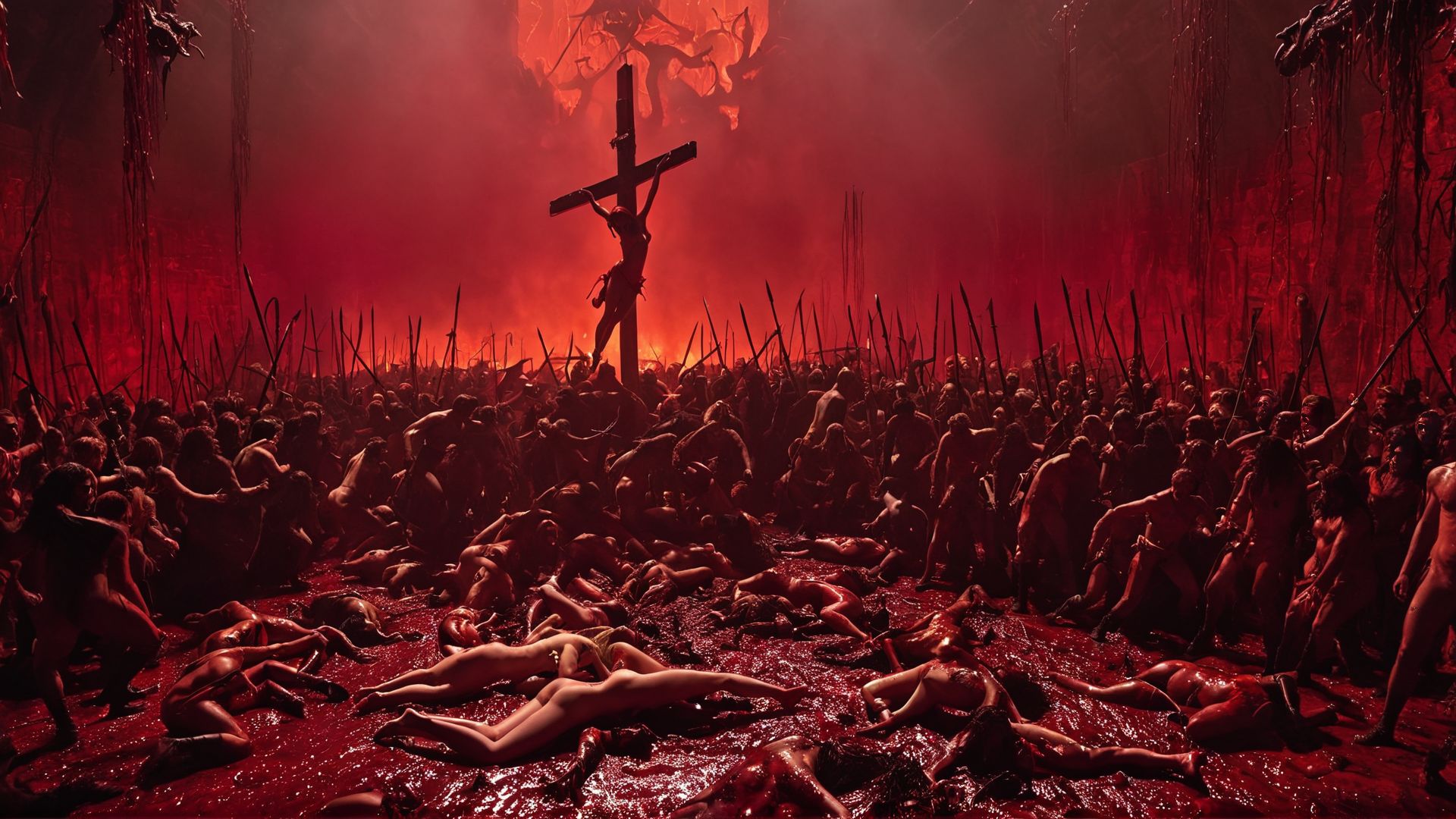 Blood bones and corpses everywhere. Some fire. A red light and dark atmosphere filled the scene.