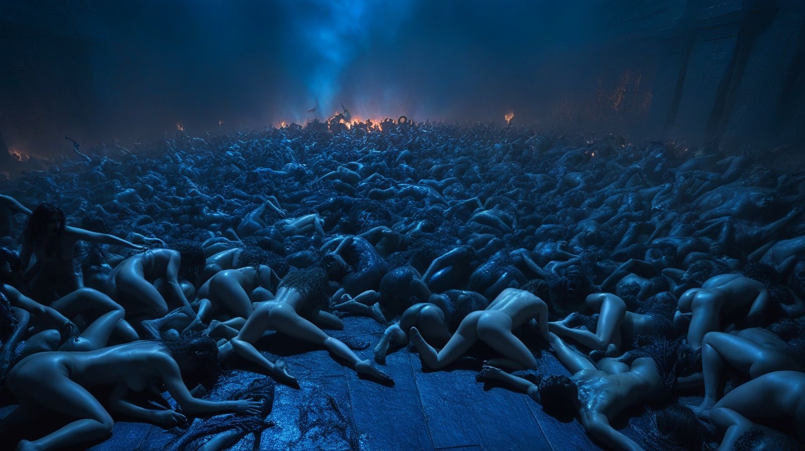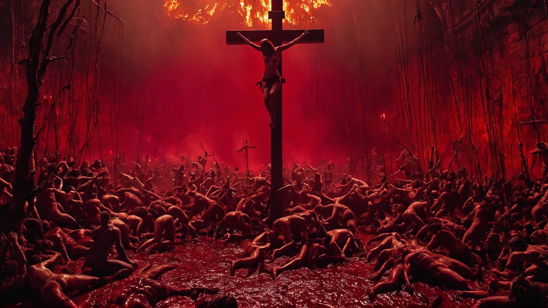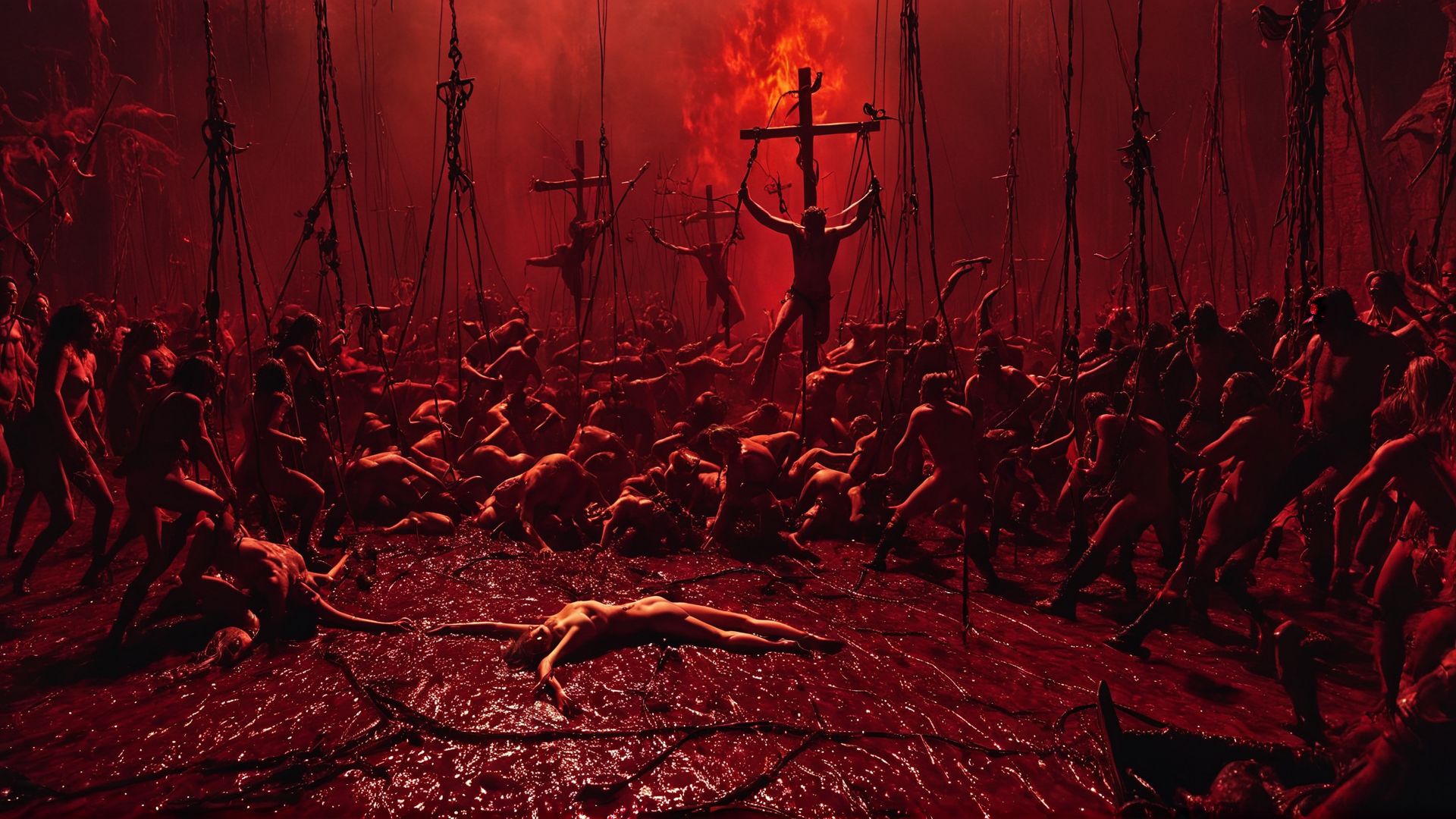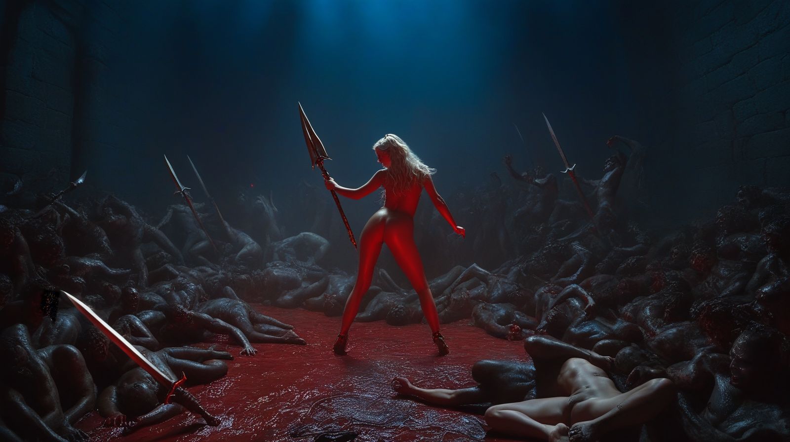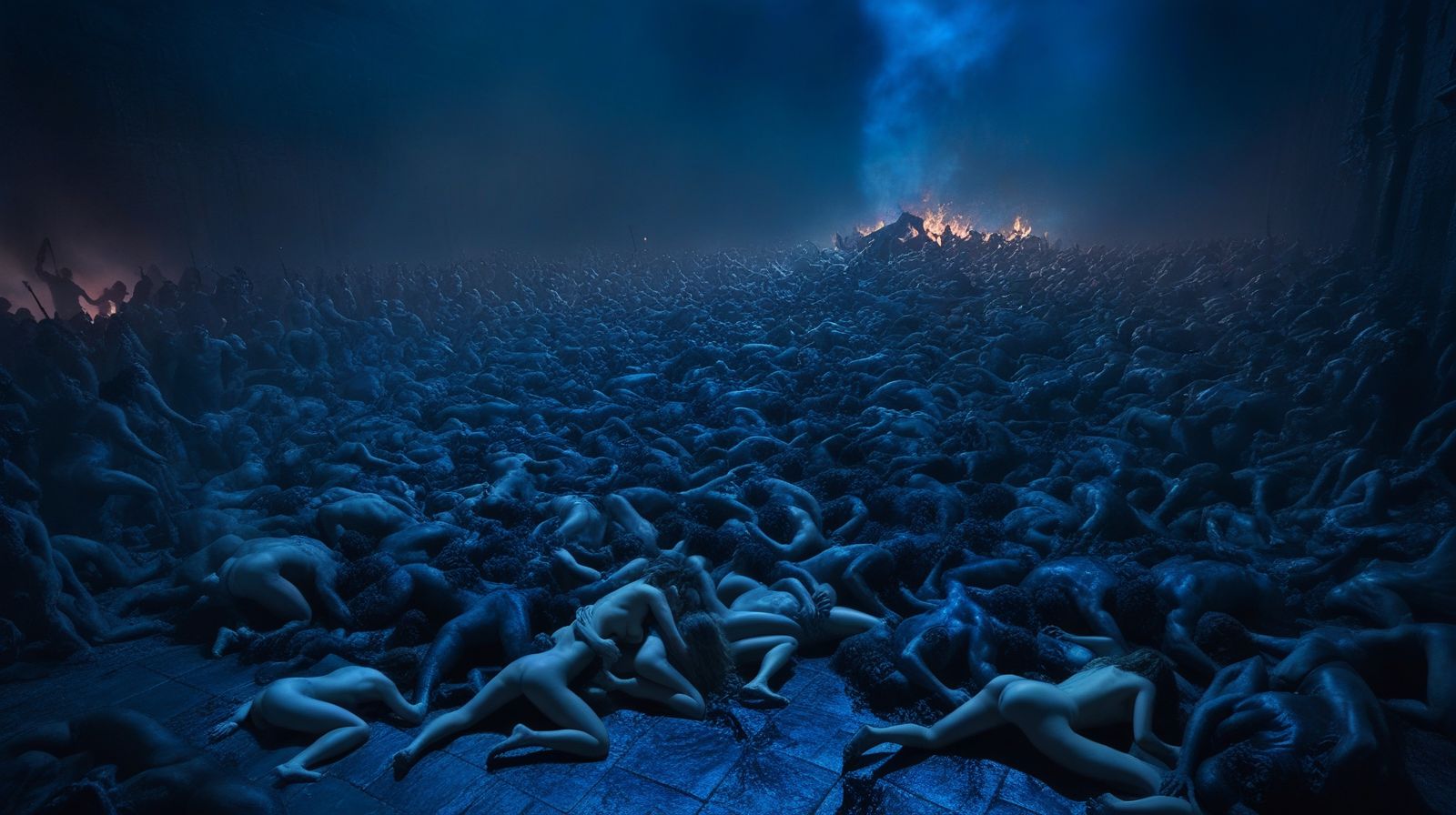 Blood bones and corpses everywhere. Some fire. A red light and dark atmosphere filled the scene.