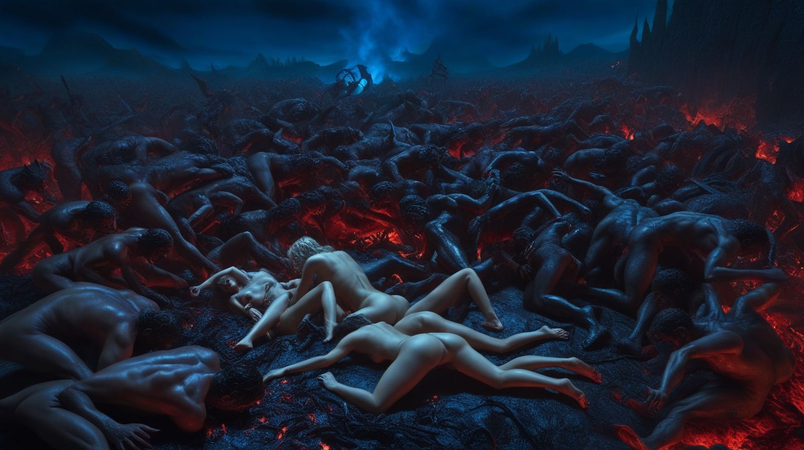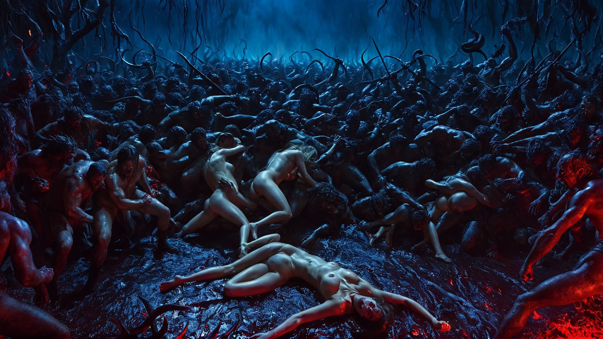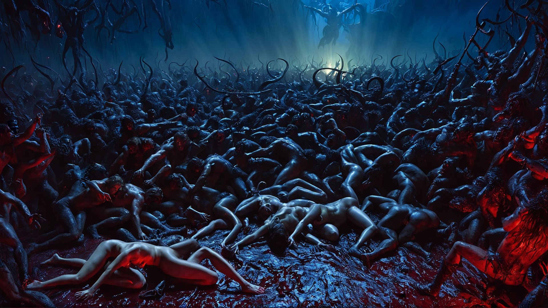 Many beautiful naked girls are brutal raped and (massacred:1.1) by a huge terrible monsters in a swamp of blood bones and corpses.