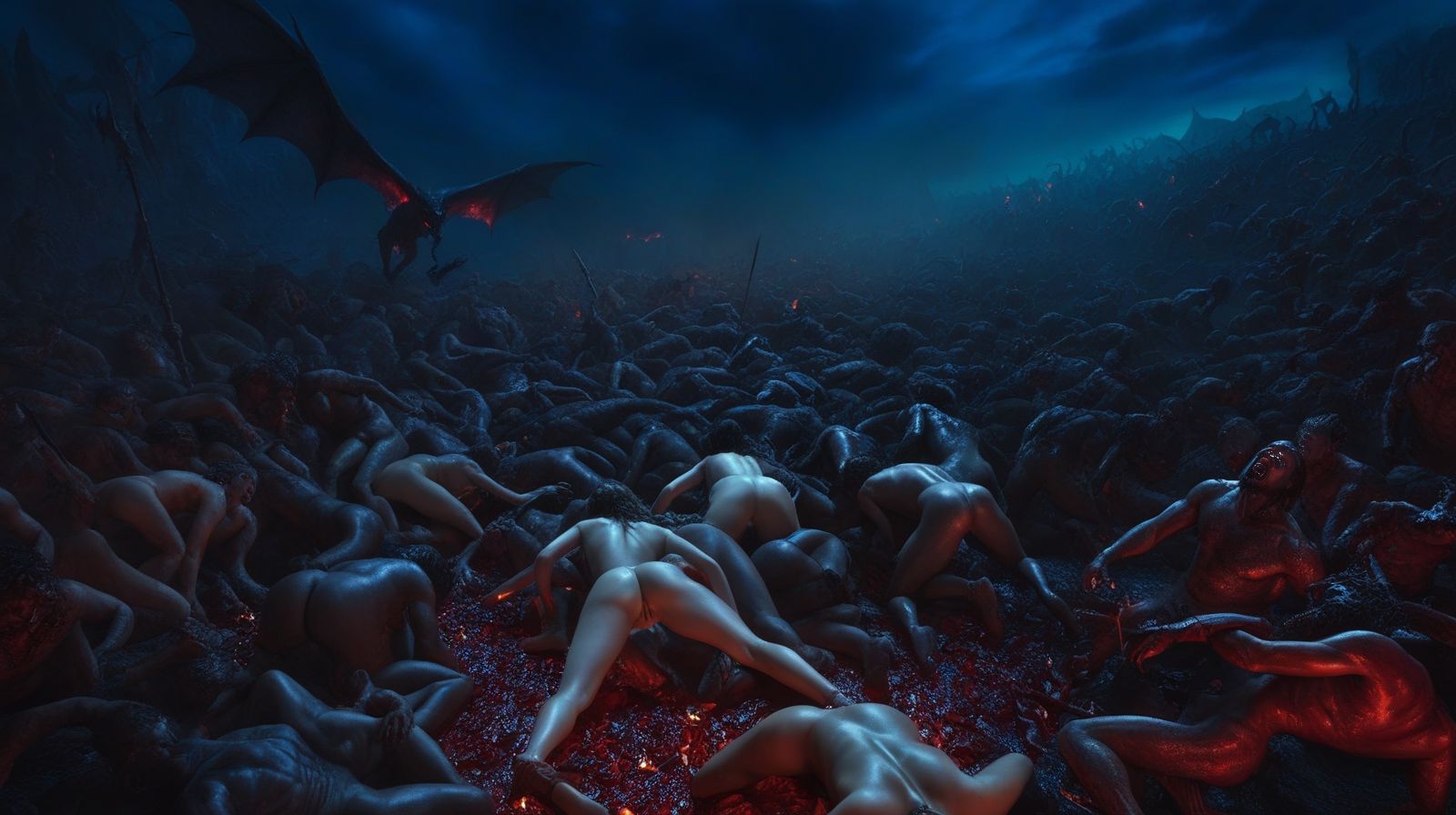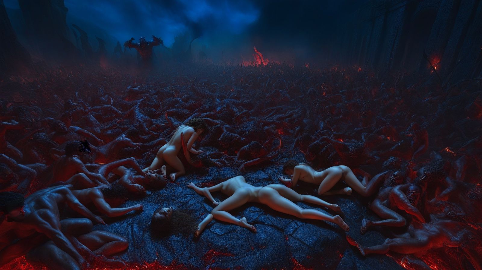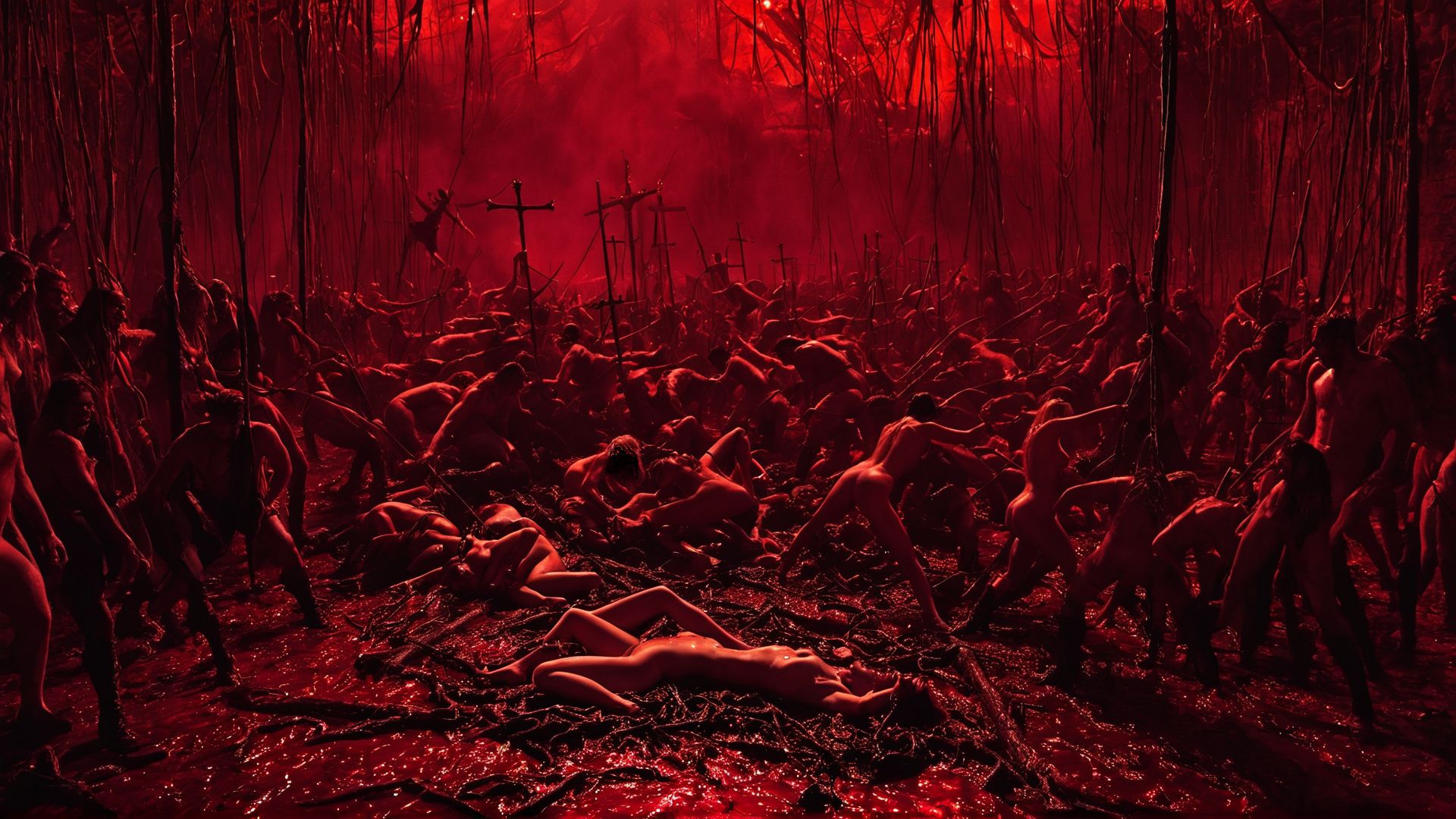 Many beautiful naked girls are brutal raped and (massacred:1.1) by a huge terrible monsters in a swamp of blood bones and corpses.