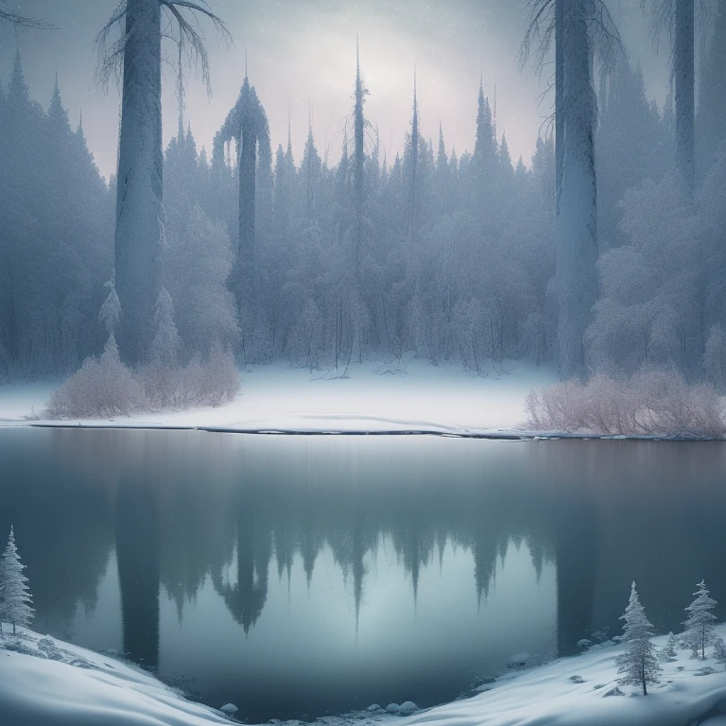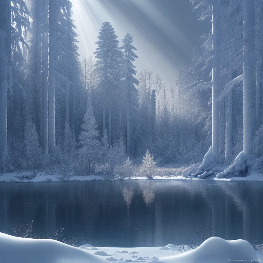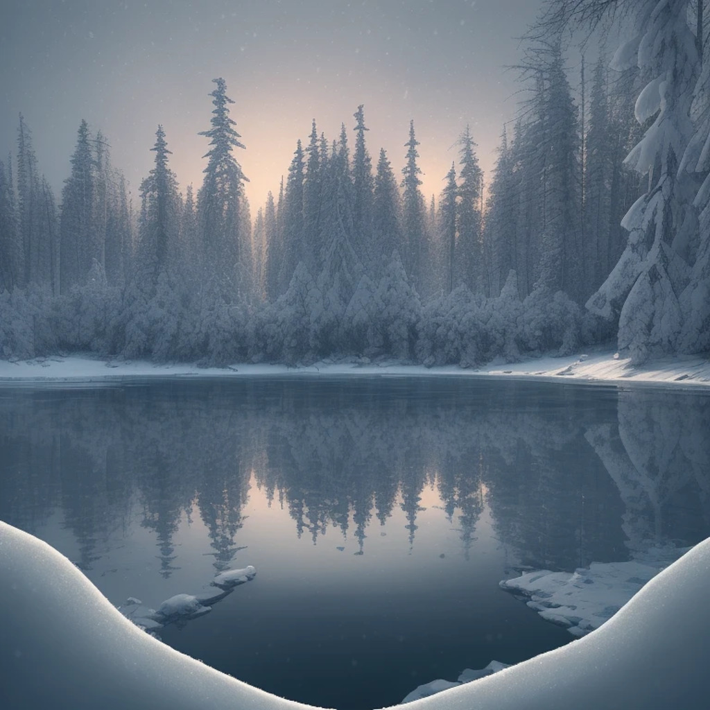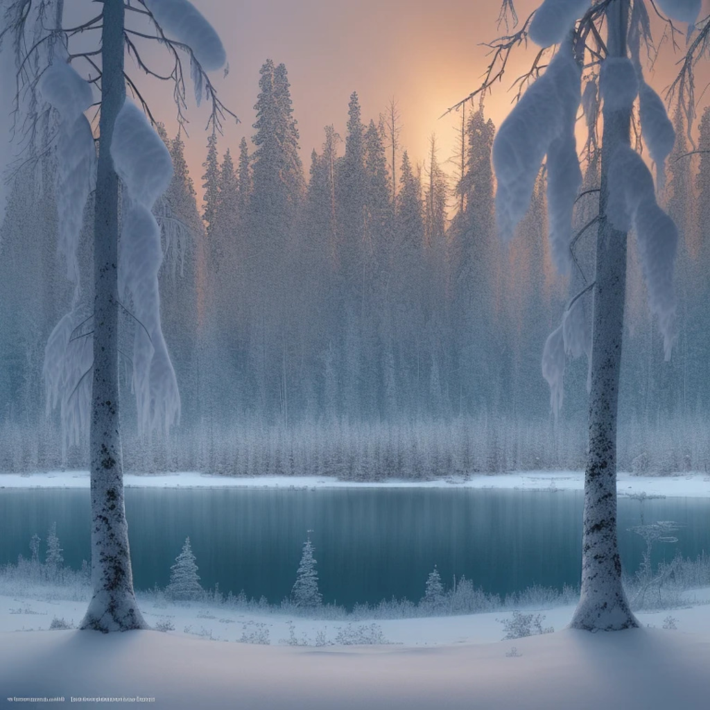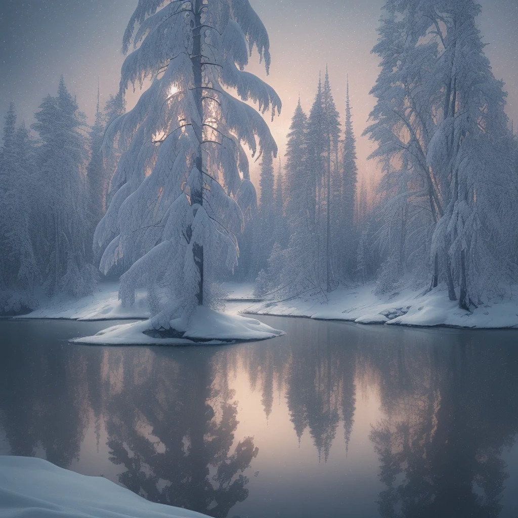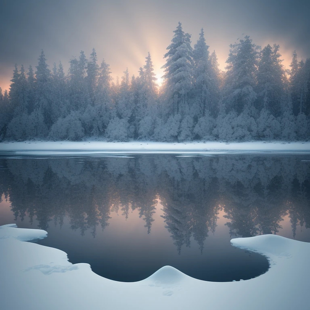 Prompt: lake surrounded by a frozen taiga forest, snow on the trees, winter, complex details, masterpiece, light ray, dramatic lighting, sharp focus, 4k, photo, digital art