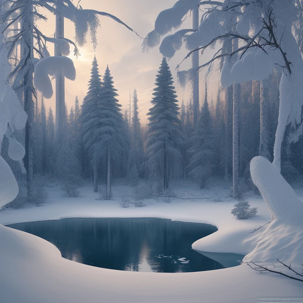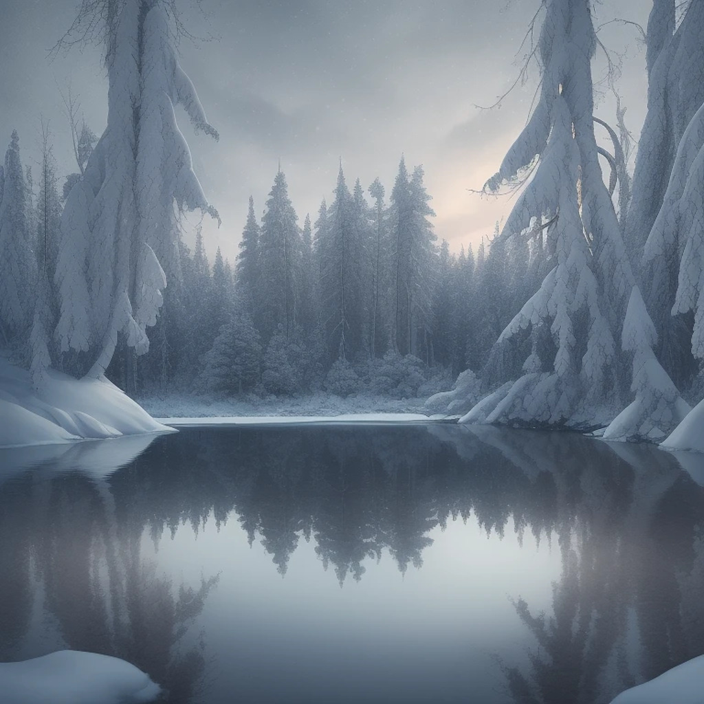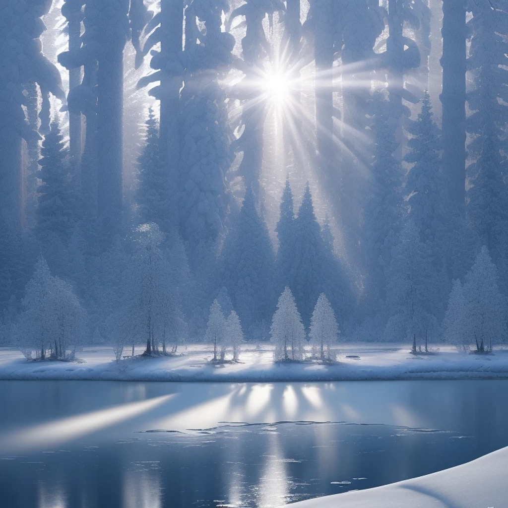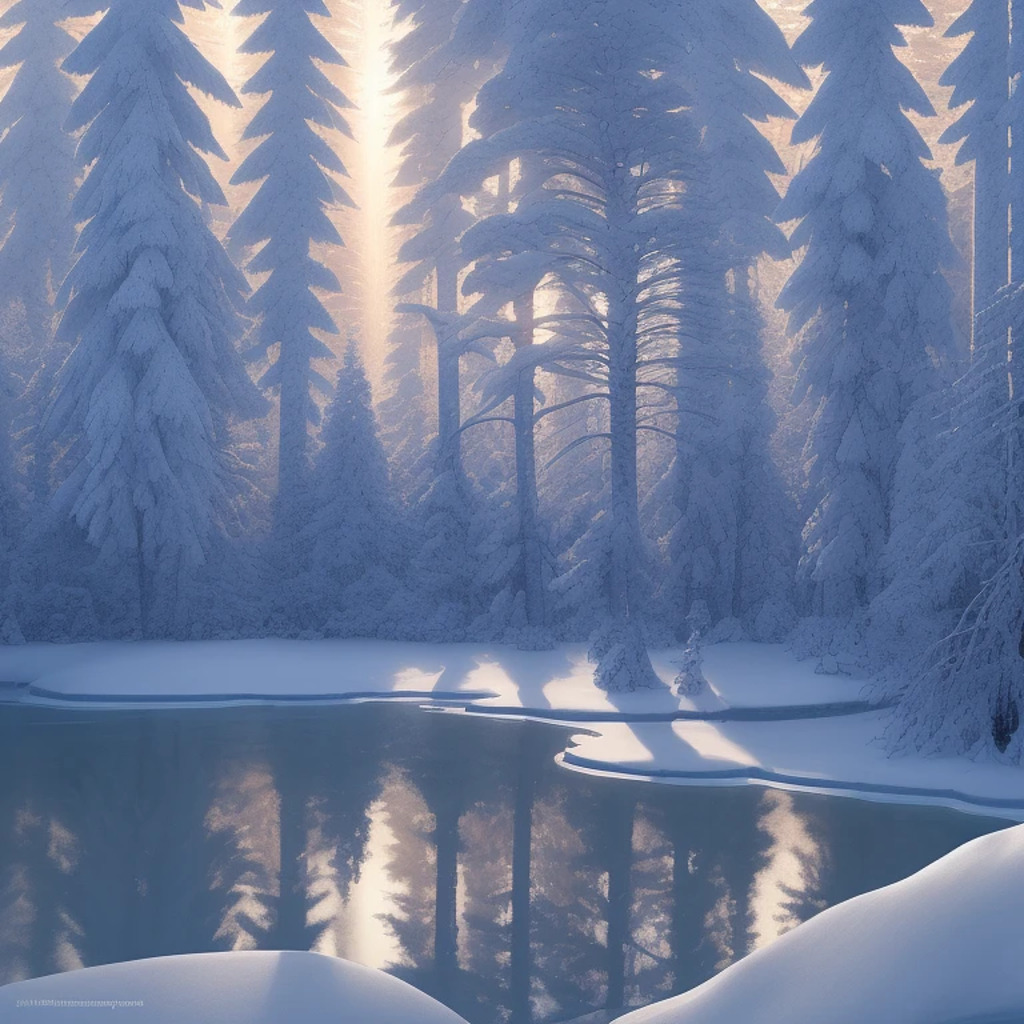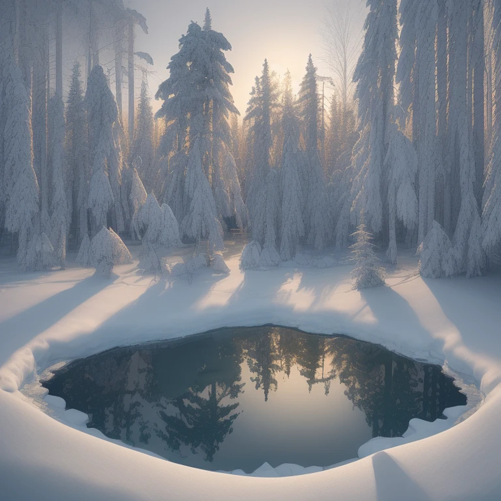 Prompt: lake surrounded by a frozen taiga forest, snow on the trees, winter, complex details, masterpiece, light ray, dramatic lighting, sharp focus, 4k, photo, digital art