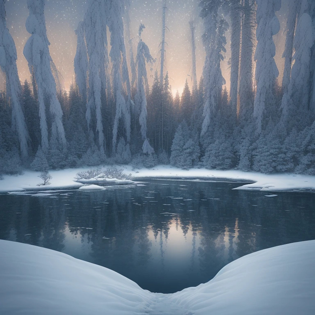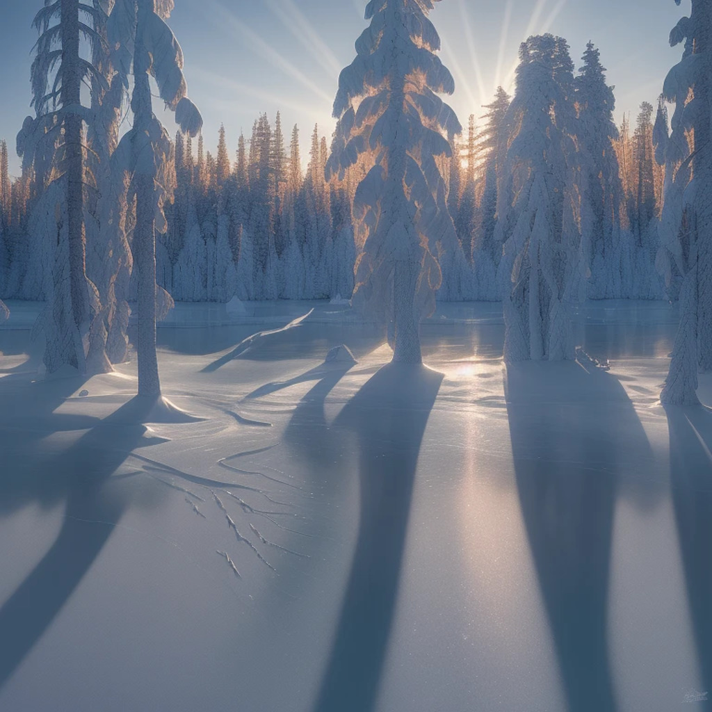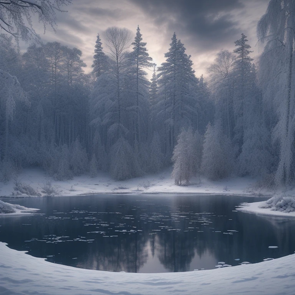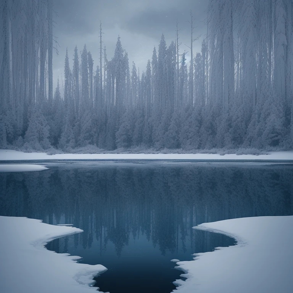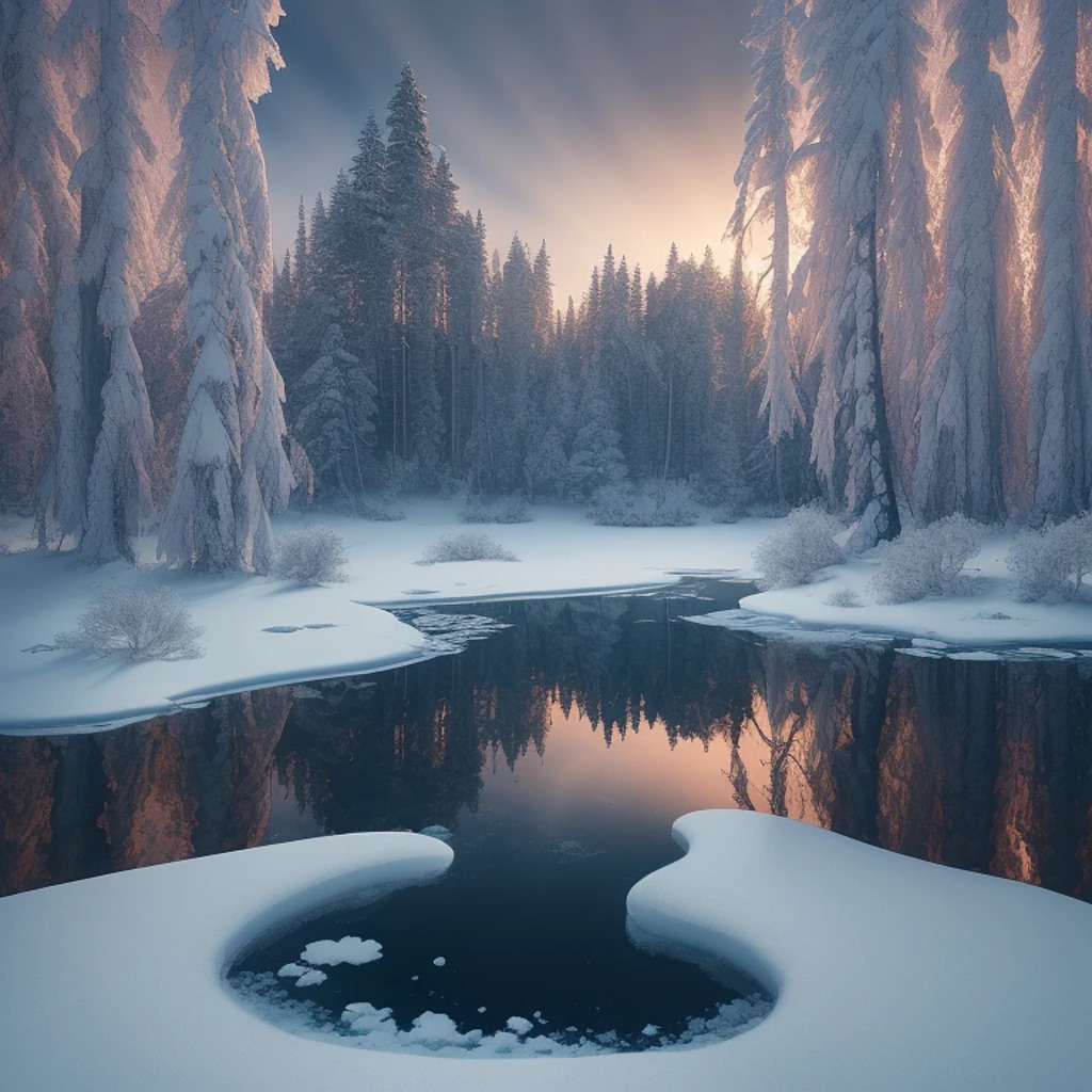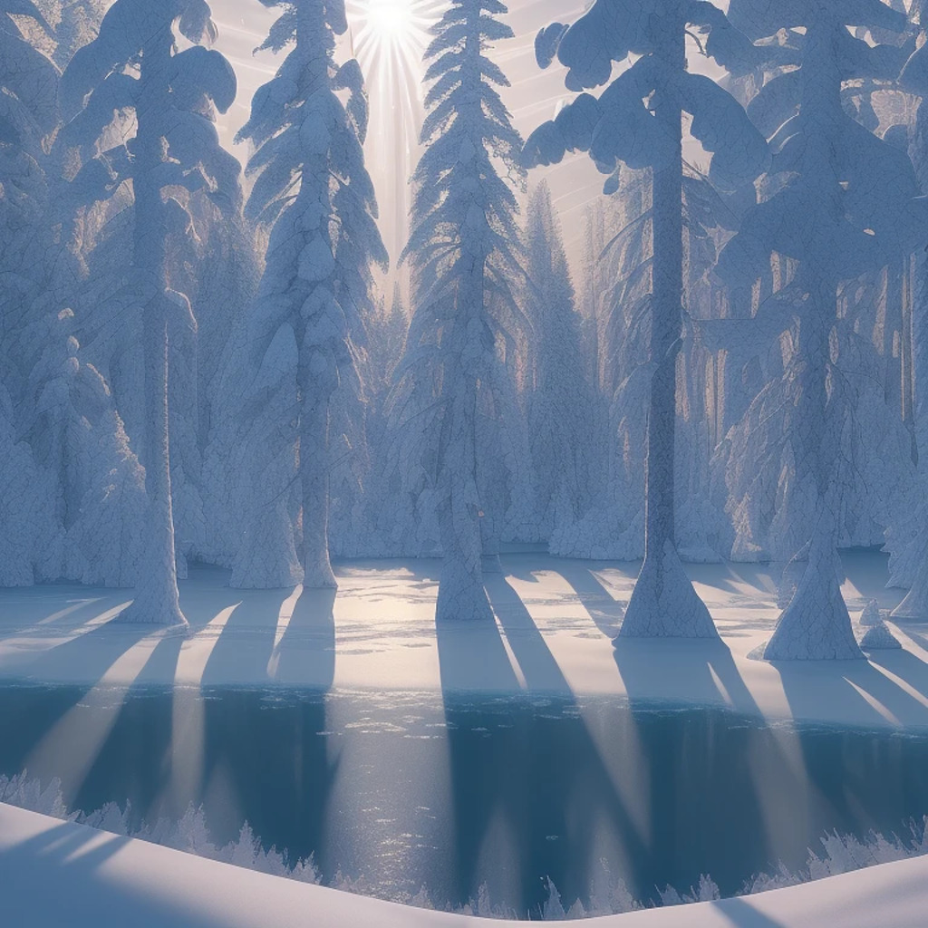 Prompt: lake surrounded by a frozen taiga forest, snow on the trees, winter, complex details, masterpiece, light ray, dramatic lighting, sharp focus, 4k, photo, digital art