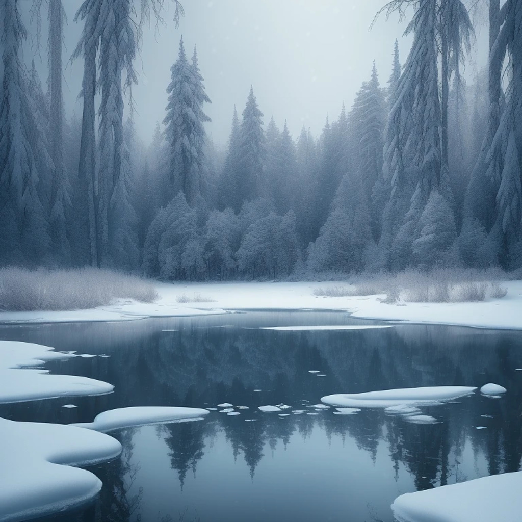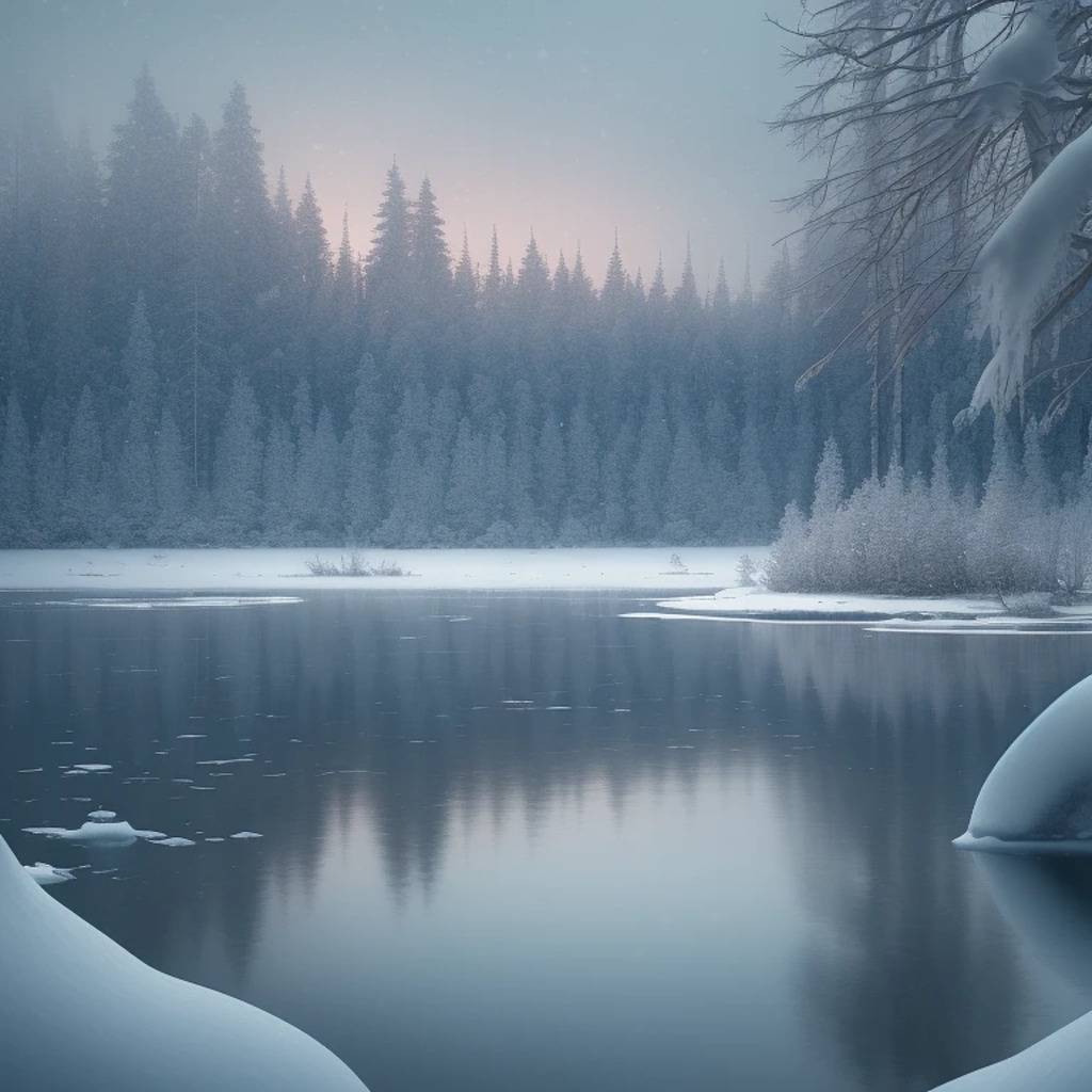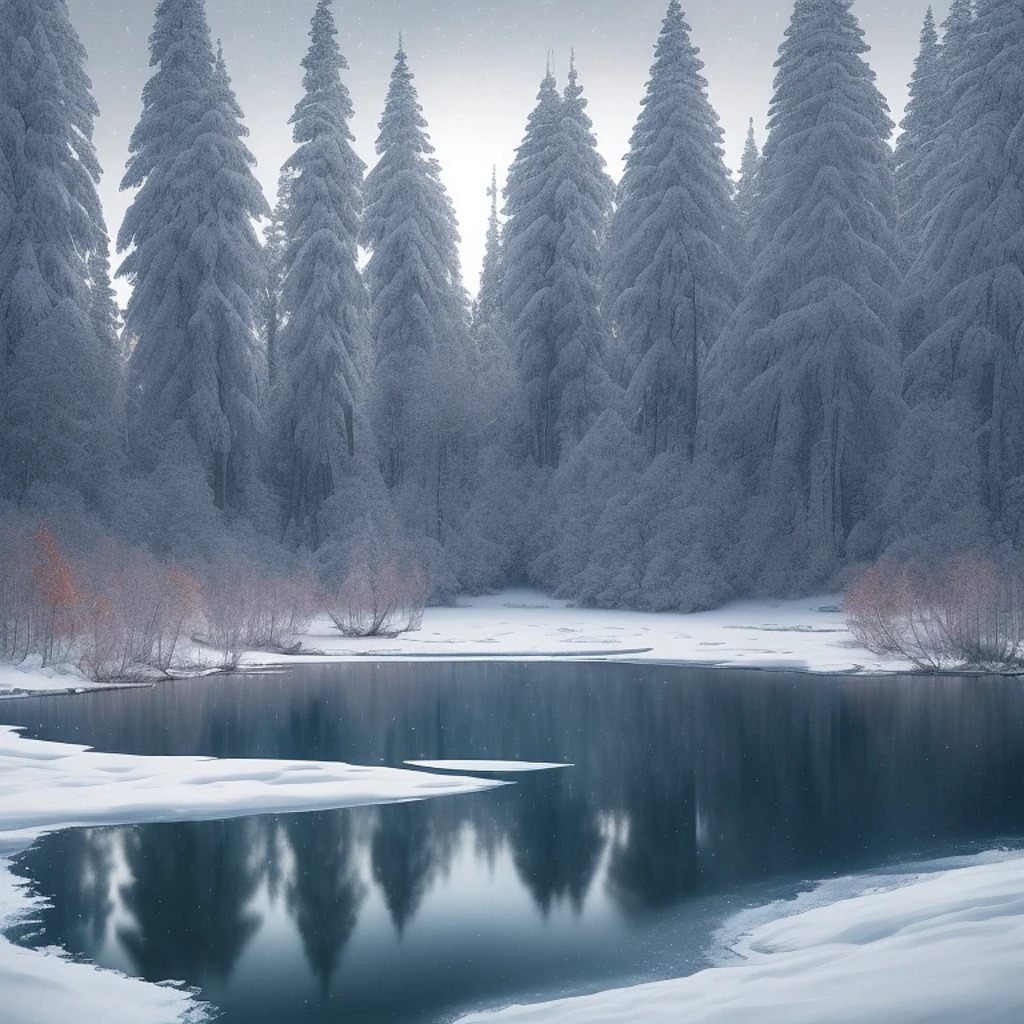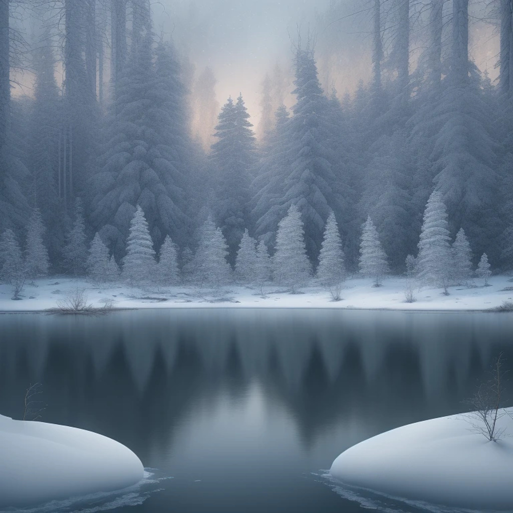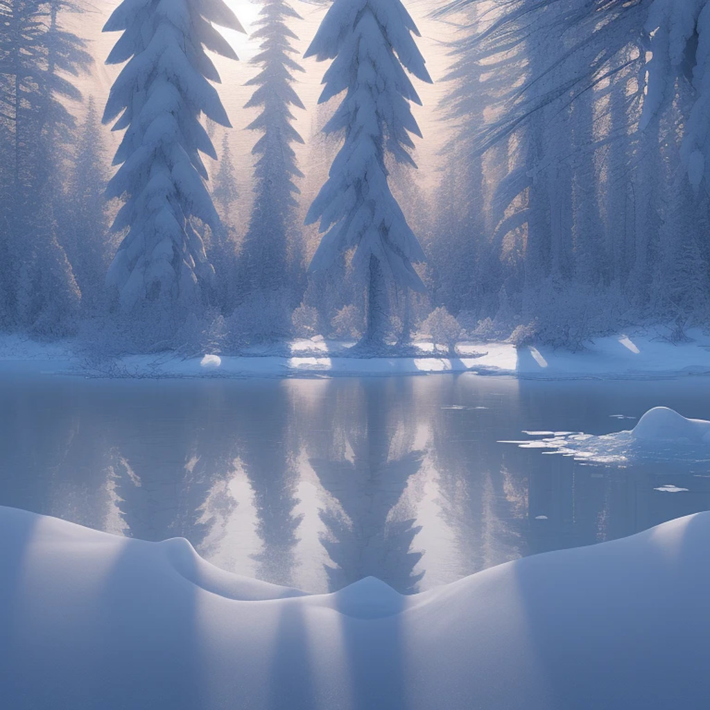 Prompt: lake surrounded by a frozen taiga forest, snow on the trees, winter, complex details, masterpiece, light ray, dramatic lighting, sharp focus, 4k, photo, digital art