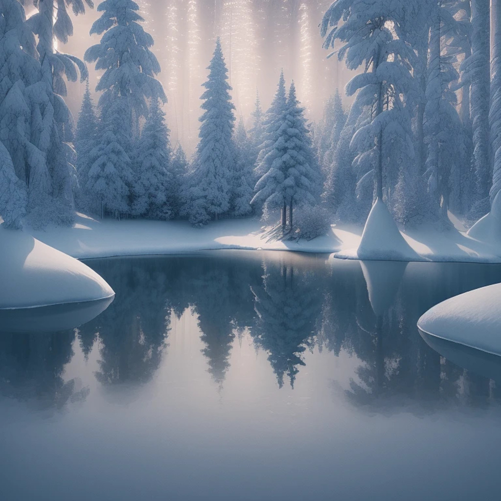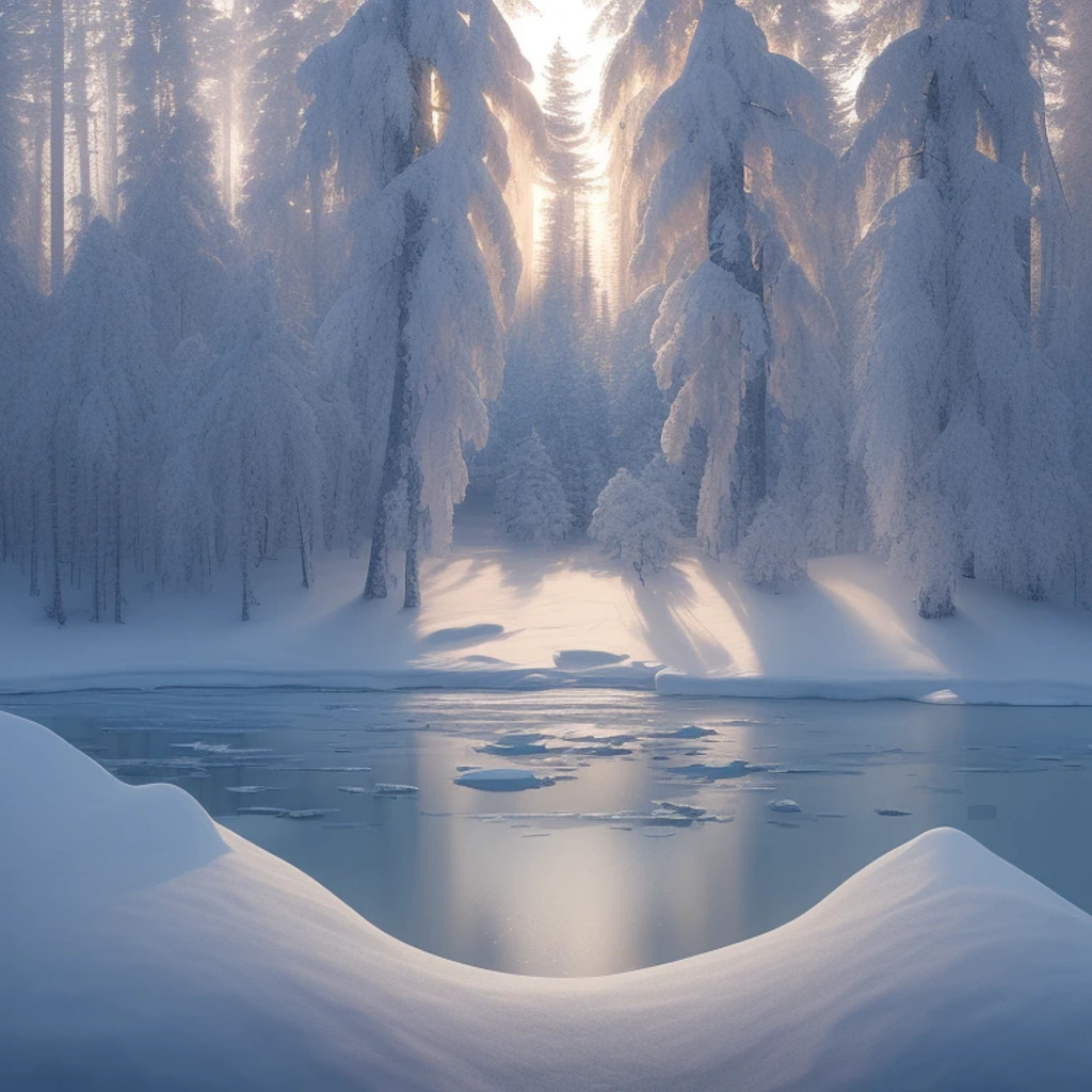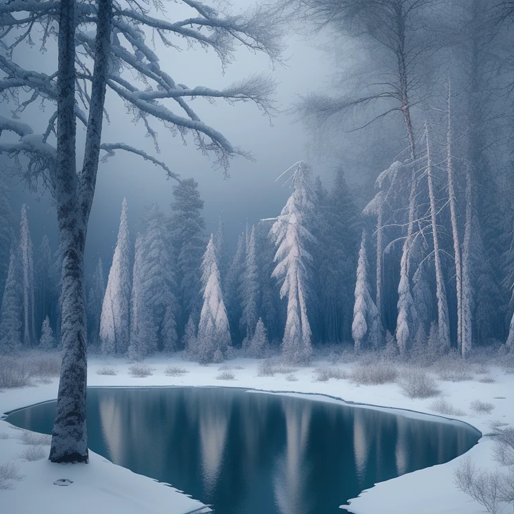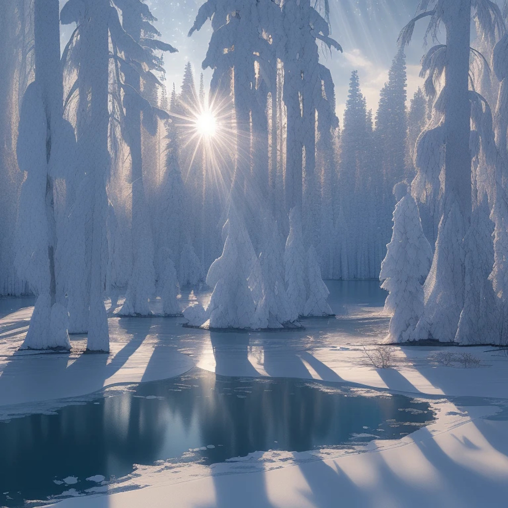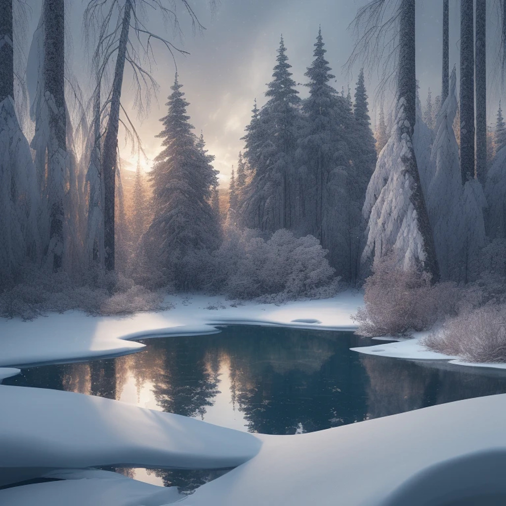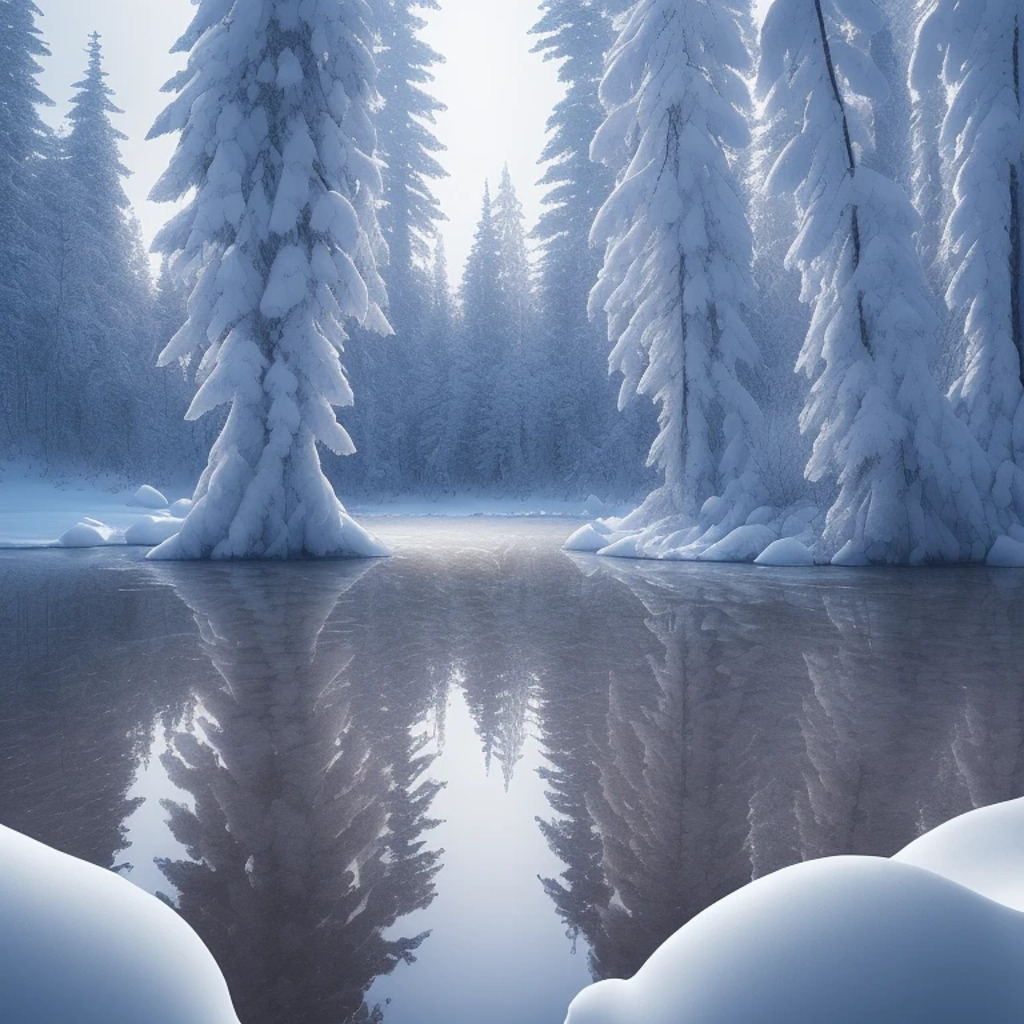 Prompt: lake surrounded by a frozen taiga forest, snow on the trees, winter, complex details, masterpiece, light ray, dramatic lighting, sharp focus, 4k, photo, digital art