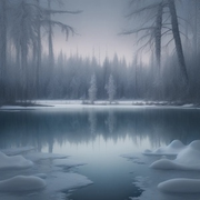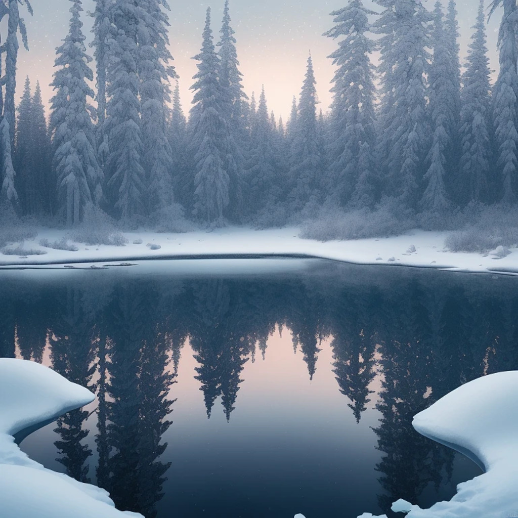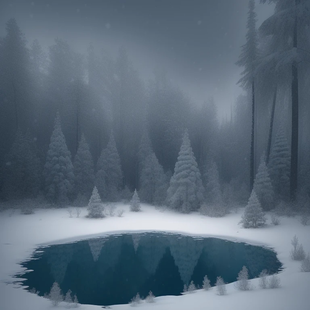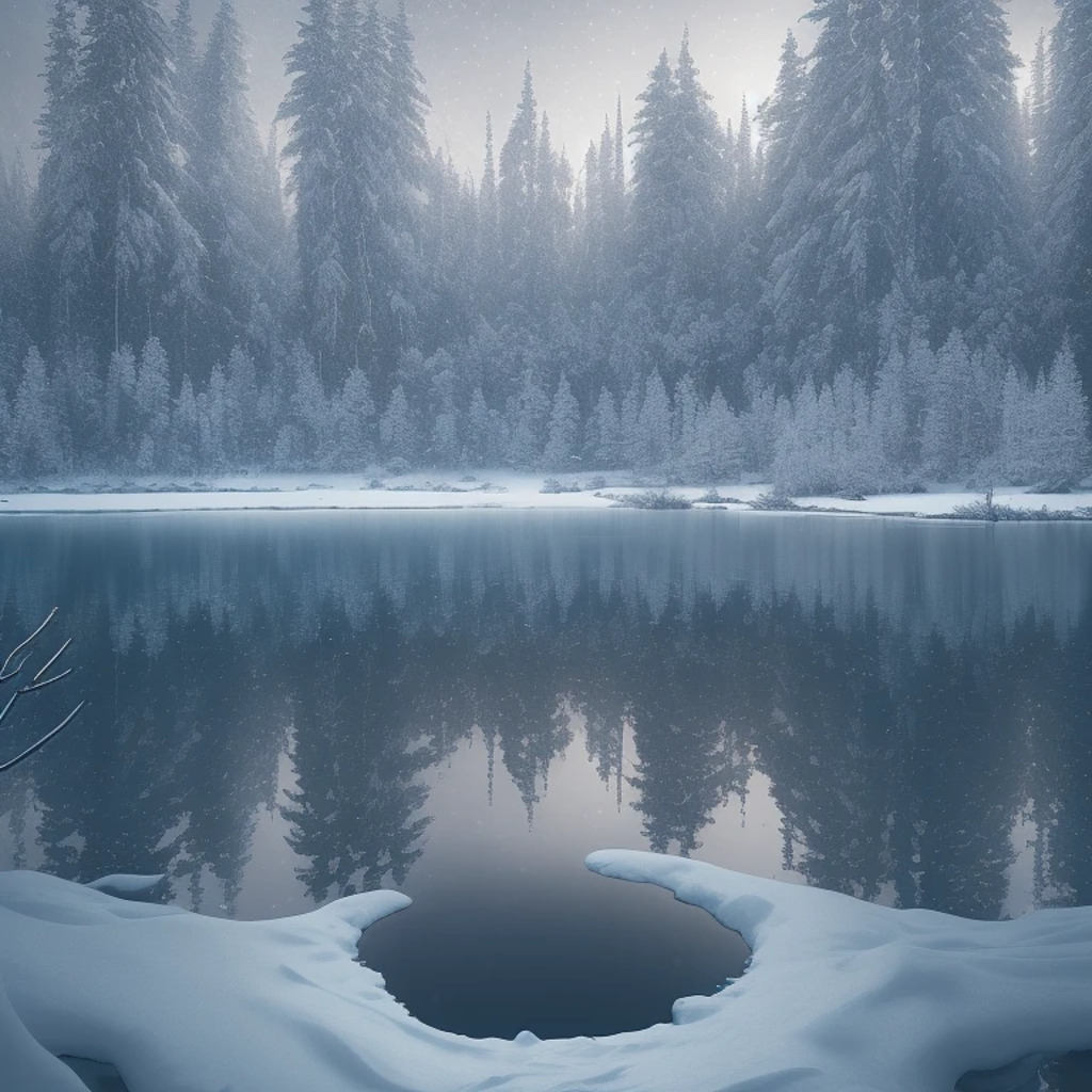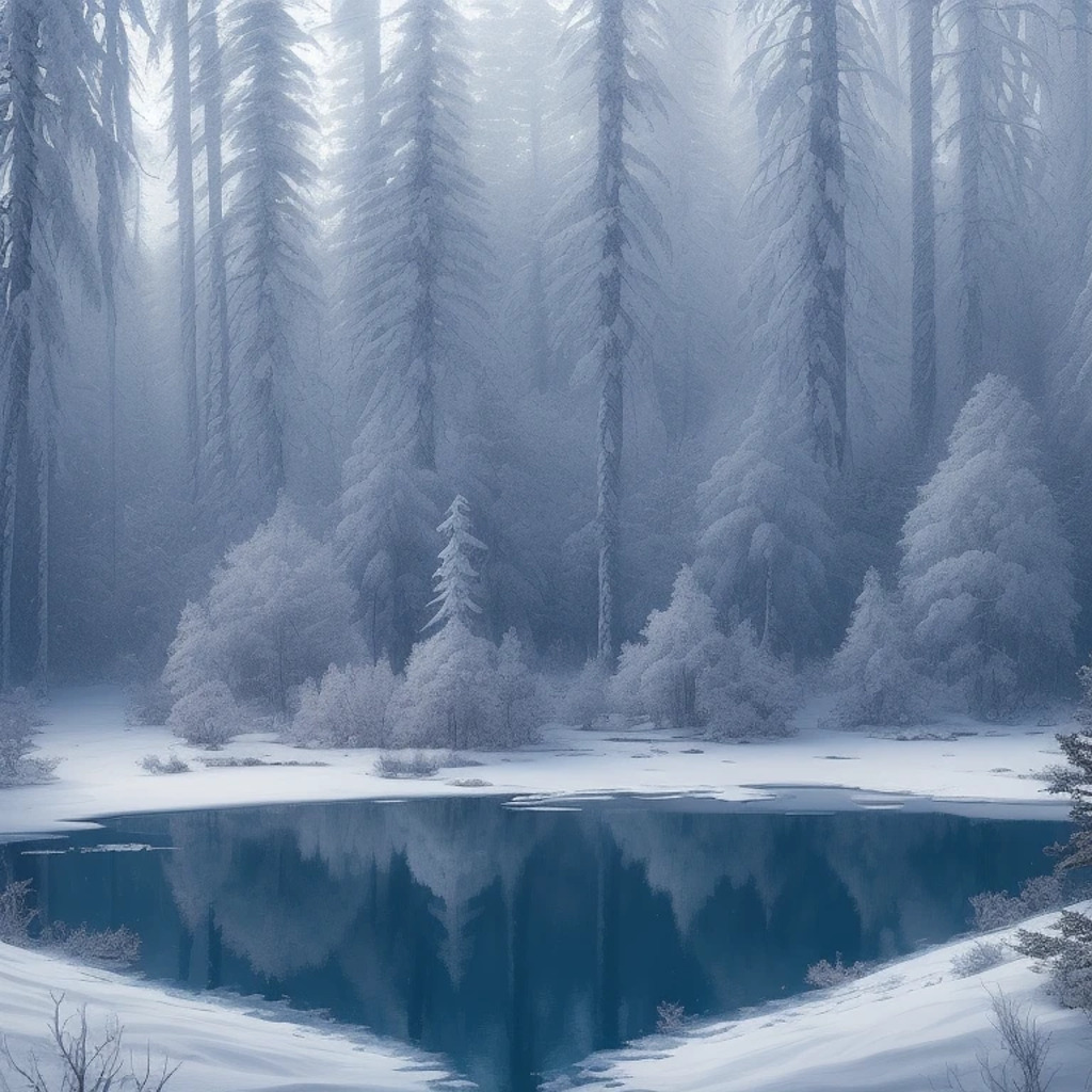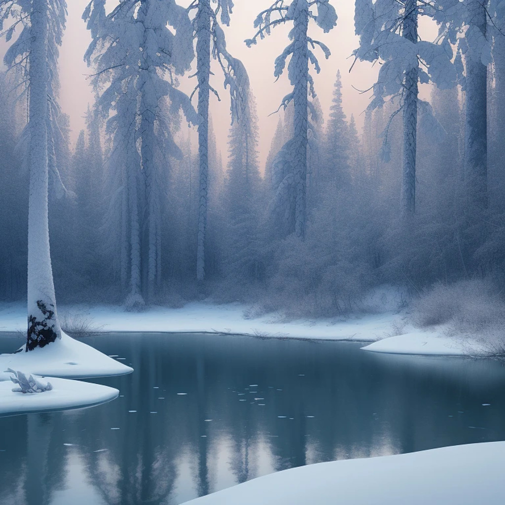 Prompt: lake surrounded by a frozen taiga forest, snow on the trees, winter, complex details, masterpiece, light ray, dramatic lighting, sharp focus, 4k, photo, digital art