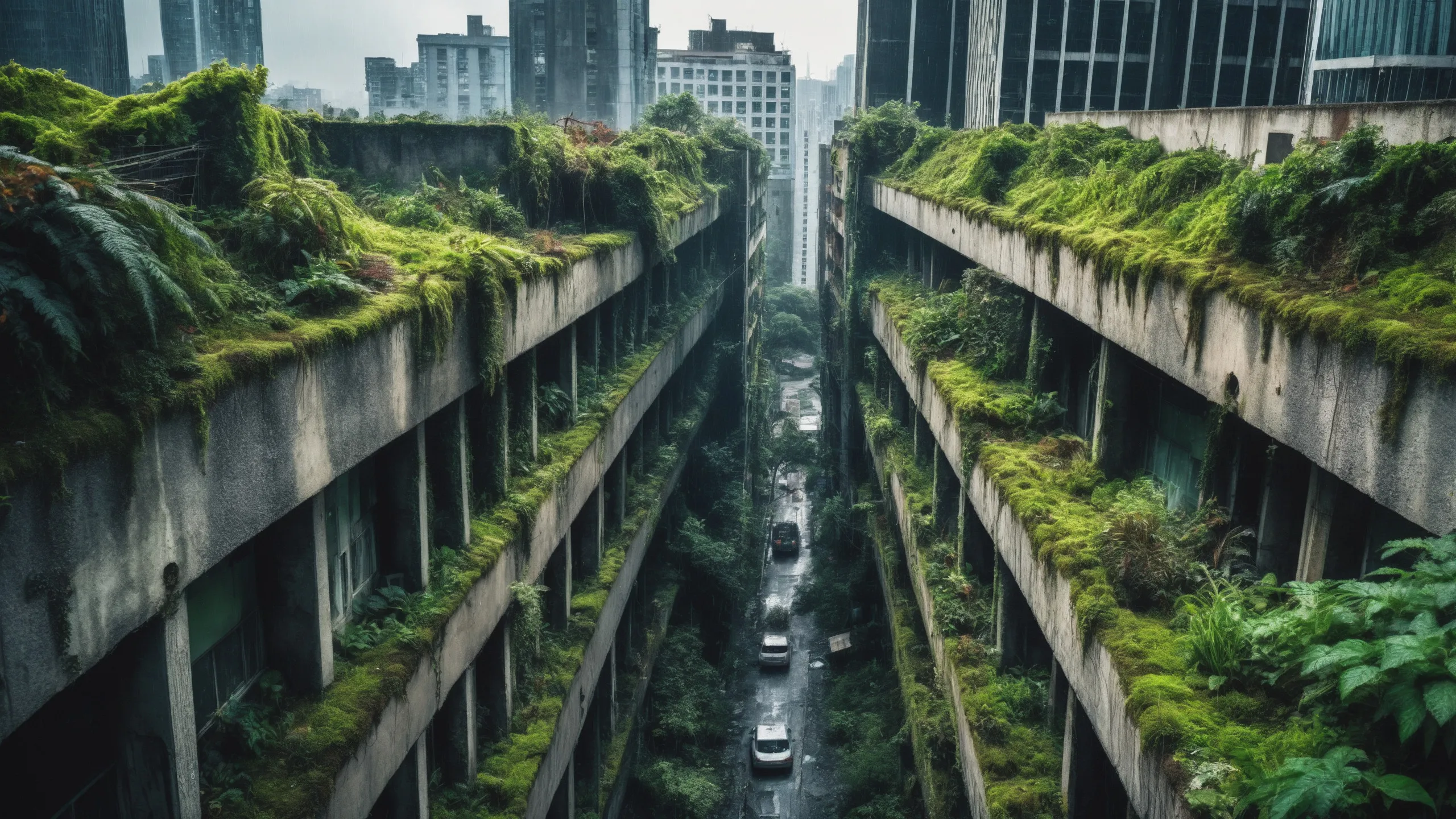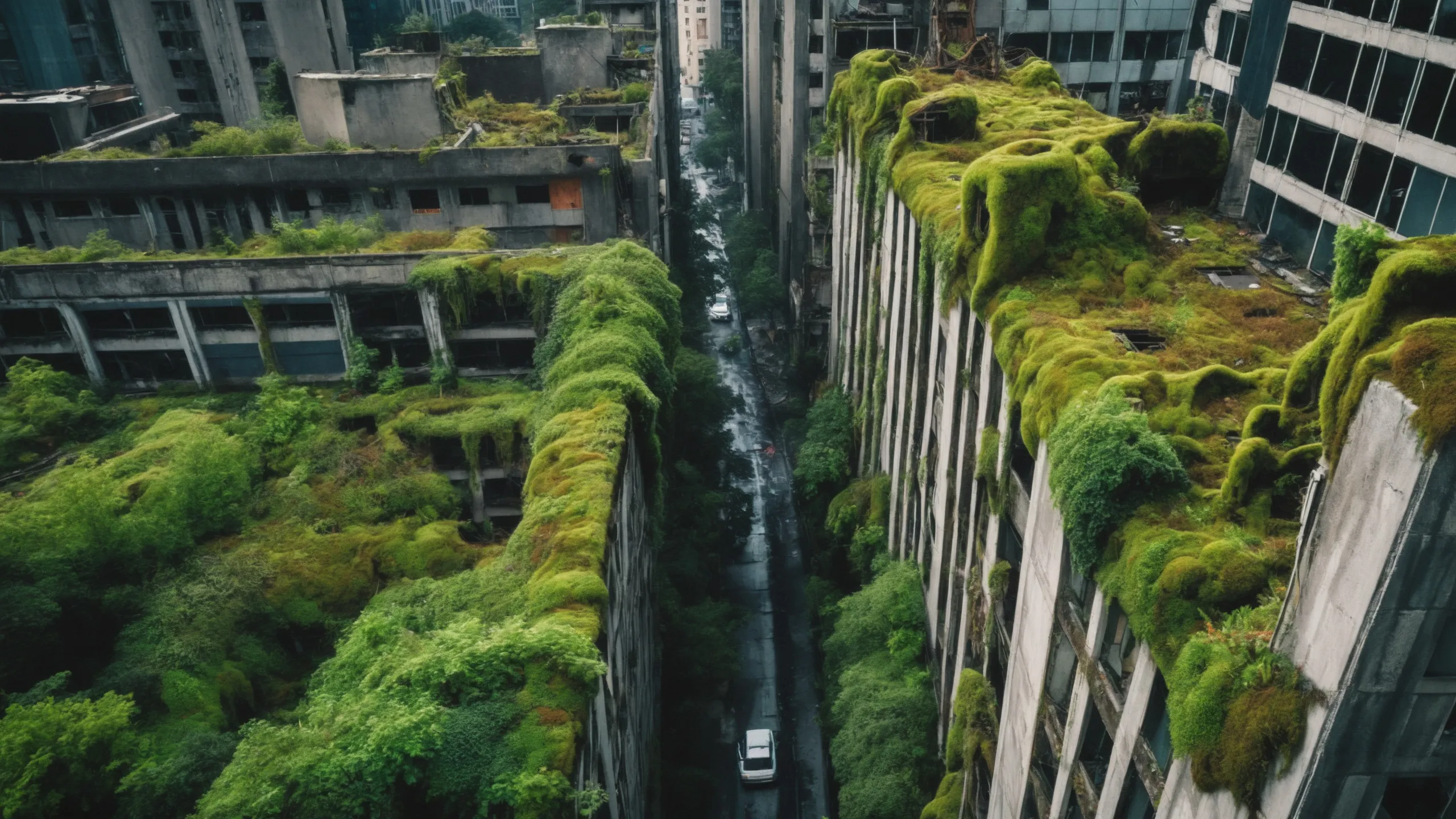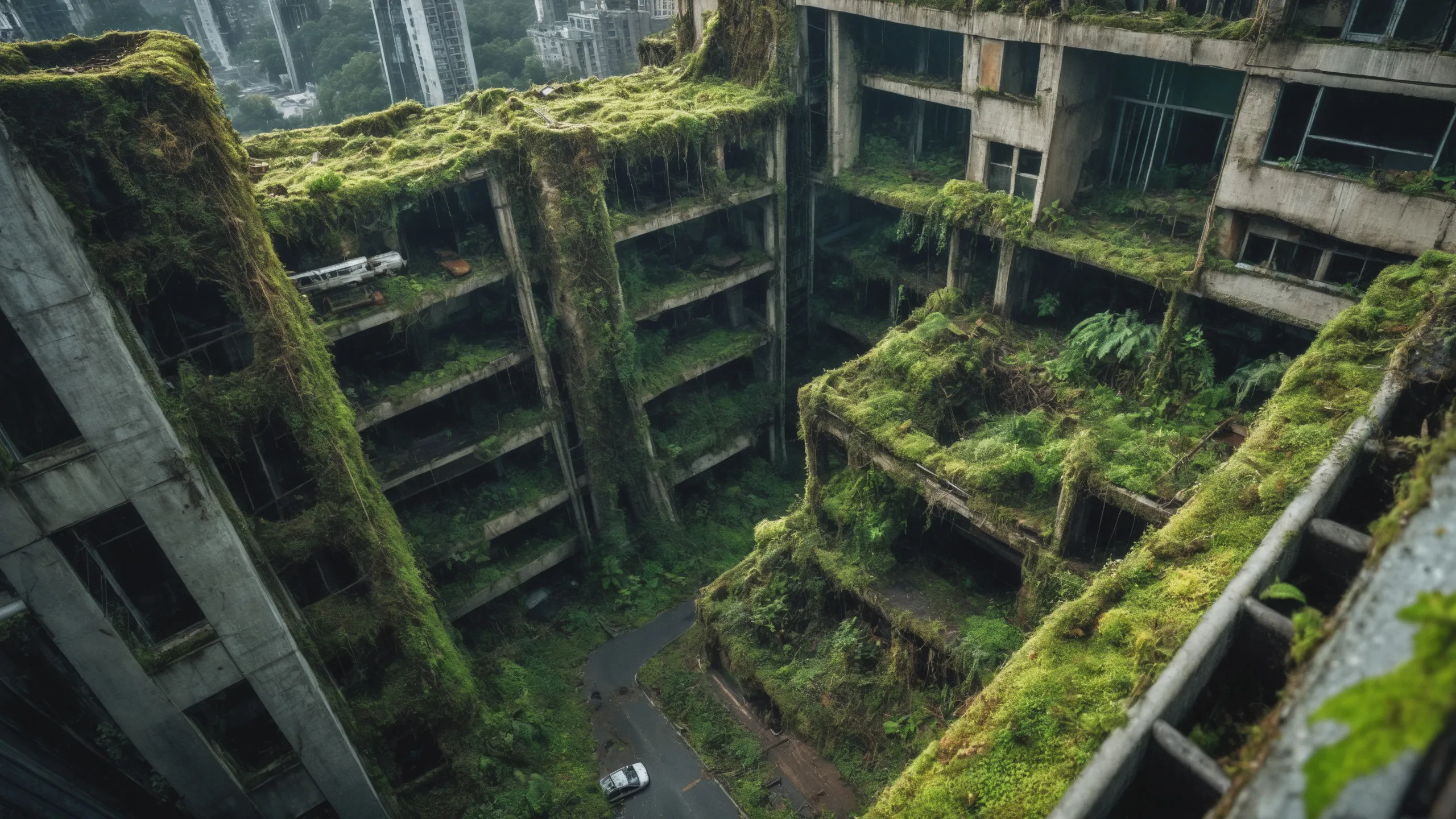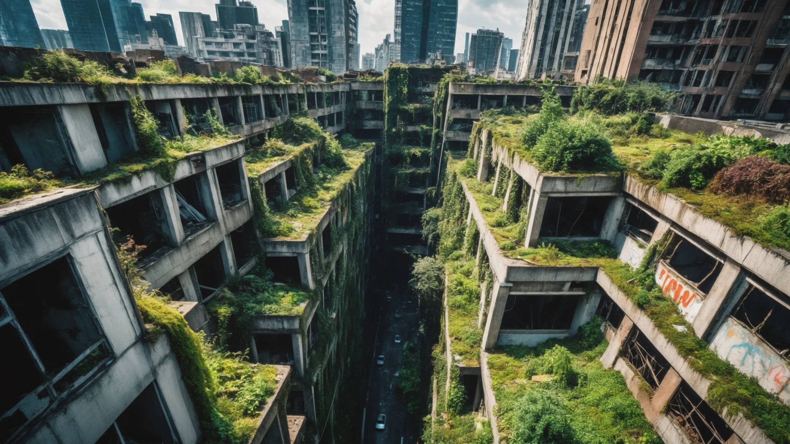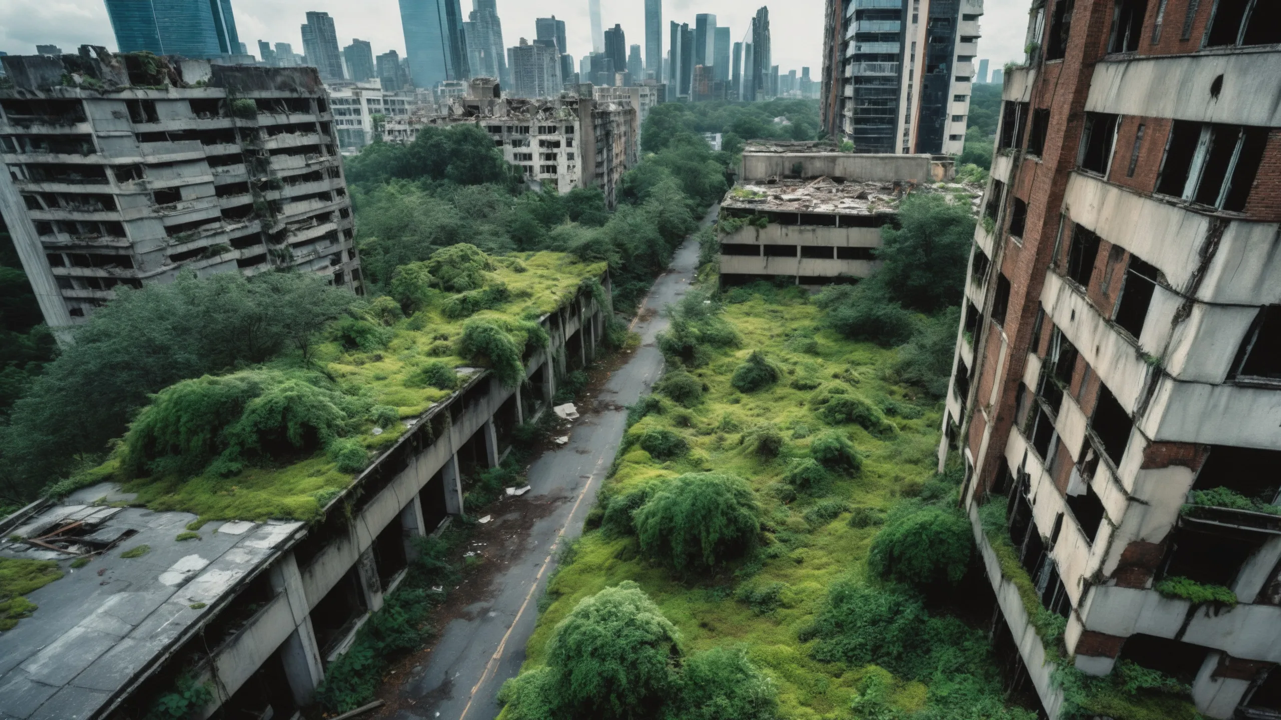 A sprawling, futuristic mega city (abandoned:1.5) and reclaimed by nature. Ruins of towering skyscrapers, covered in moss, vines, and trees, with broken windows and crumbling infrastructure. The abandoned streets, without traffic, overrun with wild plants, bushes, and trees growing through the pavement.