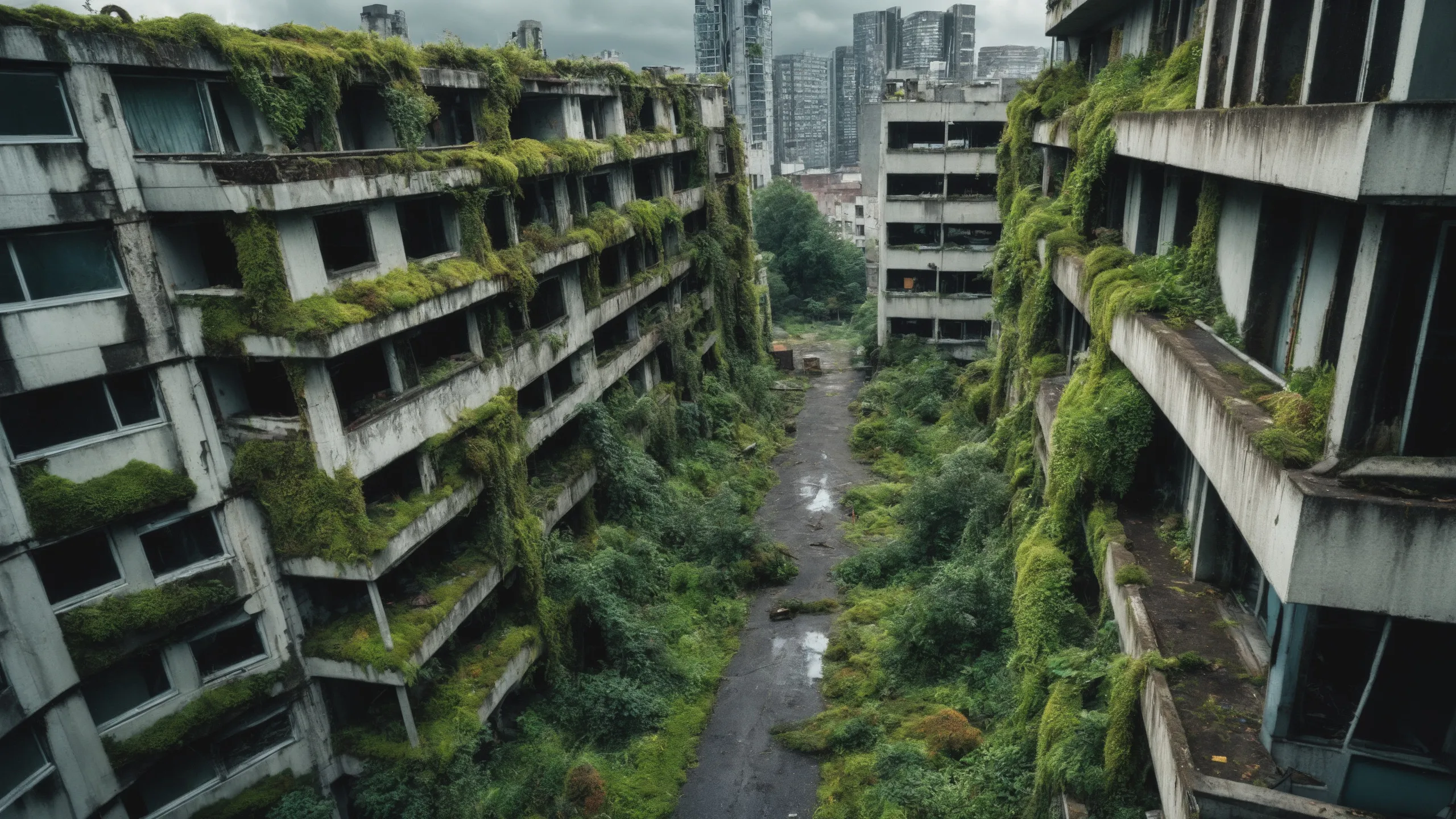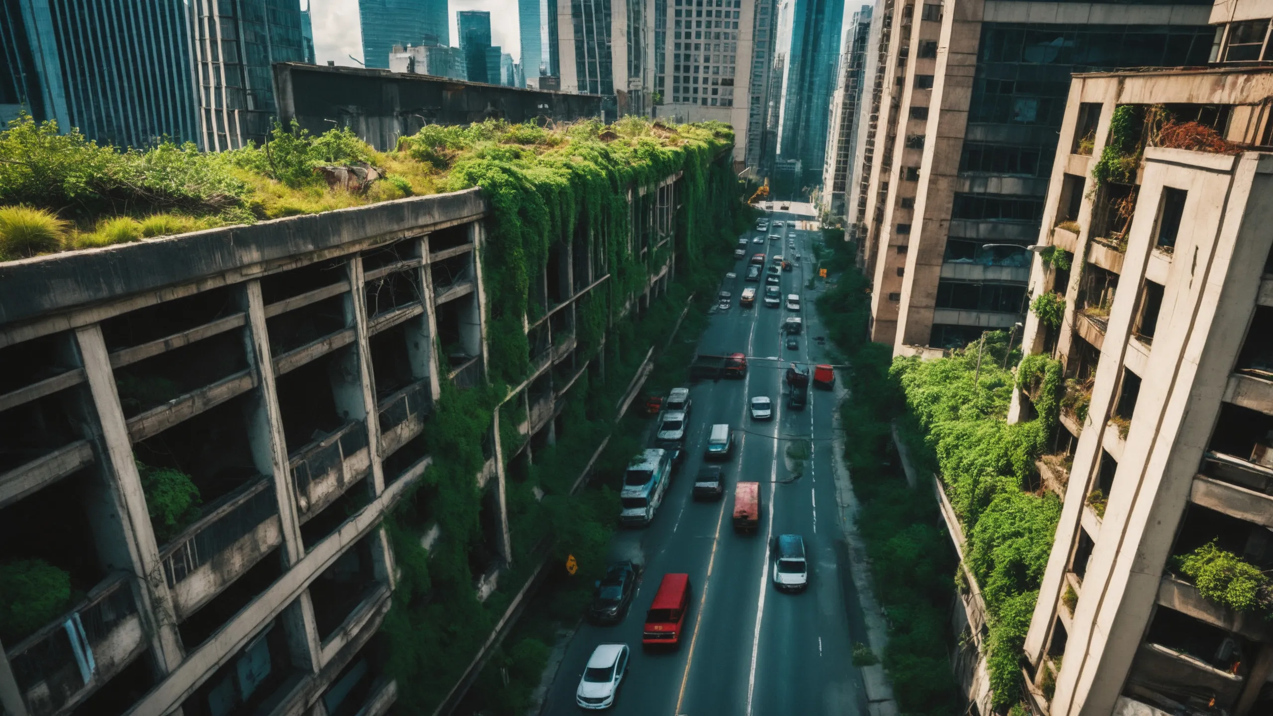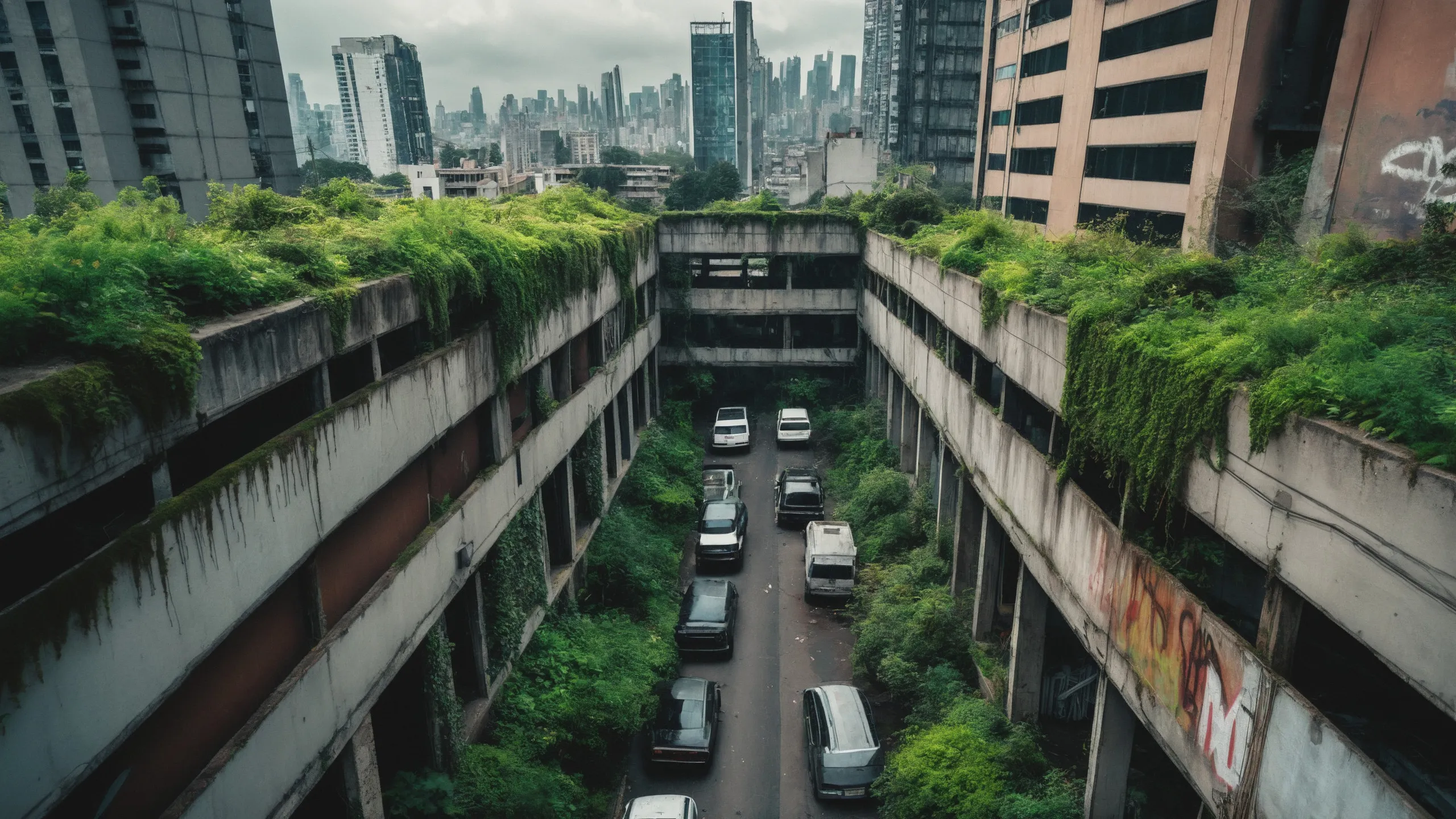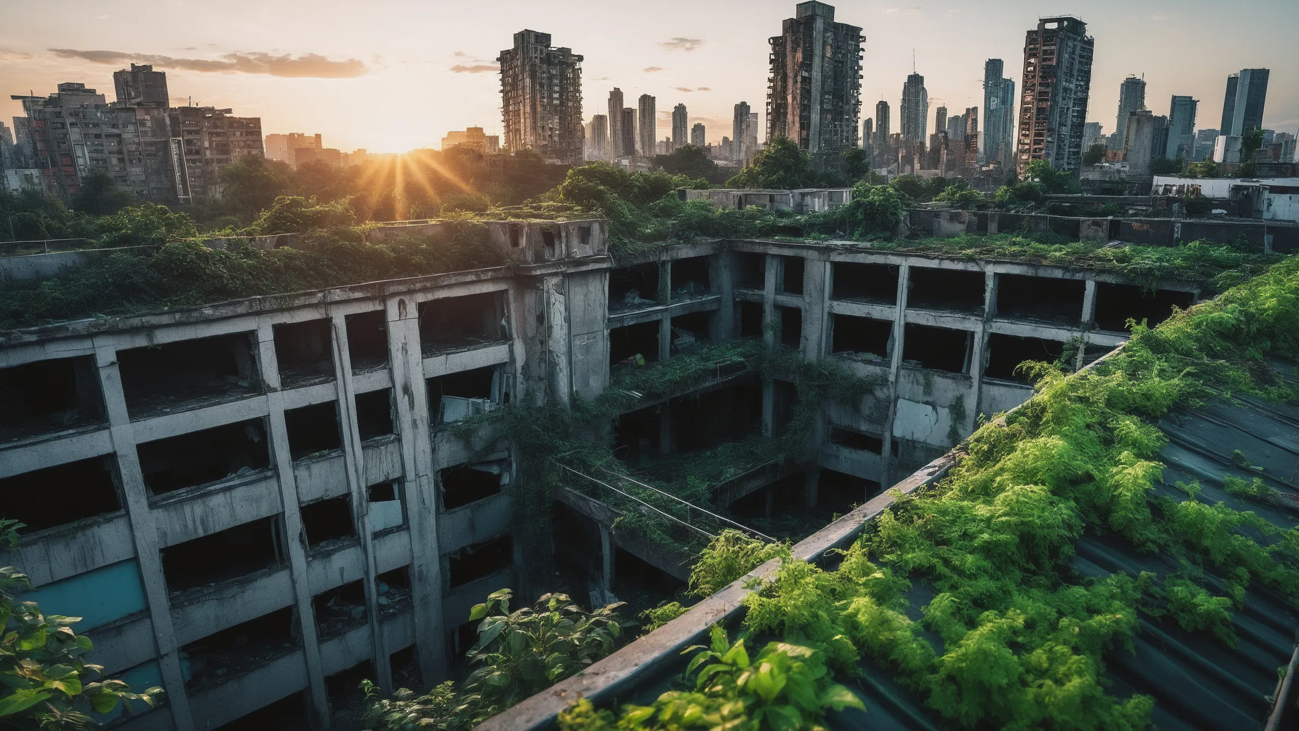 A sprawling, futuristic mega city (abandoned:1.5) and reclaimed by nature. Ruins of towering skyscrapers, covered in moss, vines, and trees, with broken windows and crumbling infrastructure. The abandoned streets, without traffic, overrun with wild plants, bushes, and trees growing through the pavement.