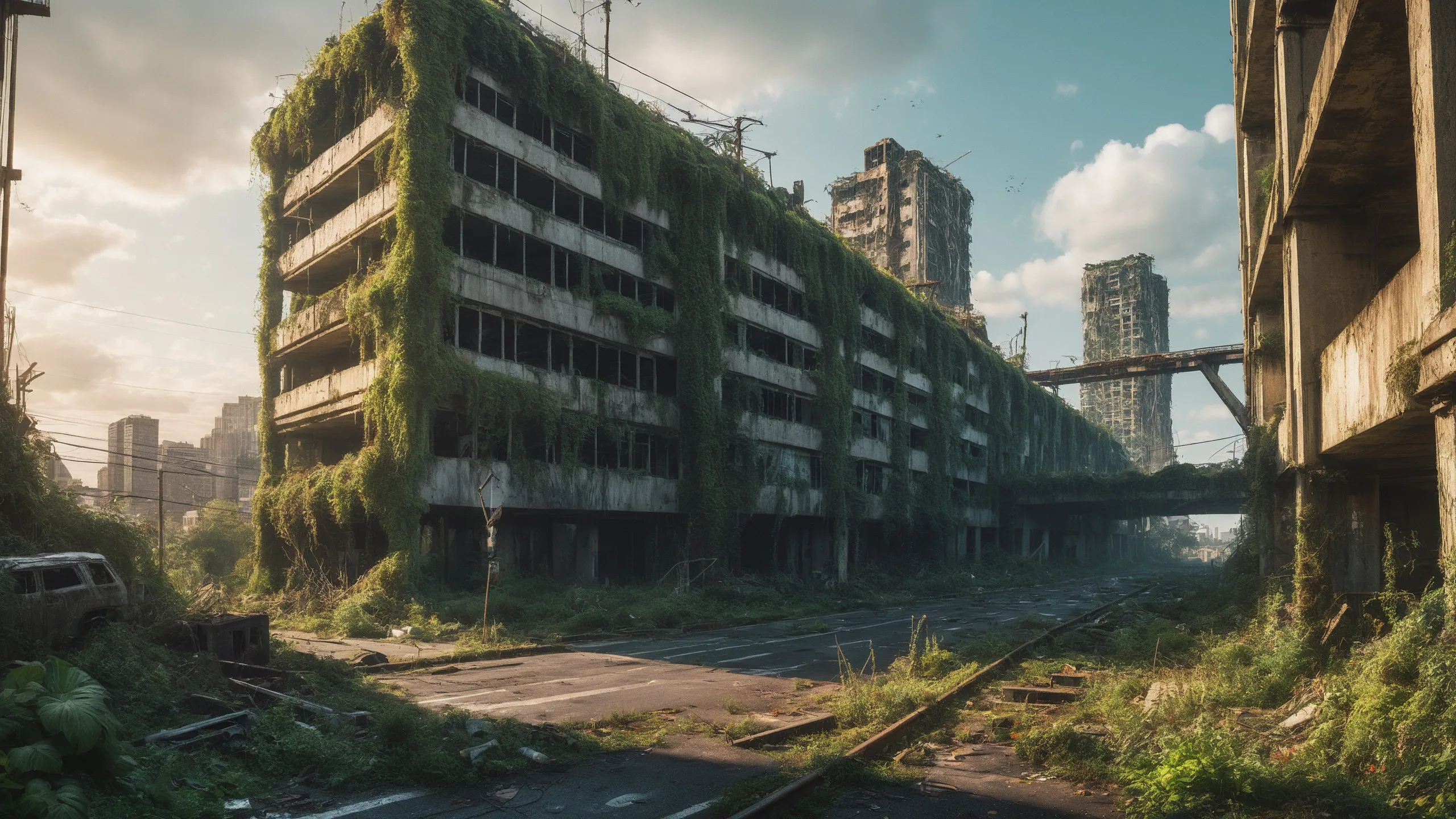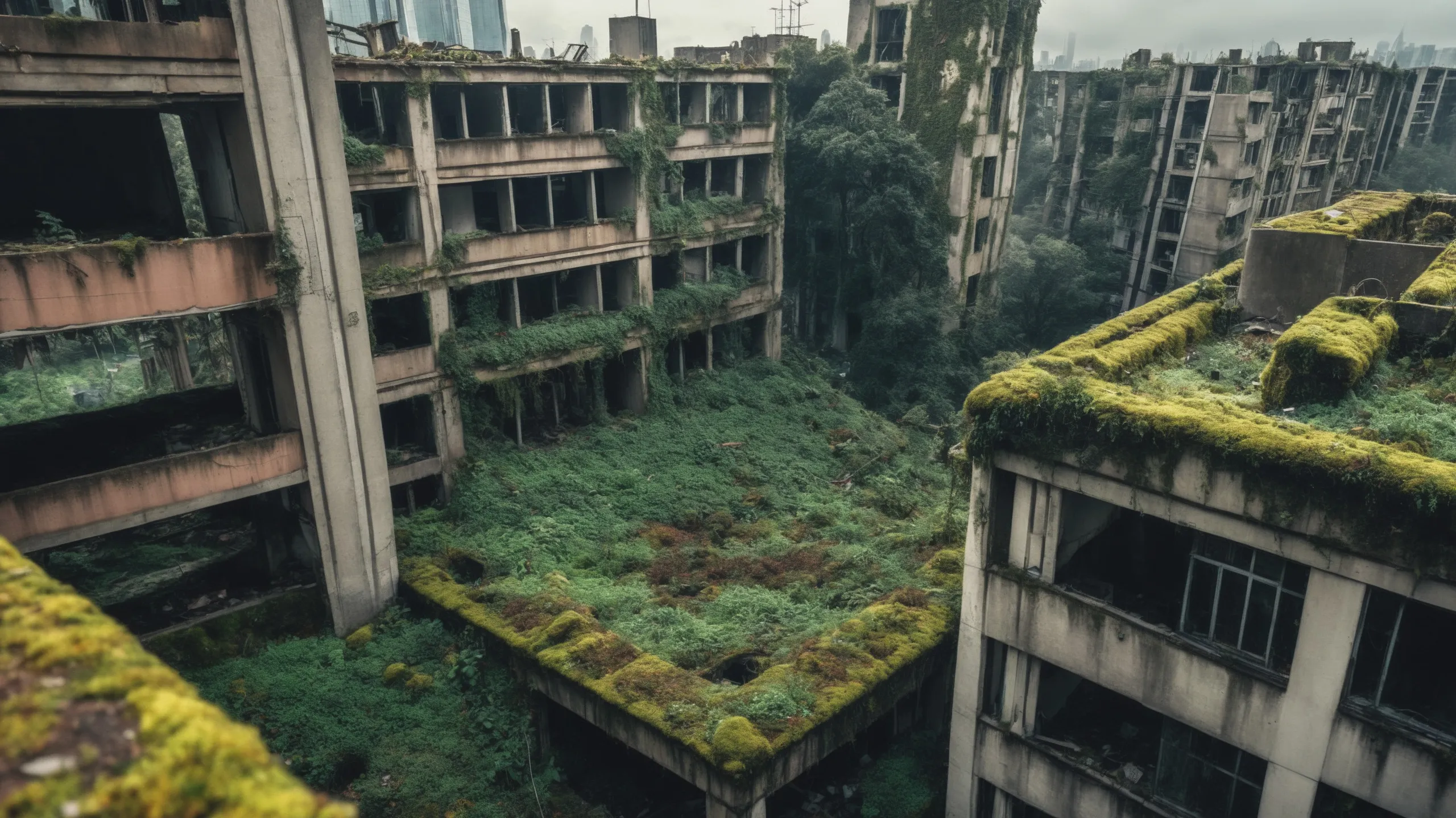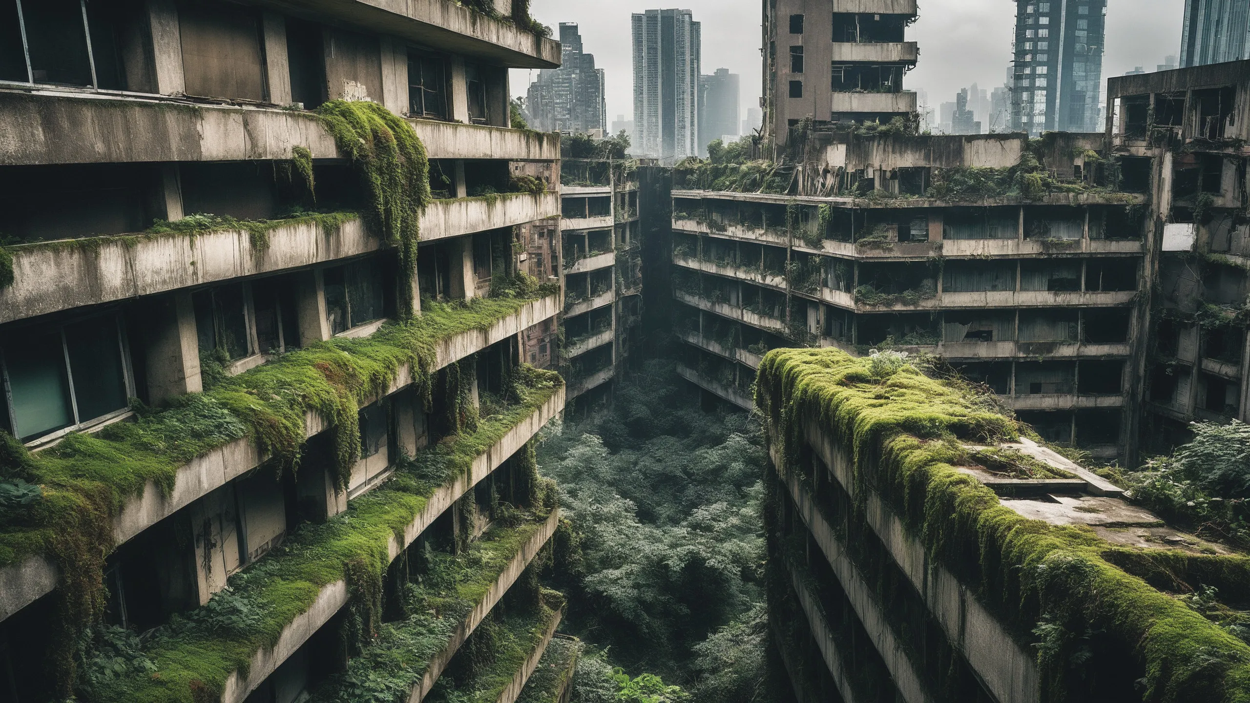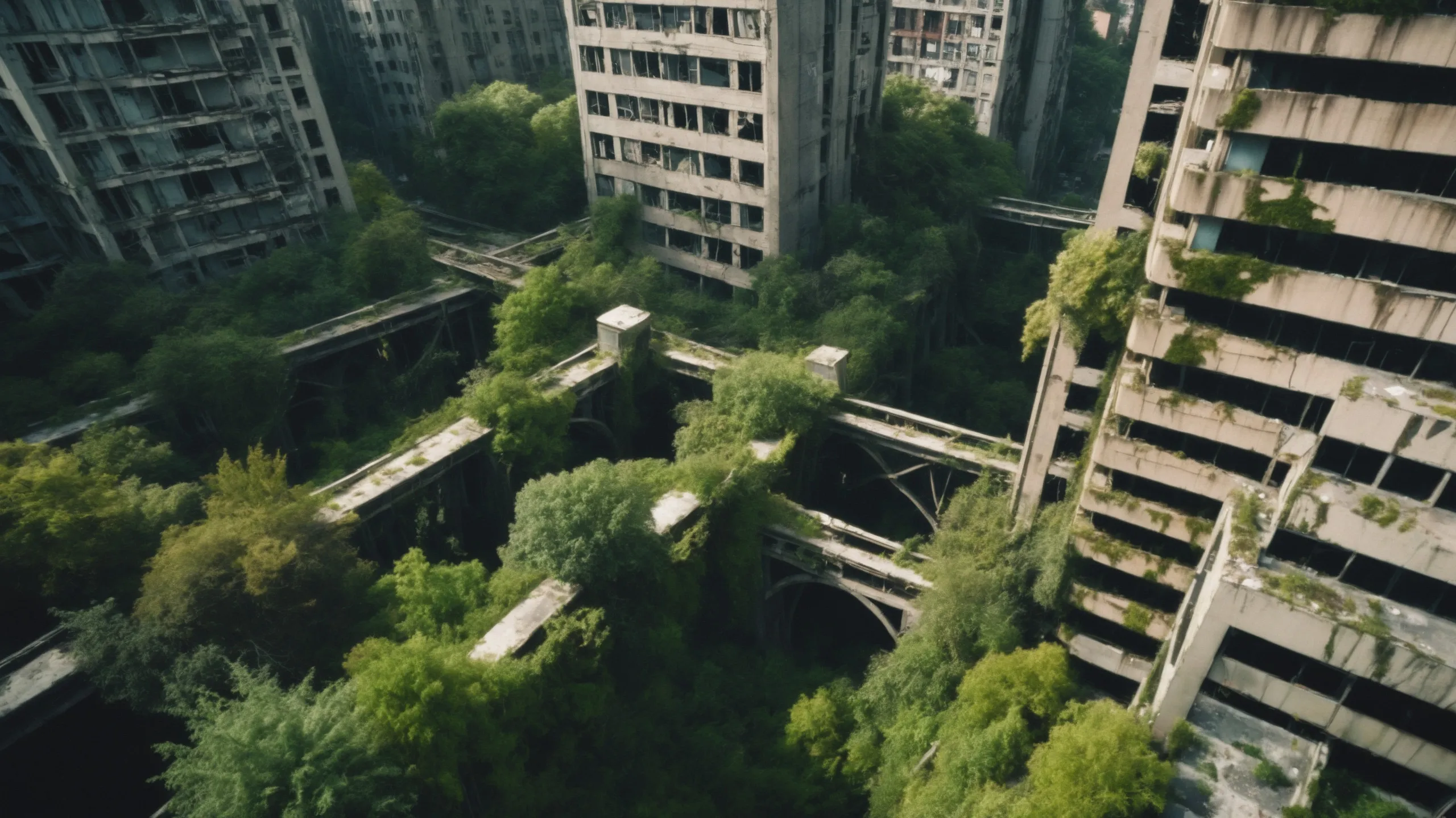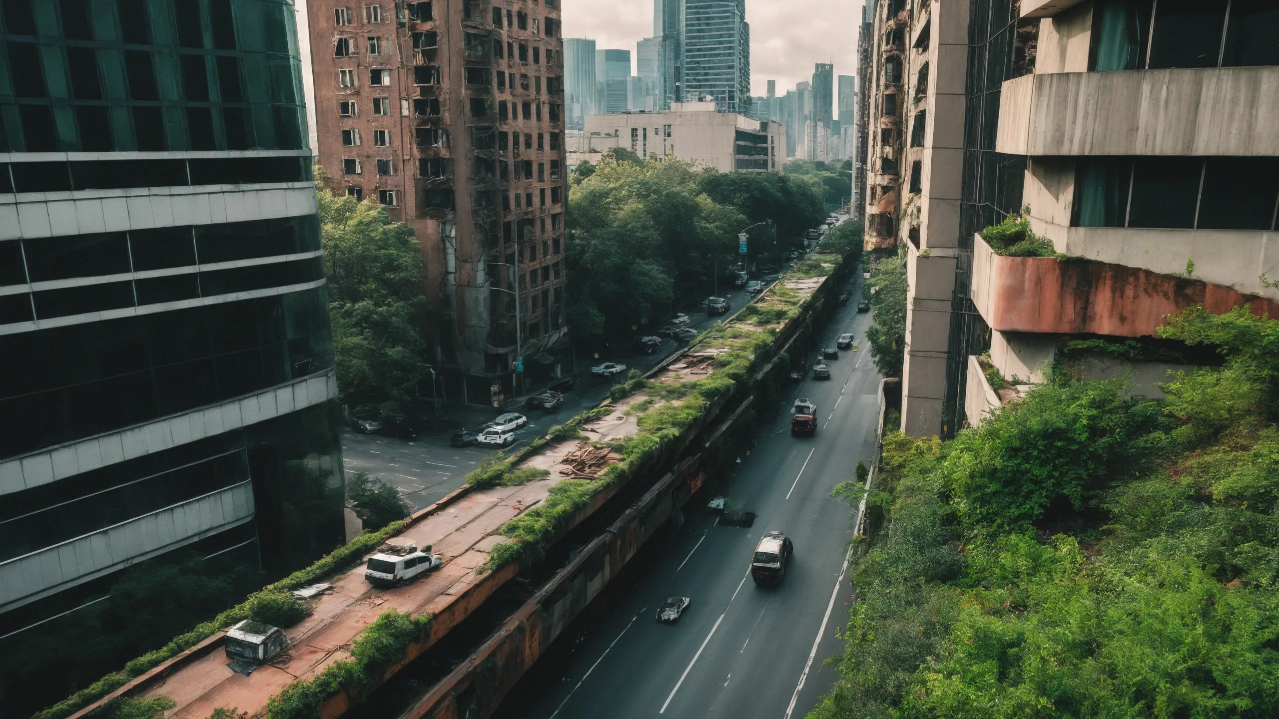 A sprawling, futuristic mega city (abandoned:1.5) and reclaimed by nature. Ruins of towering skyscrapers, covered in moss, vines, and trees, with broken windows and crumbling infrastructure. The abandoned streets, without traffic, overrun with wild plants, bushes, and trees growing through the pavement.