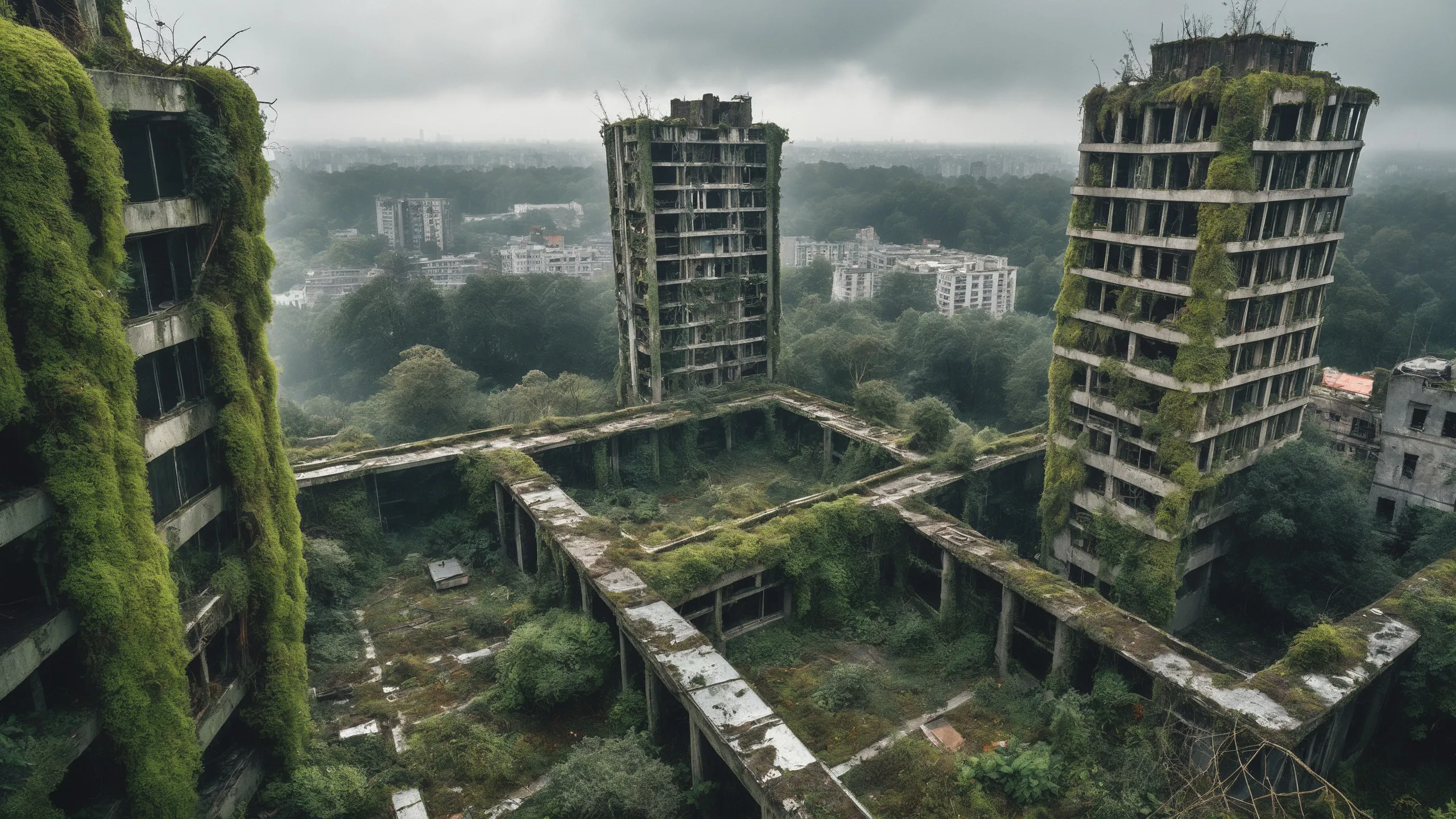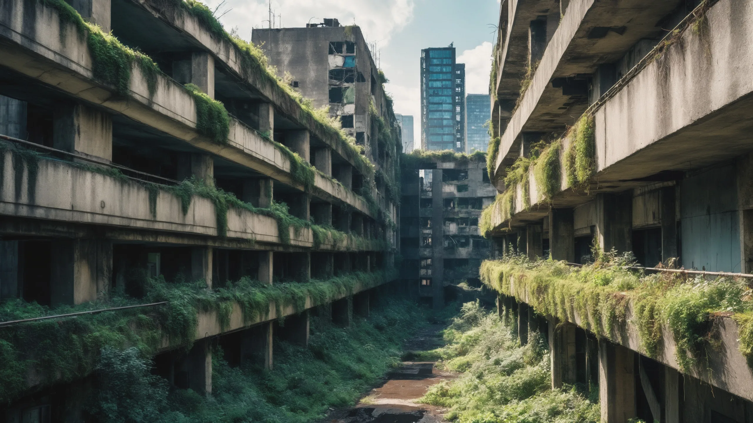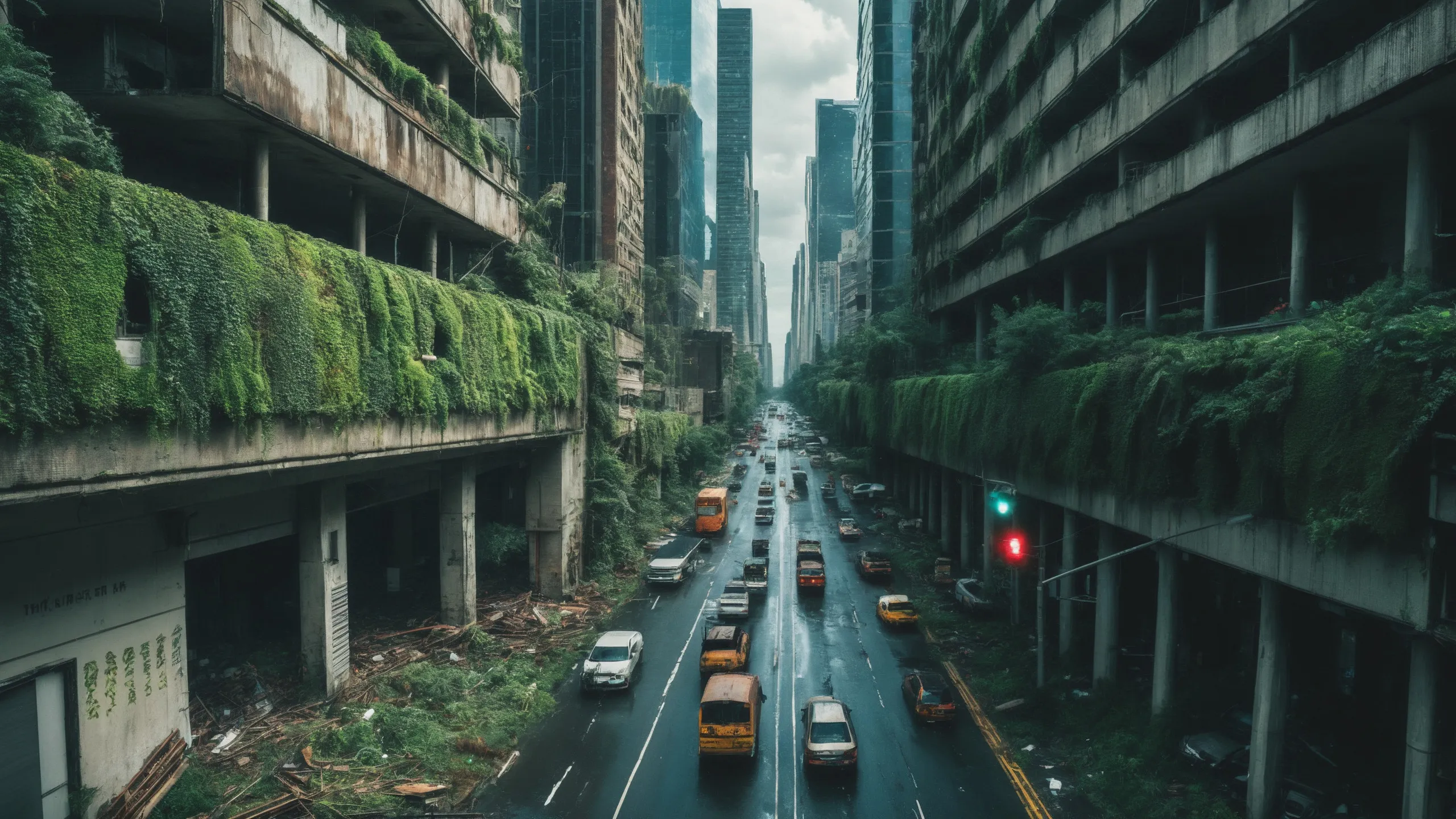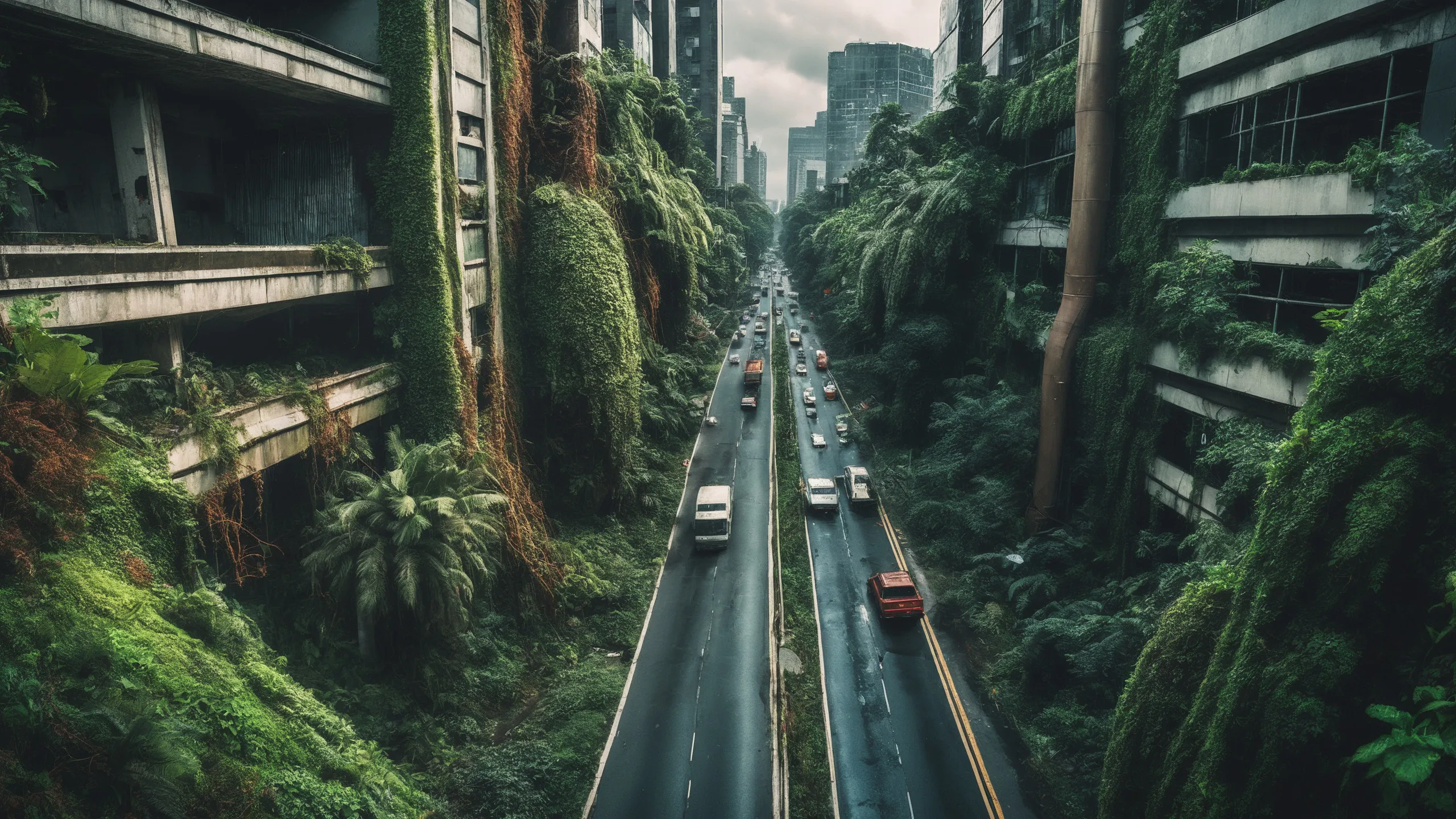A sprawling, futuristic mega city (abandoned:1.5) and reclaimed by nature. Ruins of towering skyscrapers, covered in moss, vines, and trees, with broken windows and crumbling infrastructure. The abandoned streets, without traffic, overrun with wild plants, bushes, and trees growing through the pavement.