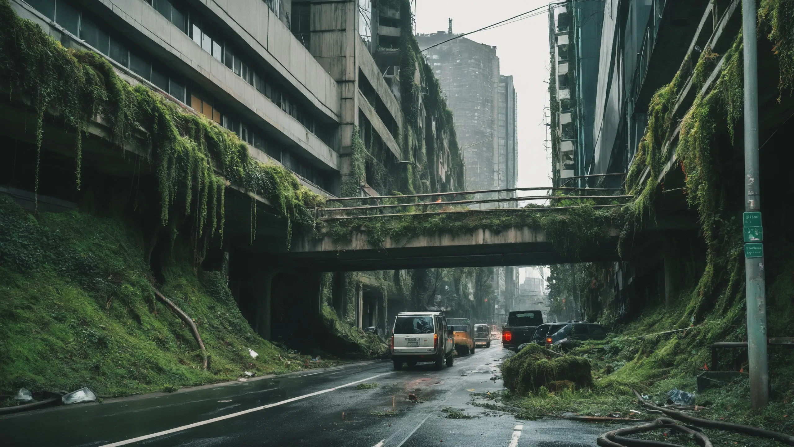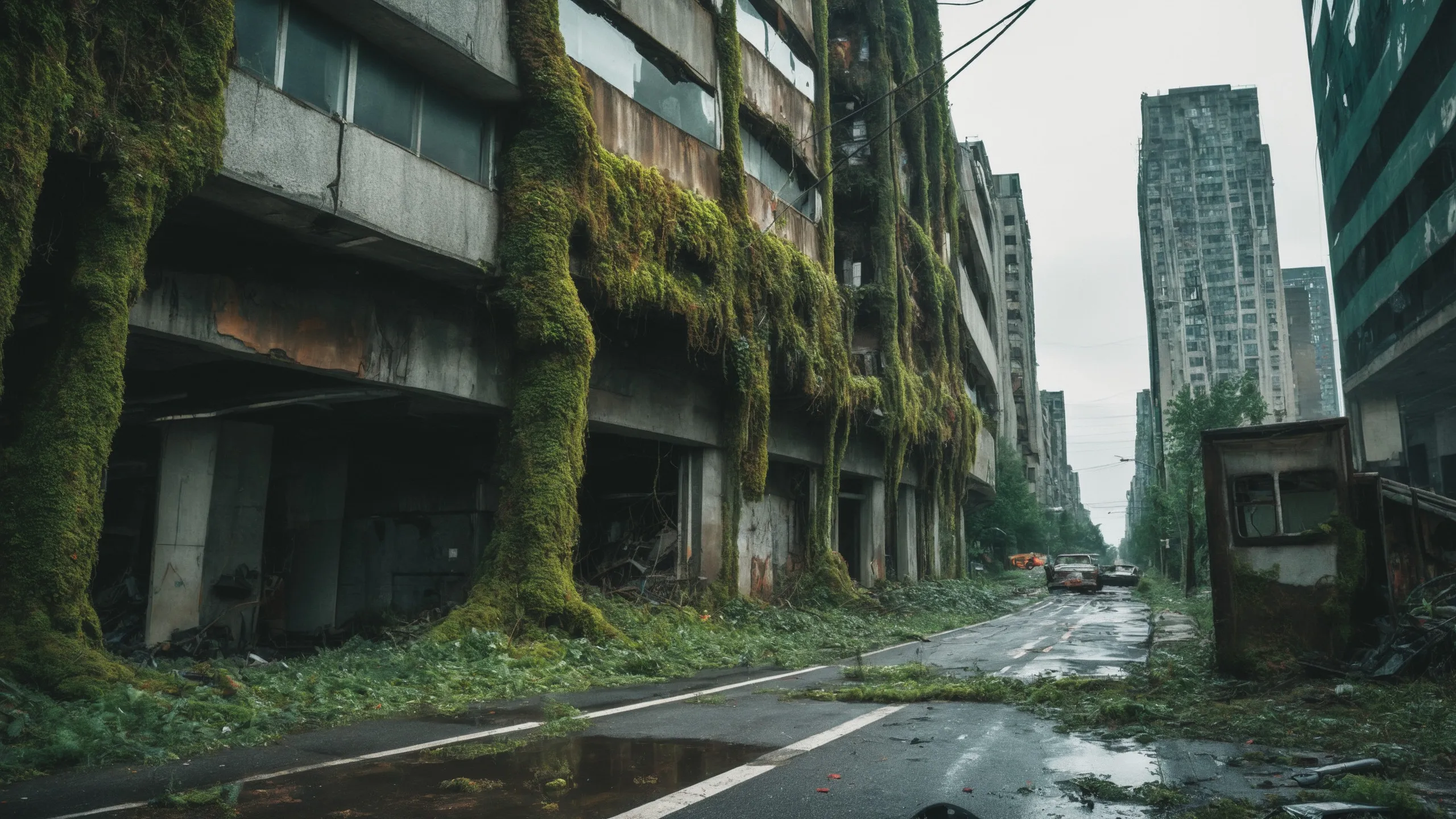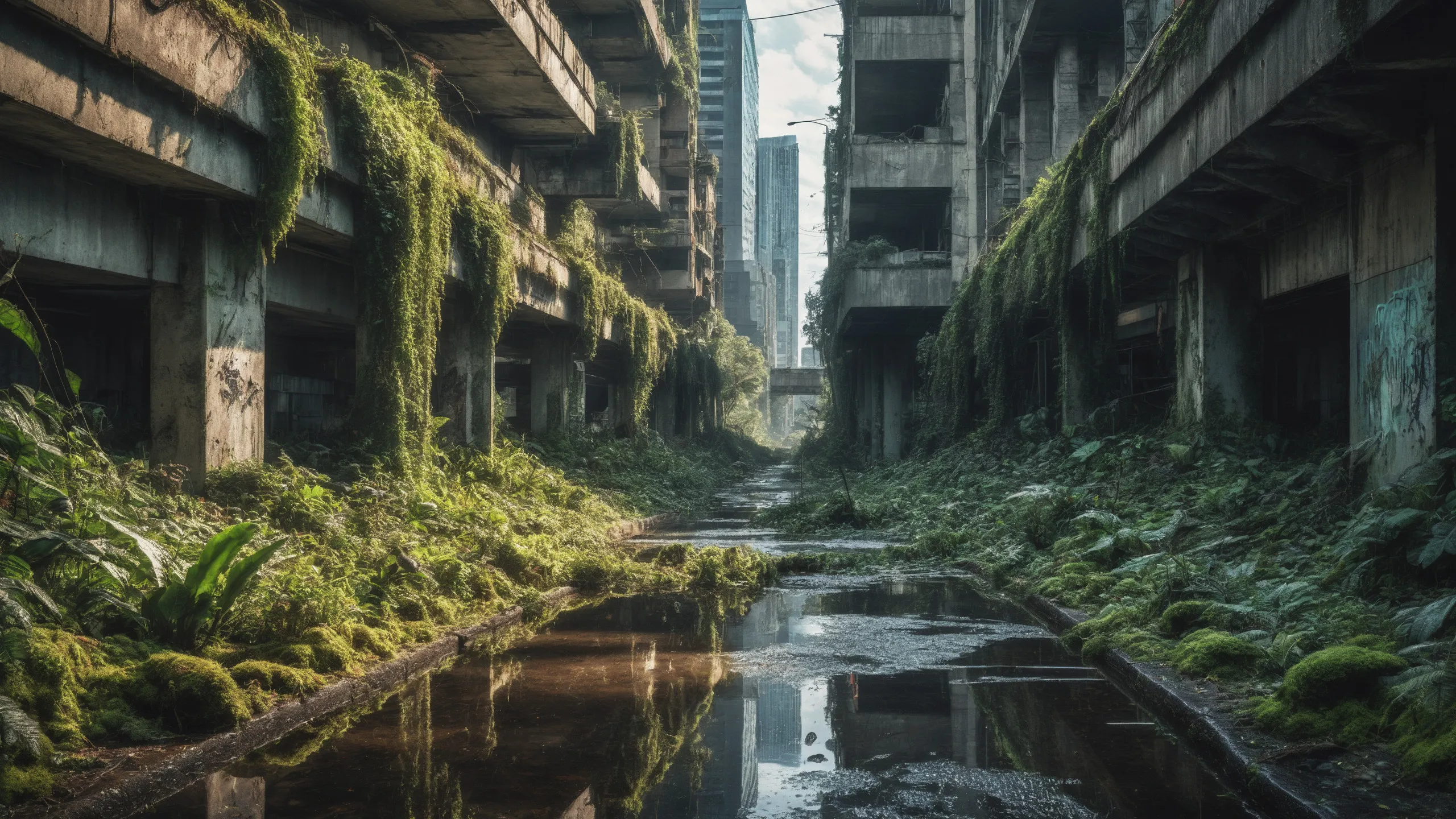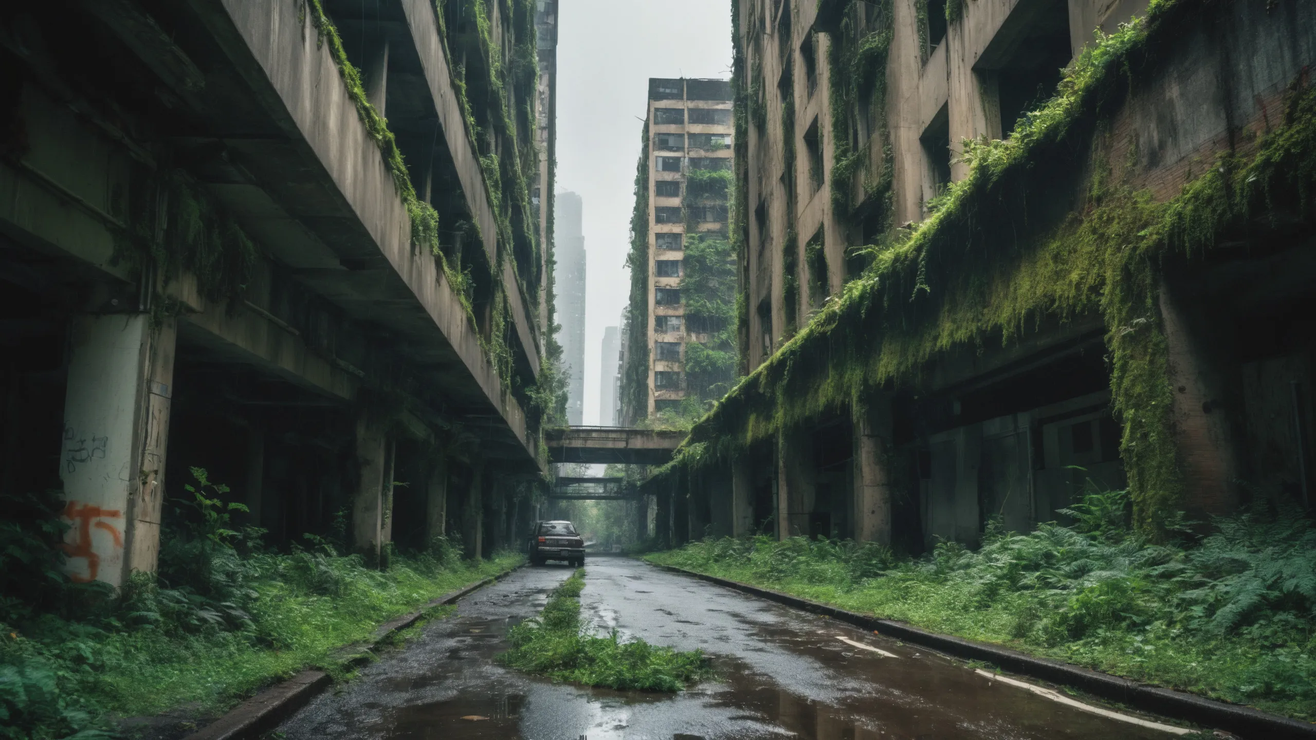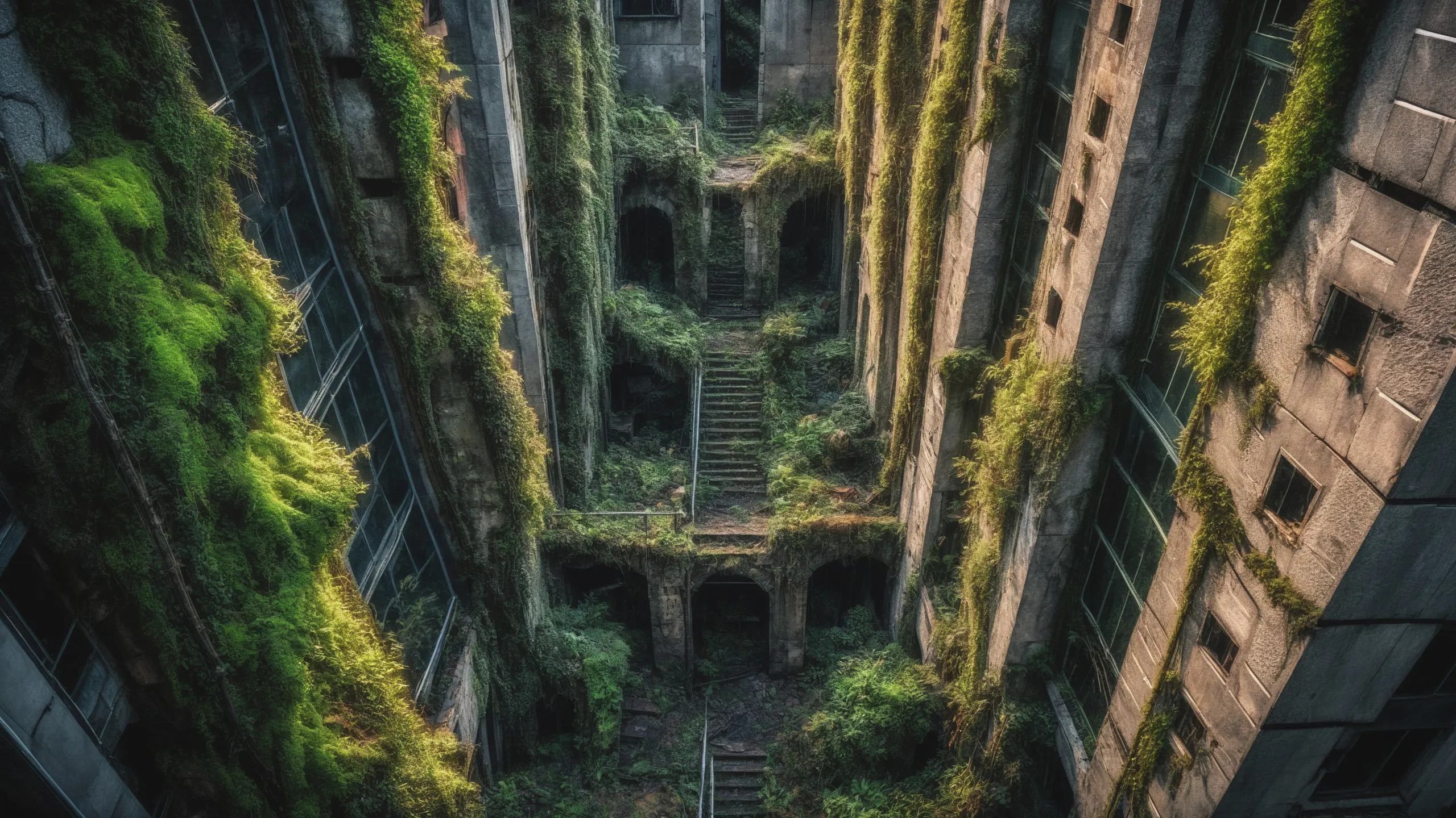A sprawling, futuristic mega city (abandoned:1.5) and reclaimed by nature. Ruins of towering skyscrapers, covered in moss, vines, and trees, with broken windows and crumbling infrastructure. The abandoned streets, without traffic, overrun with wild plants, bushes, and trees growing through the pavement.