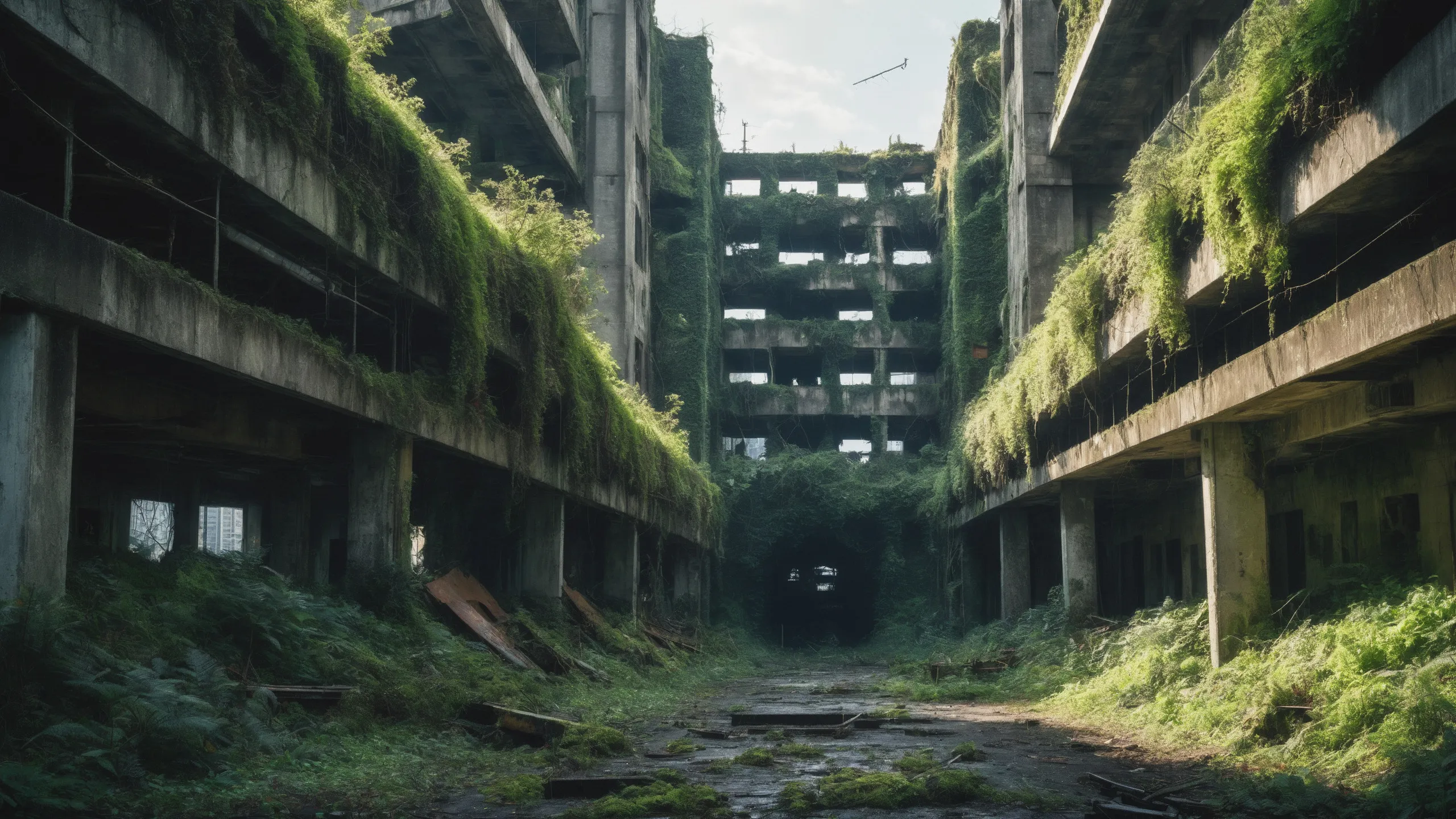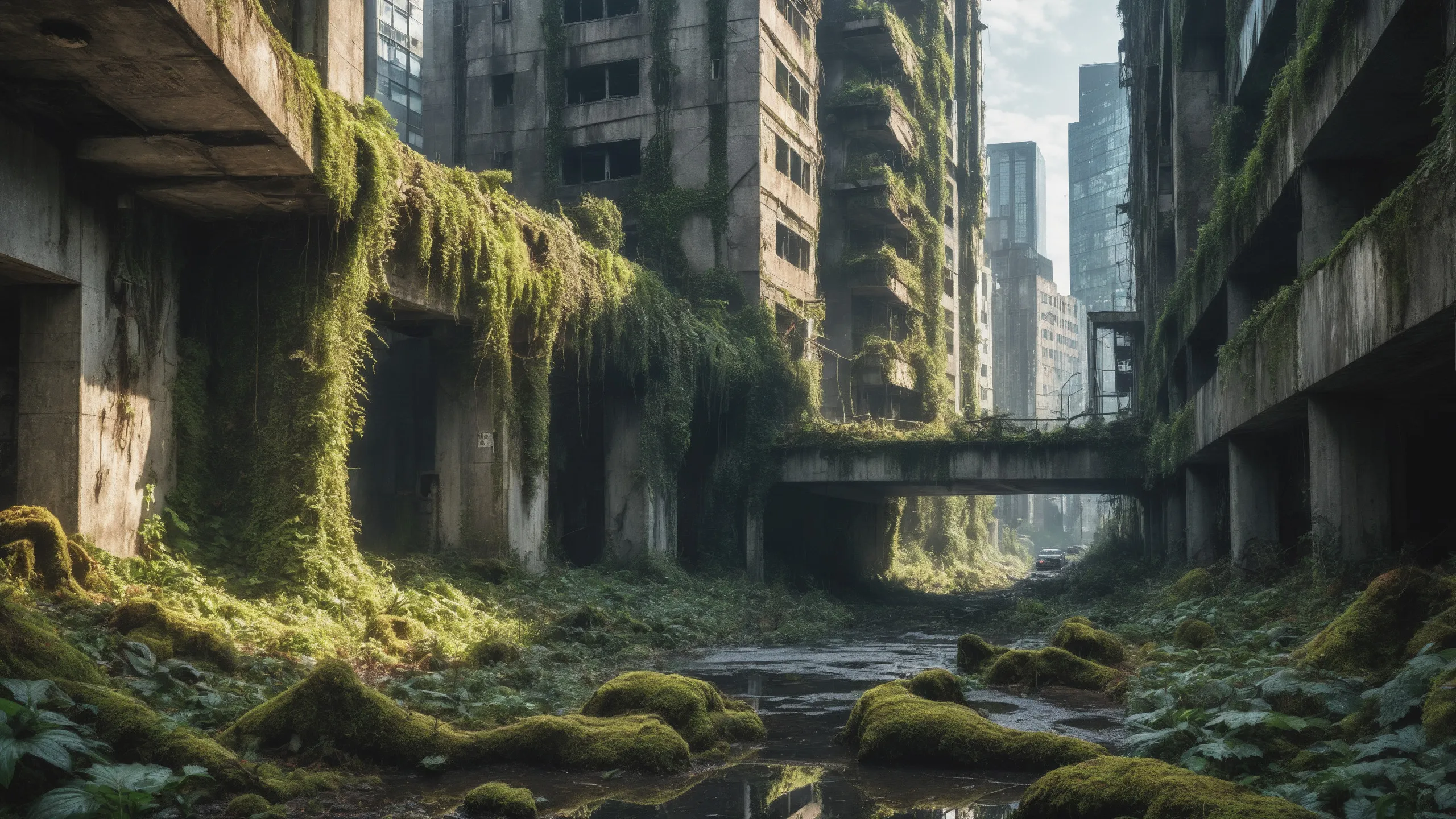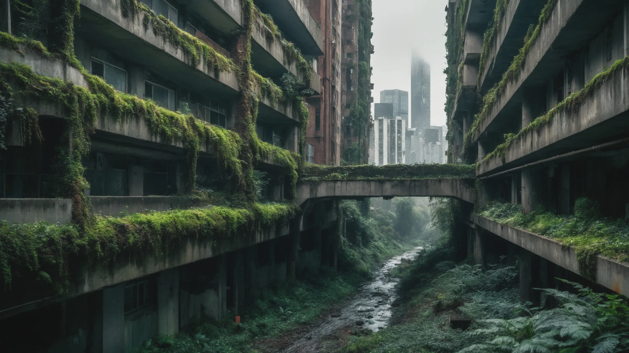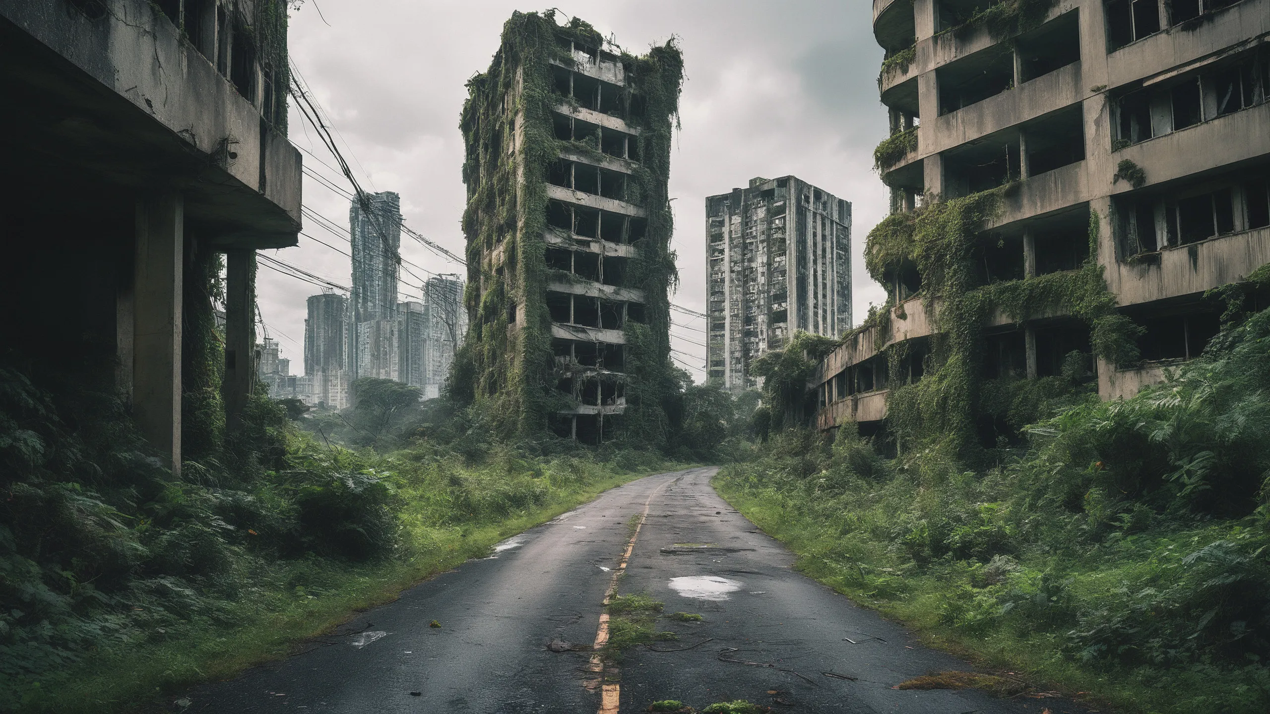 A sprawling, futuristic mega city (abandoned:1.5) and reclaimed by nature. Ruins of towering skyscrapers, covered in moss, vines, and trees, with broken windows and crumbling infrastructure. The abandoned streets, without traffic, overrun with wild plants, bushes, and trees growing through the pavement.