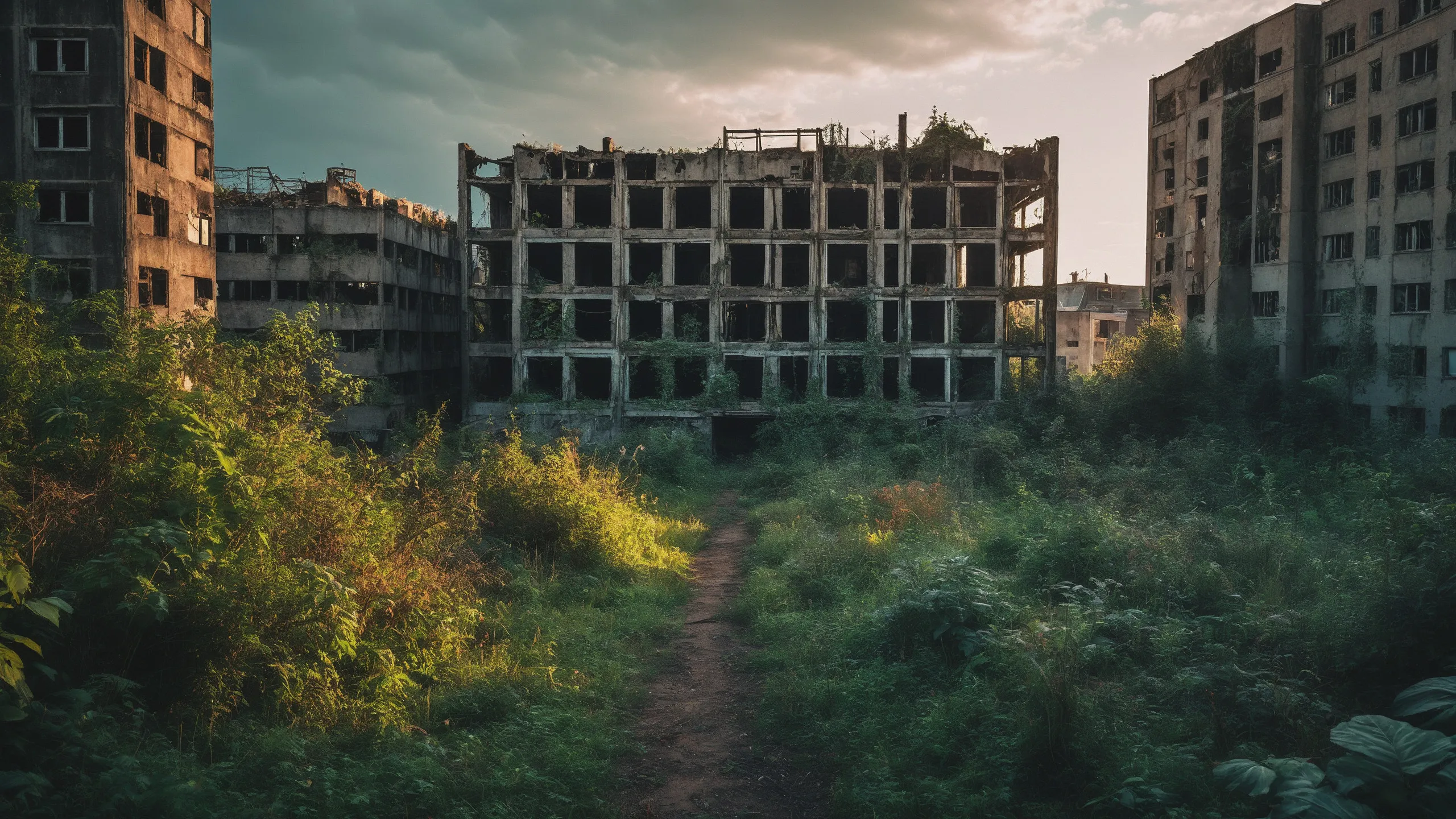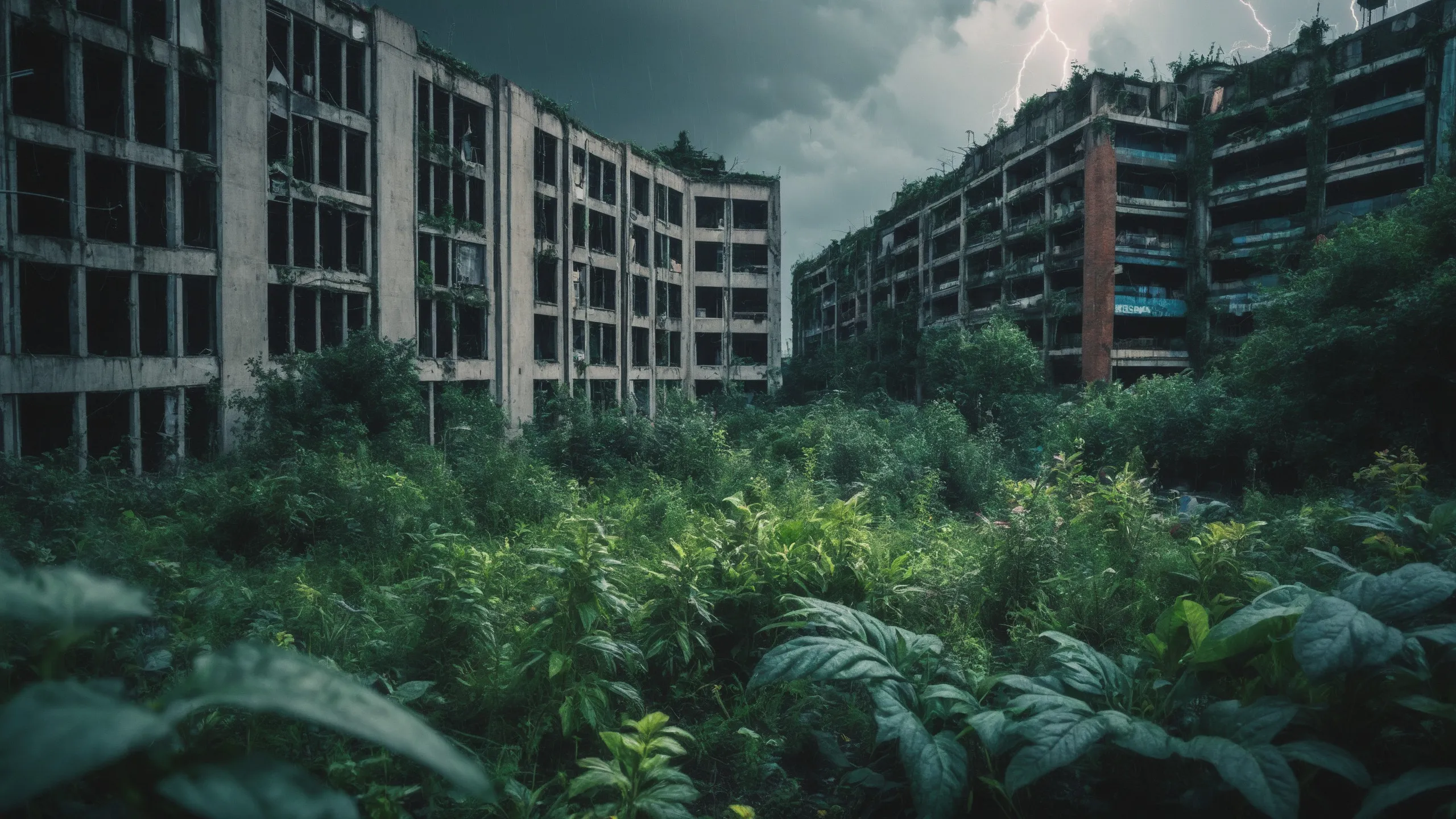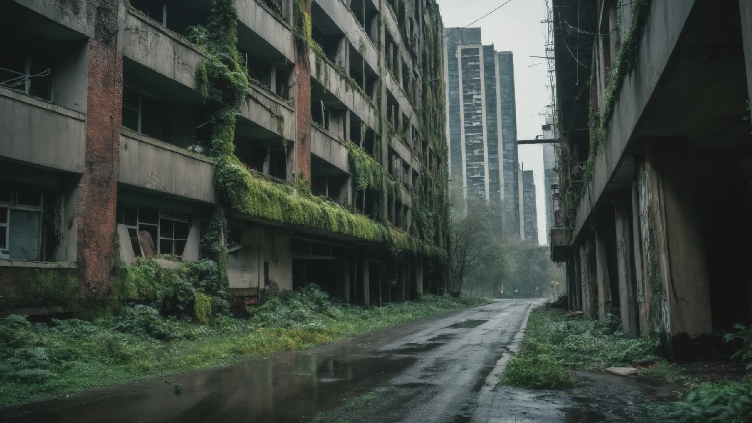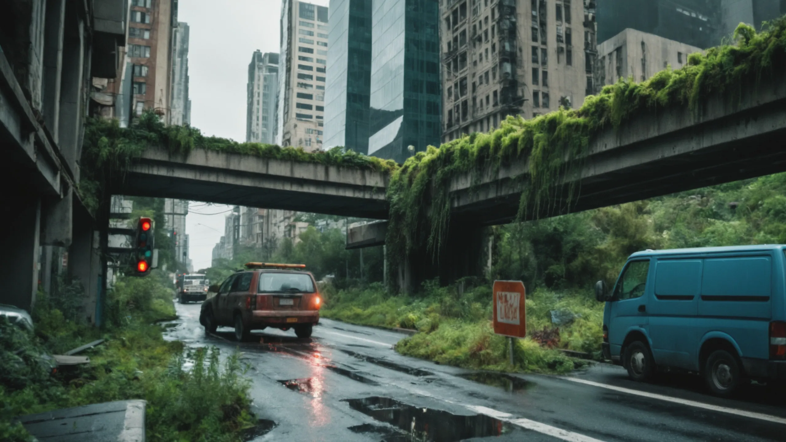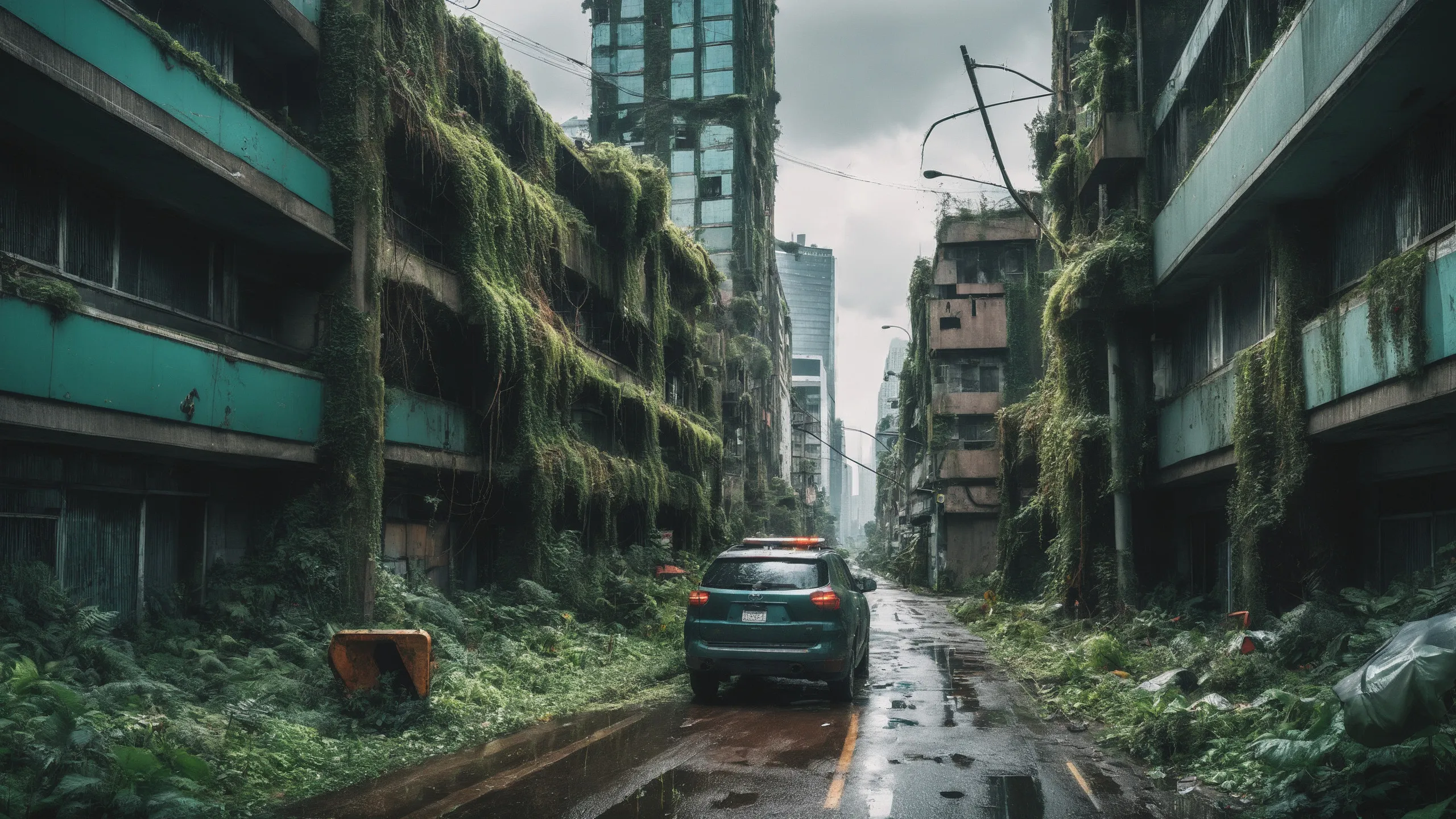 A sprawling, futuristic mega city (abandoned:1.5) and reclaimed by nature. Ruins of towering skyscrapers, covered in moss, vines, and trees, with broken windows and crumbling infrastructure. The abandoned streets, without traffic, overrun with wild plants, bushes, and trees growing through the pavement.