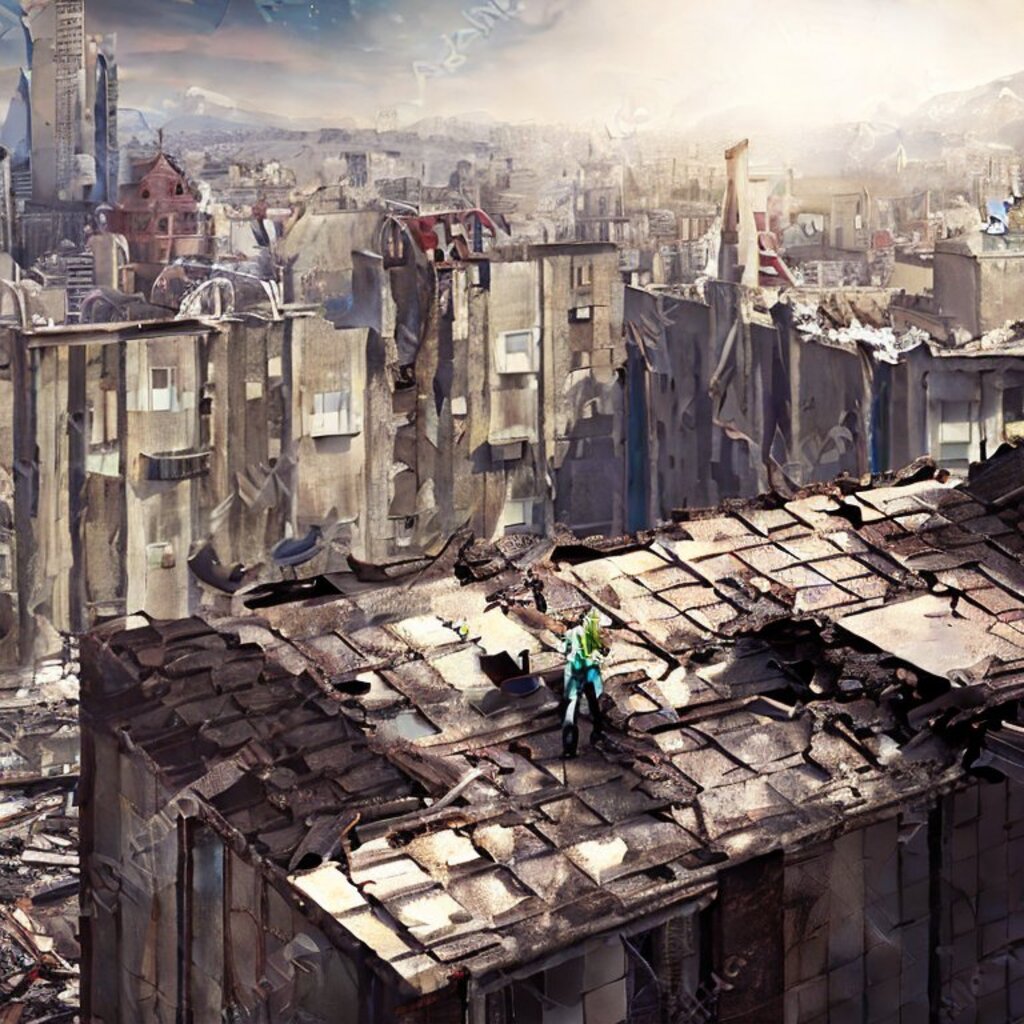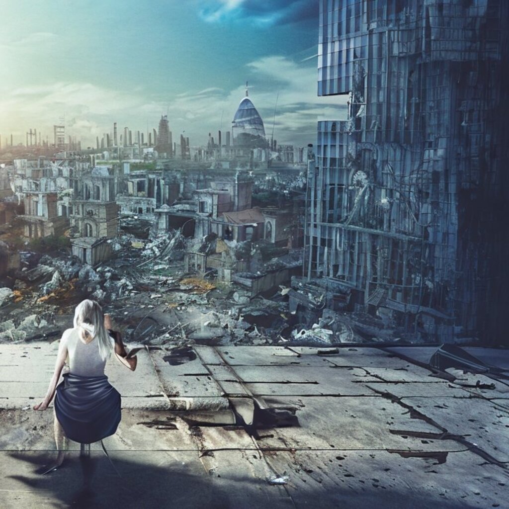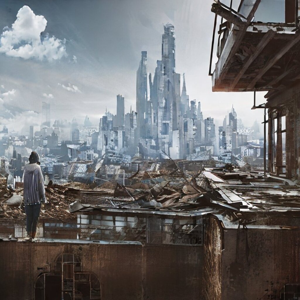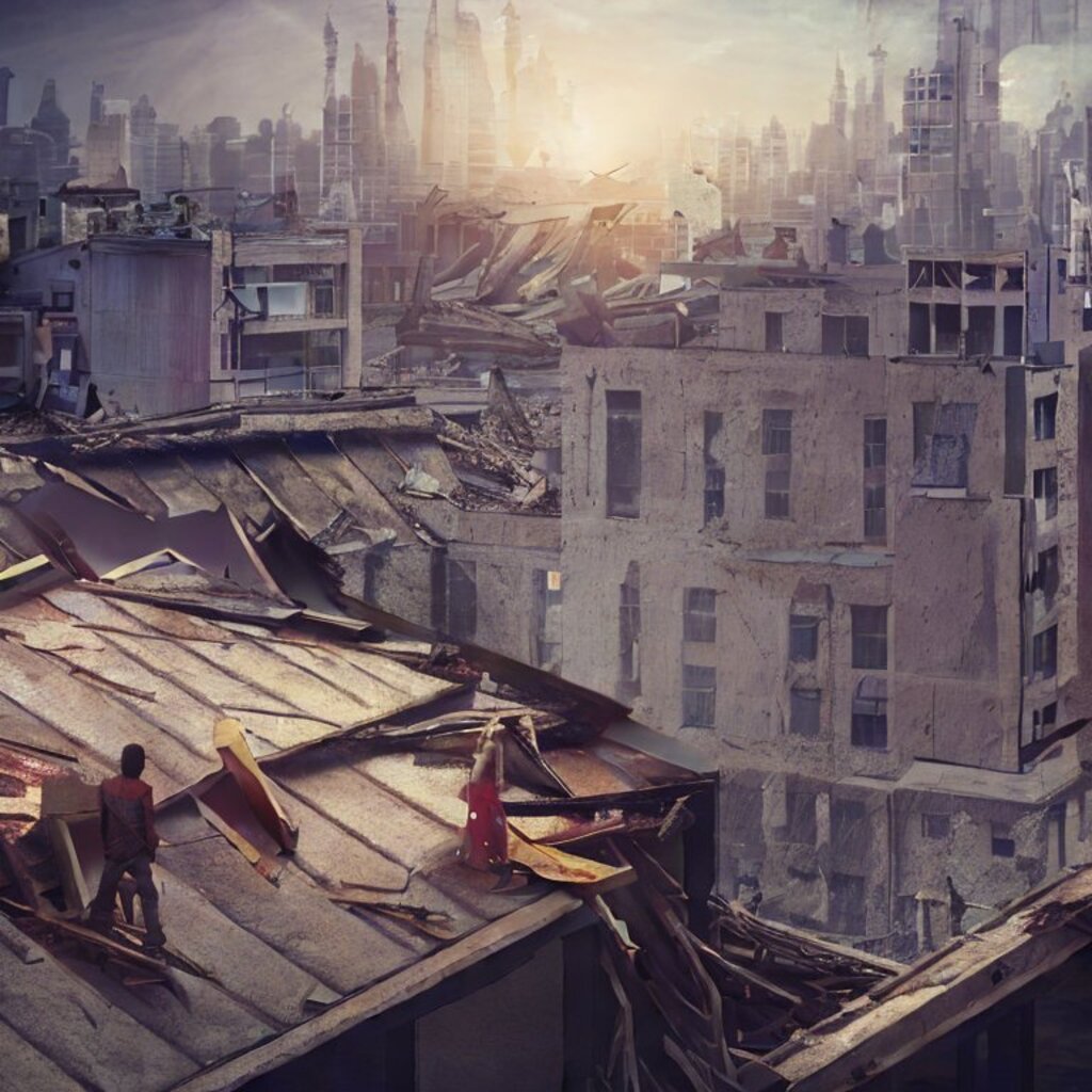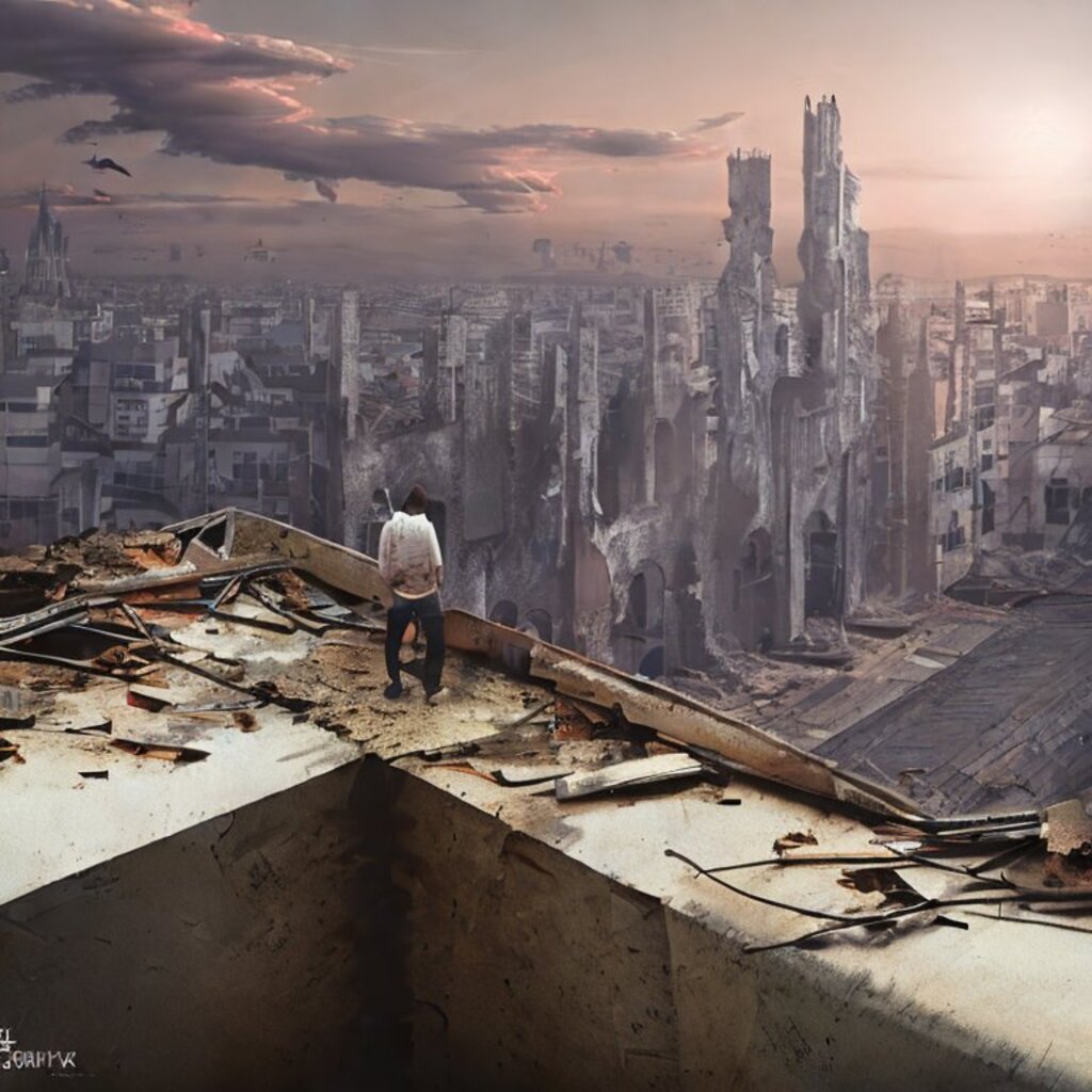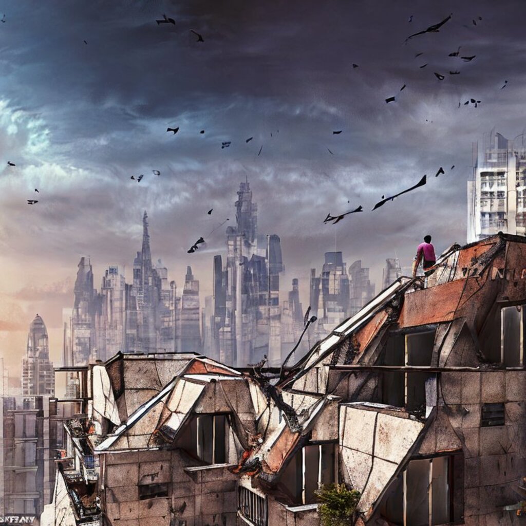 watching destroyed city from a rooftop, landscape photography, beautiful, Concept art