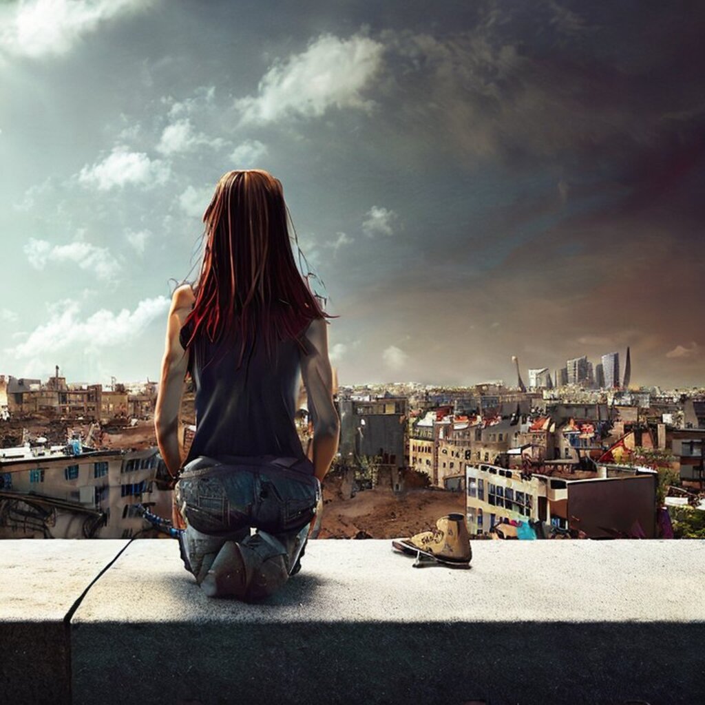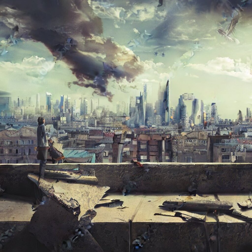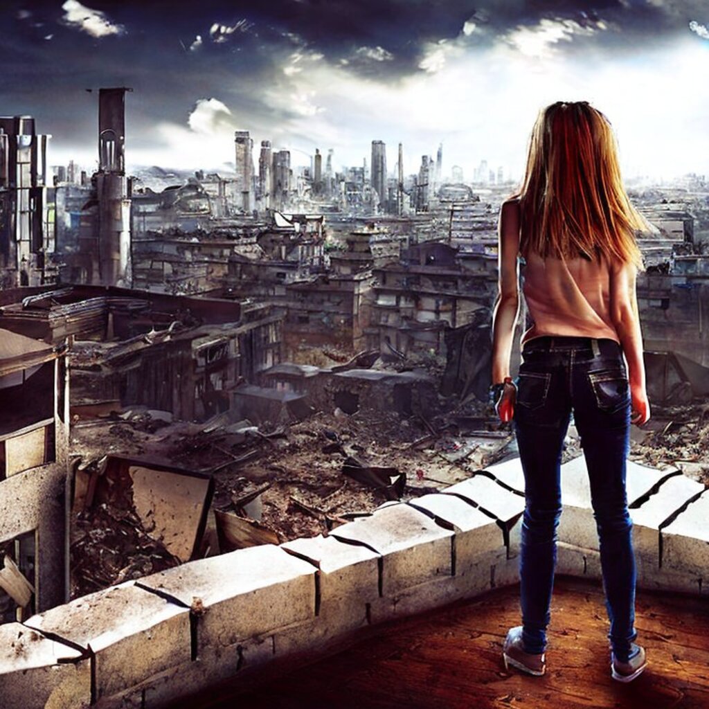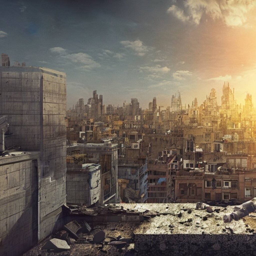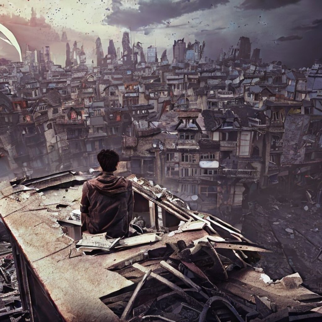watching destroyed city from a rooftop, landscape photography, beautiful, Concept art