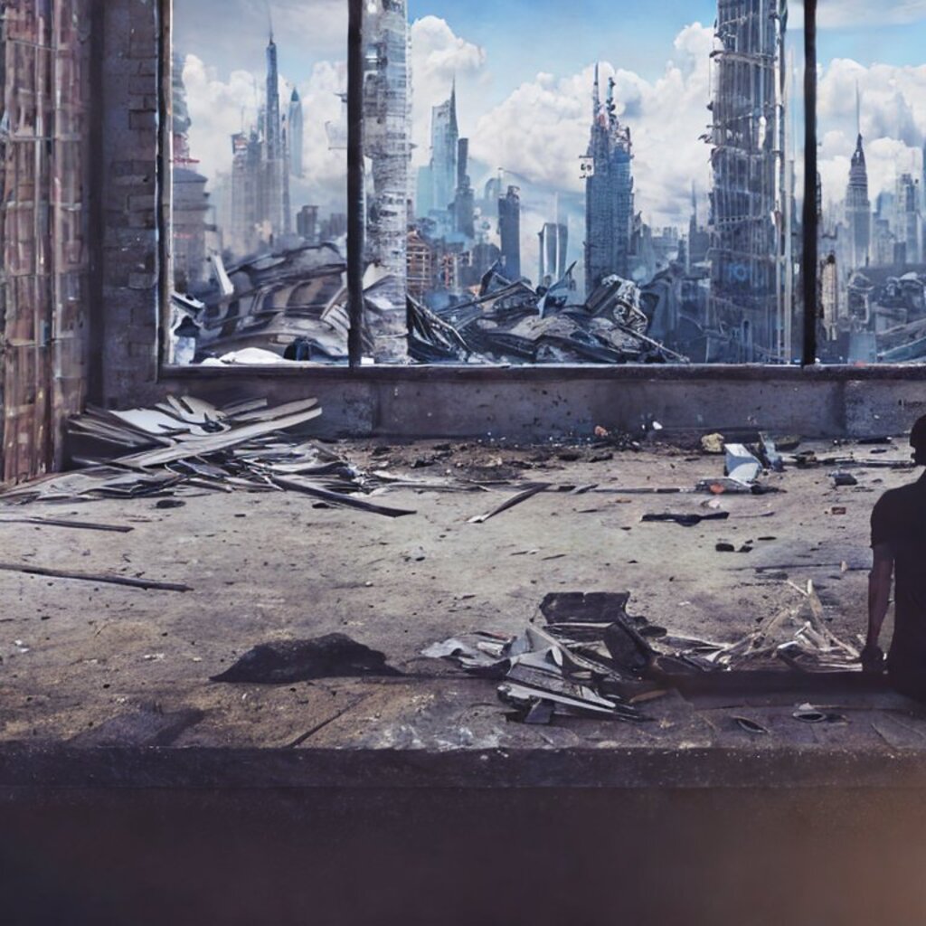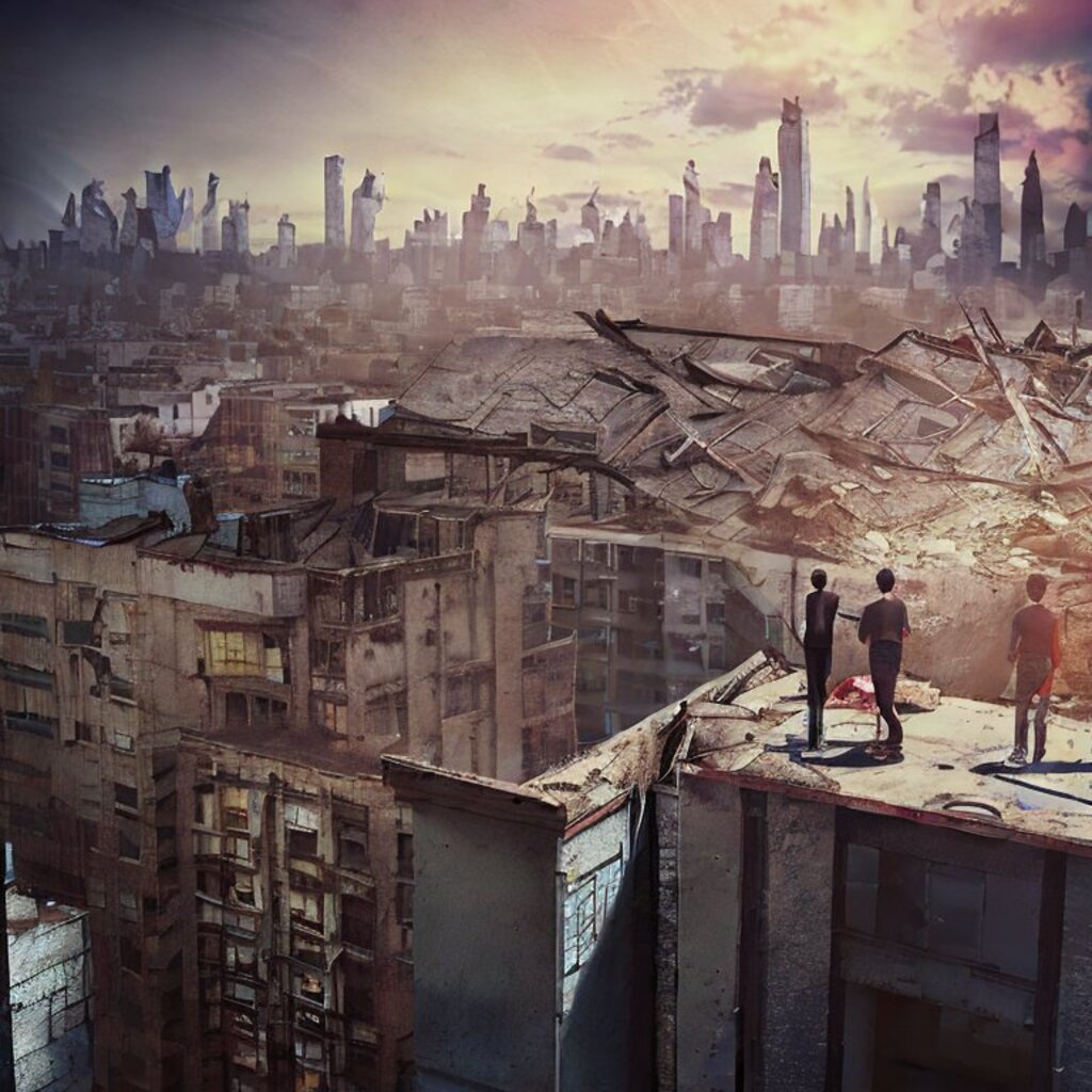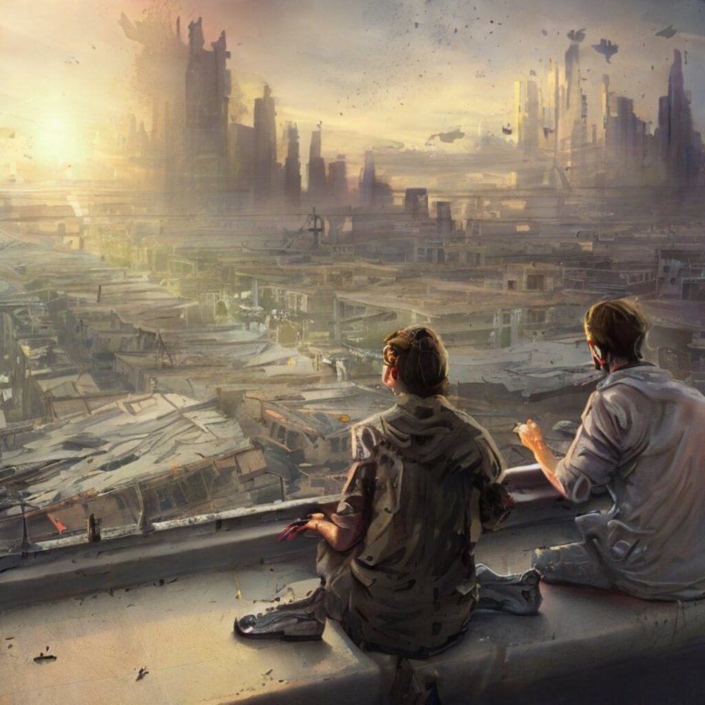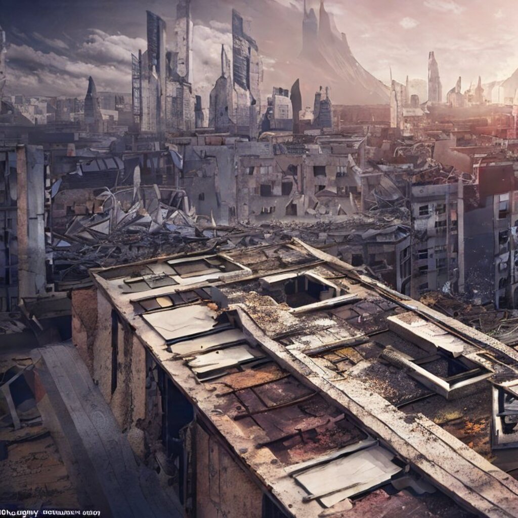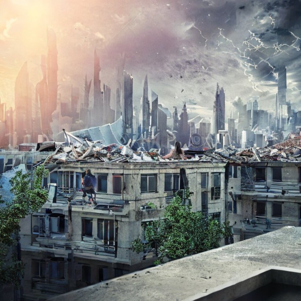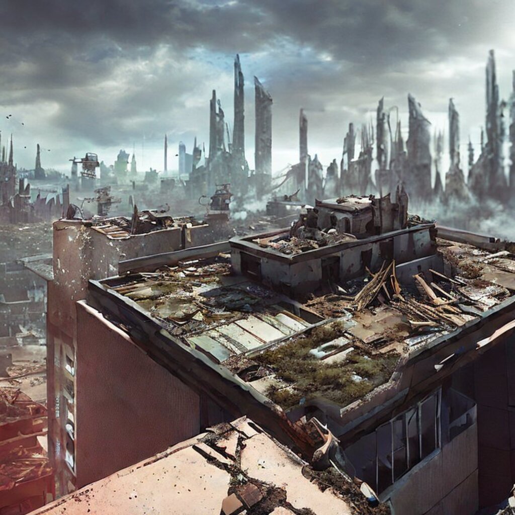 watching destroyed city from a rooftop, landscape photography, beautiful, Concept art