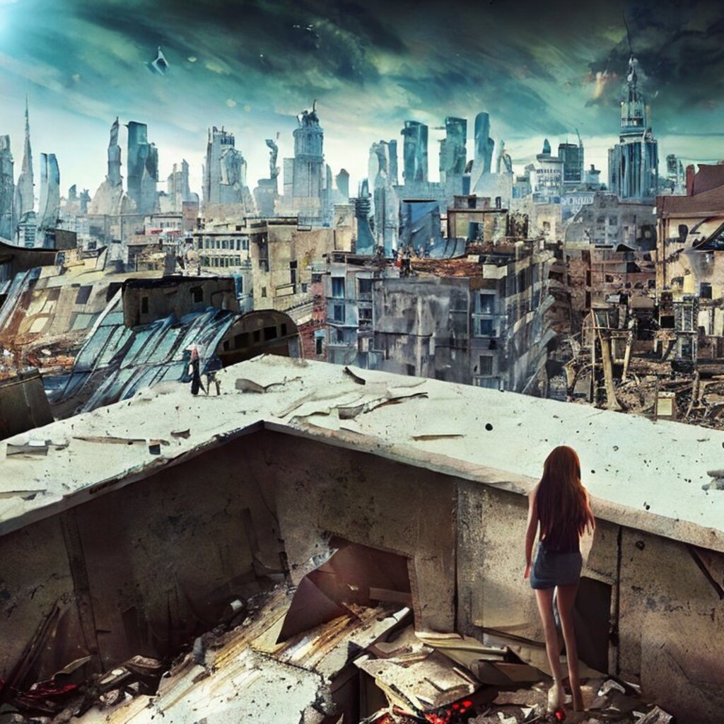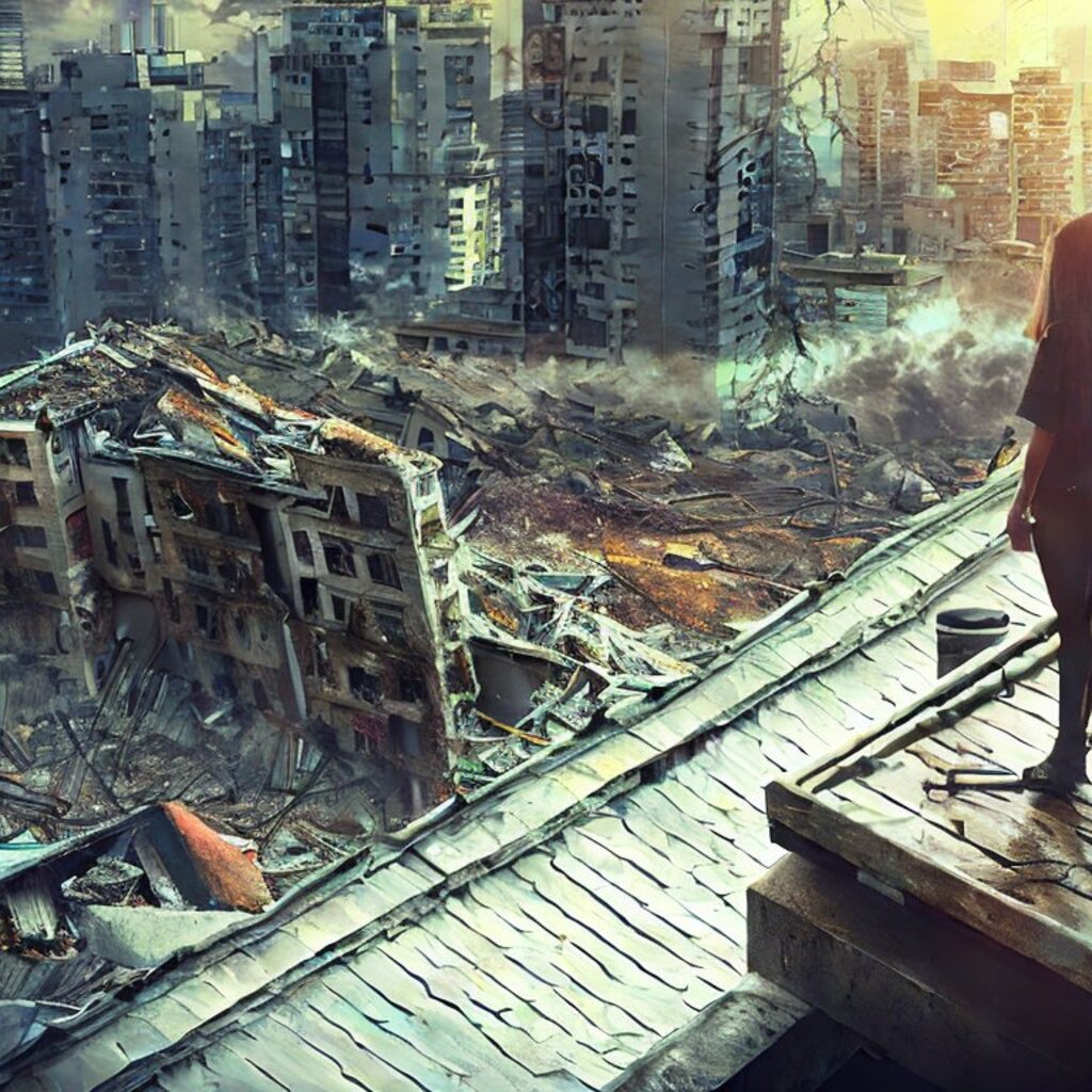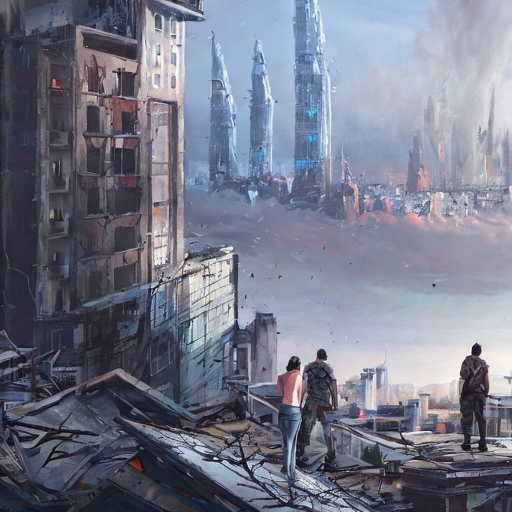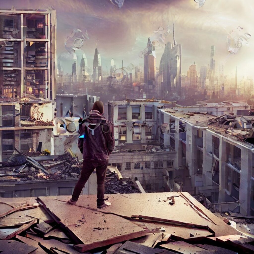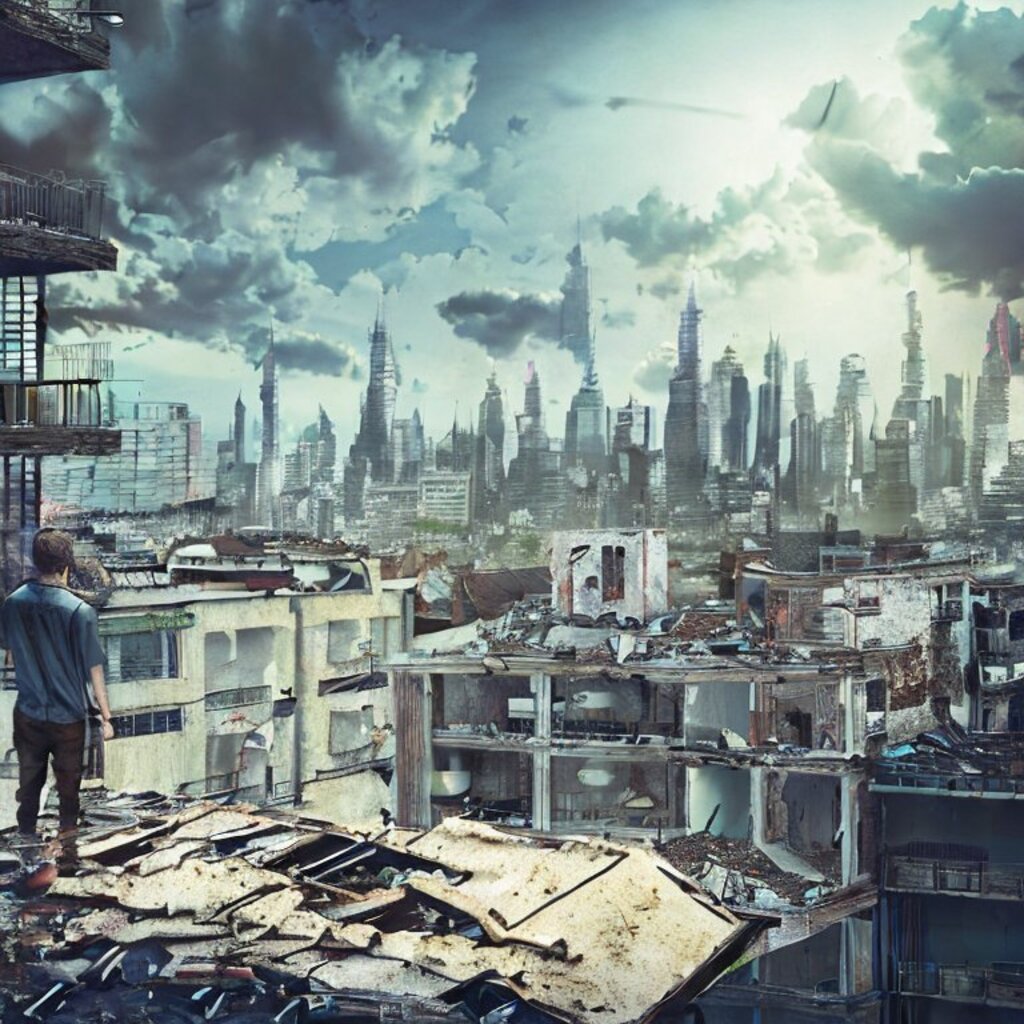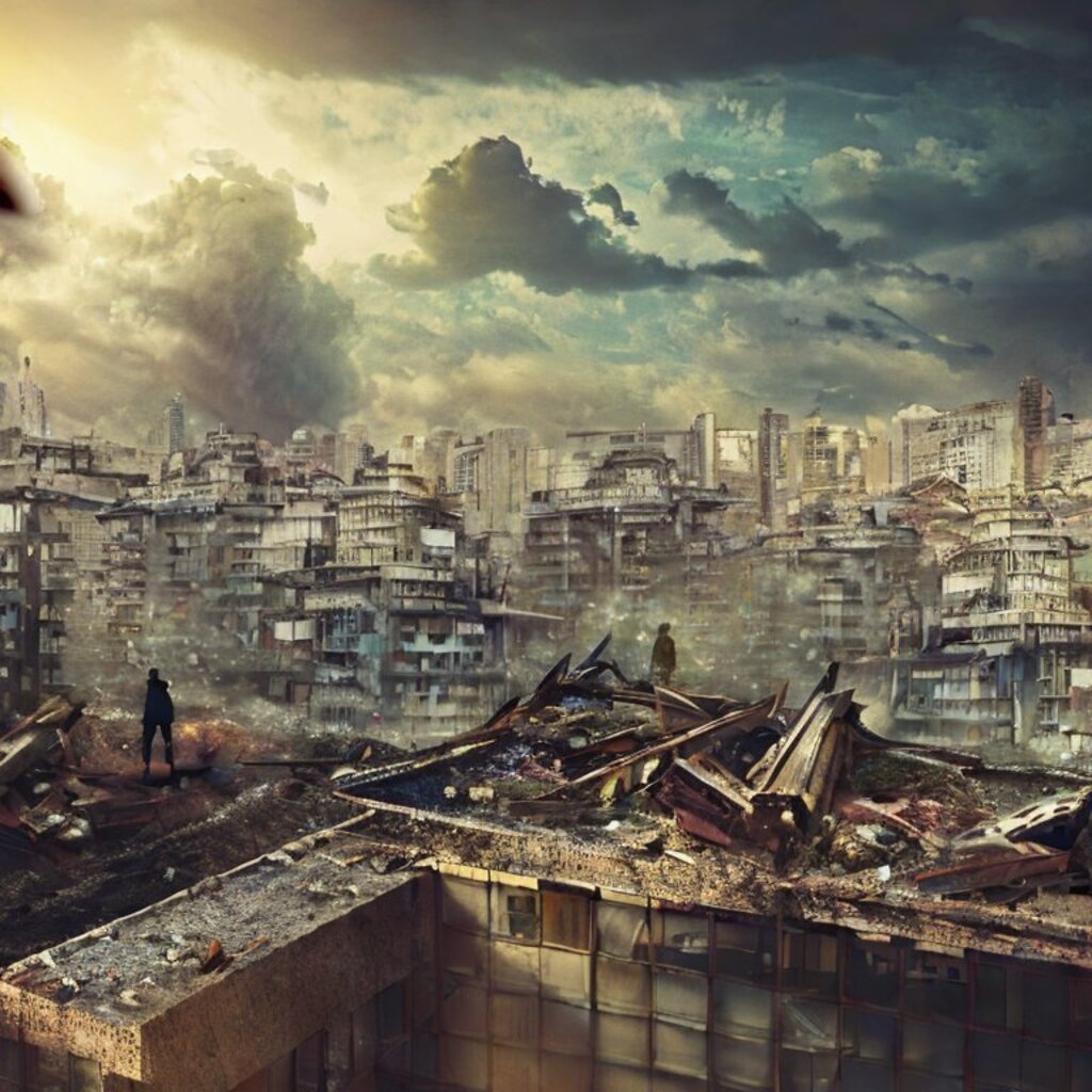 watching destroyed city from a rooftop, landscape photography, beautiful, Concept art
